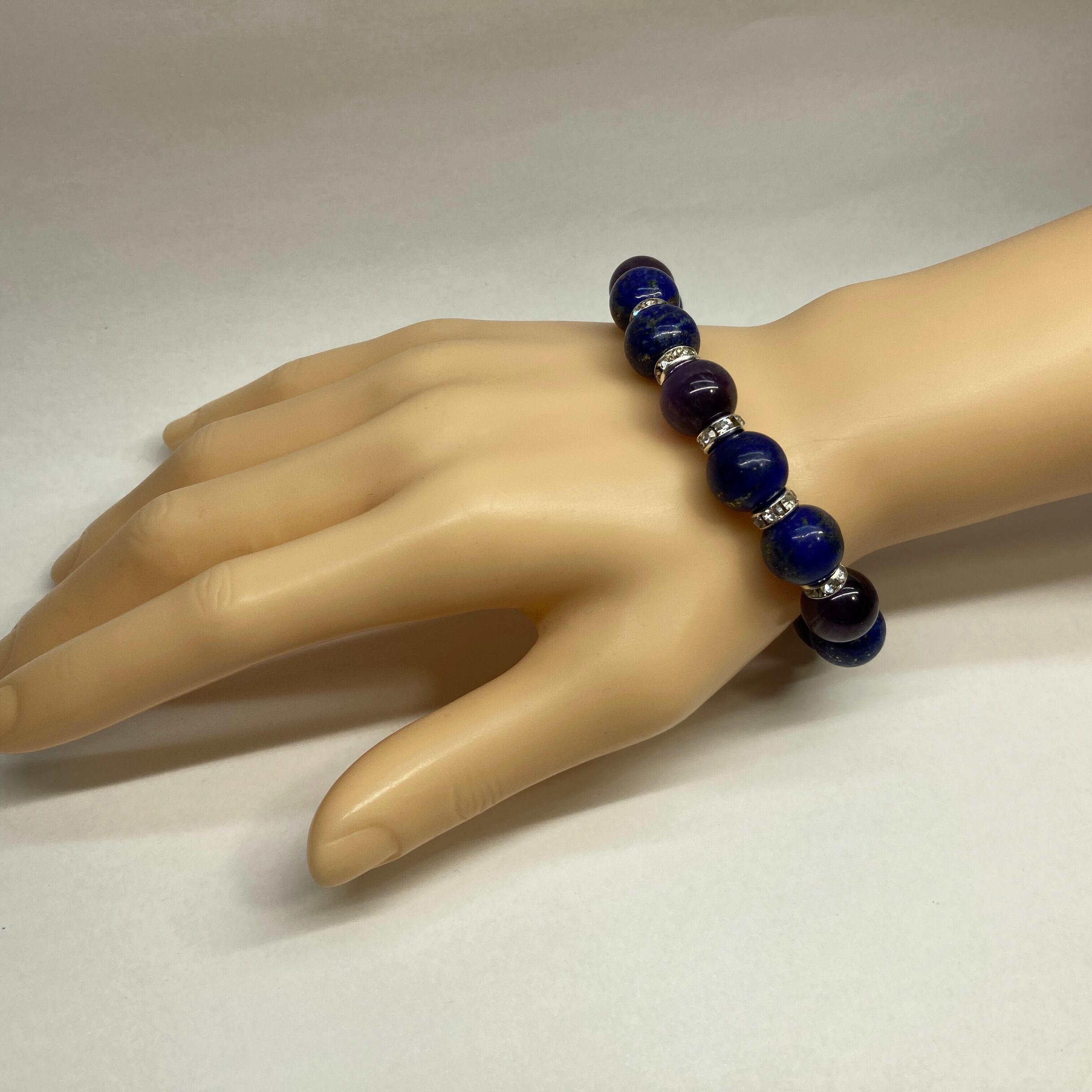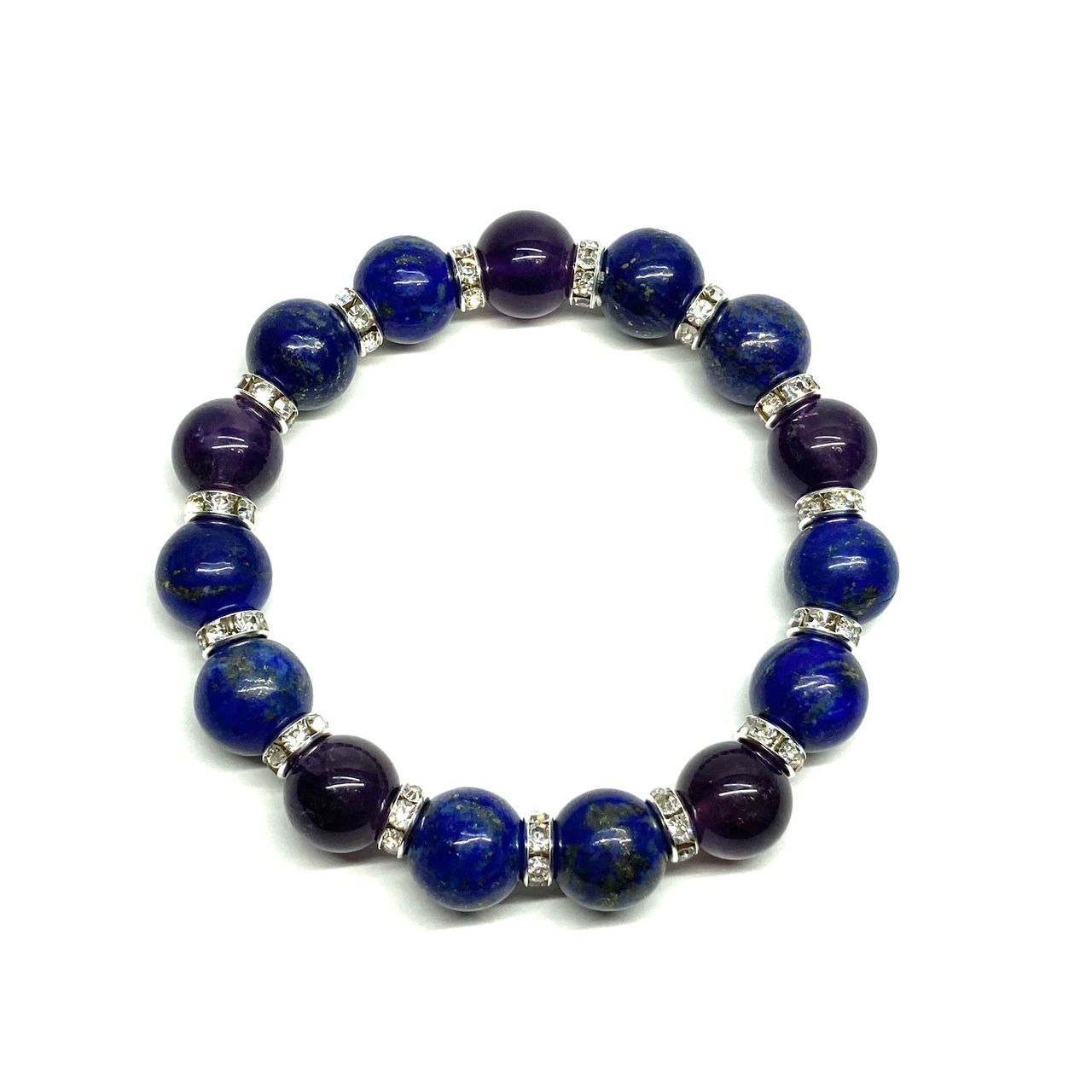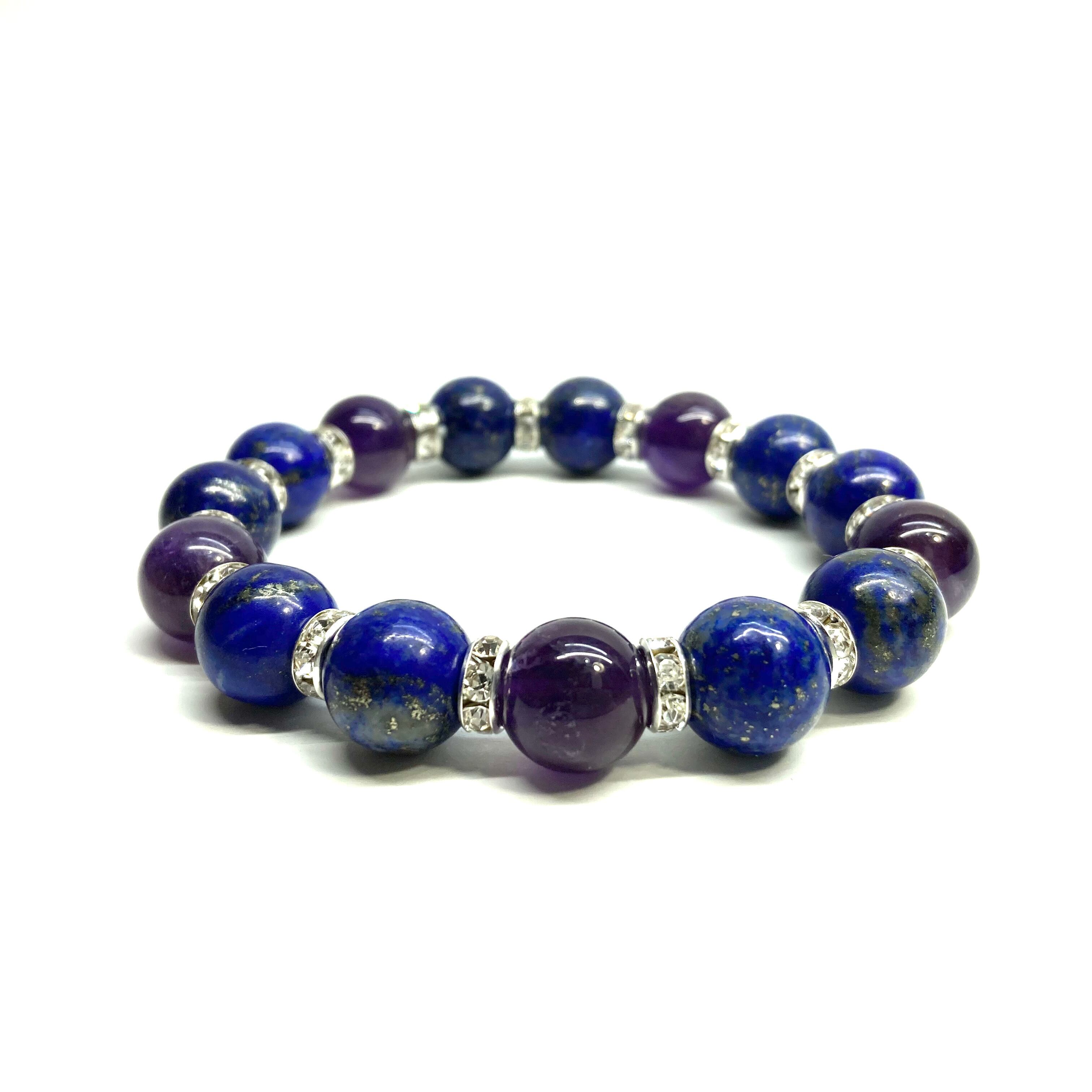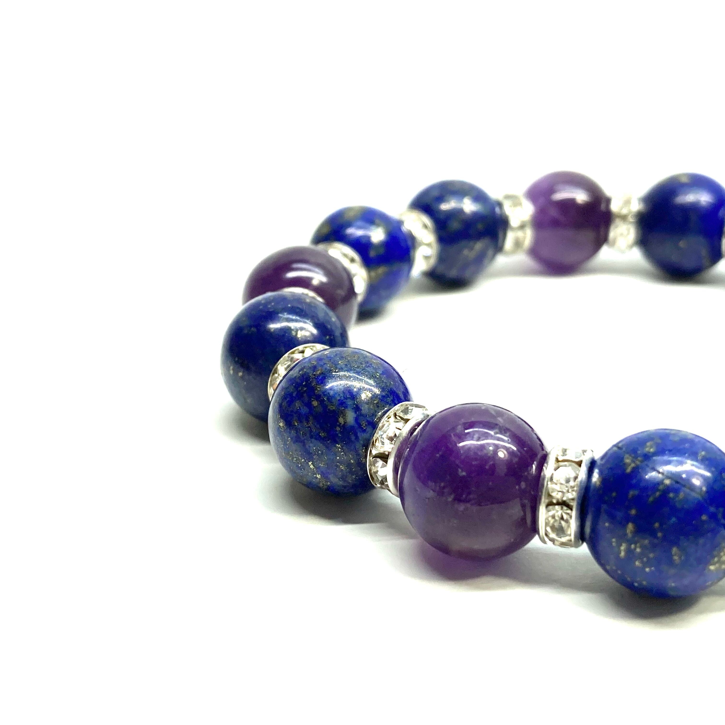 こちらは、ラピスラズリとアメジストを組み合わせたパワーストーンブレスレットです。間にはロンデルを挟み高級感あるデザインに仕上げております。石大きさは12mm玉を使用して内周 約18cmです。気になる方は是非この機会にどうぞ。