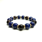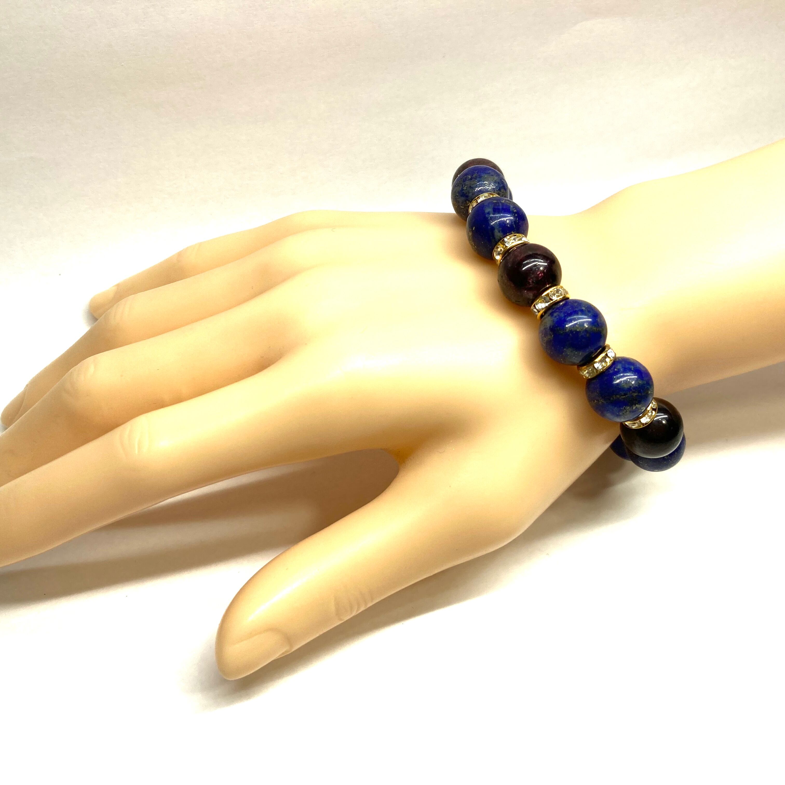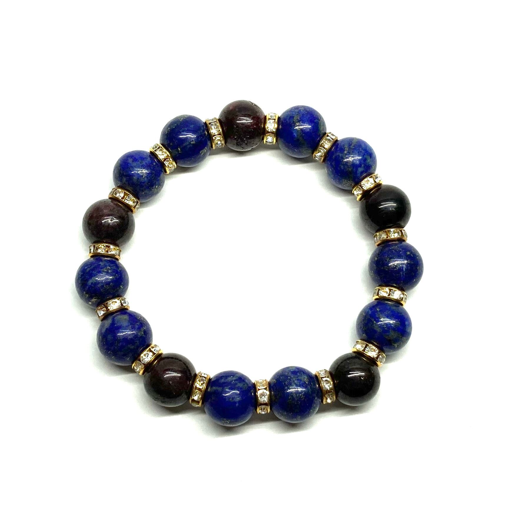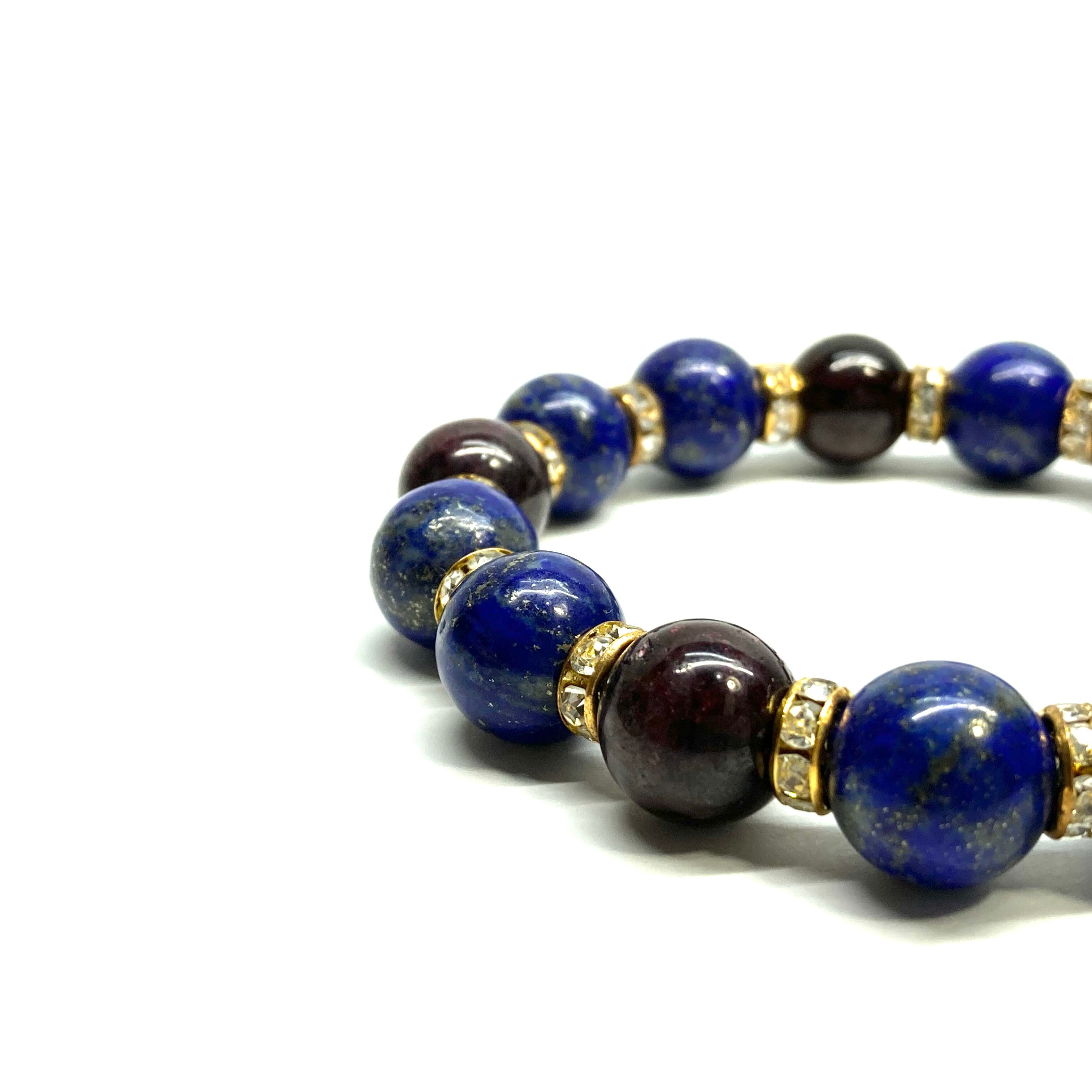 こちらは、ラピスラズリとガーネットを組み合わせたパワーストーンブレスレットです。間にはロンデルを挟み高級感あるデザインに仕上げております。石大きさは12mm玉を使用して内周 約18cmです。気になる方は是非この機会にどうぞ。