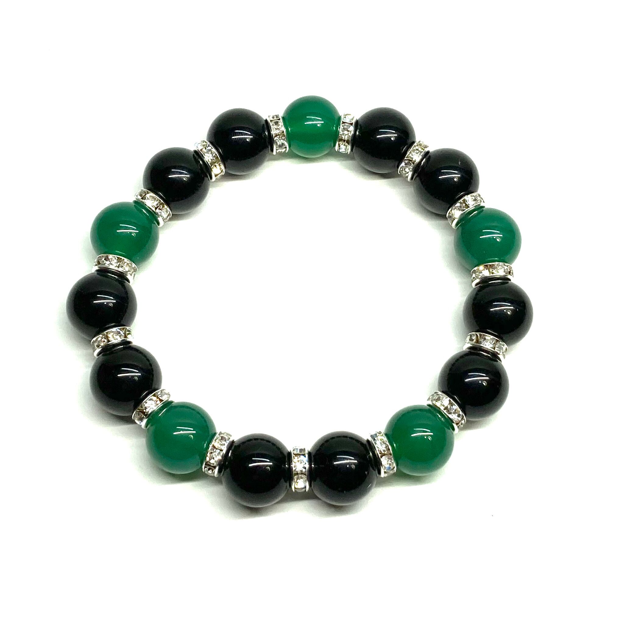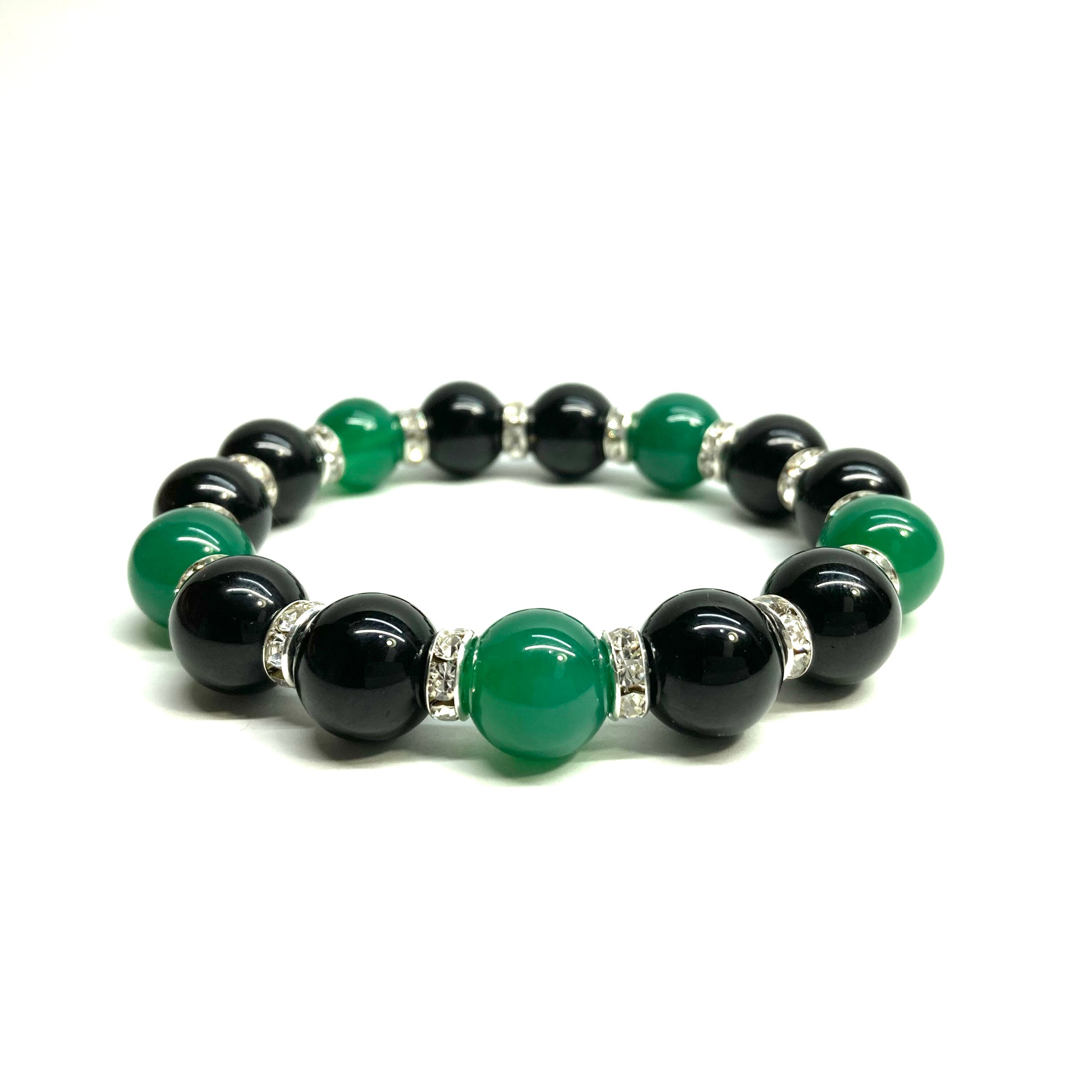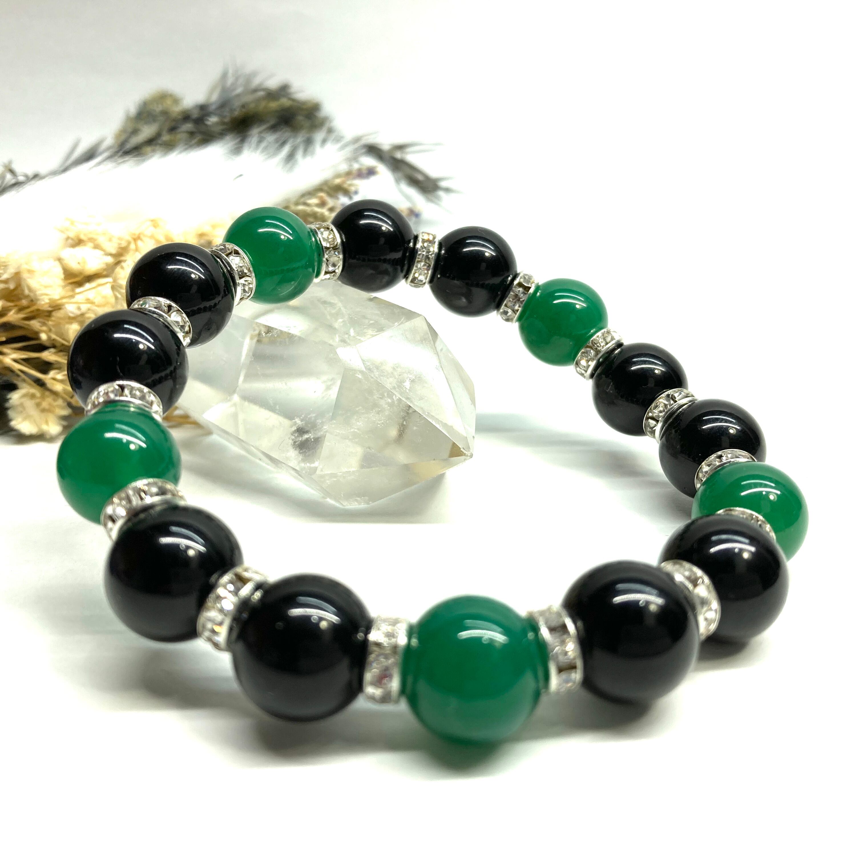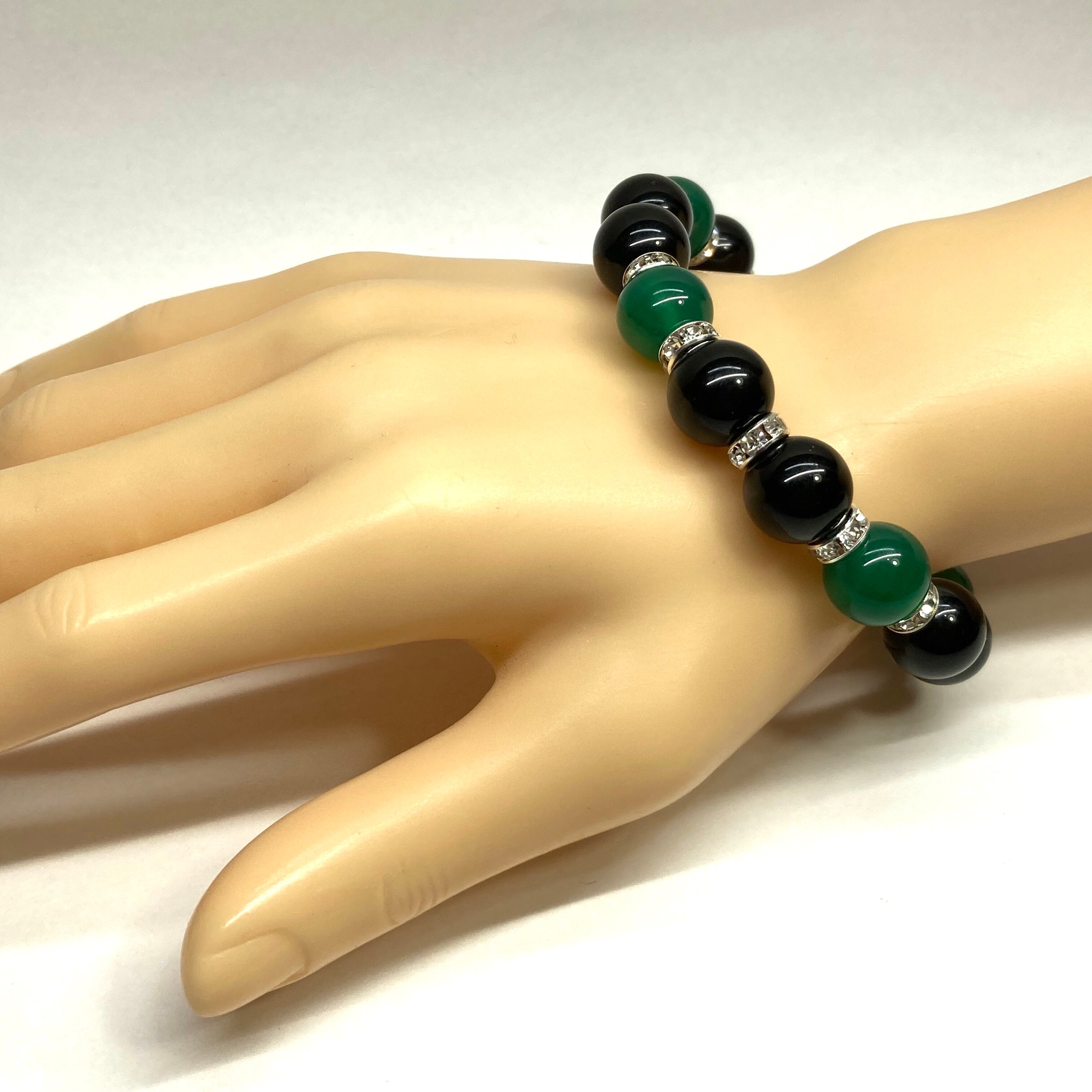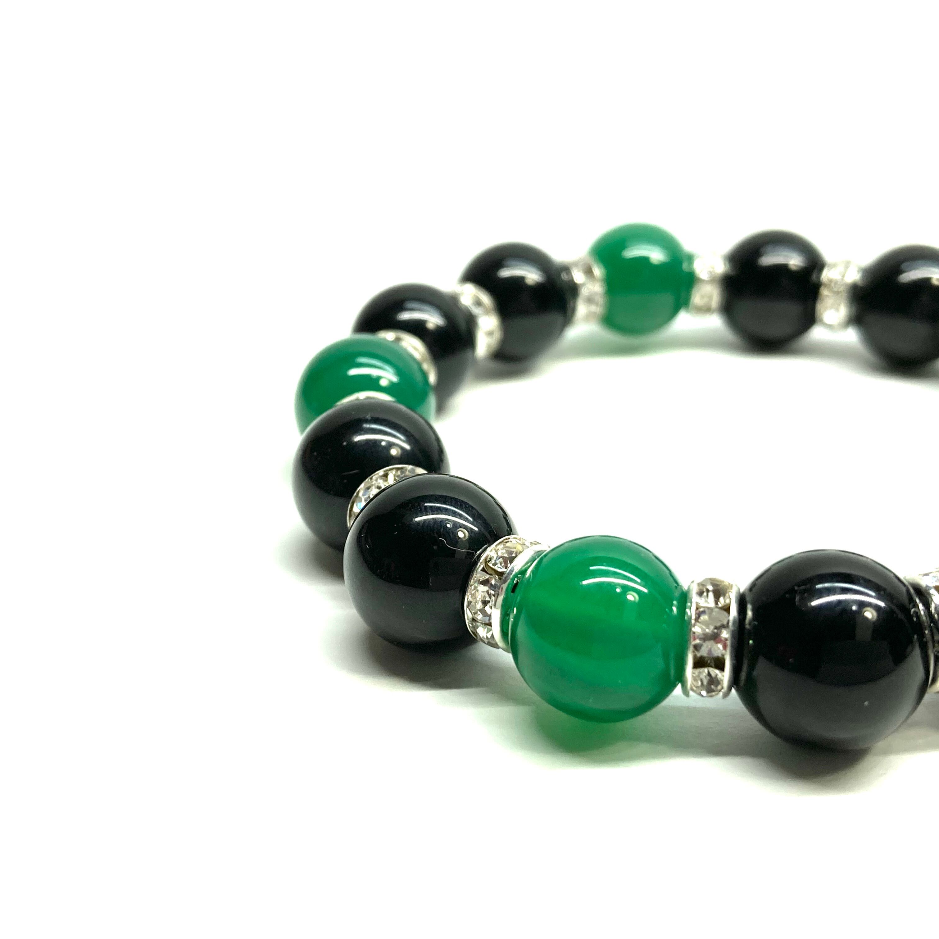 こちらは、モリオンと緑瑪瑙を組み合わせたパワーストーンブレスレットです。間にはロンデルを挟み高級感あるデザインに仕上げております。石大きさは12mm玉を使用して内周 約18cmです。気になる方は是非この機会にどうぞ。