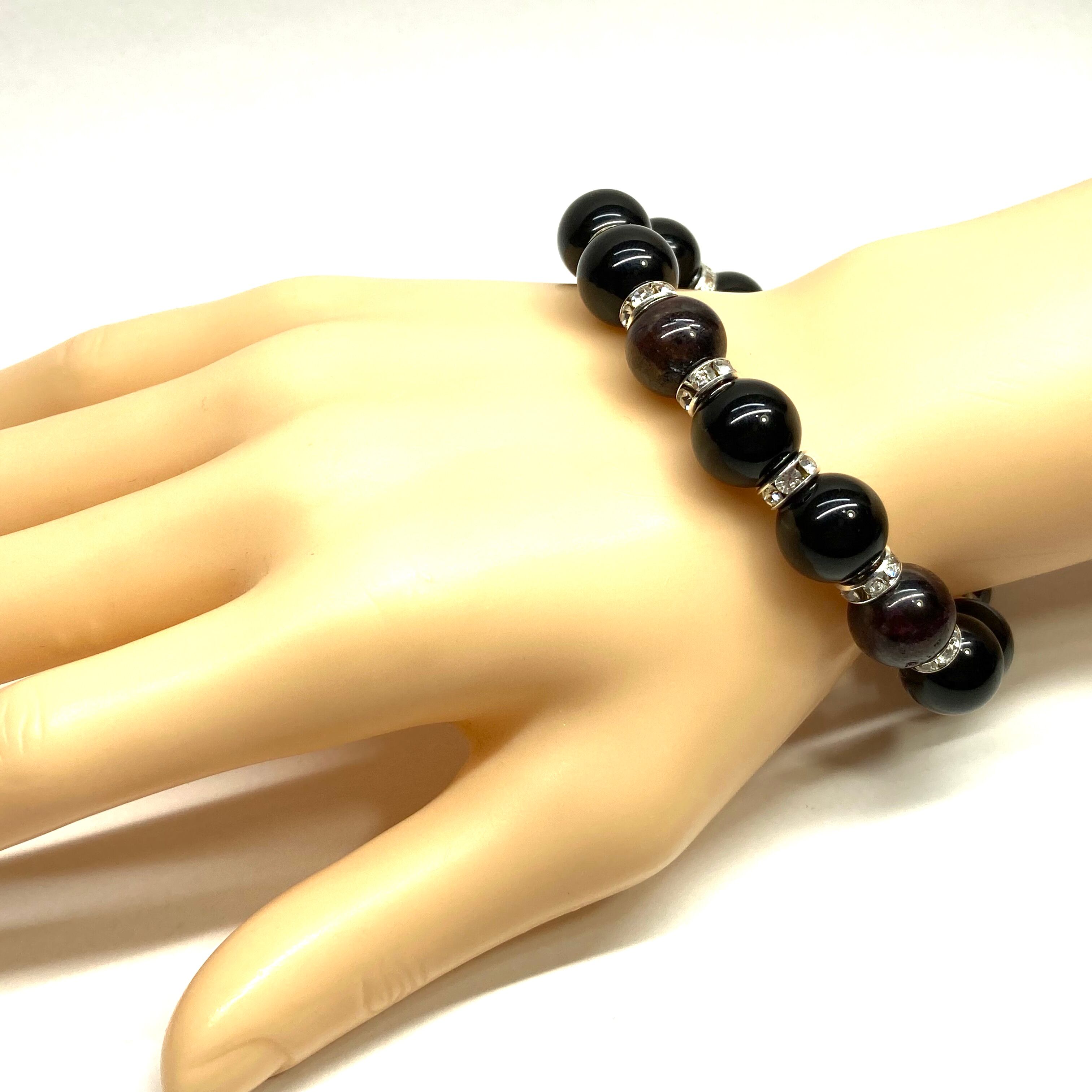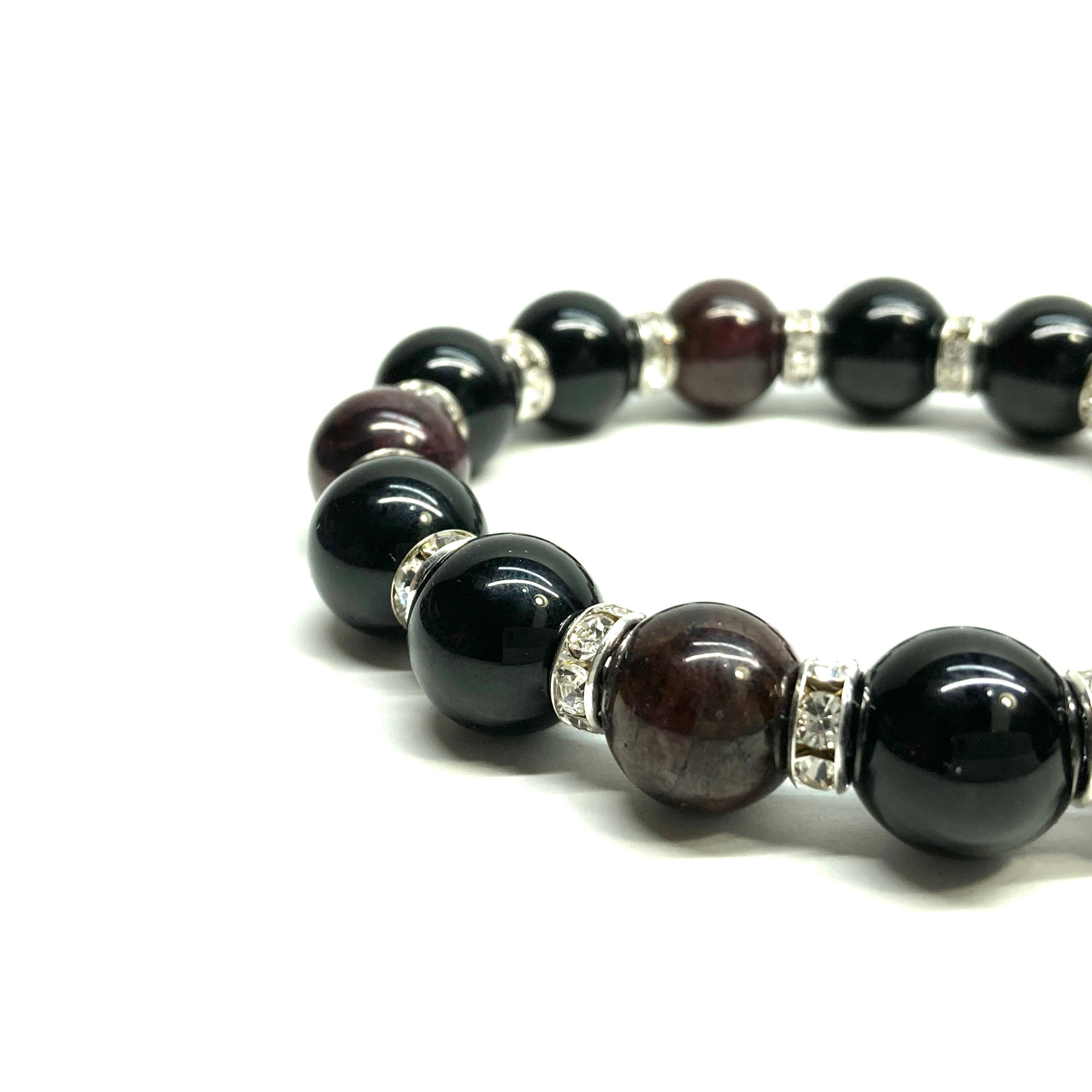 こちらは、モリオンとガーネットを組み合わせたパワーストーンブレスレットです。間にはロンデルを挟み高級感あるデザインに仕上げております。石大きさは12mm玉を使用して内周 約18cmです。気になる方は是非この機会にどうぞ。