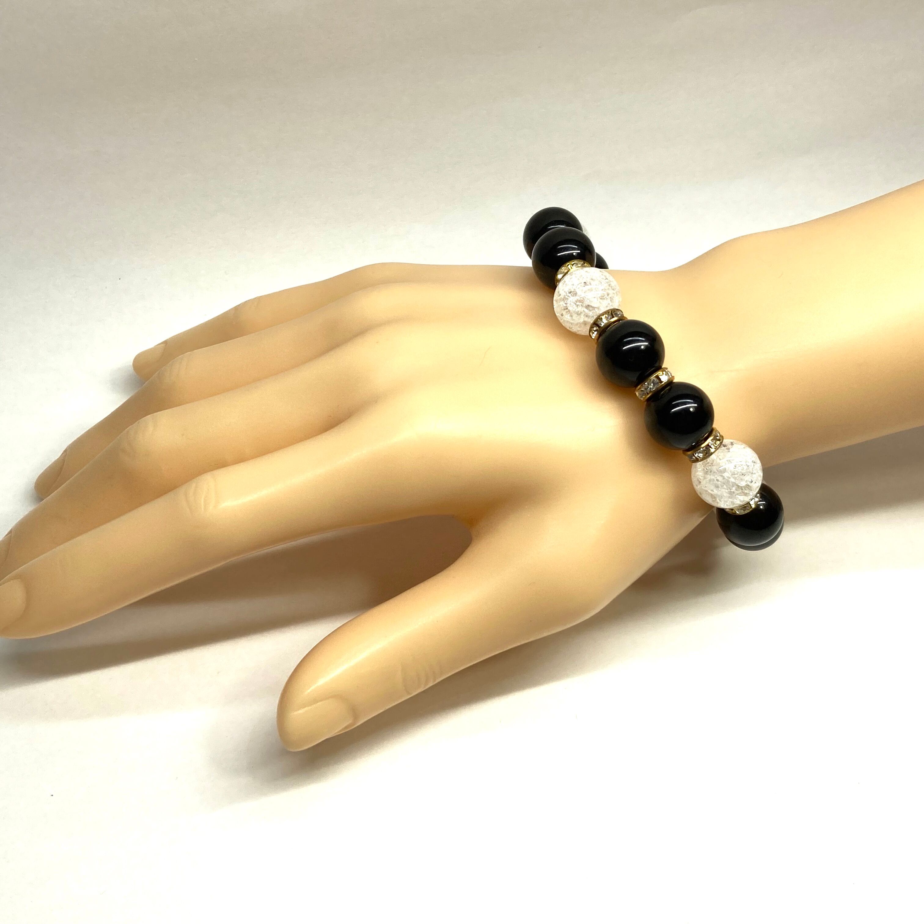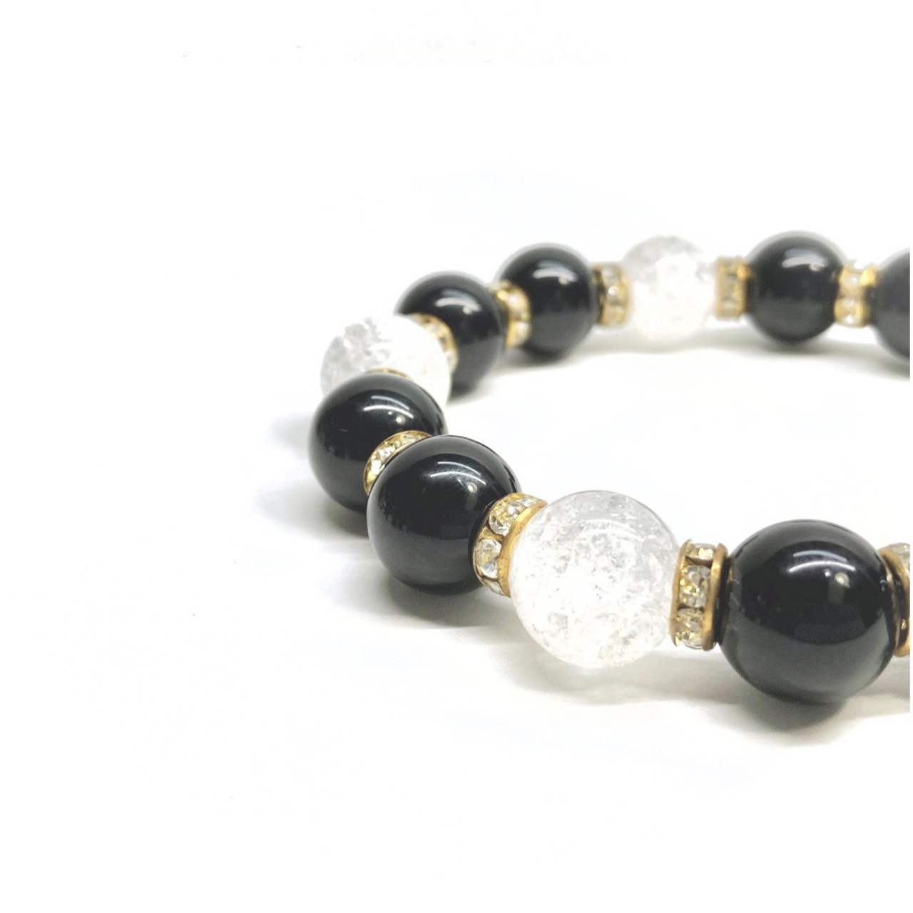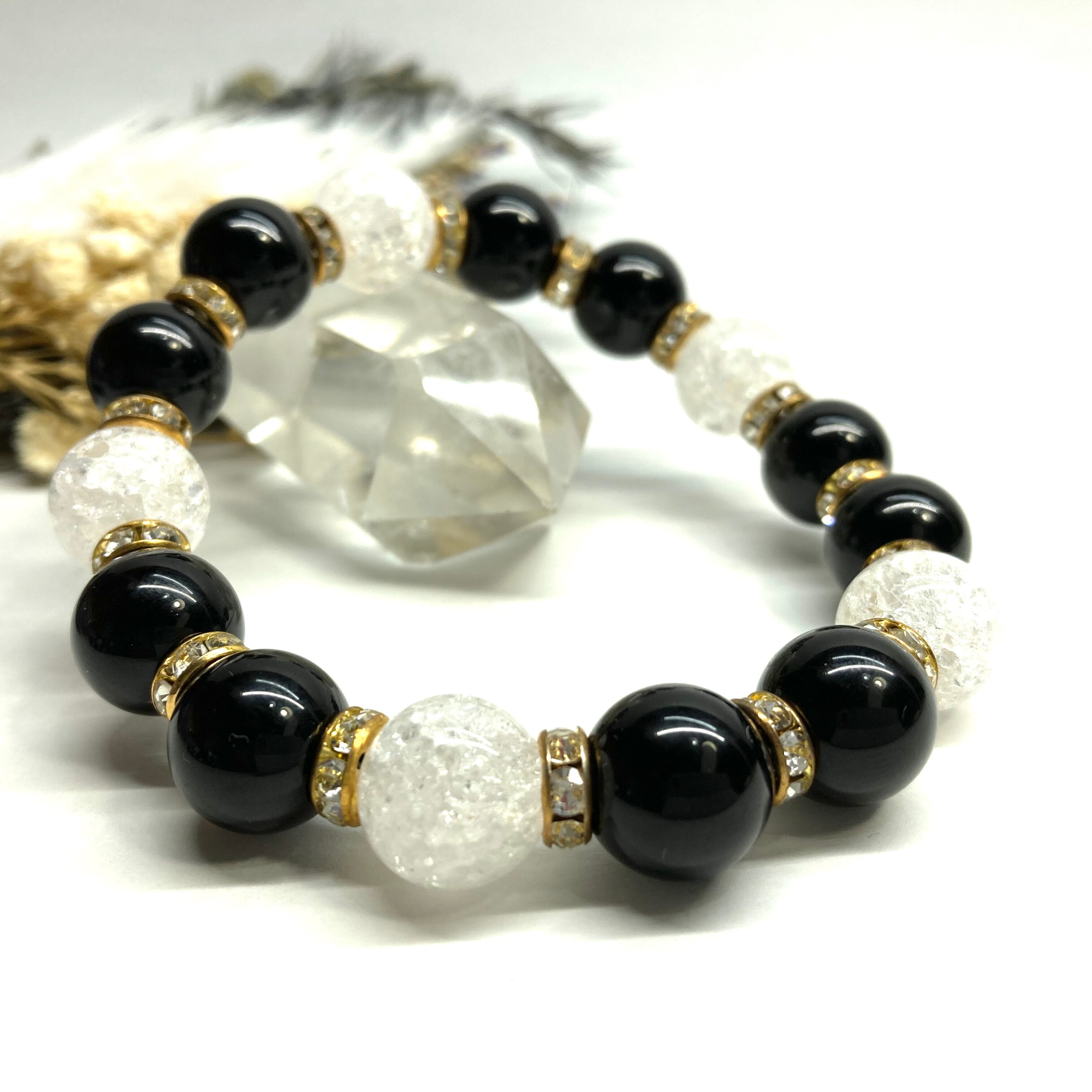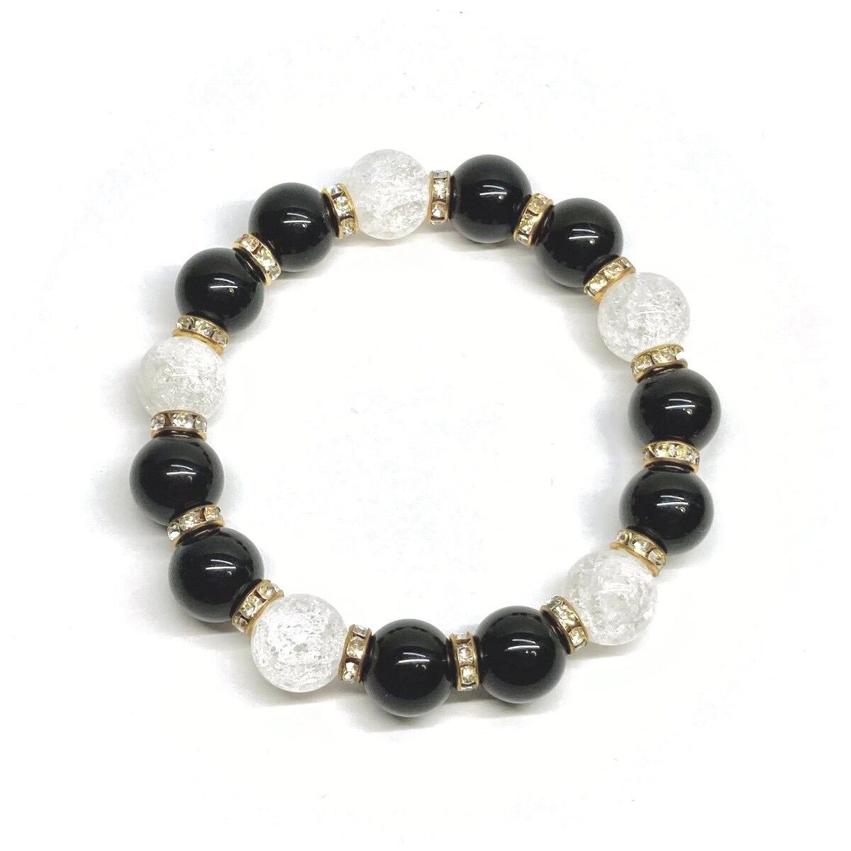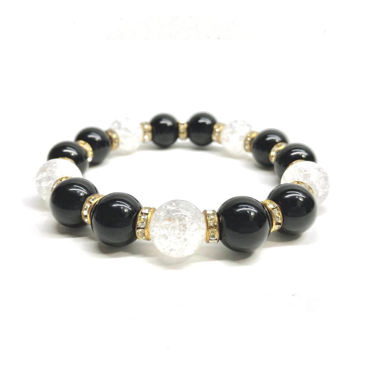 こちらは、モリオンとクラック水晶を組み合わせたパワーストーンブレスレットです。間にはロンデルを挟み高級感あるデザインに仕上げております。石大きさは12mm玉を使用して内周 約18cmです。気になる方は是非この機会にどうぞ。