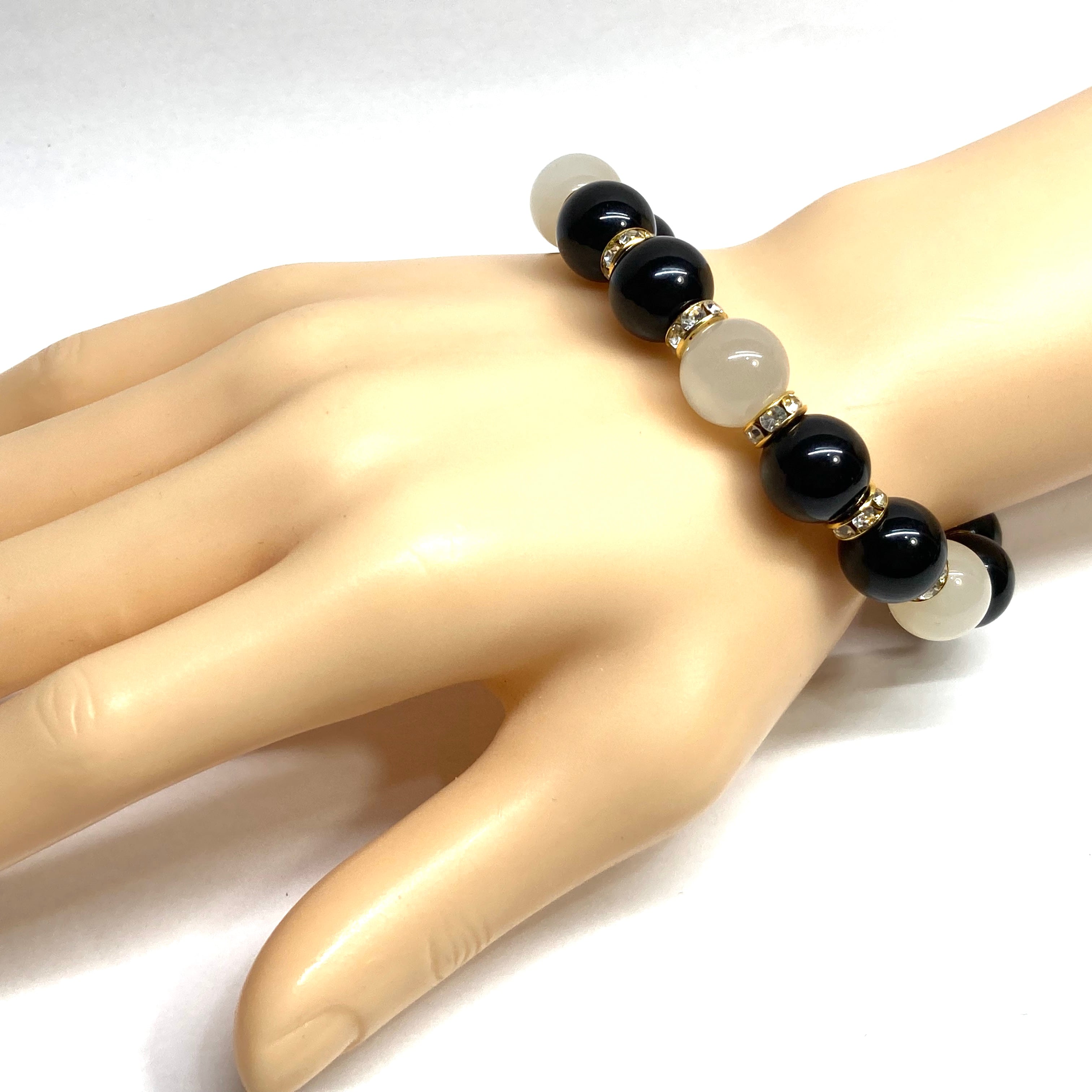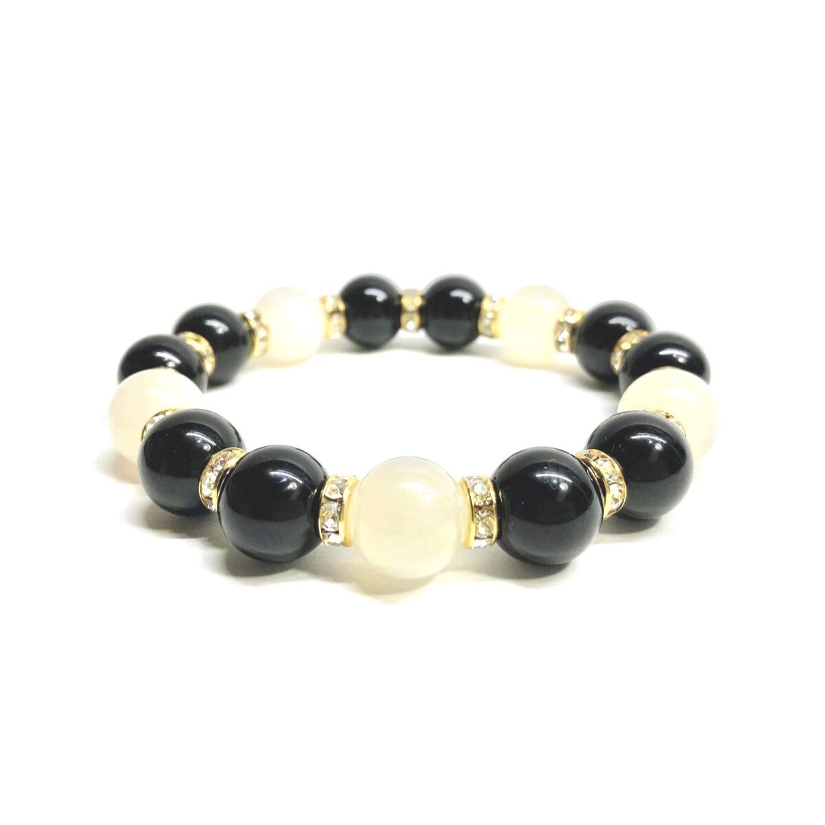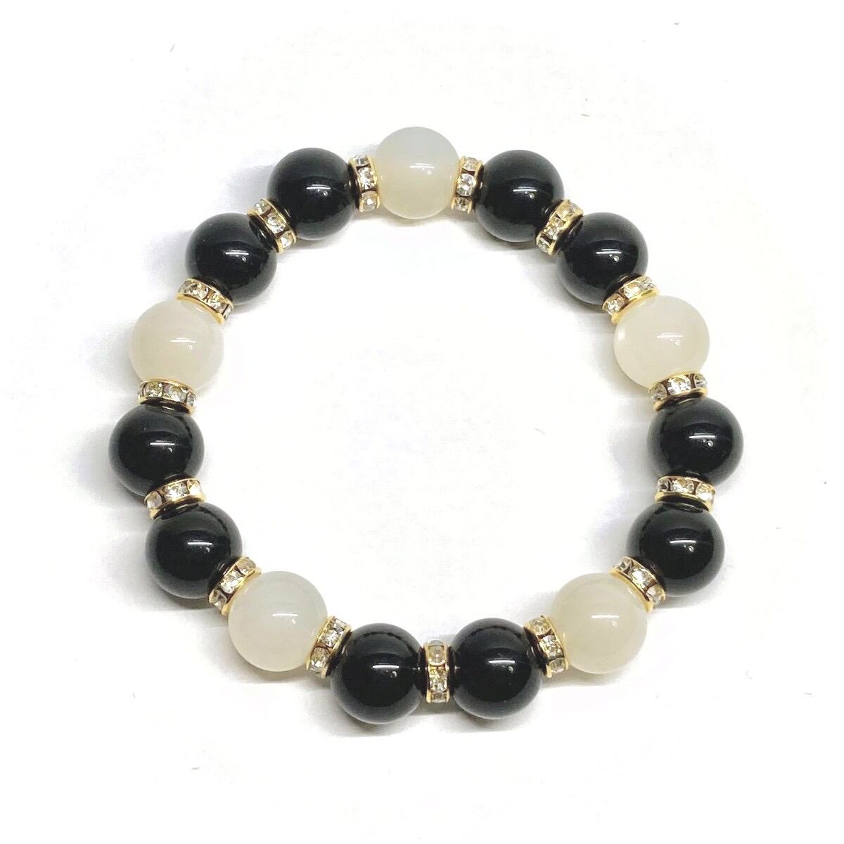 こちらは、モリオンとムーンストーンを組み合わせたパワーストーンブレスレットです。間にはロンデルを挟み高級感あるデザインに仕上げております。石大きさは12mm玉を使用して内周 約18cmです。気になる方は是非この機会にどうぞ。