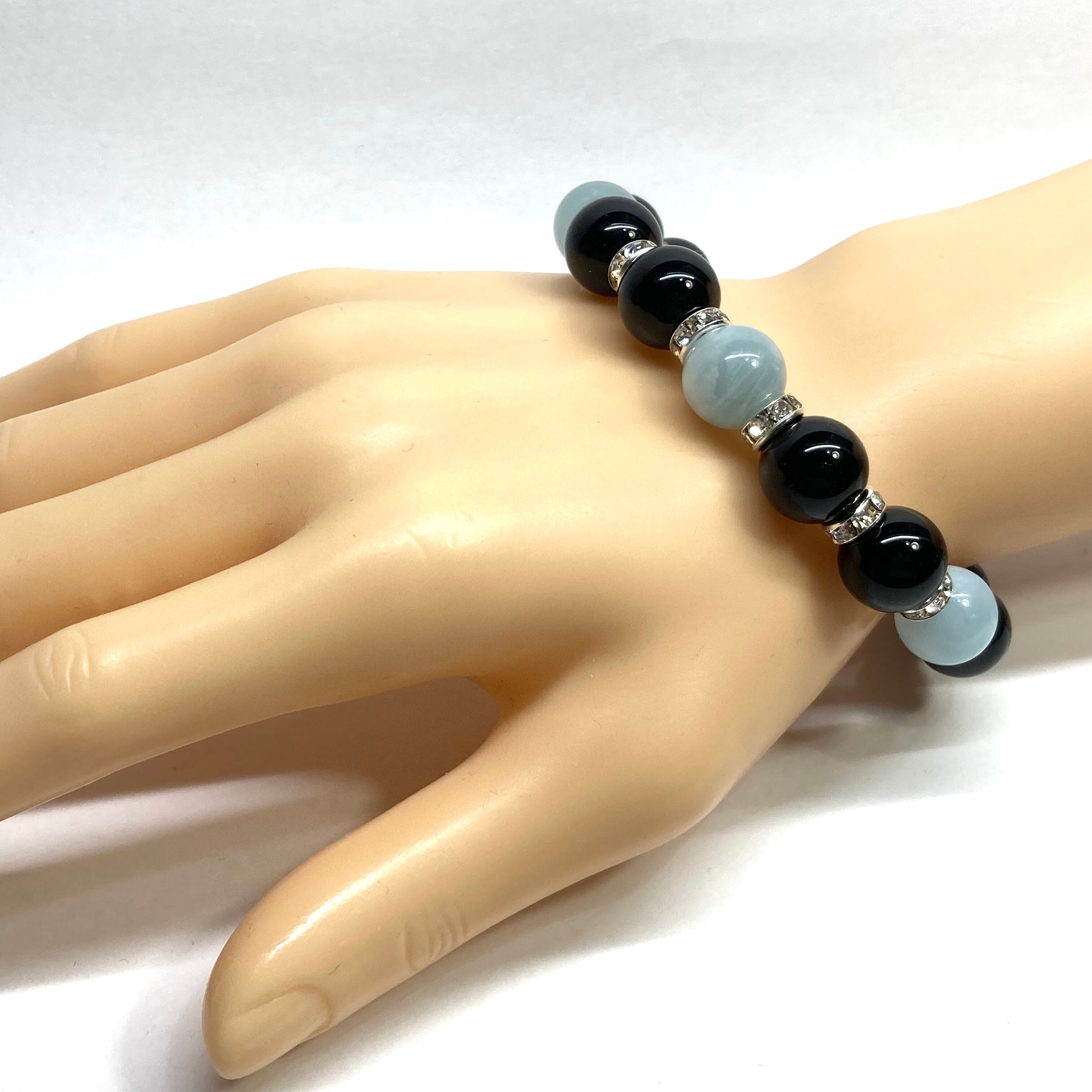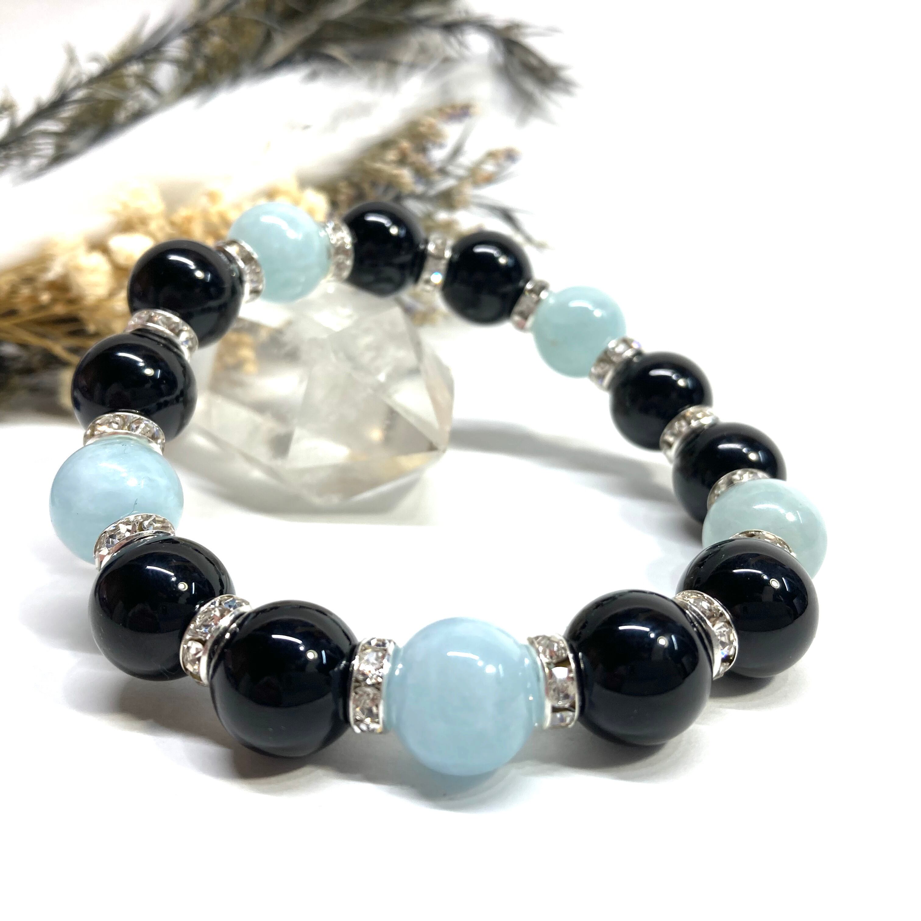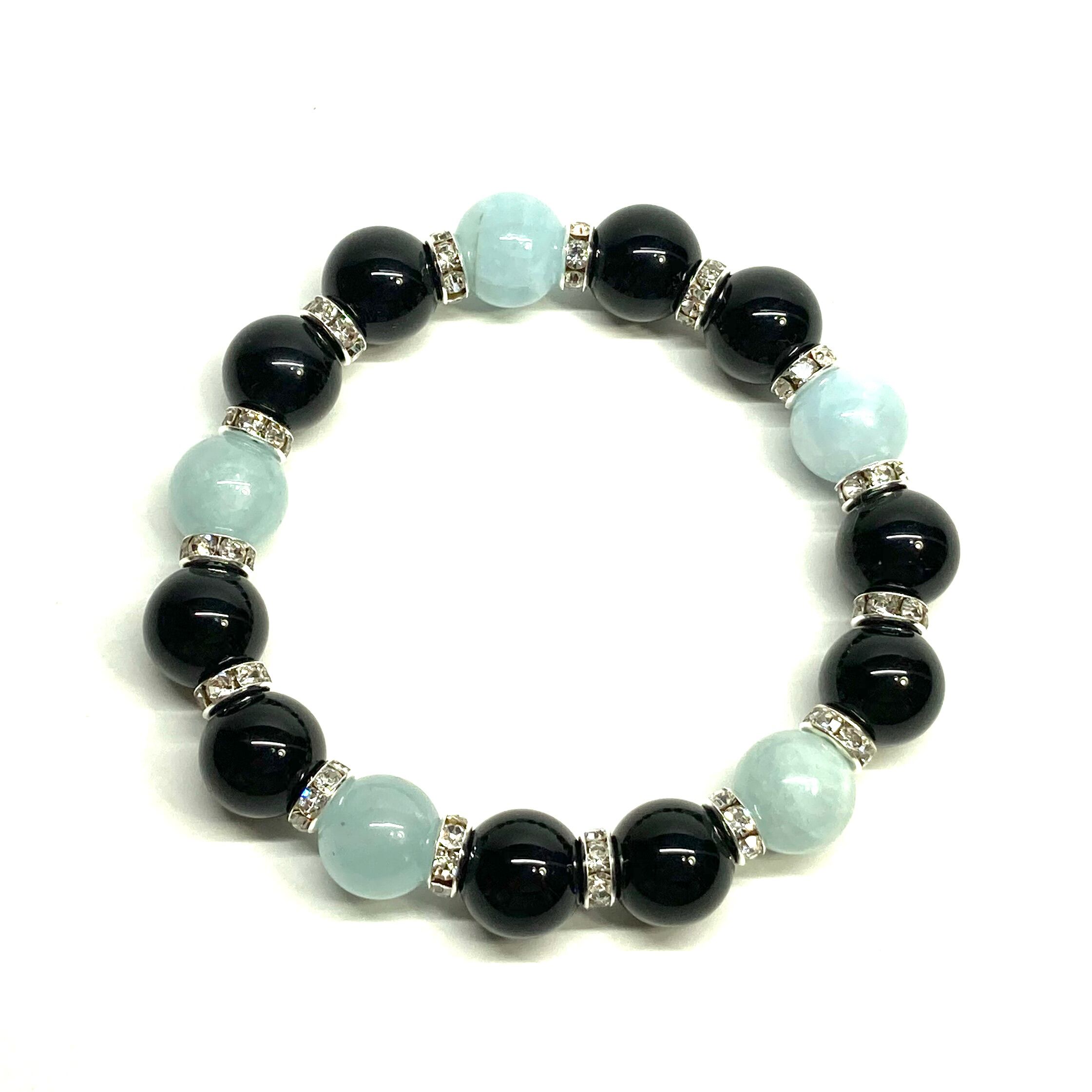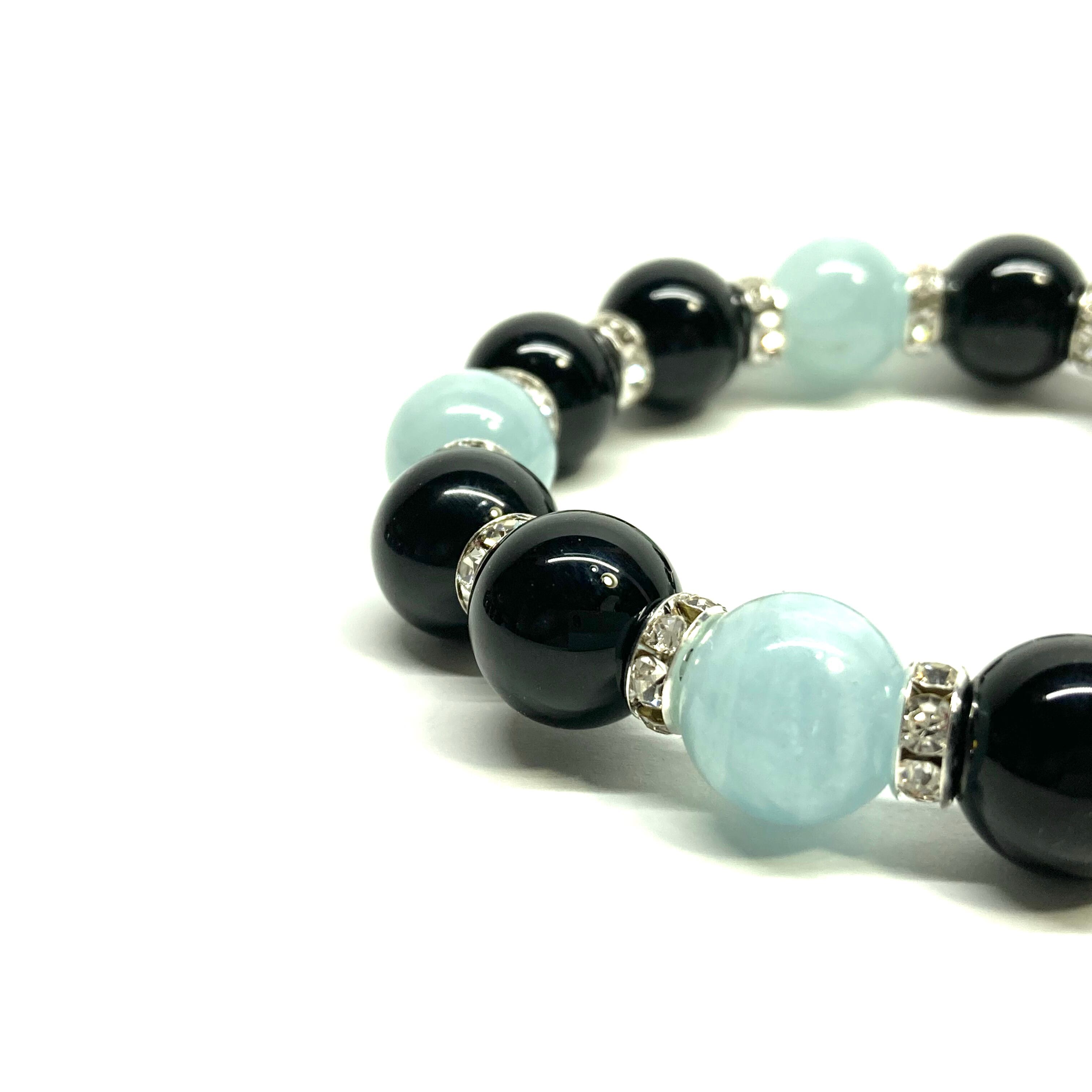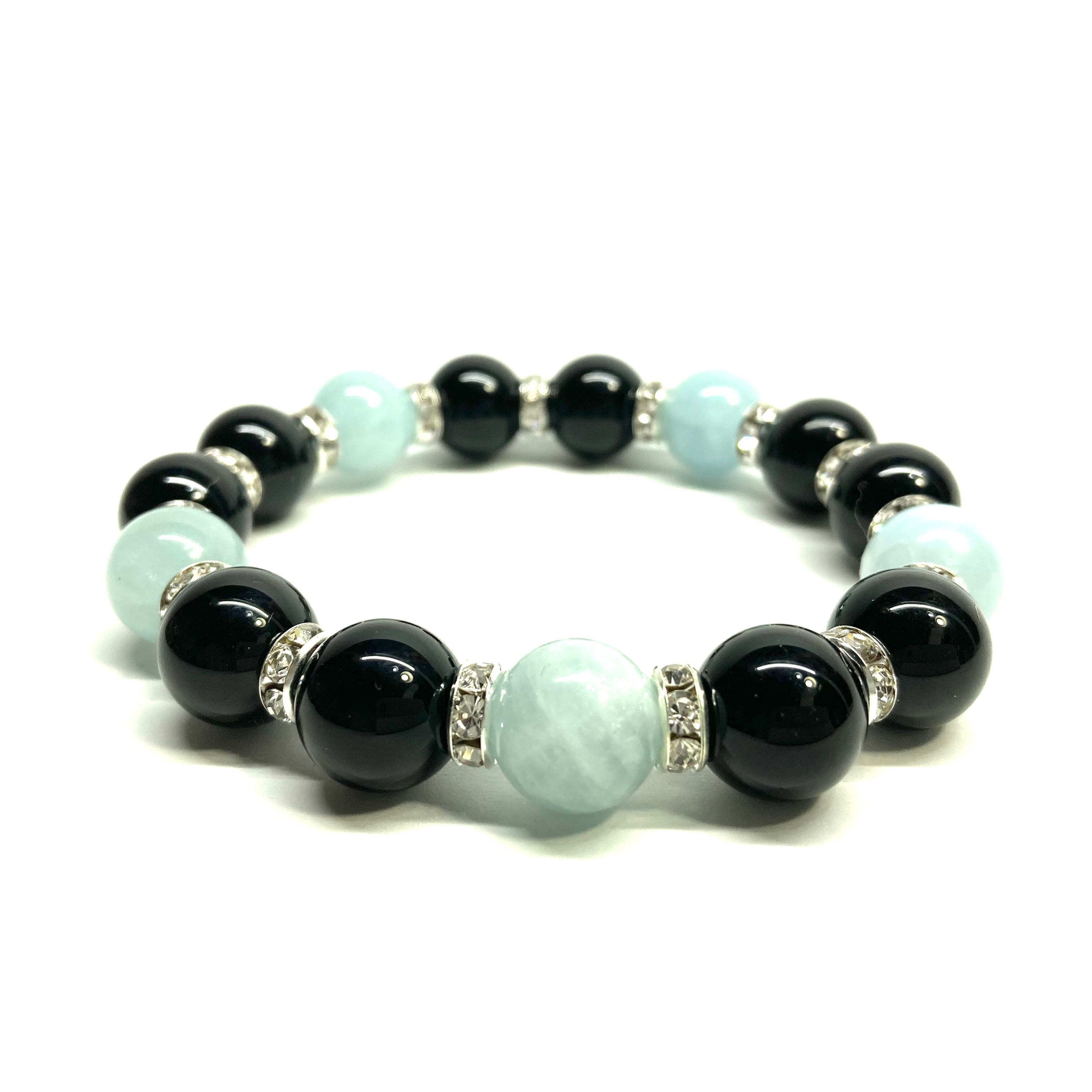 こちらは、モリオンとアクアマリンを組み合わせたパワーストーンブレスレットです。間にはロンデルを挟み高級感あるデザインに仕上げております。石大きさは12mm玉を使用して内周 約18cmです。気になる方は是非この機会にどうぞ。