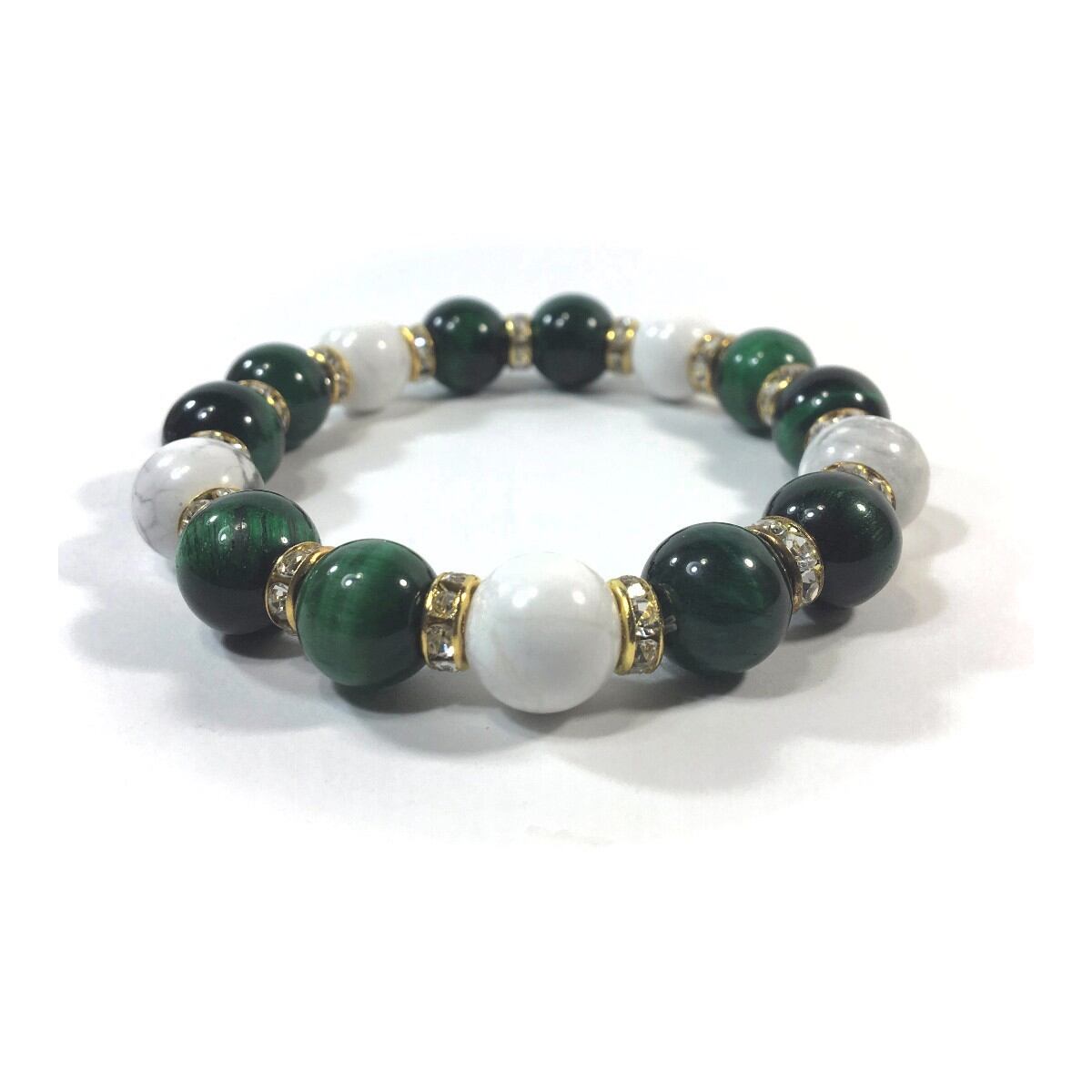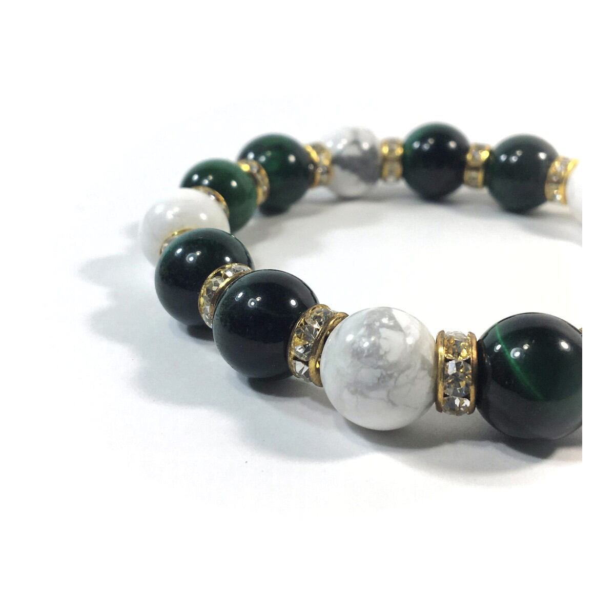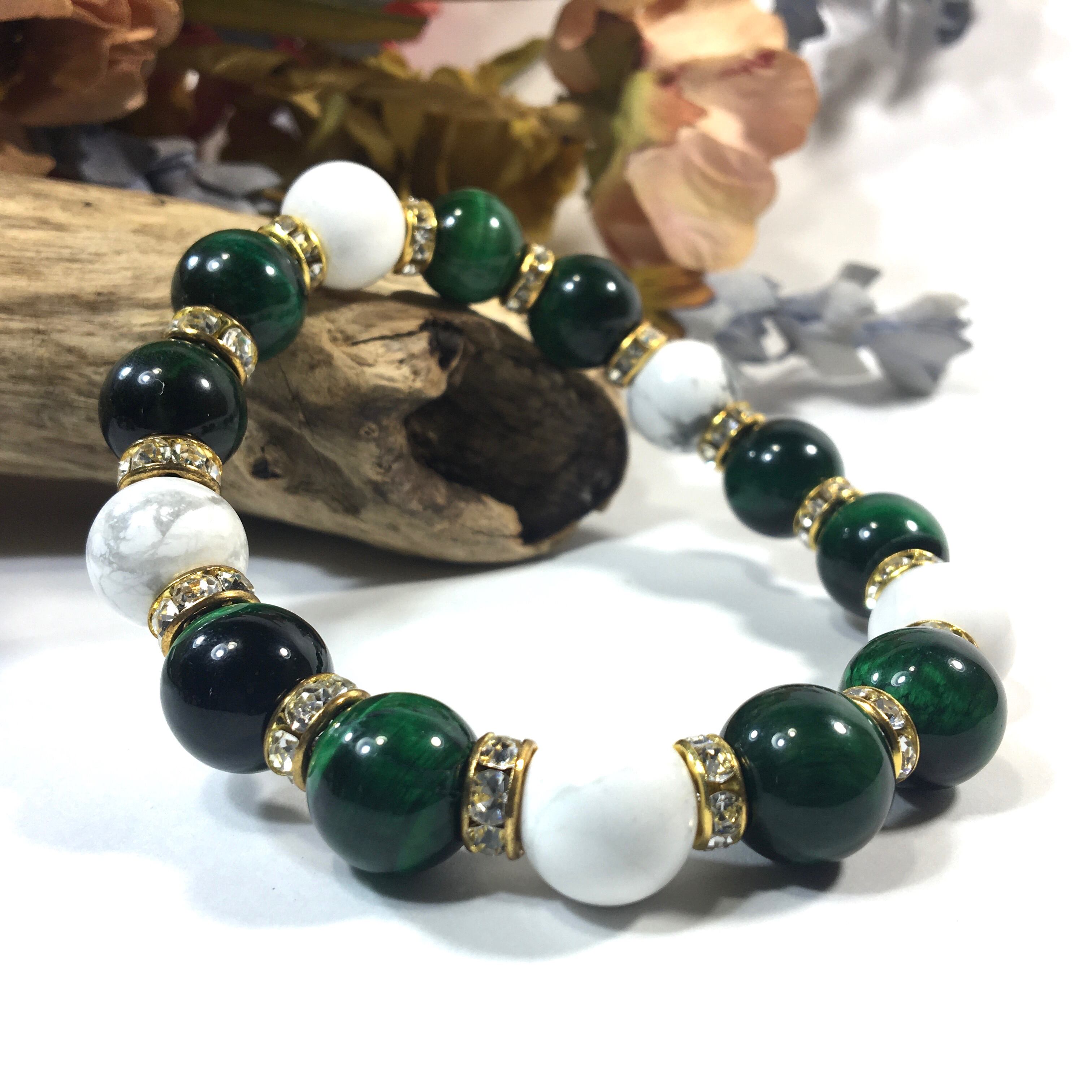 こちらは、グリーンタイガーアイとハウライトを組み合わせたパワーストーンブレスレットです。間にはロンデルを挟み高級感あるデザインに仕上げております。石大きさは12mm玉を使用して内周約18cmです。気になる方は是非この機会にどうぞ。