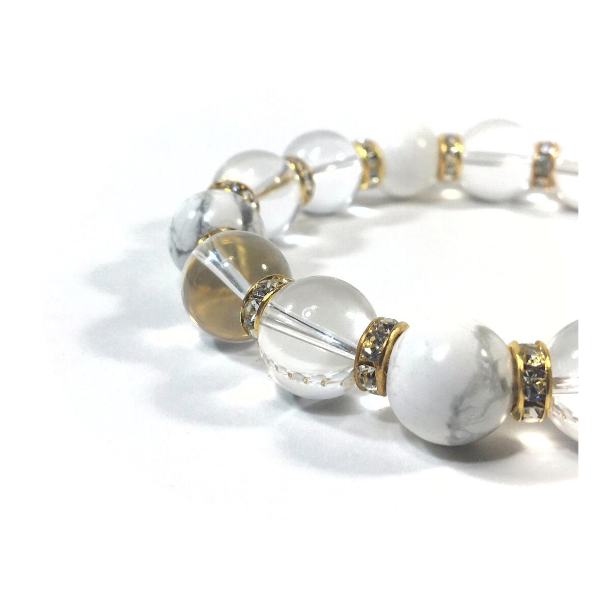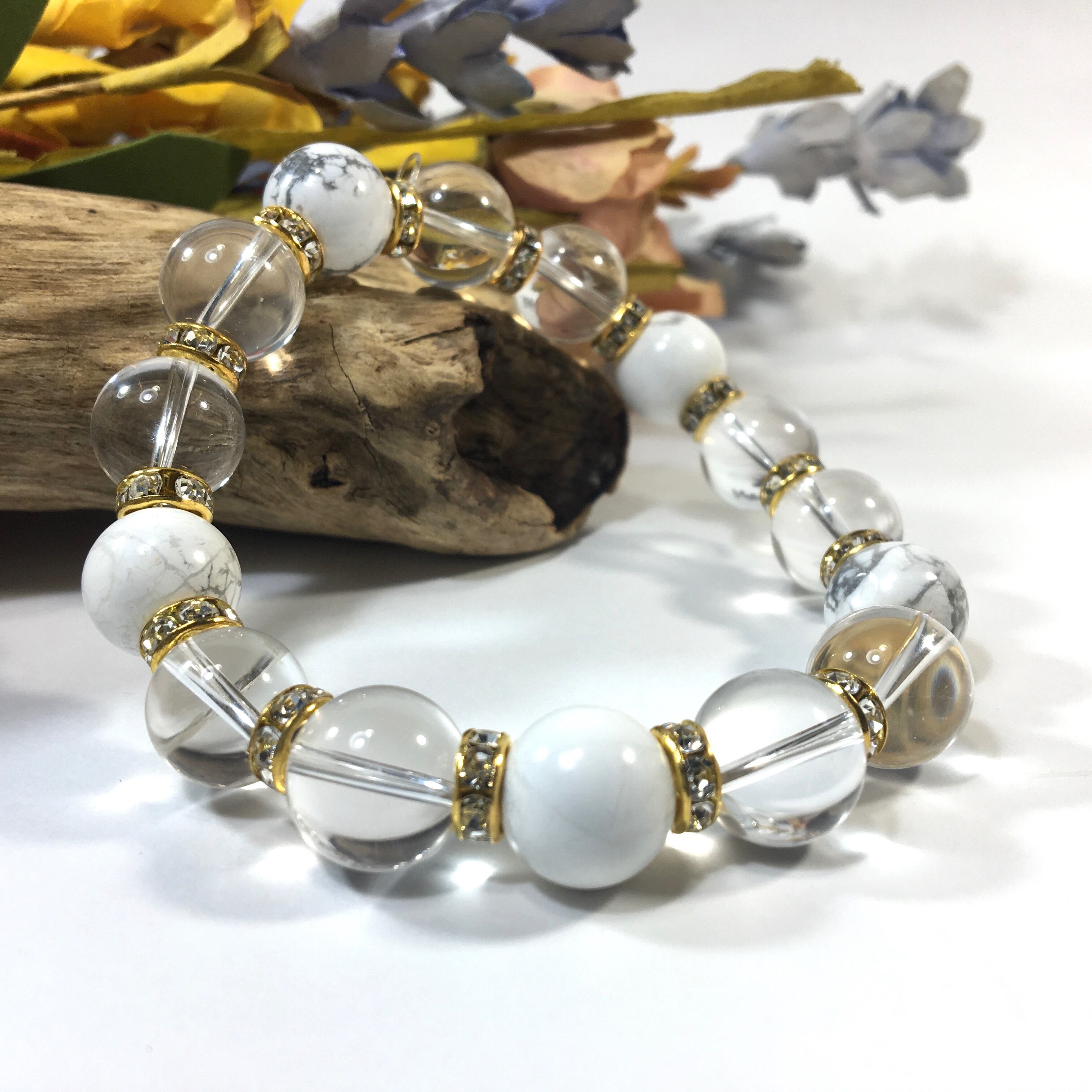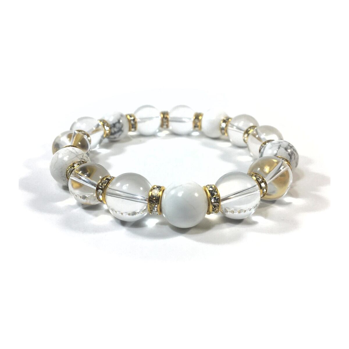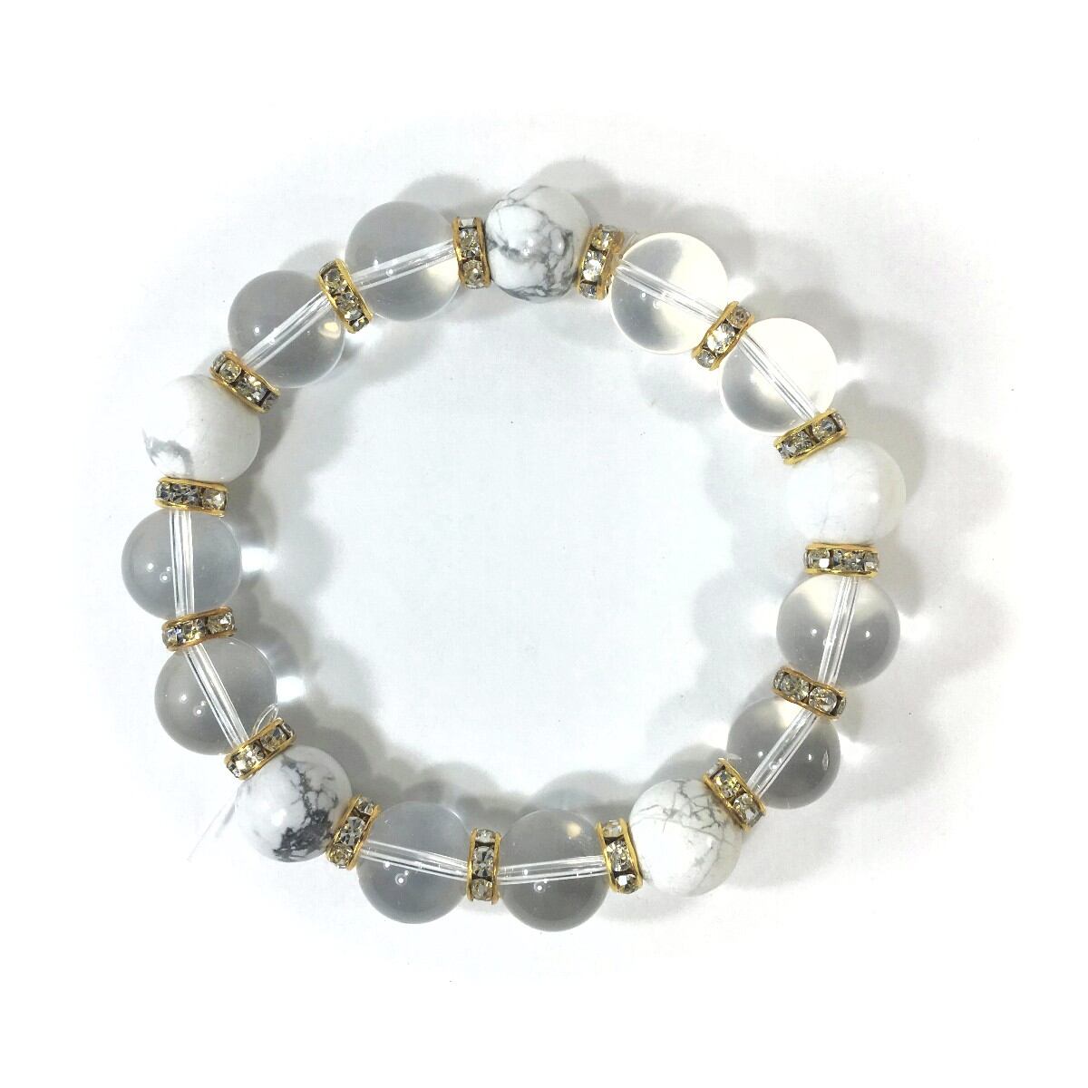 こちらは、水晶とハウライトを組み合わせたパワーストーンブレスレットです。間にはロンデルを挟み高級感あるデザインに仕上げております。石大きさは12mm玉を使用して内周約18cmです。気になる方は是非この機会にどうぞ。