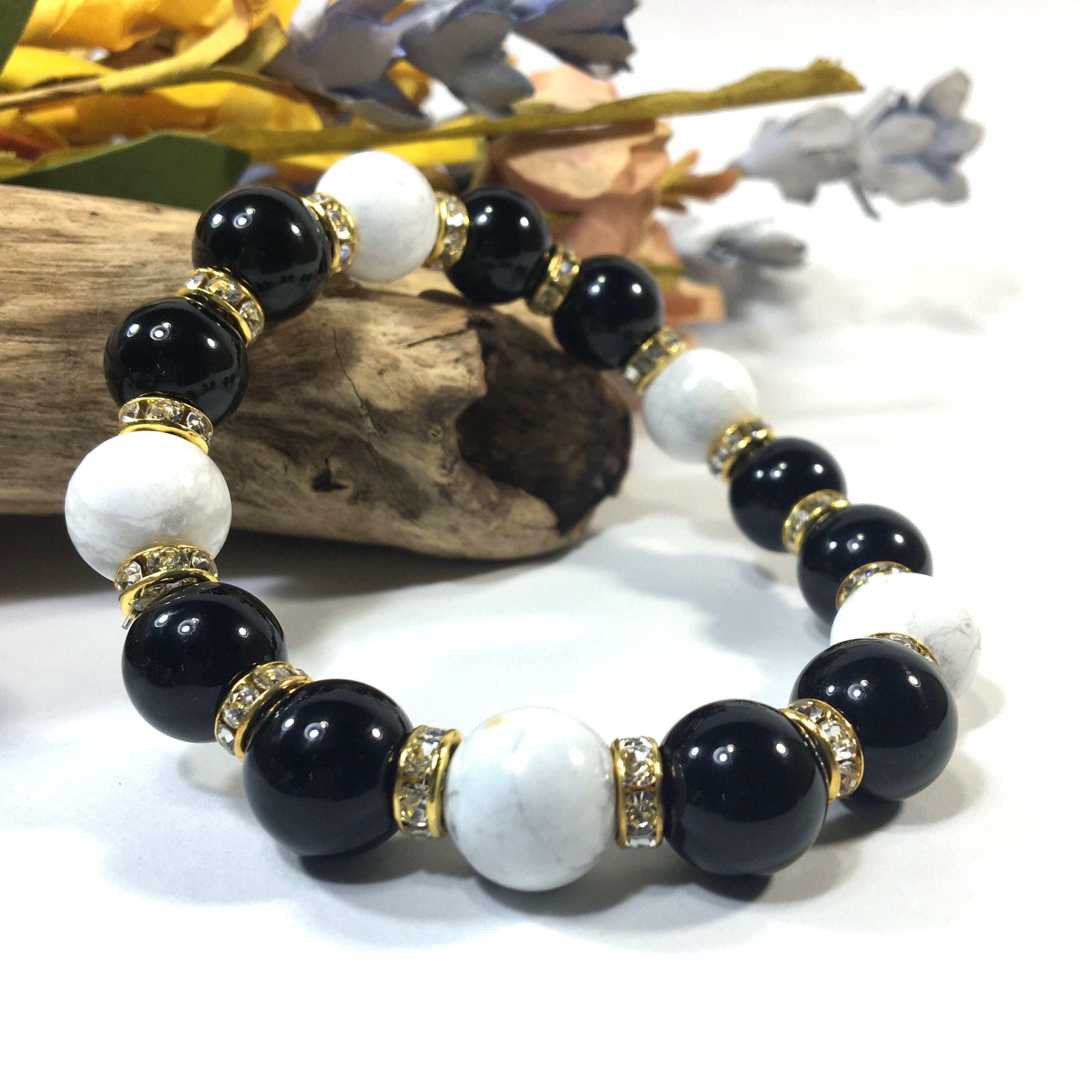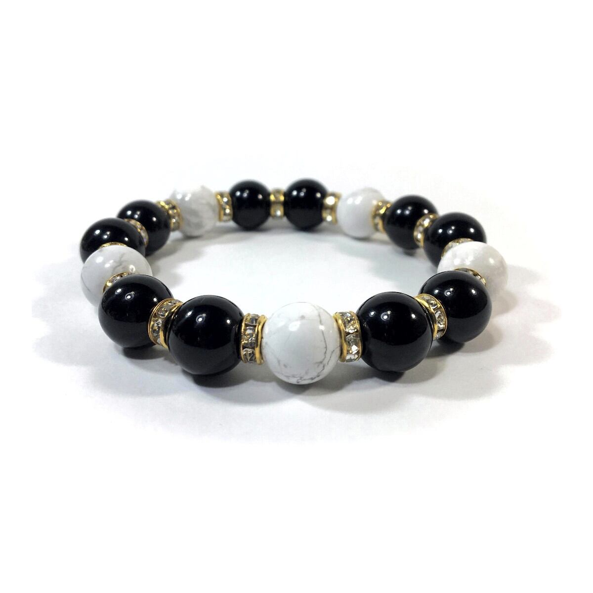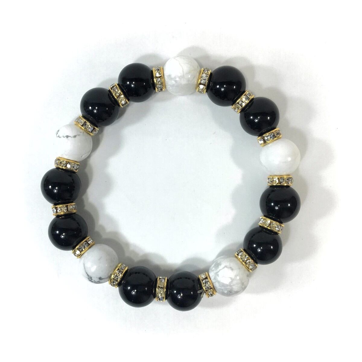 こちらは、オニキスとハウライトを組み合わせたパワーストーンブレスレットです。間にはロンデルを挟み高級感あるデザインに仕上げております。石大きさは12mm玉を使用して内周約18cmです。気になる方は是非この機会にどうぞ。