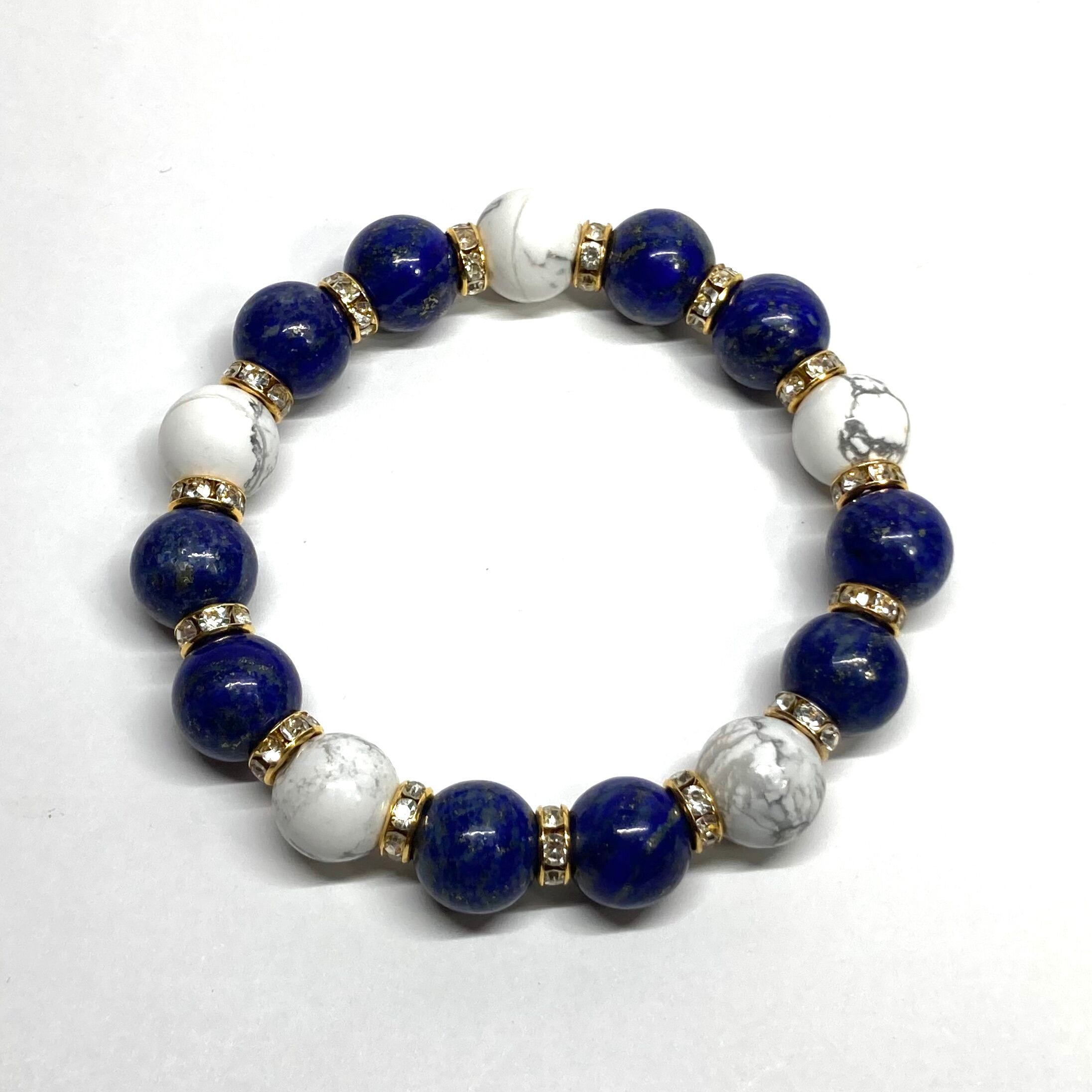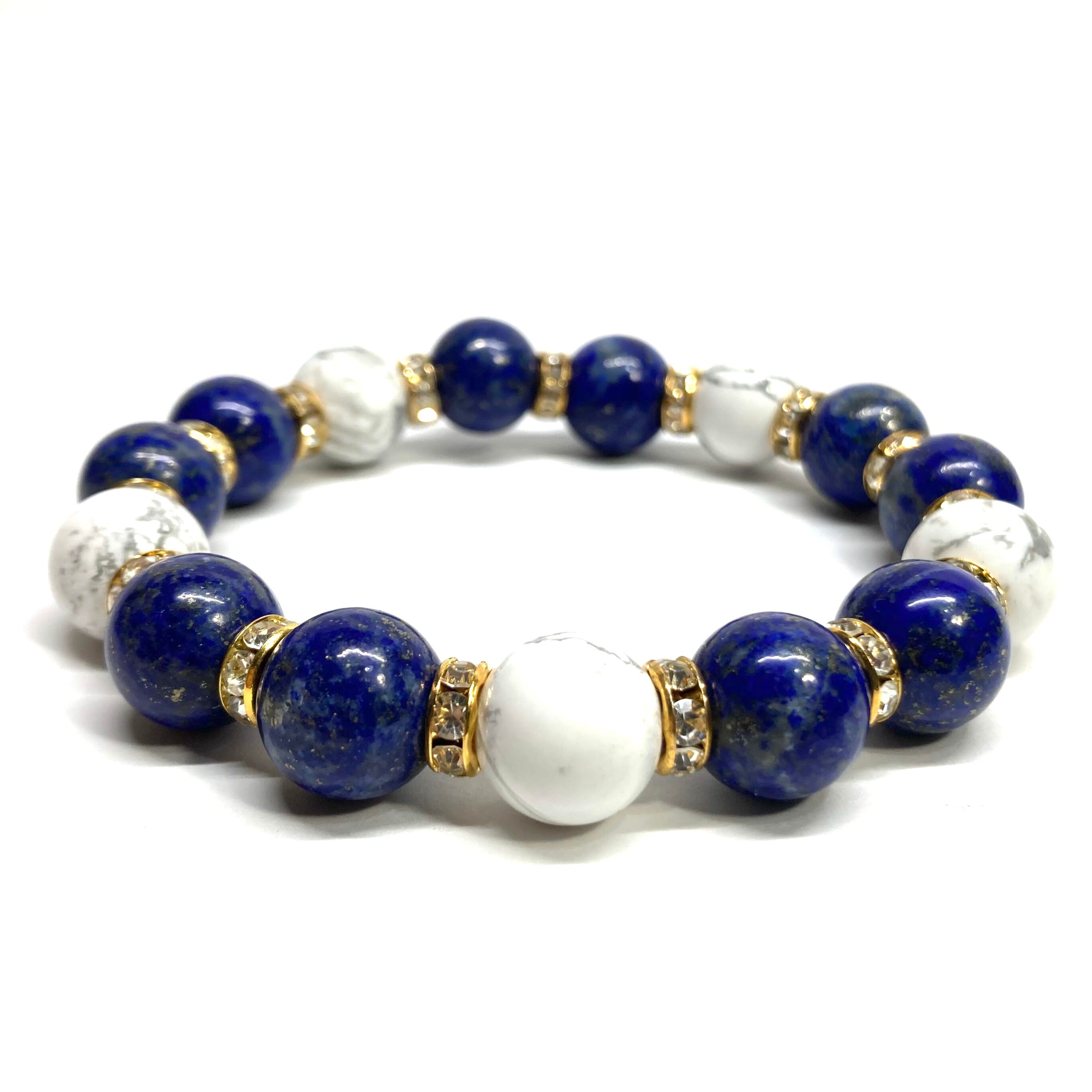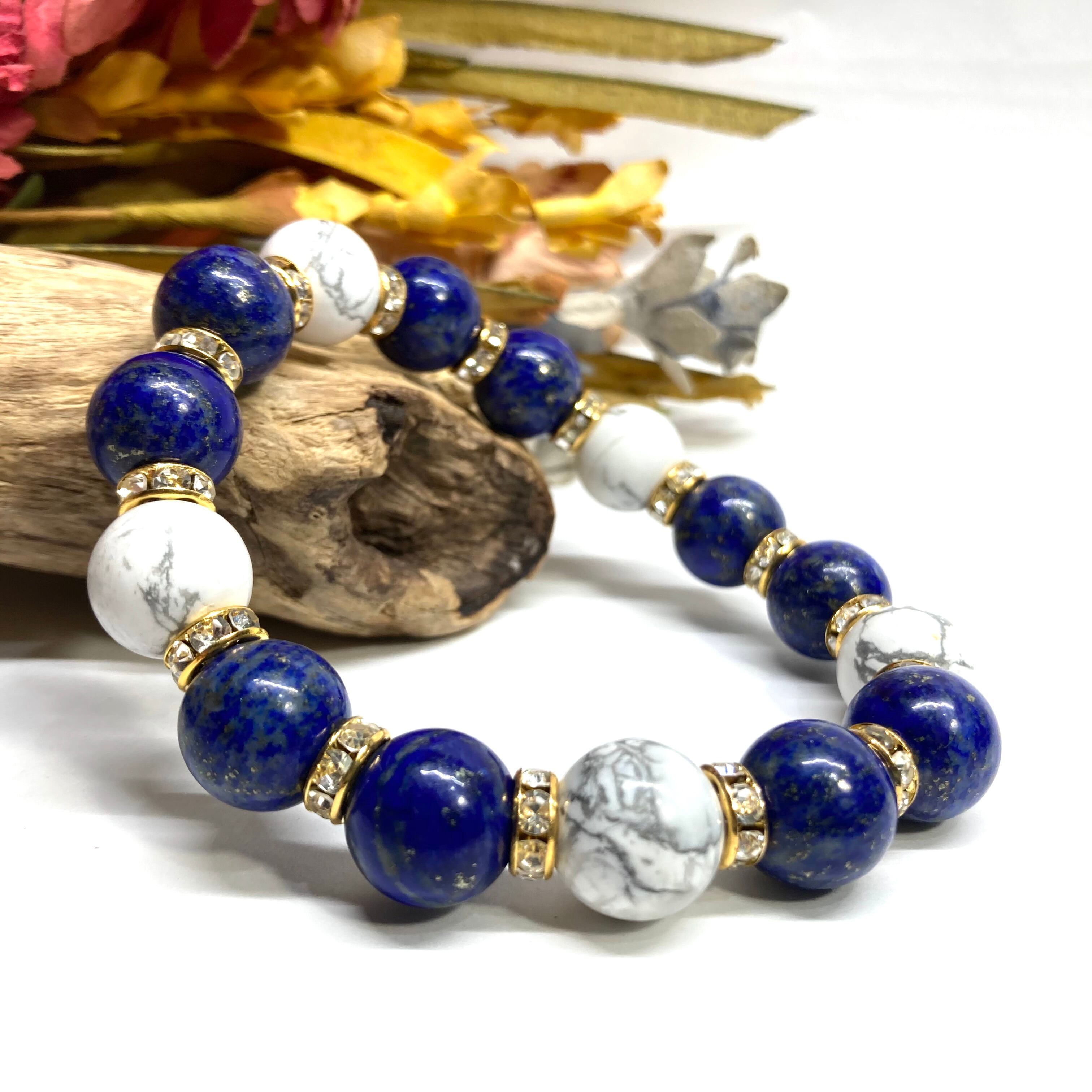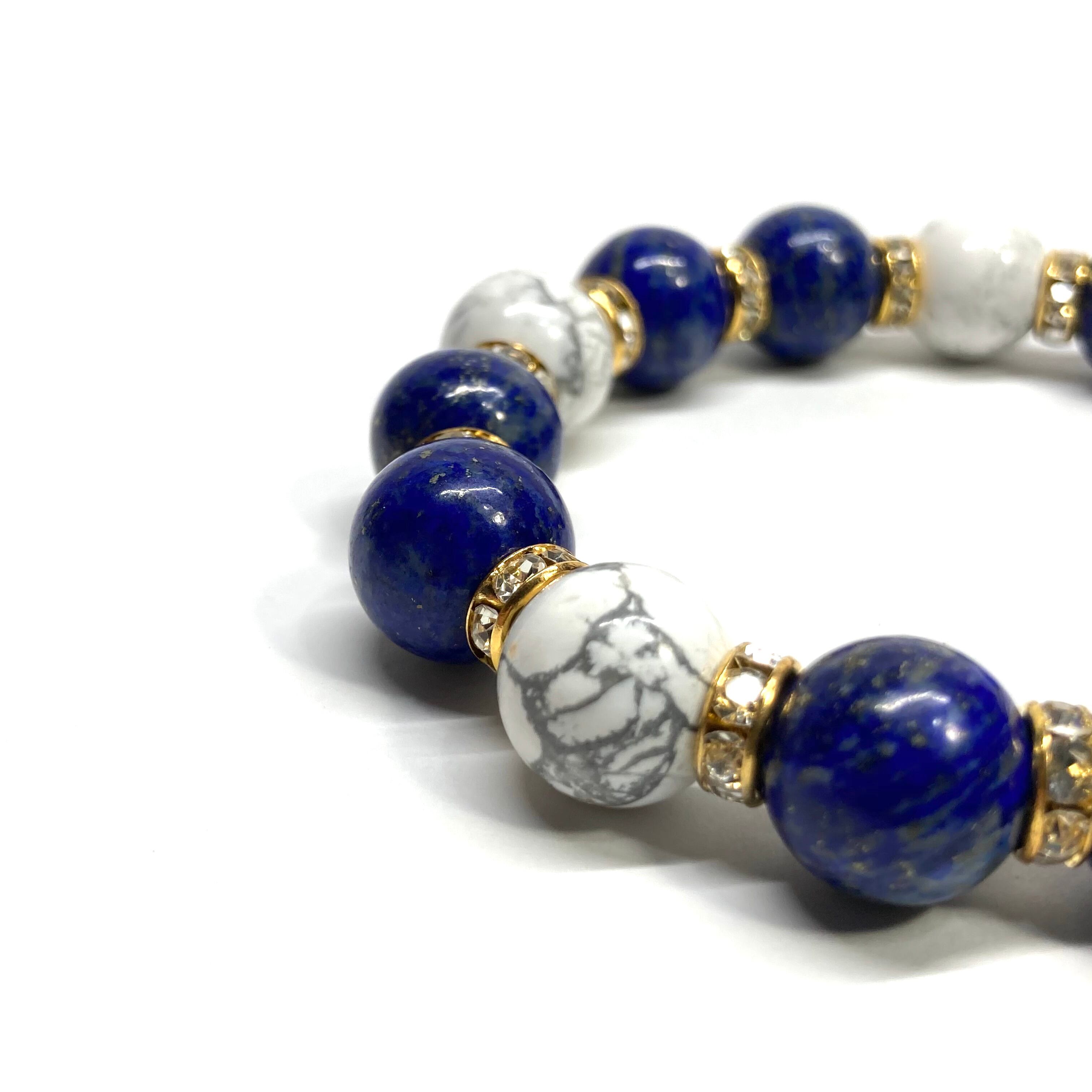 こちらは、ラピスラズリとハウライトを組み合わせたパワーストーンブレスレットです。間にはロンデルを挟み高級感あるデザインに仕上げております。程よくインパクトがある12mm玉を使用して内周約18cmです。数に限りがございますので気になる方はお早めにどうぞ。