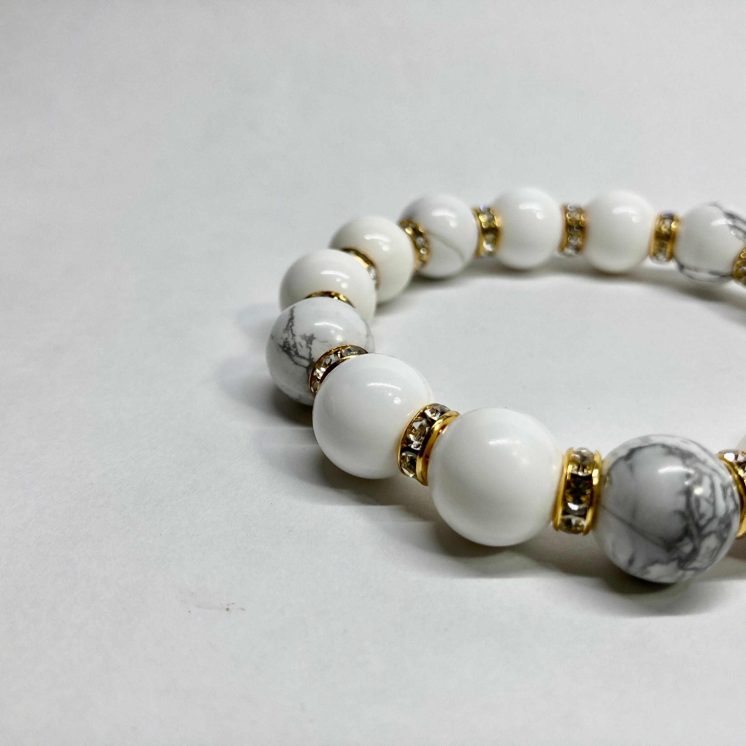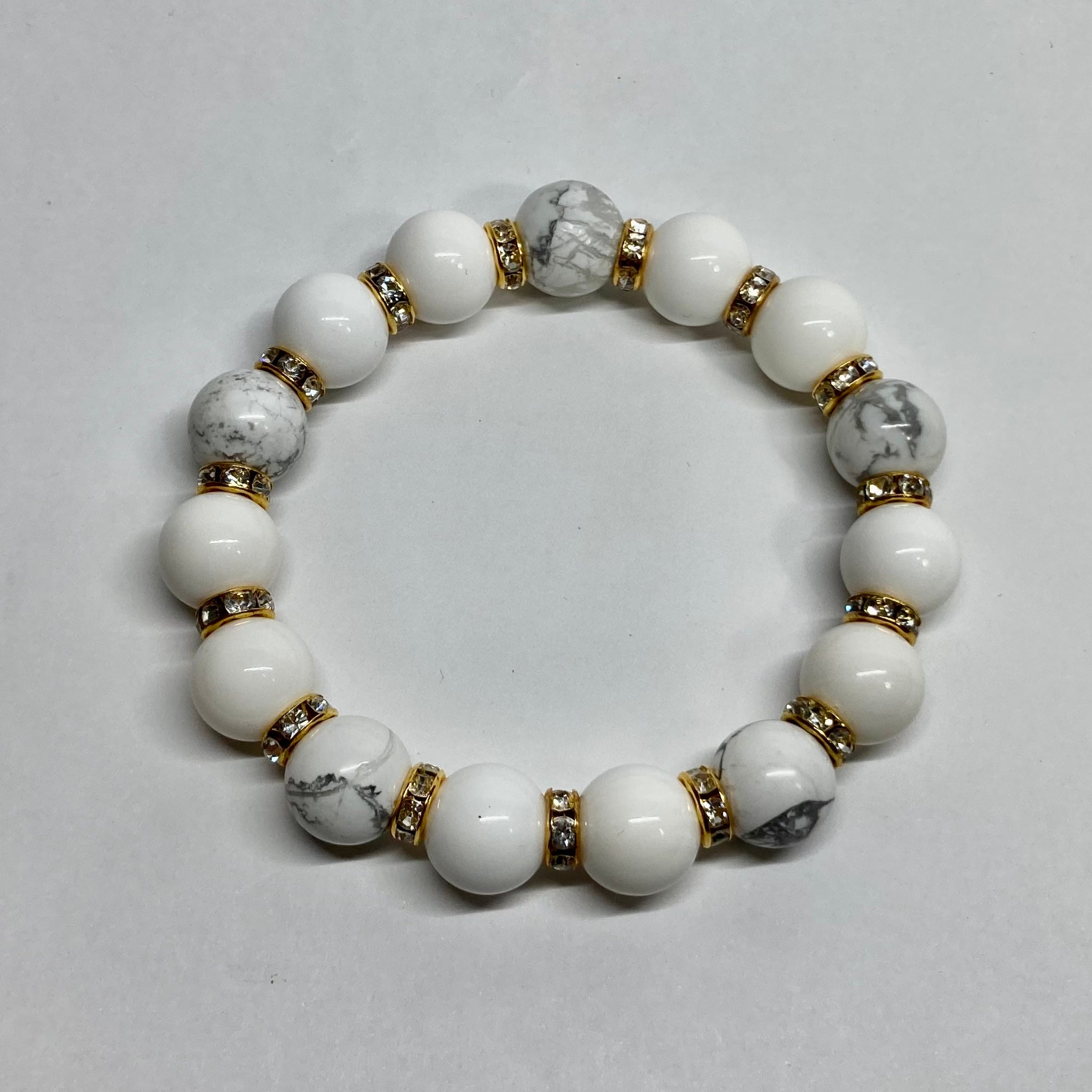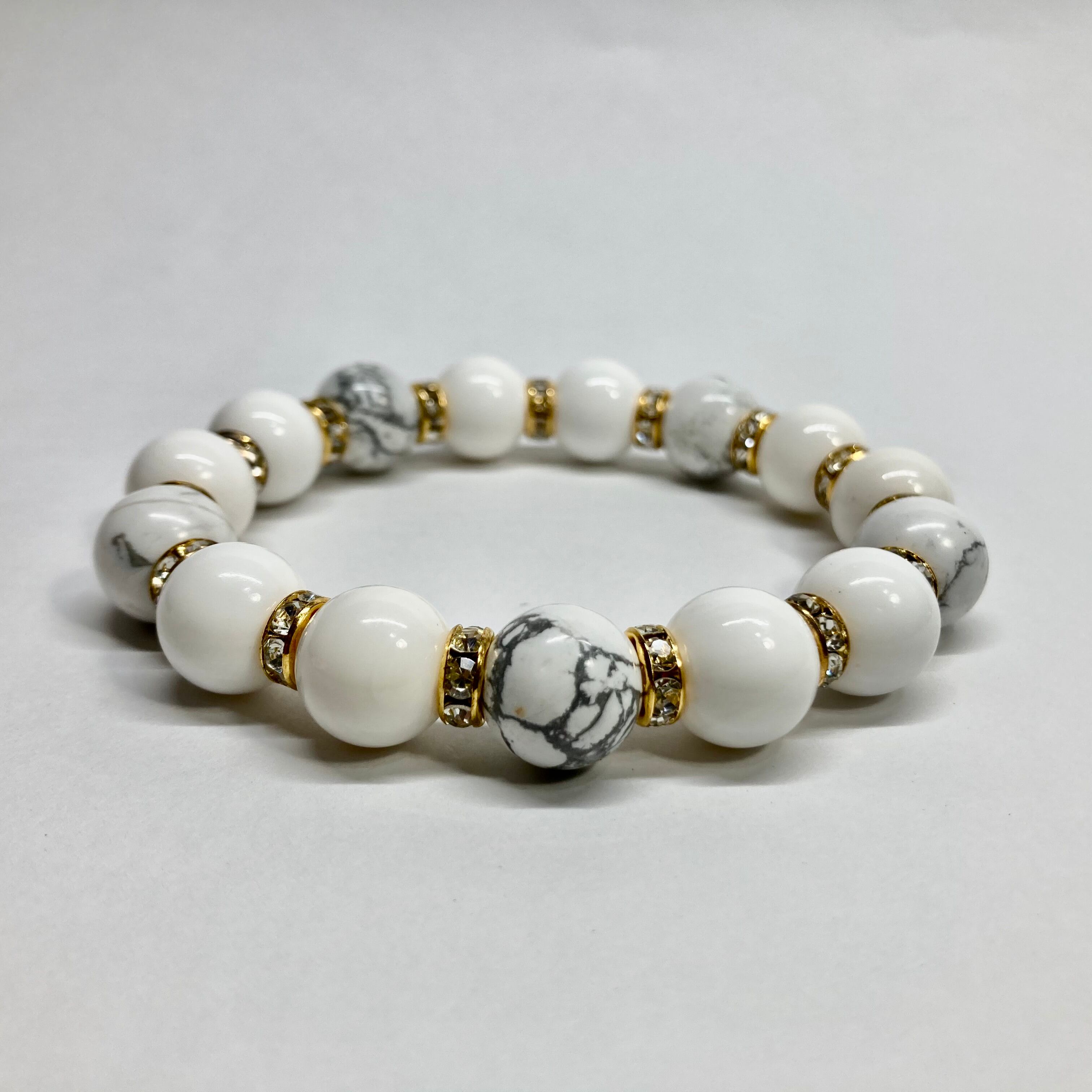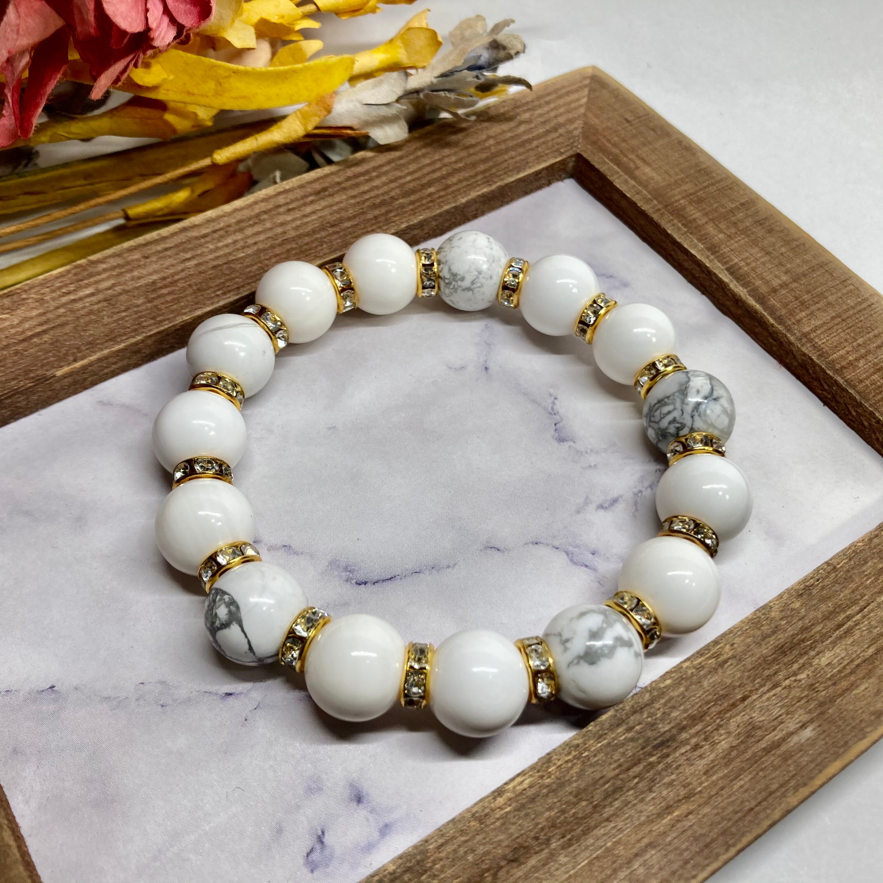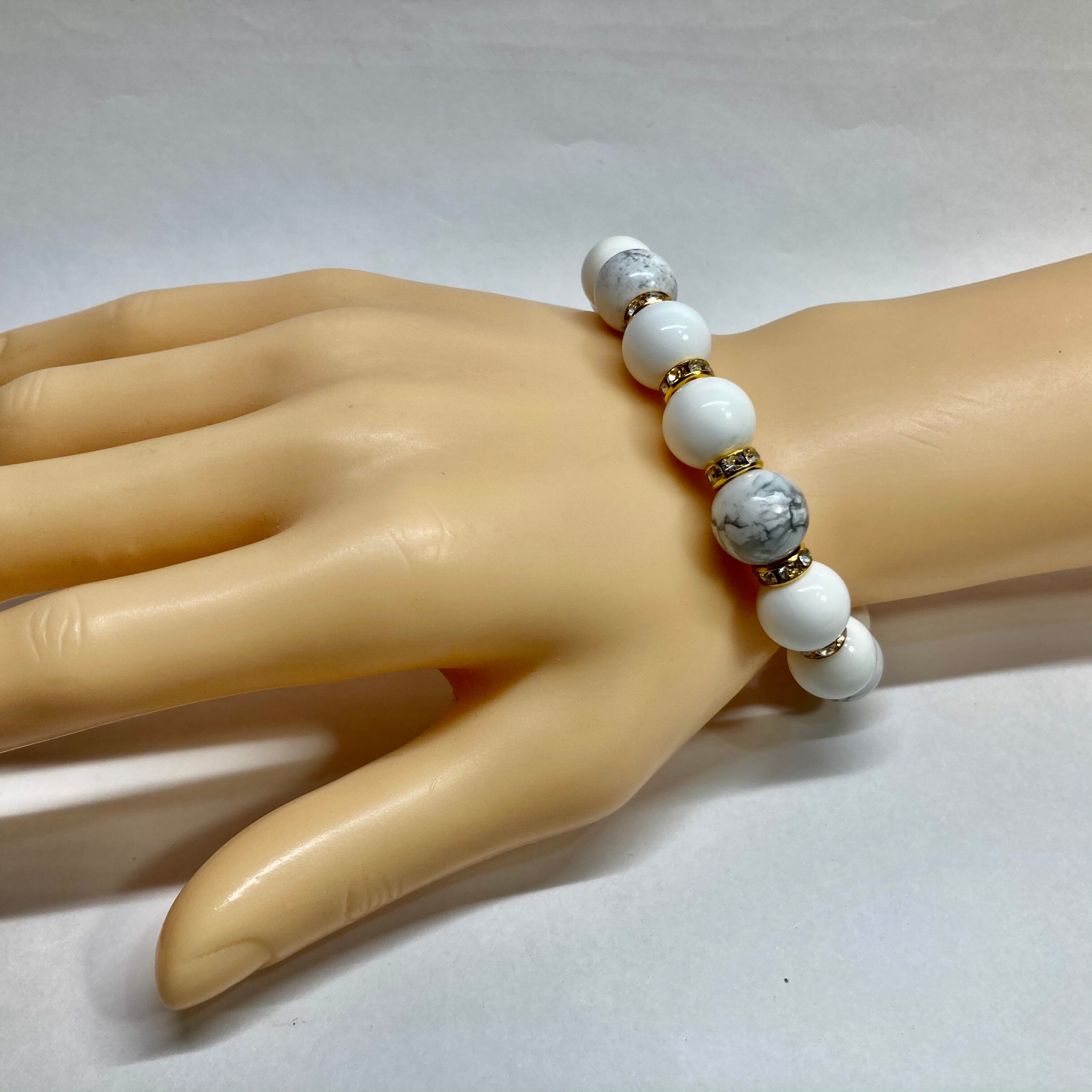 こちらは、ホワイトオニキスとハウライトを組み合わせたパワーストーンブレスレットです。間にはロンデルを挟み高級感あるデザインに仕上げております。程よくインパクトがある12mm玉を使用して内周約18cmです。数に限りがございますので気になる方はお早めにどうぞ。