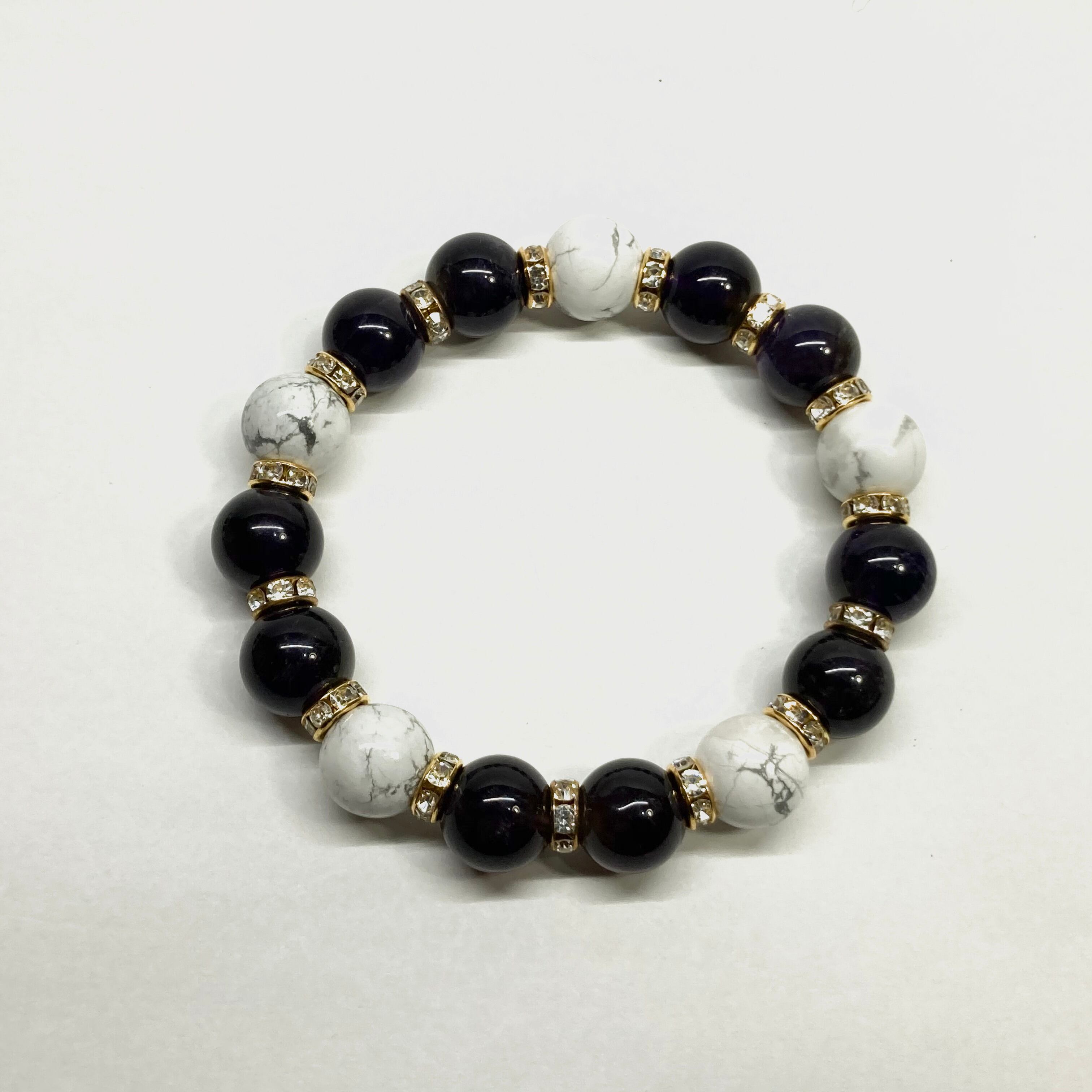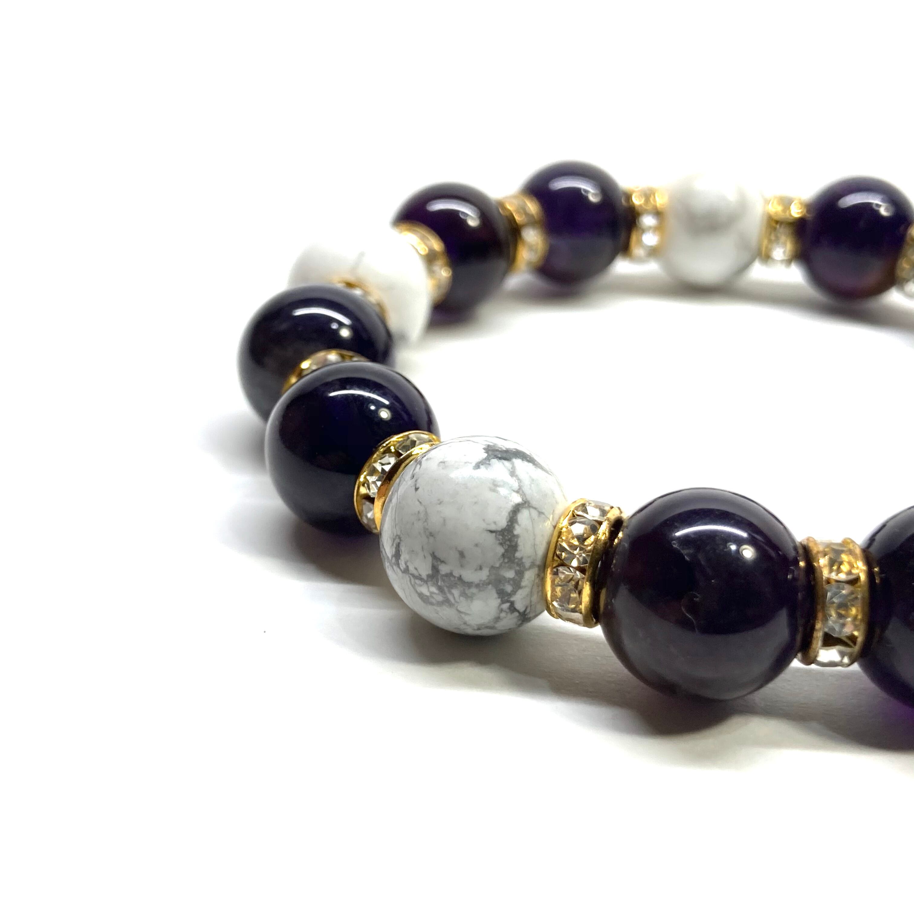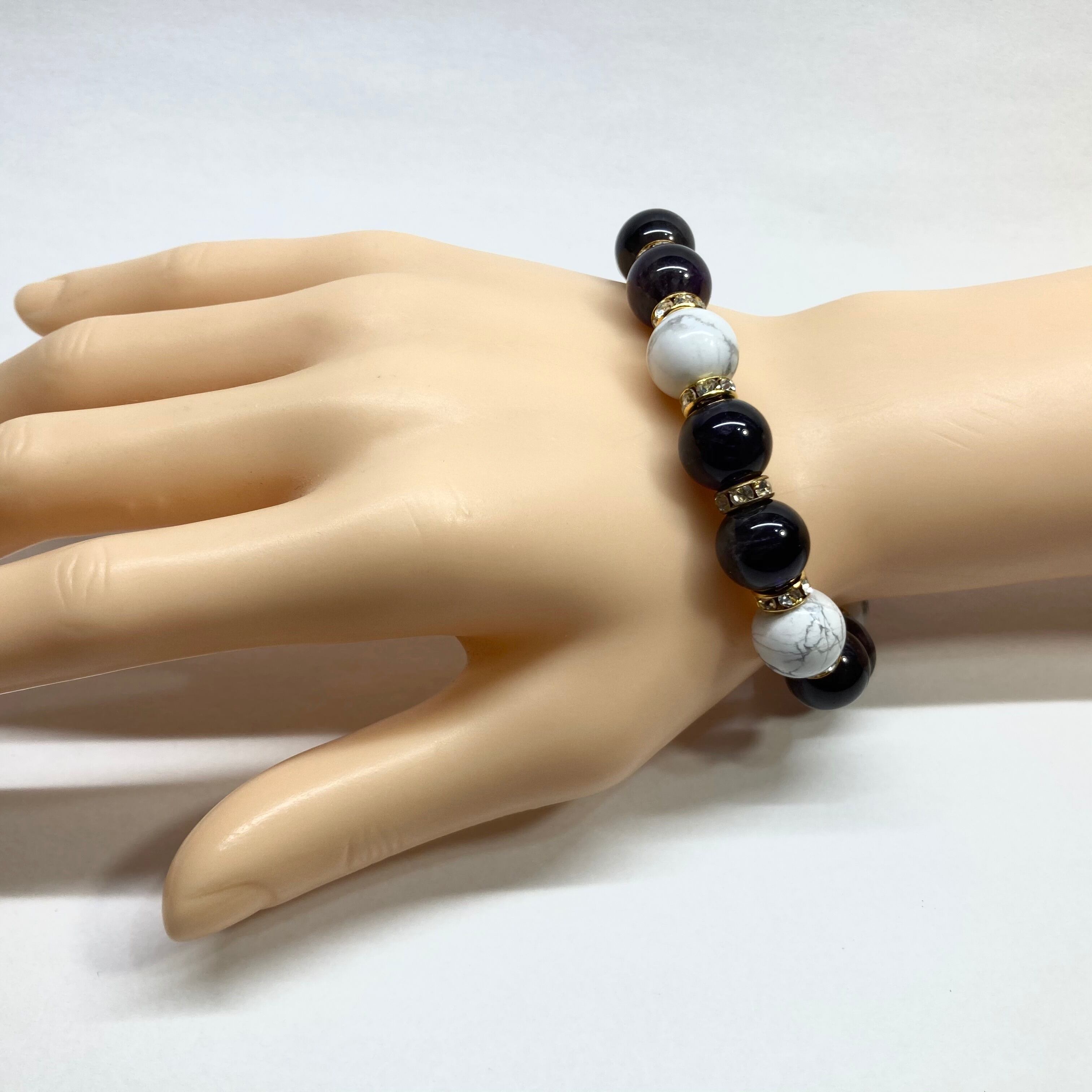 こちらは、12mm玉のアメジストとハウライトを組み合わせたパワーストーンブレスレットです。間にはロンデルを挟み高級感あるデザインに仕上げております。石大きさは12mm玉を使用して内周約18cmです。数に限りがございますので気になる方はお早めにどうぞ。