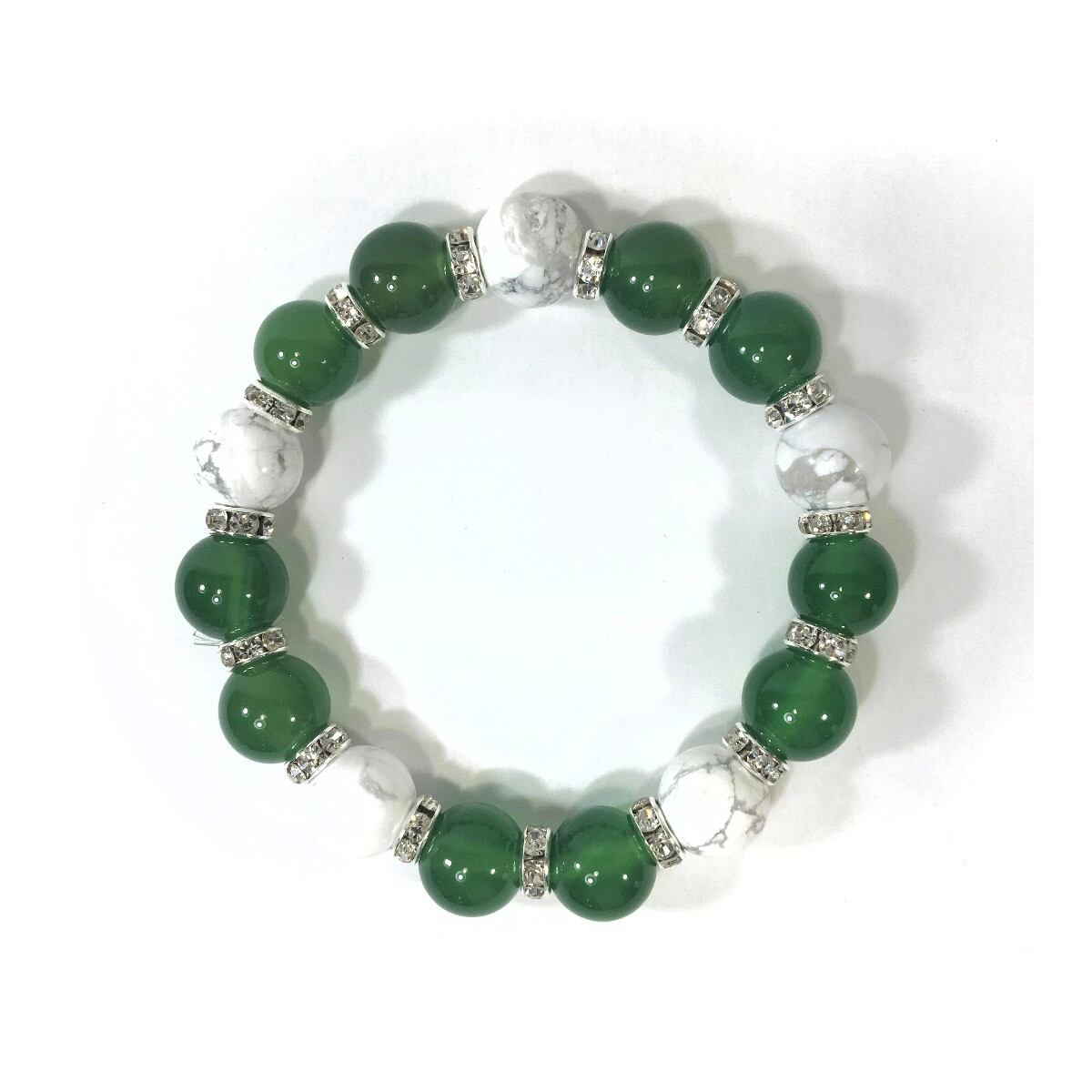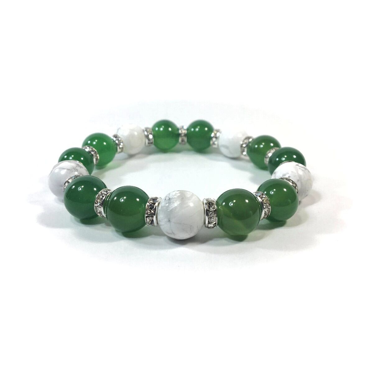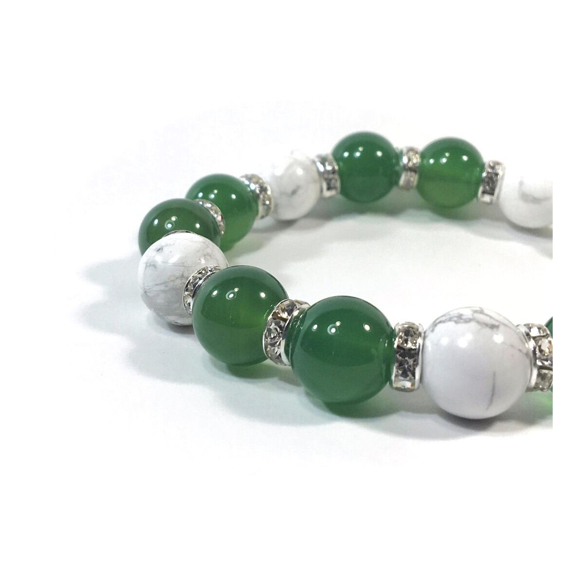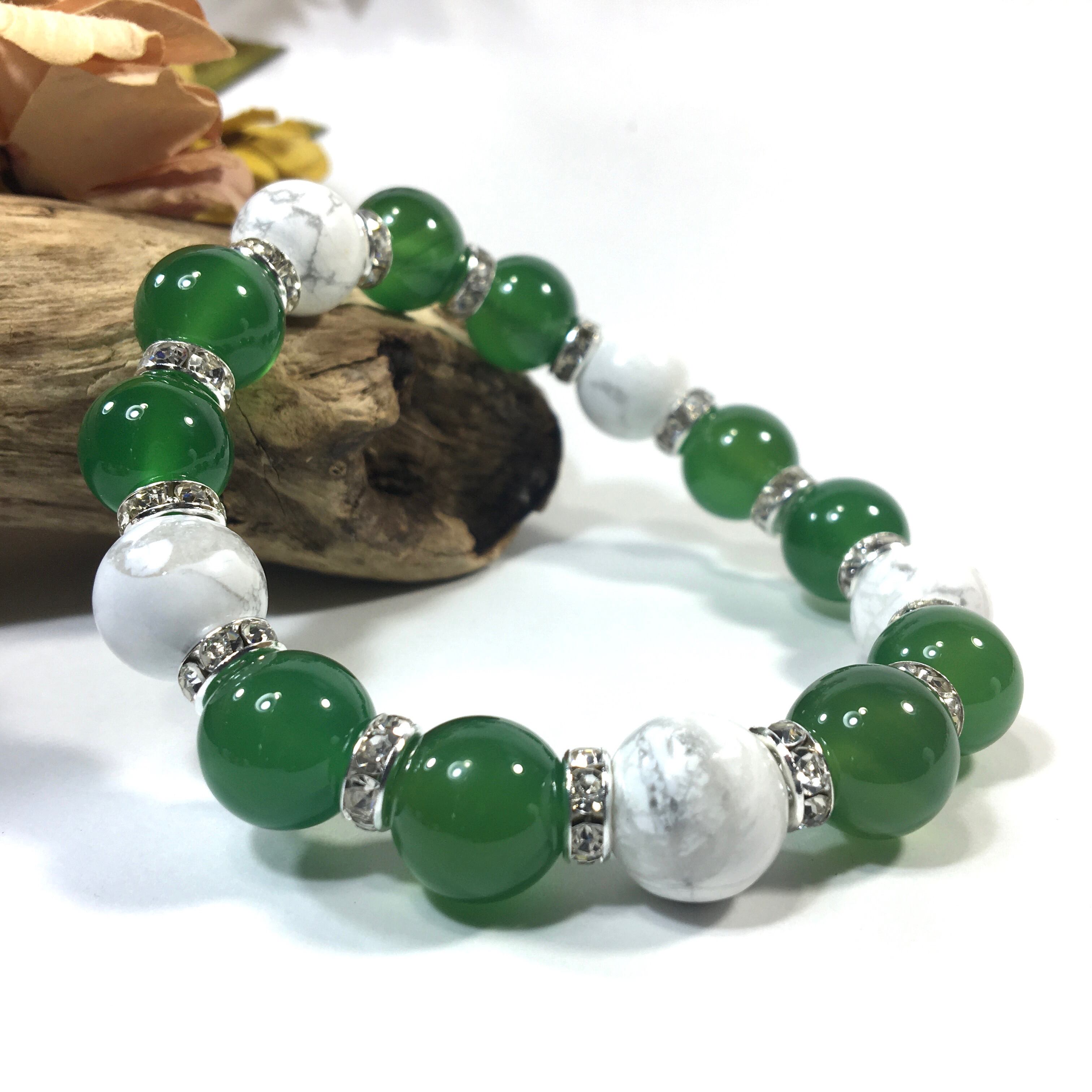 こちらは、緑瑪瑙とハウライトを組み合わせたパワーストーンブレスレットです。間にはロンデルを挟み高級感あるデザインに仕上げております。石大きさは12mm玉を使用して内周約18cmです。気になる方は是非この機会にどうぞ。