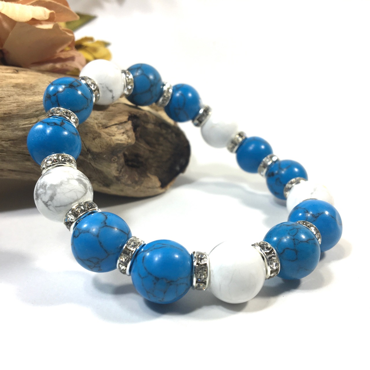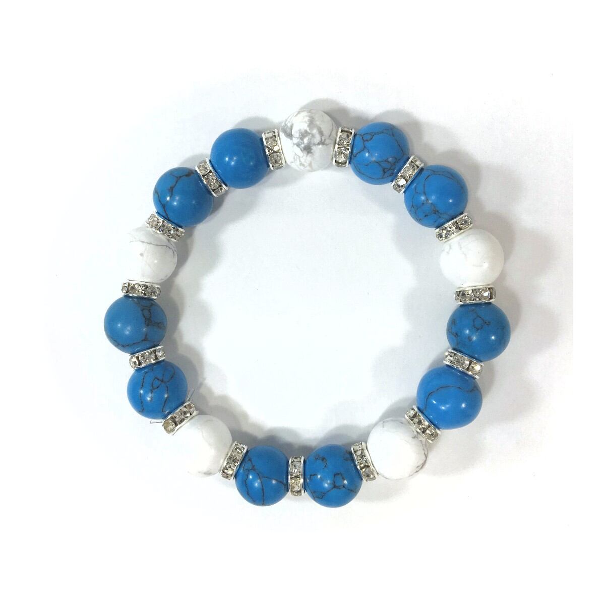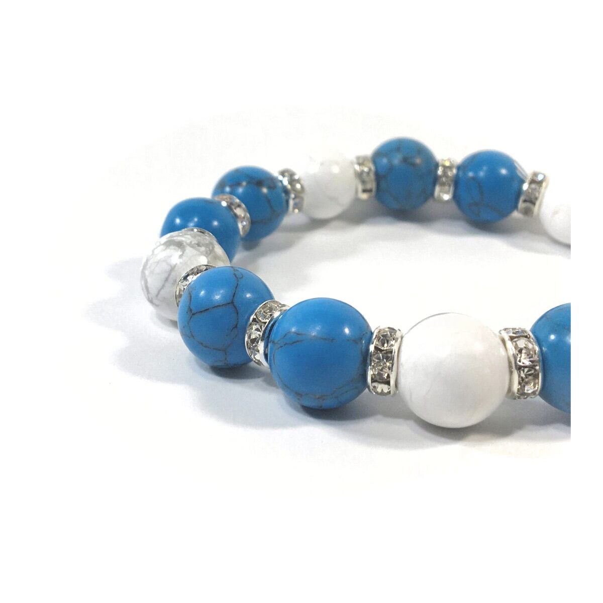 こちらは、ターコイズとハウライトを組み合わせたパワーストーンブレスレットです。間にはロンデルを挟み高級感あるデザインに仕上げております。石大きさは12mm玉を使用して内周約18cmです。気になる方は是非この機会にどうぞ。