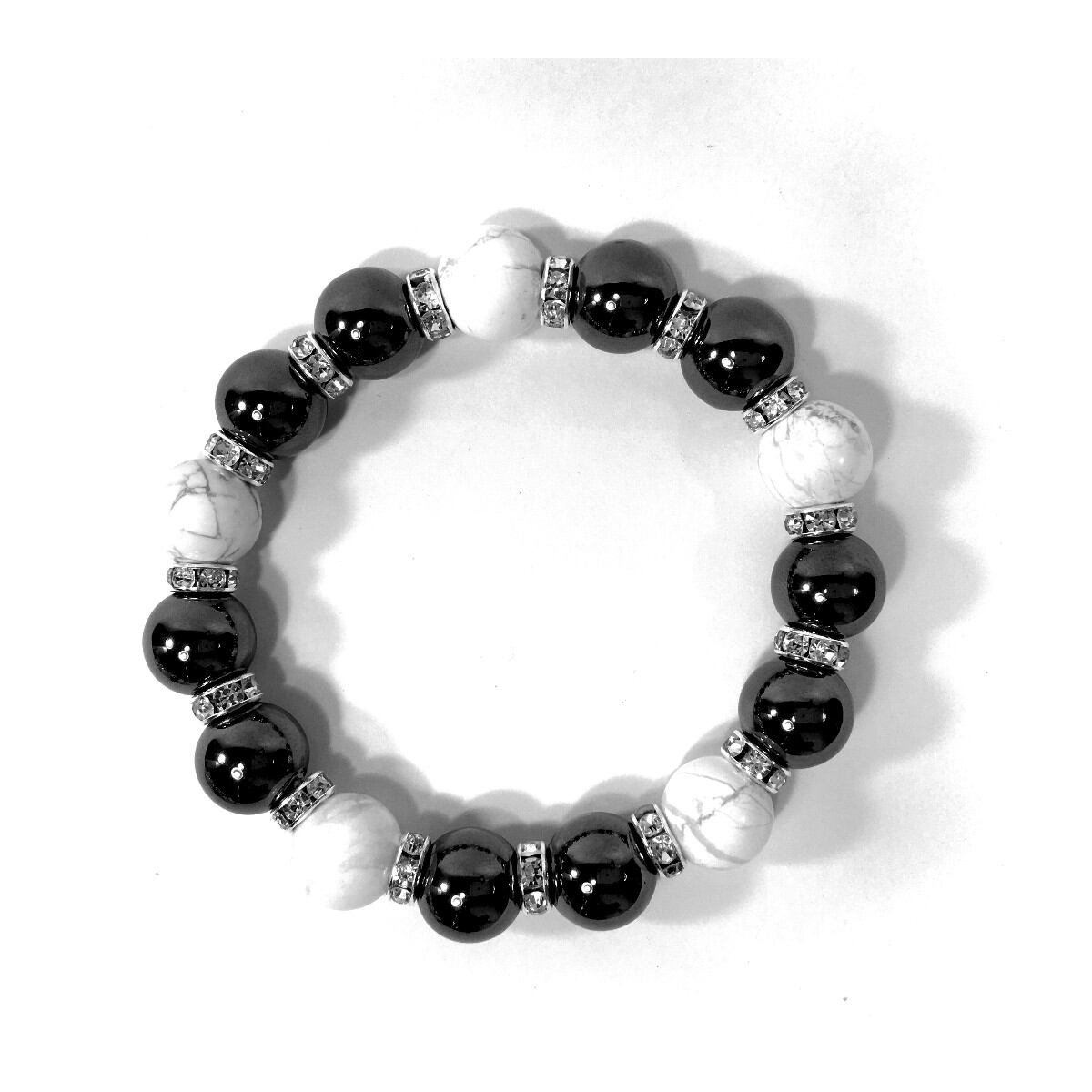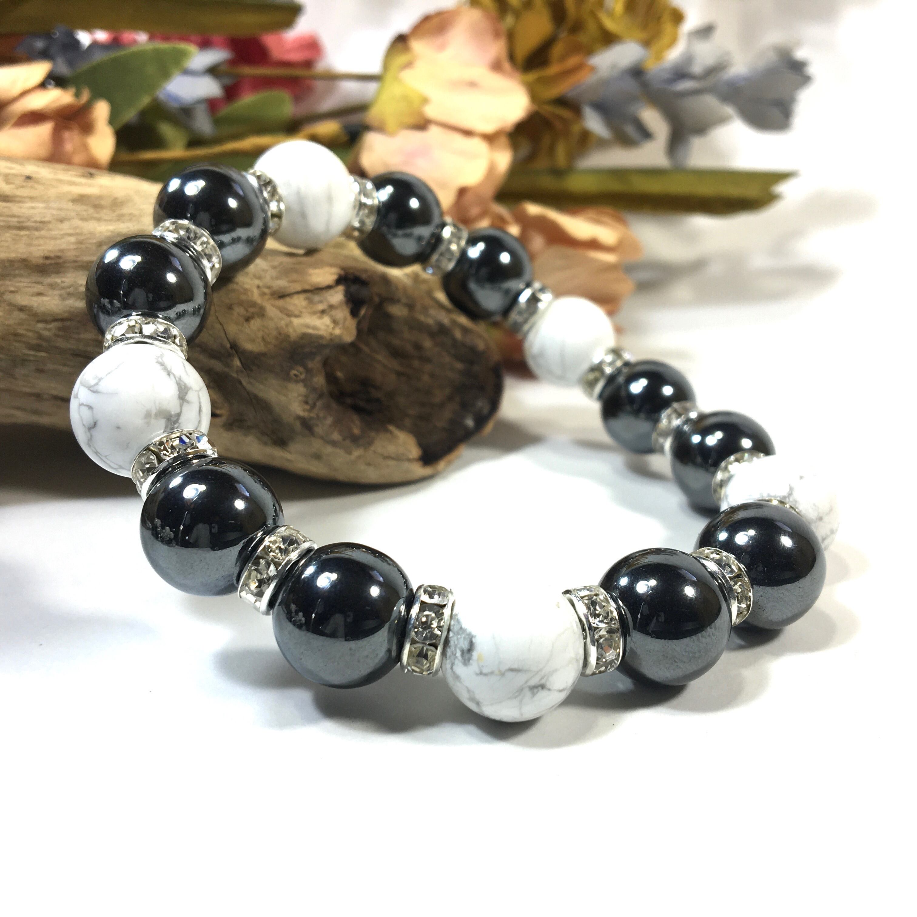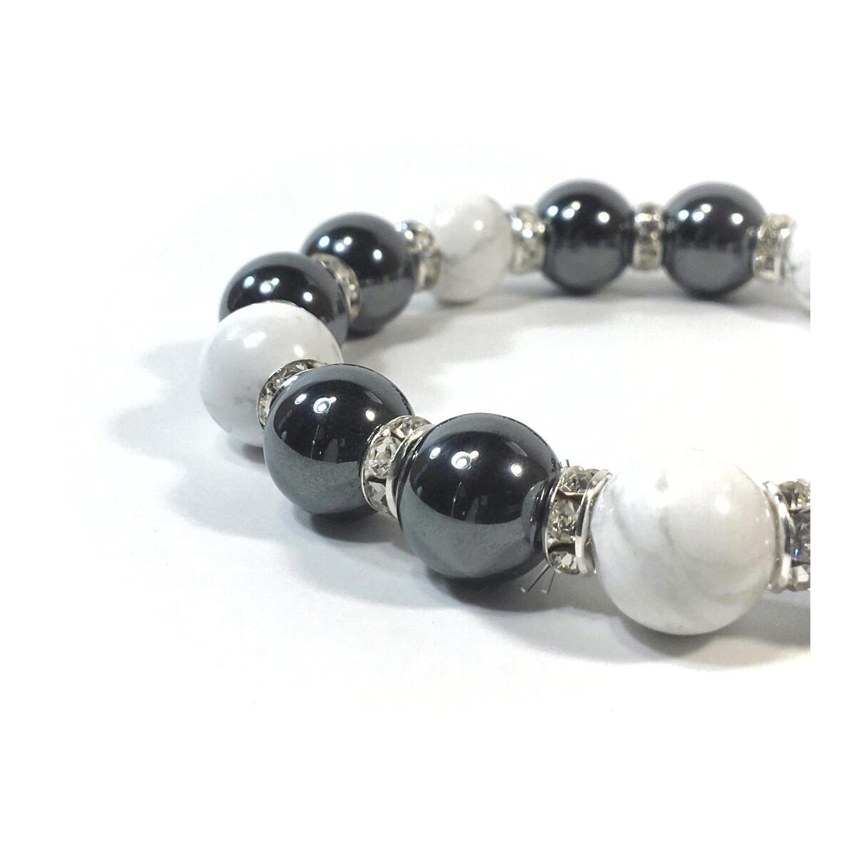こちらは、ヘマタイトとハウライトを組み合わせたパワーストーンブレスレットです。間にはロンデルを挟み高級感あるデザインに仕上げております。石大きさは12mm玉を使用して内周約18cmです。気になる方は是非この機会にどうぞ。