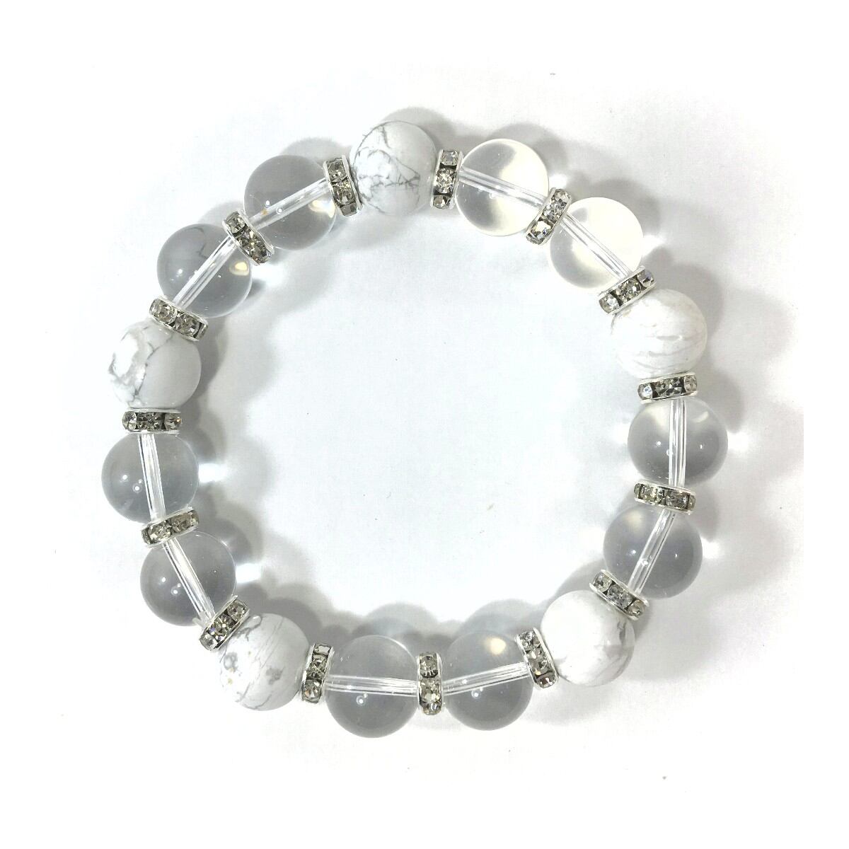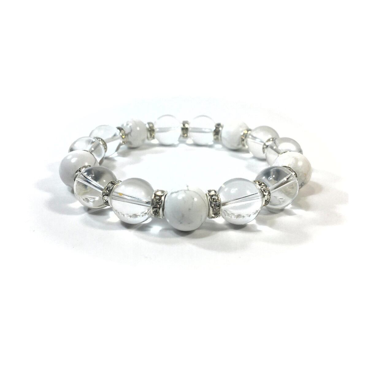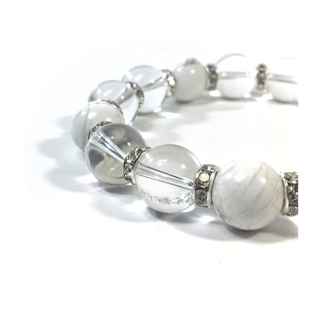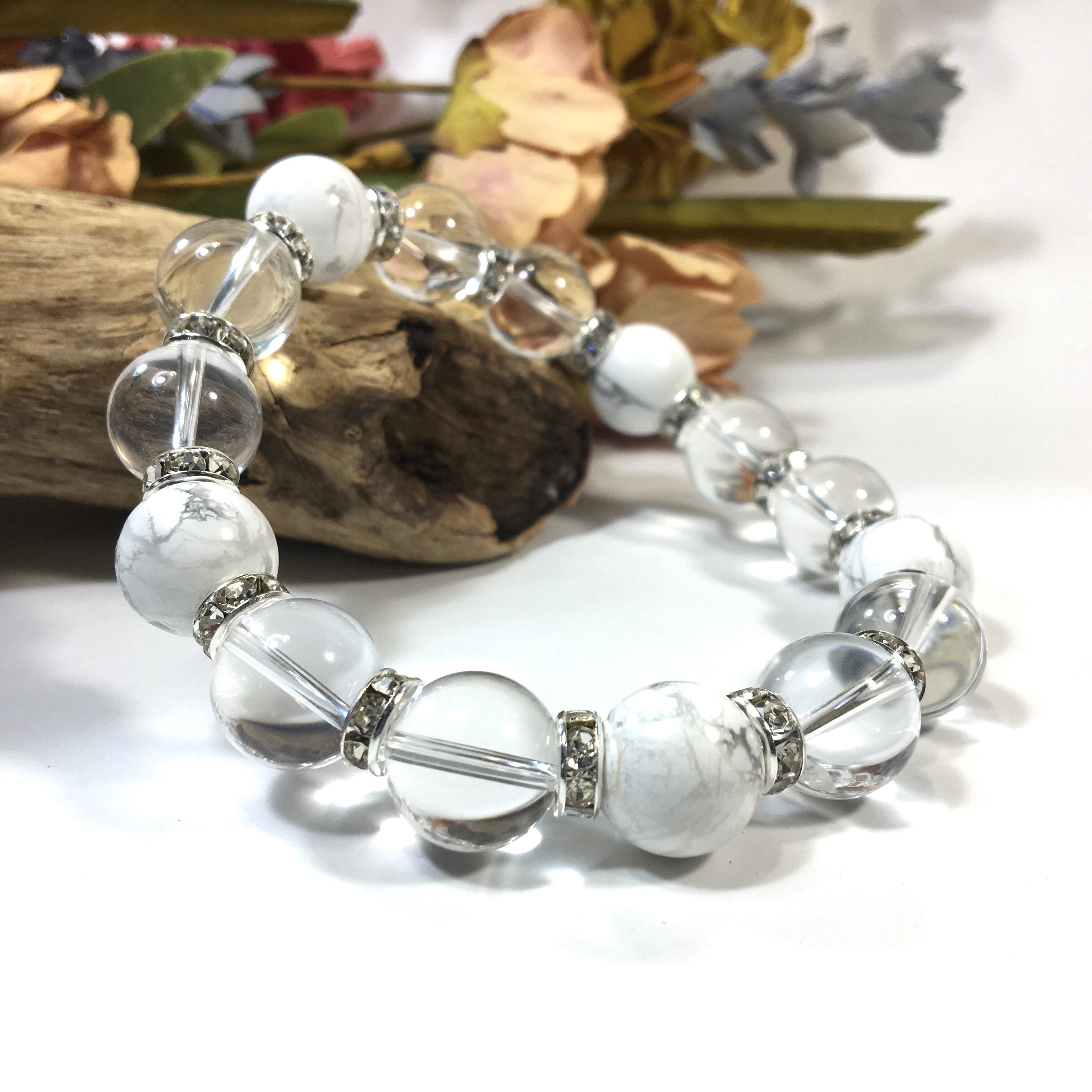 こちらは、水晶とハウライトを組み合わせたパワーストーンブレスレットです。間にはロンデルを挟み高級感あるデザインに仕上げております。石大きさは12mm玉を使用して内周約18cmです。気になる方は是非この機会にどうぞ。