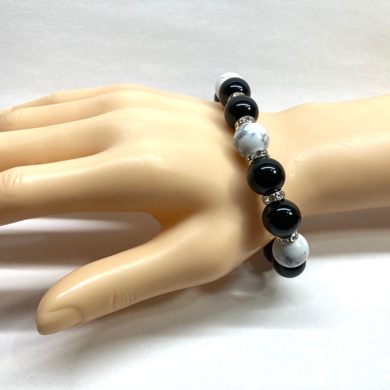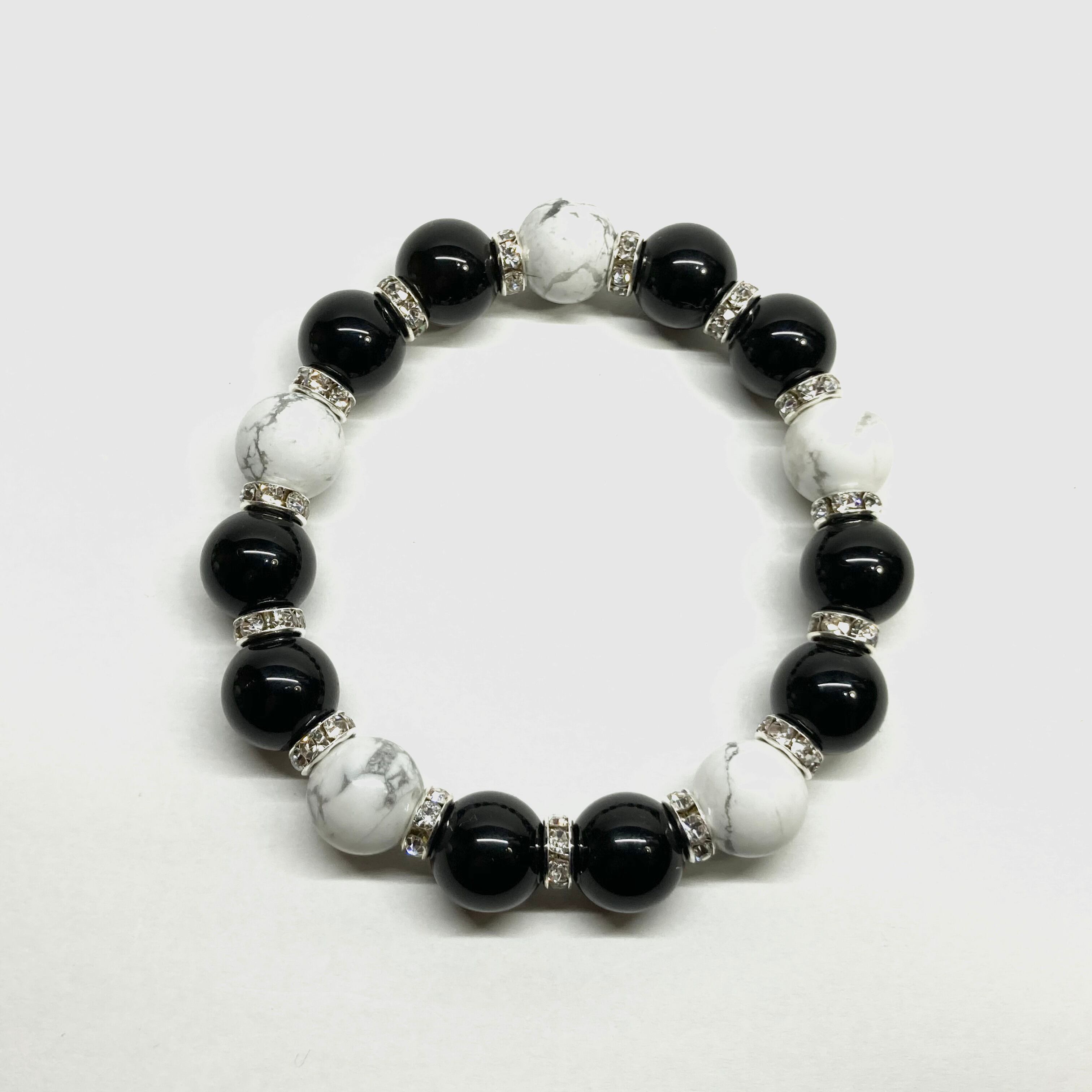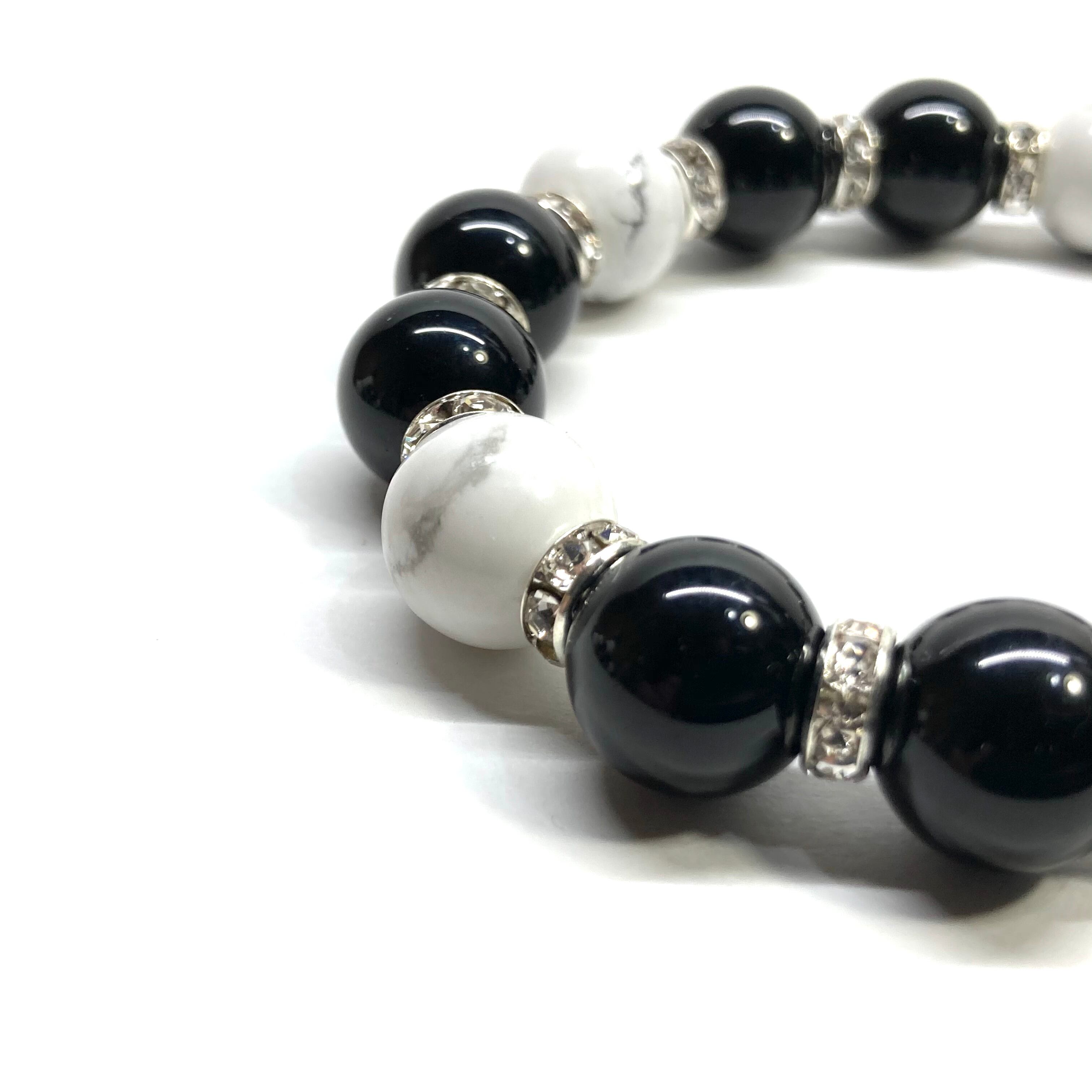 こちらは、12mm玉のモリオンとハウライトを組み合わせたパワーストーンブレスレットです。間にはロンデルを挟み高級感あるデザインに仕上げております。石大きさは12mm玉を使用して内周約18cmです。数に限りがございますので気になる方はお早めにどうぞ。