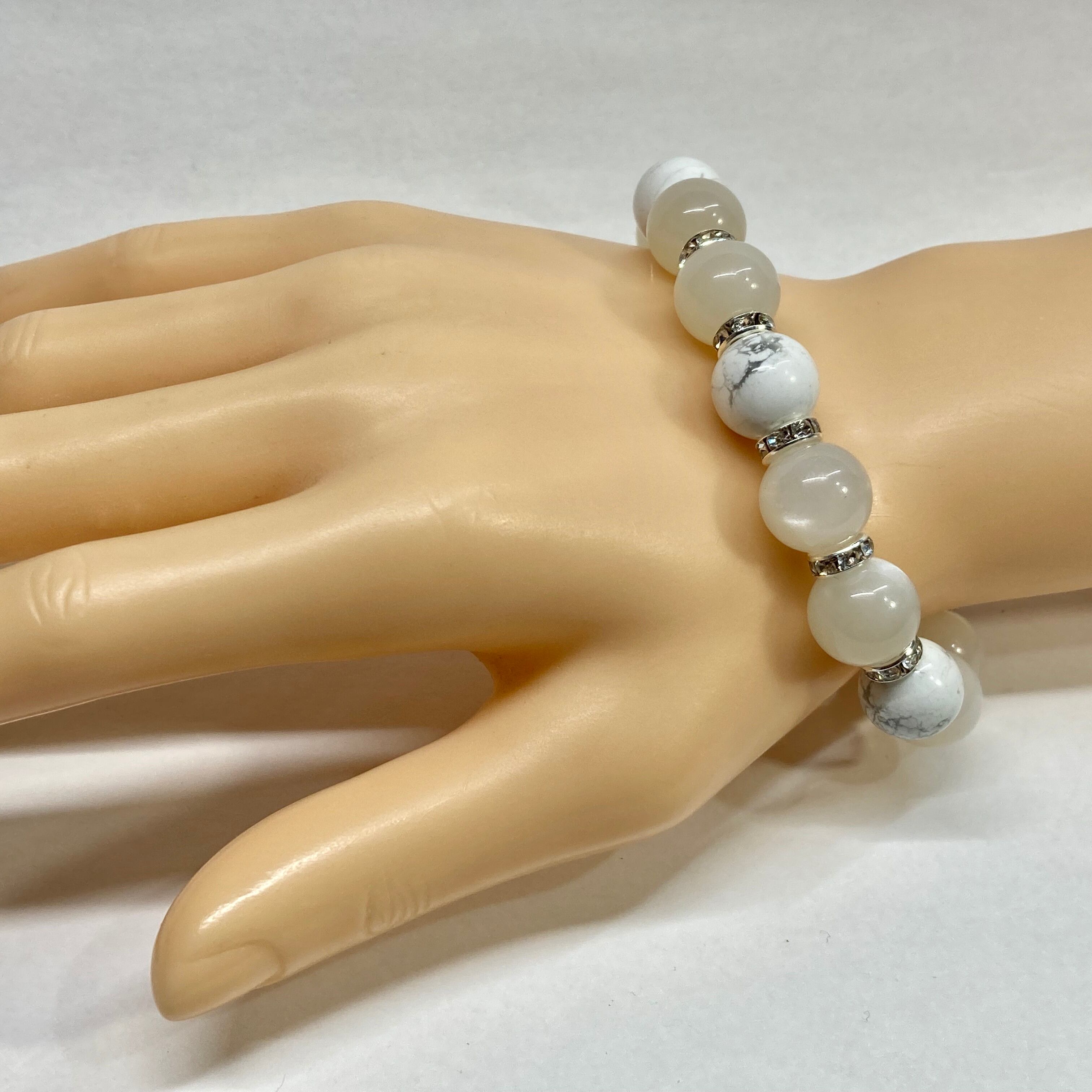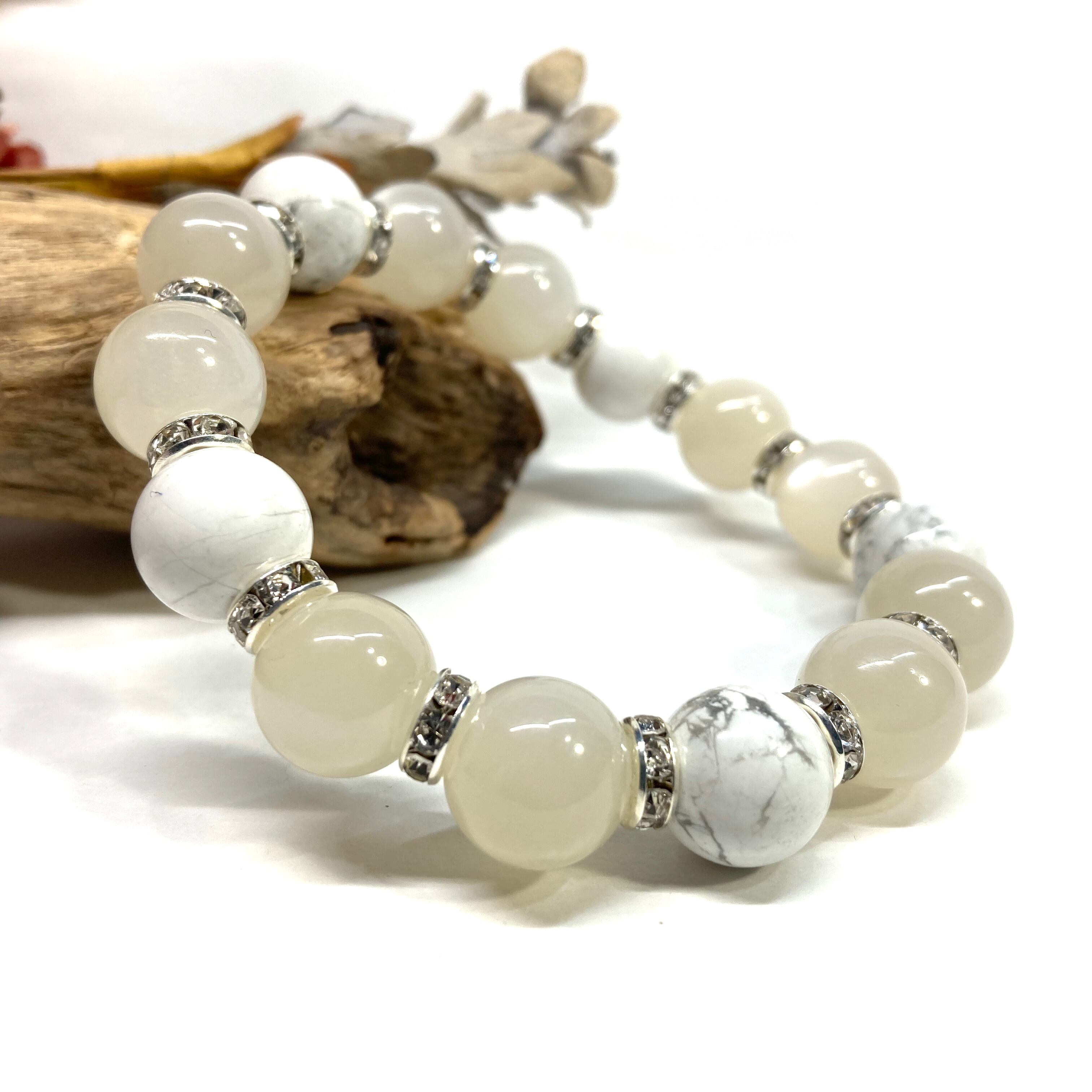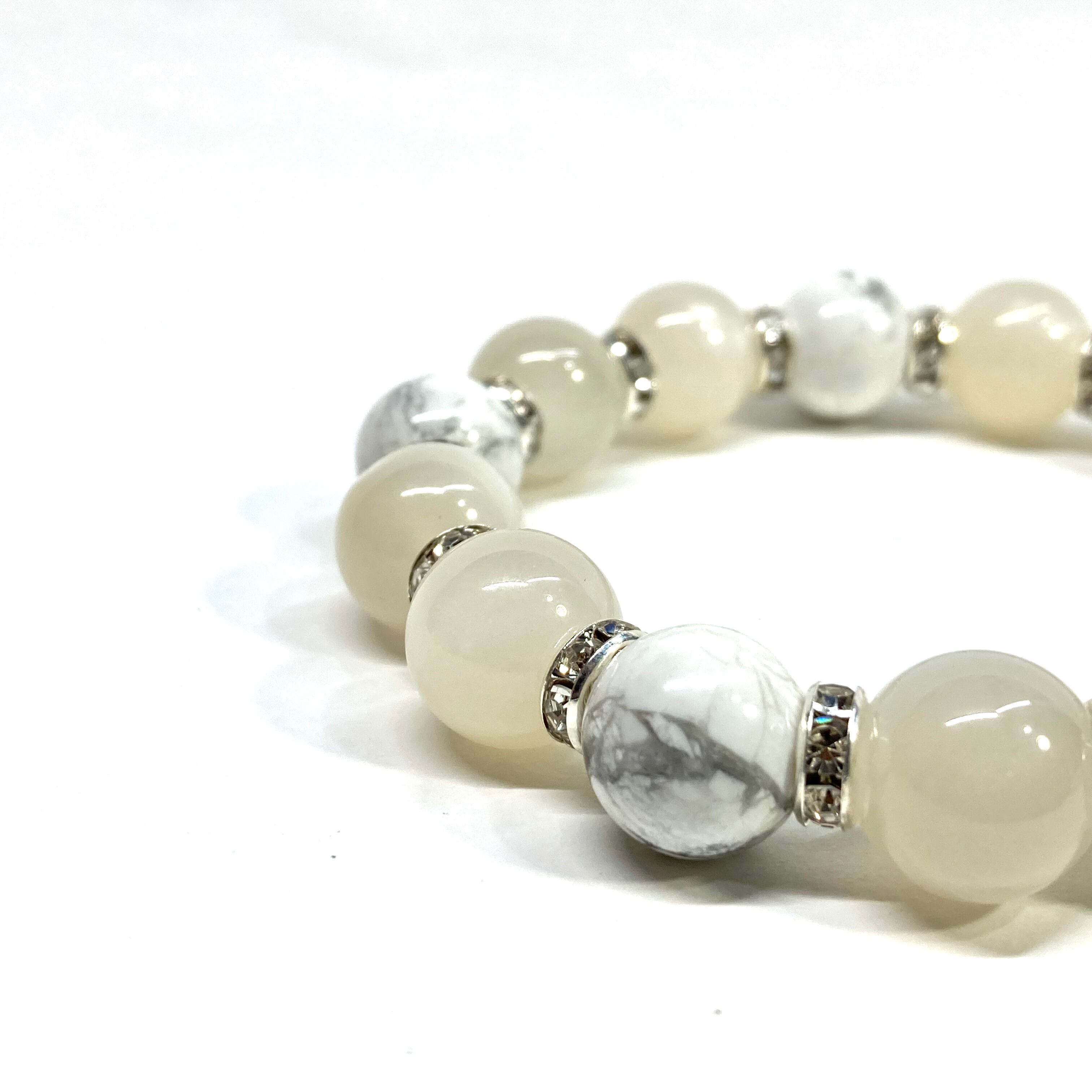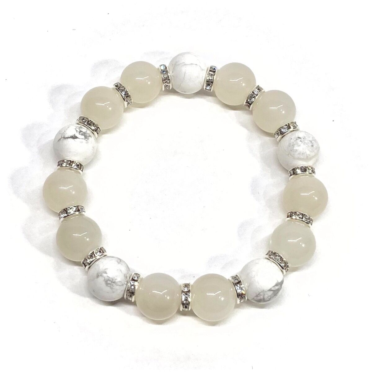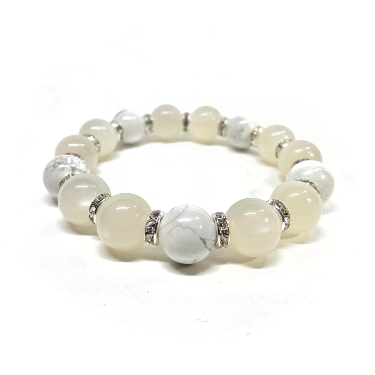 こちらは、12mm玉のムーンストーンとハウライトを組み合わせたパワーストーンブレスレットです。間にはロンデルを挟み高級感あるデザインに仕上げております。石大きさは12mm玉を使用して内周約18cmです。気になる方は是非この機会にどうぞ。