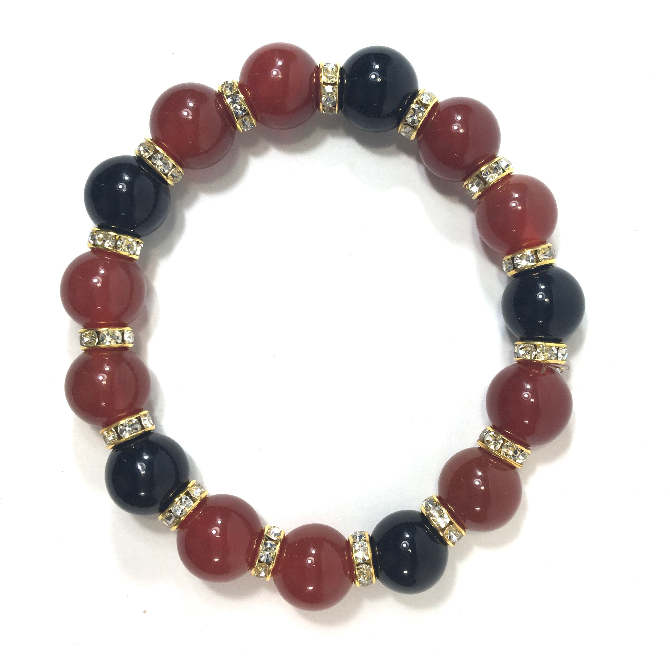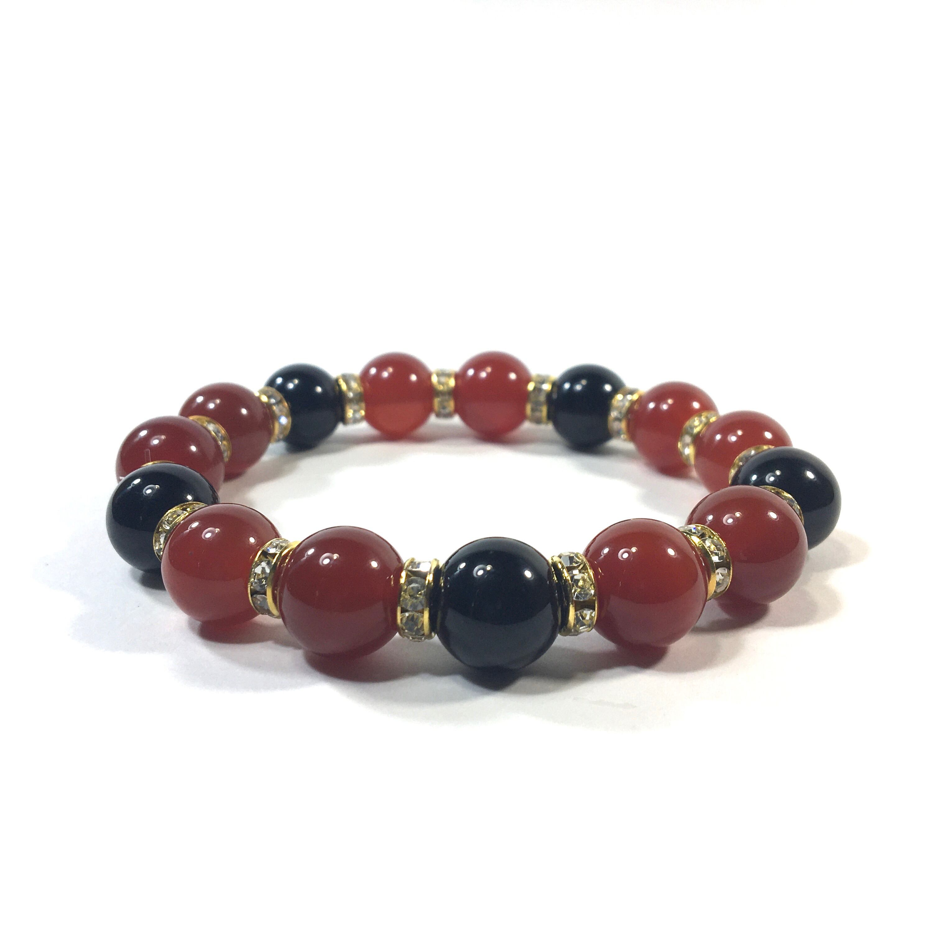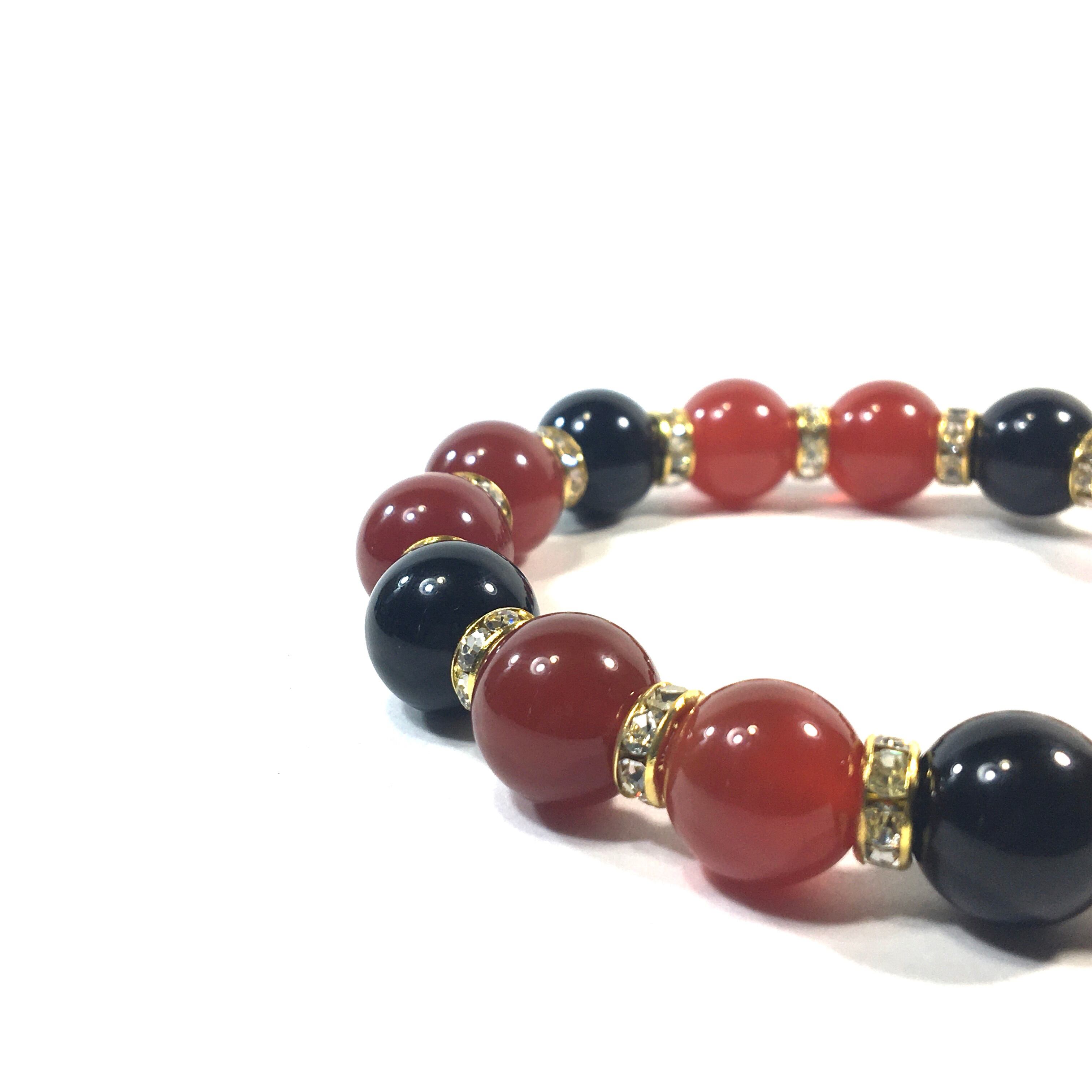 こちらは、赤瑪瑙とオニキスを組み合わせたパワーストーンブレスレットです。間にはロンデルを挟み高級感あるデザインに仕上げております。石大きさは12mm玉を使用して内周約18cmです。気になる方は是非この機会にどうぞ。