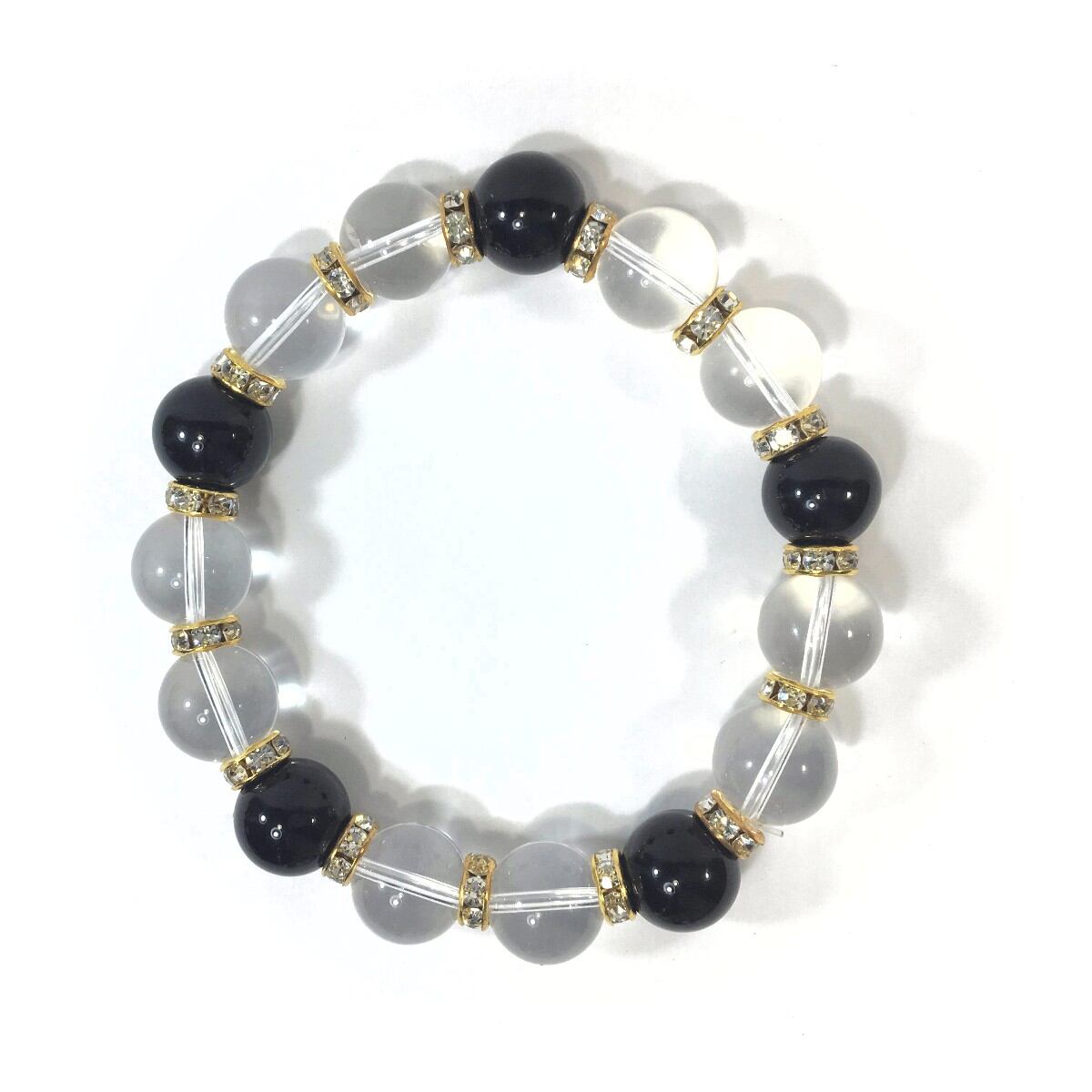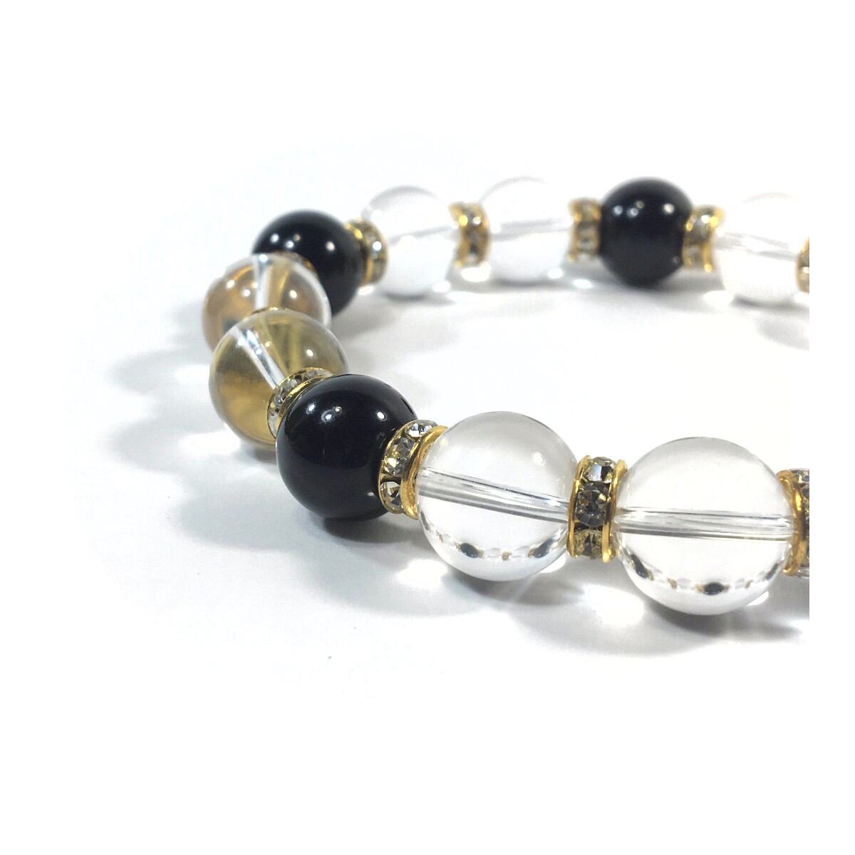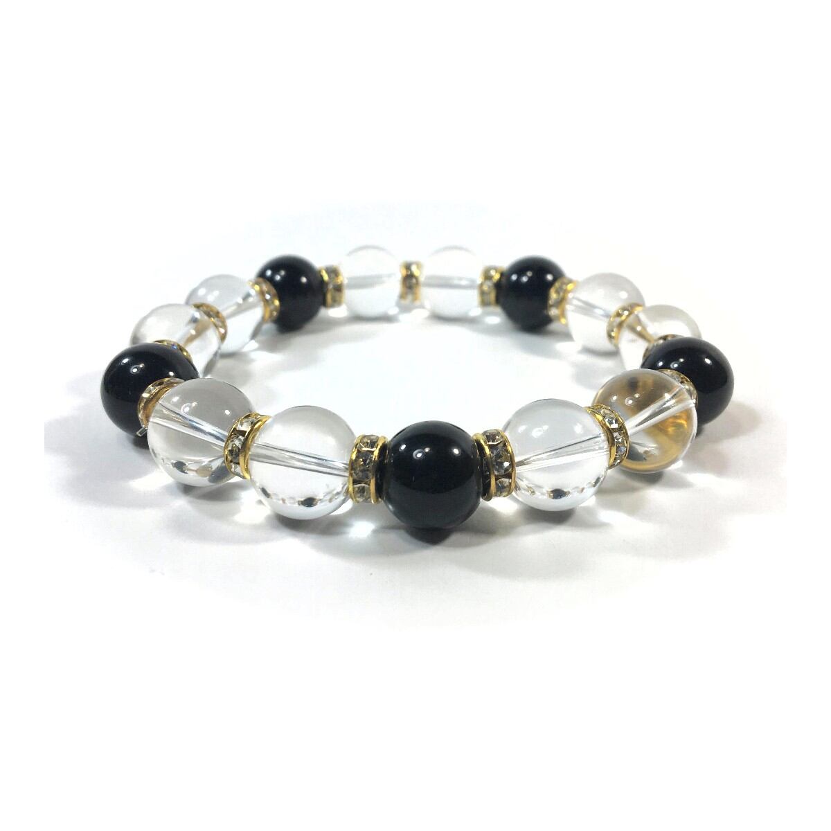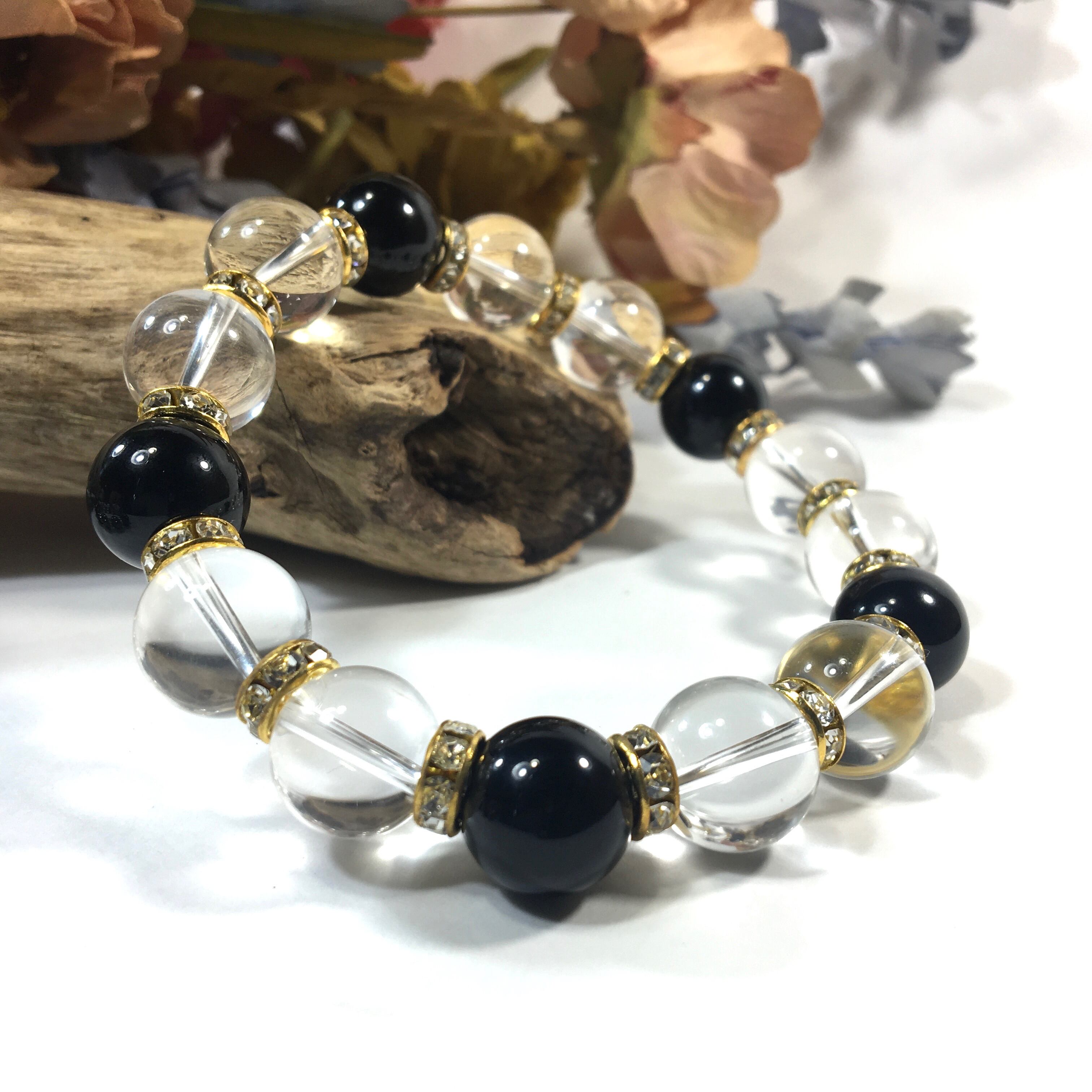 こちらは、水晶とオニキスを組み合わせたパワーストーンブレスレットです。間にはロンデルを挟み高級感あるデザインに仕上げております。石大きさは12mm玉を使用して内周約18cmです。気になる方は是非この機会にどうぞ。