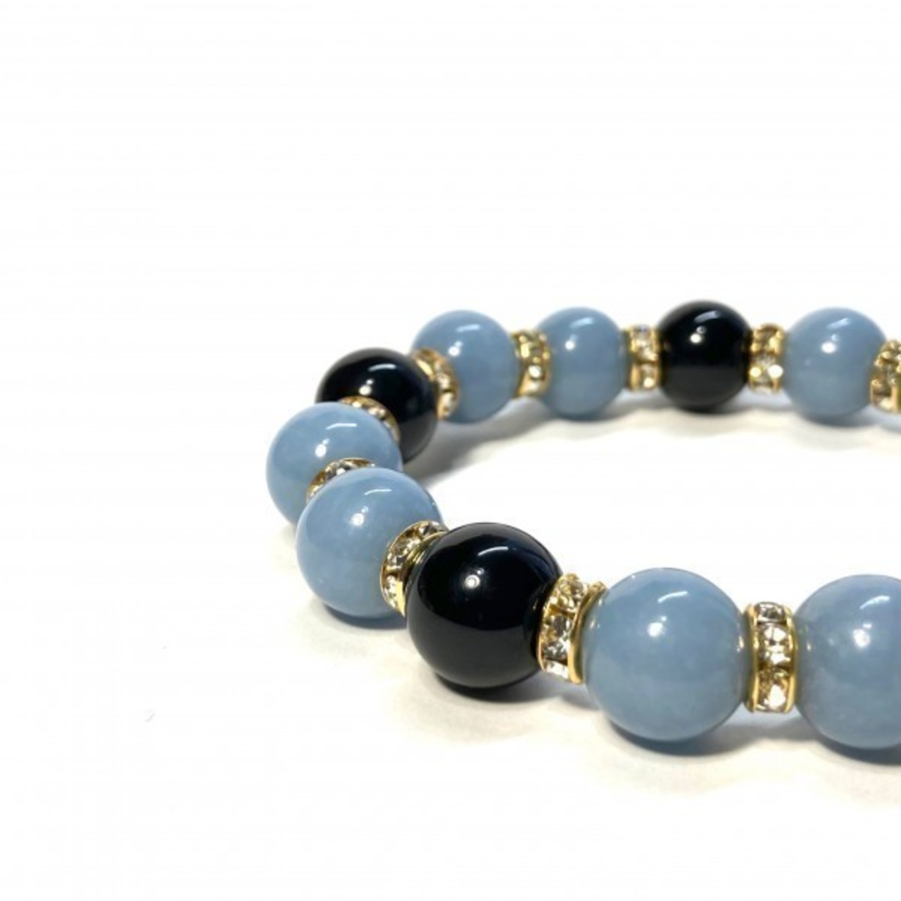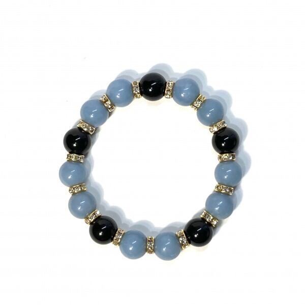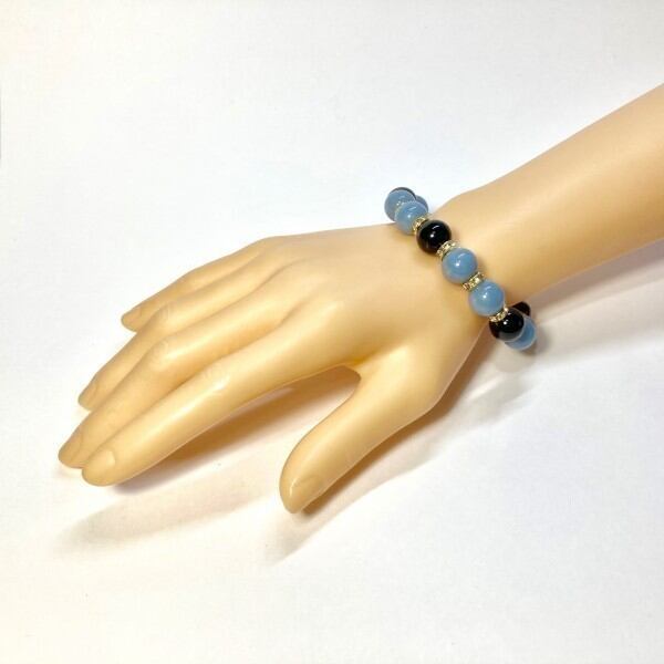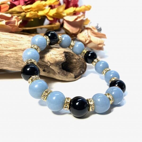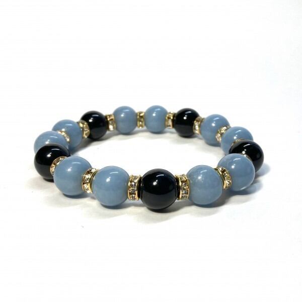こちらは、エンジェライトとオニキスを組み合わせたパワーストーンブレスレットです。間にはロンデルを挟み高級感あるデザインに仕上げております。石大きさは12mm玉を使用して内径約18cmです。気になる方は是非この機会にどうぞ。