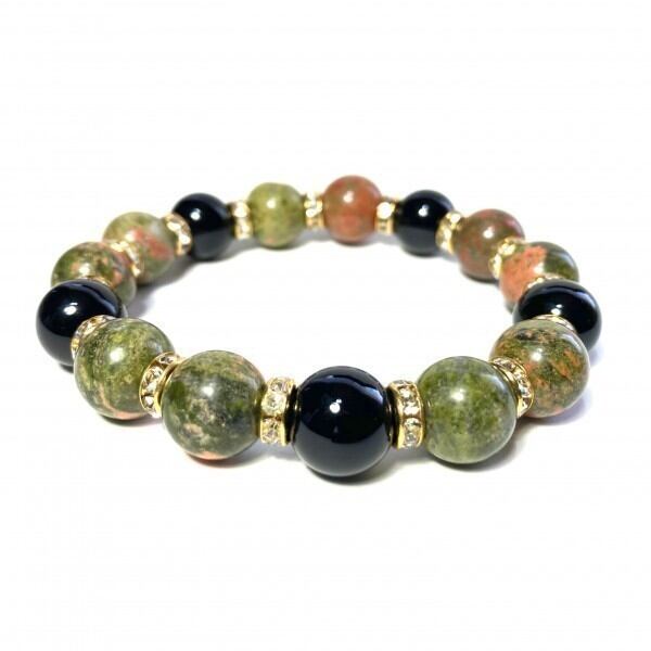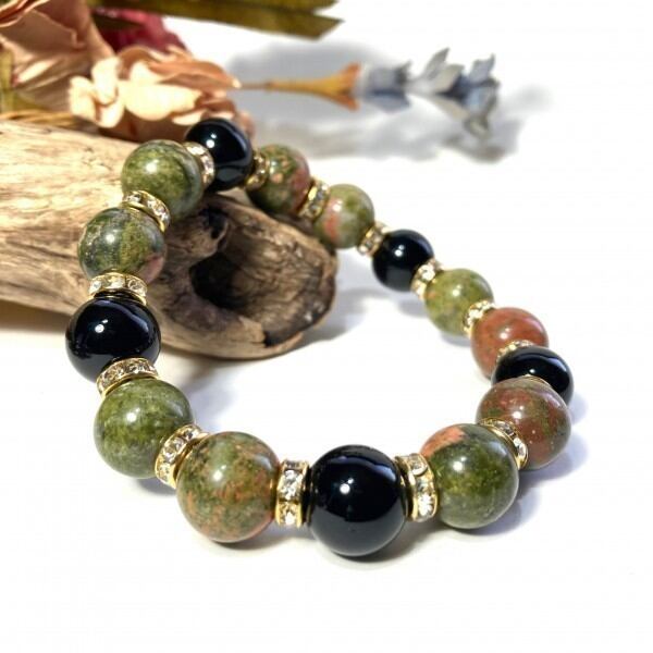 こちらは、ユナカイトとオニキスを組み合わせたパワーストーンブレスレットです。間にはロンデルを挟み高級感あるデザインに仕上げております。石大きさは12mm玉を使用して内径約18cmです。気になる方は是非この機会にどうぞ。