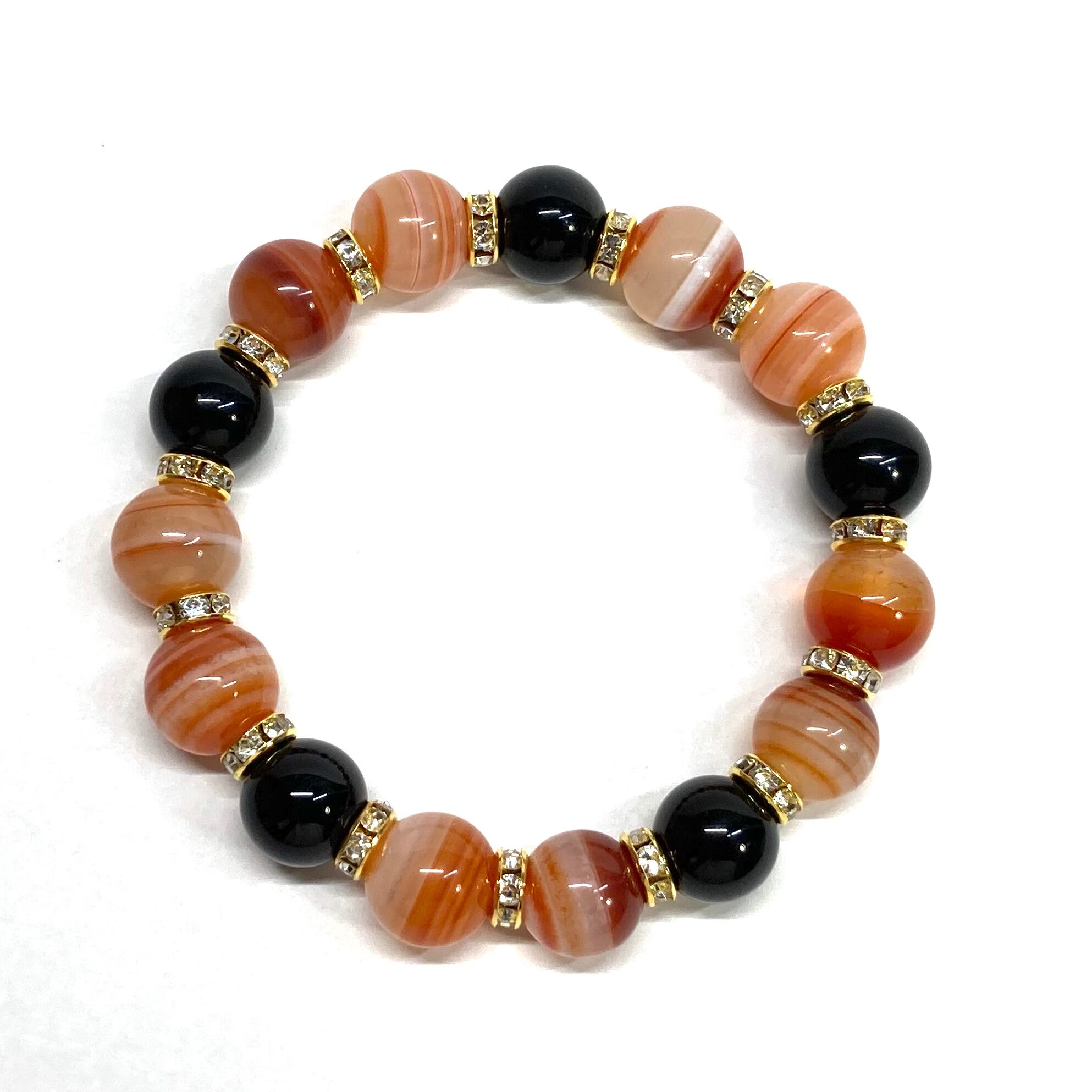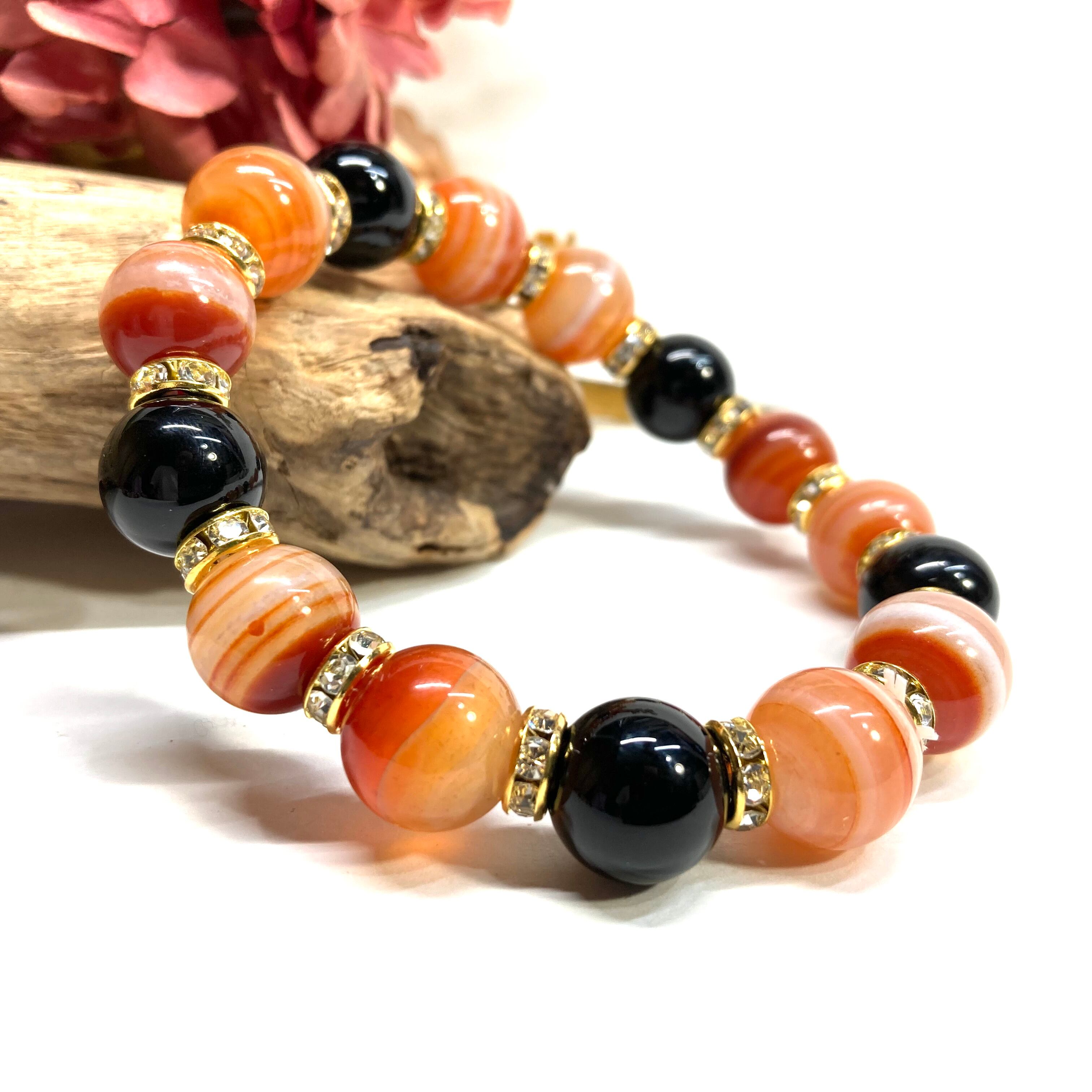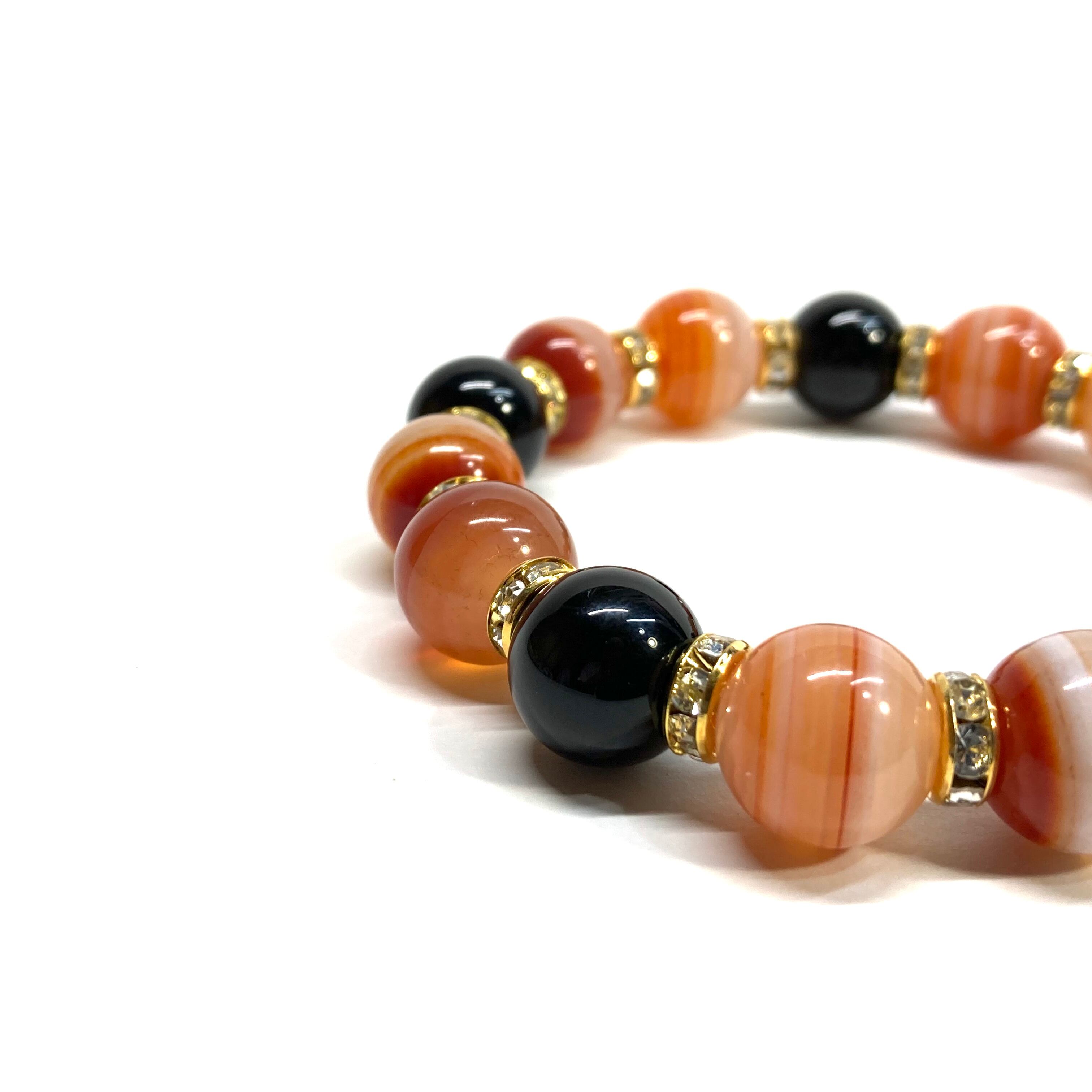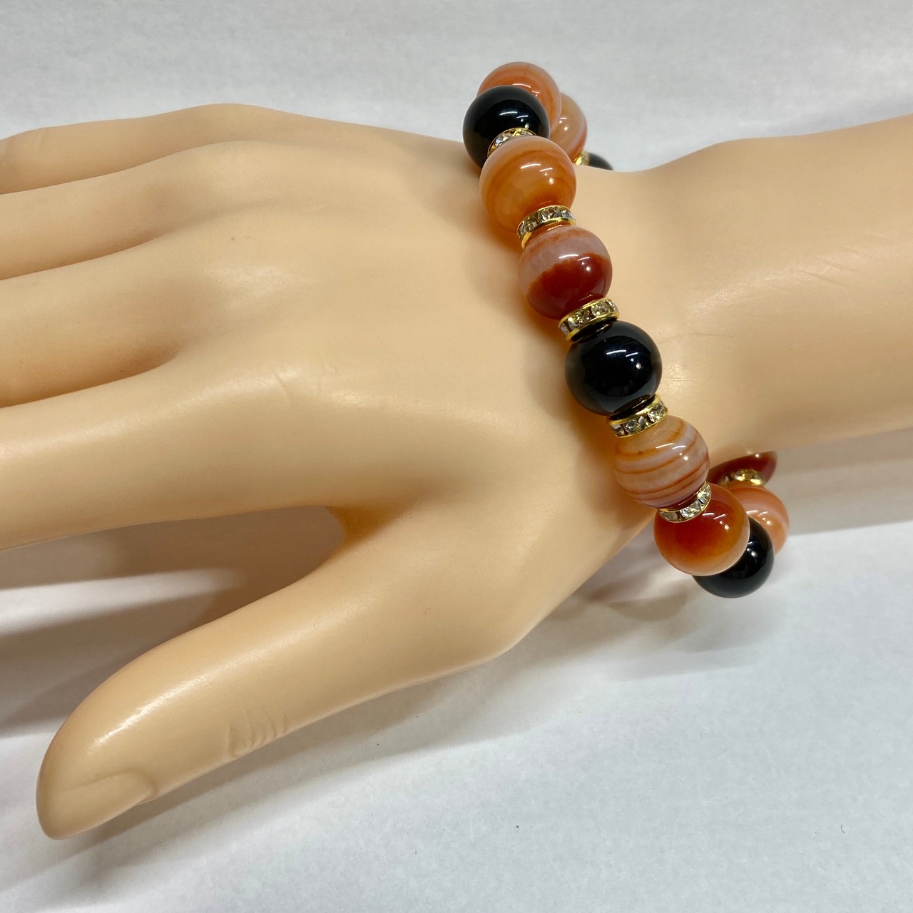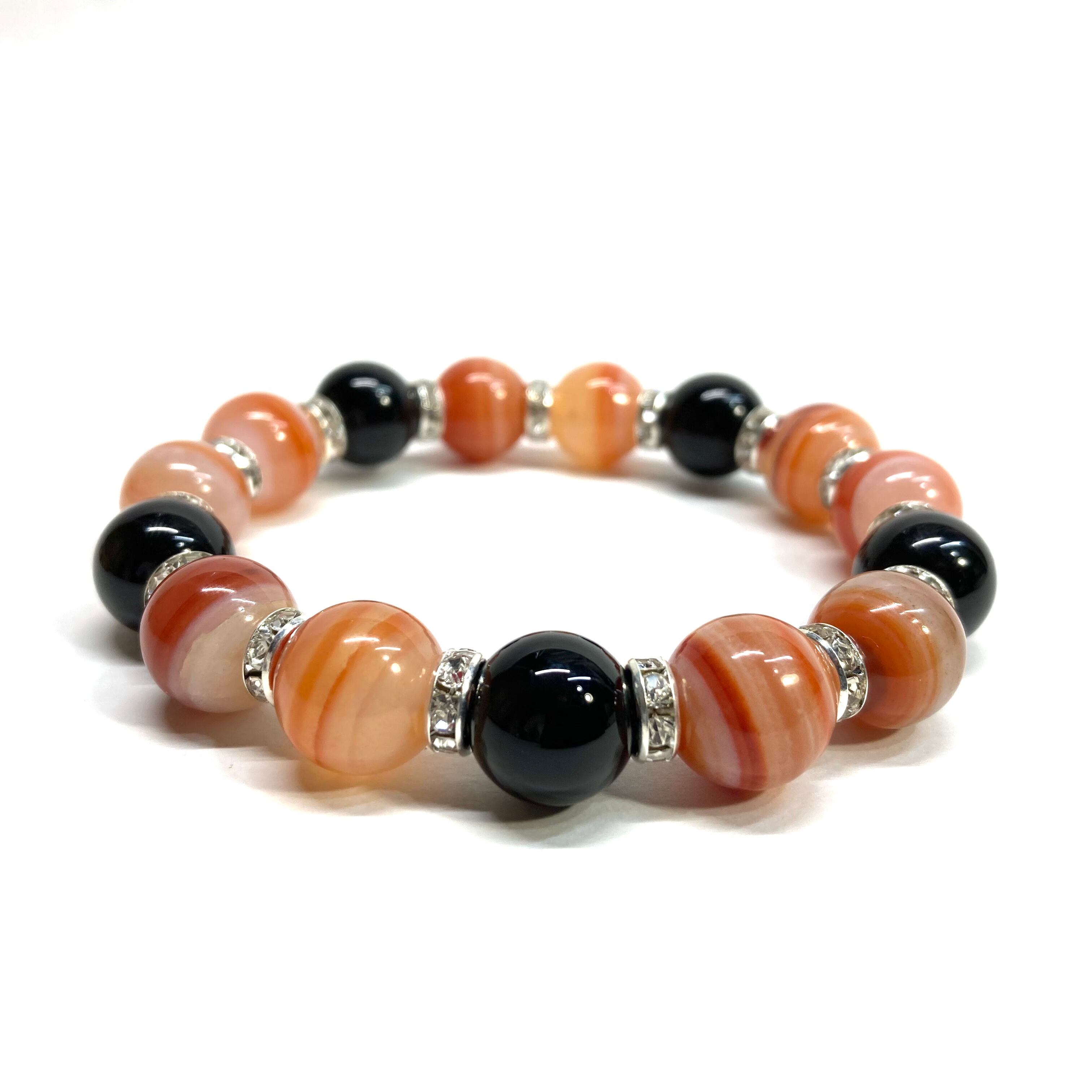 こちらは、12mm玉のカーネリアン・サードニクス(サードオニキス)とオニキスを組み合わせたパワーストーンブレスレットです。間にはロンデルを挟み高級感あるデザインに仕上げております。石大きさは12mm玉を使用して内周約18cmです。気になる方は是非この機会にどうぞ。