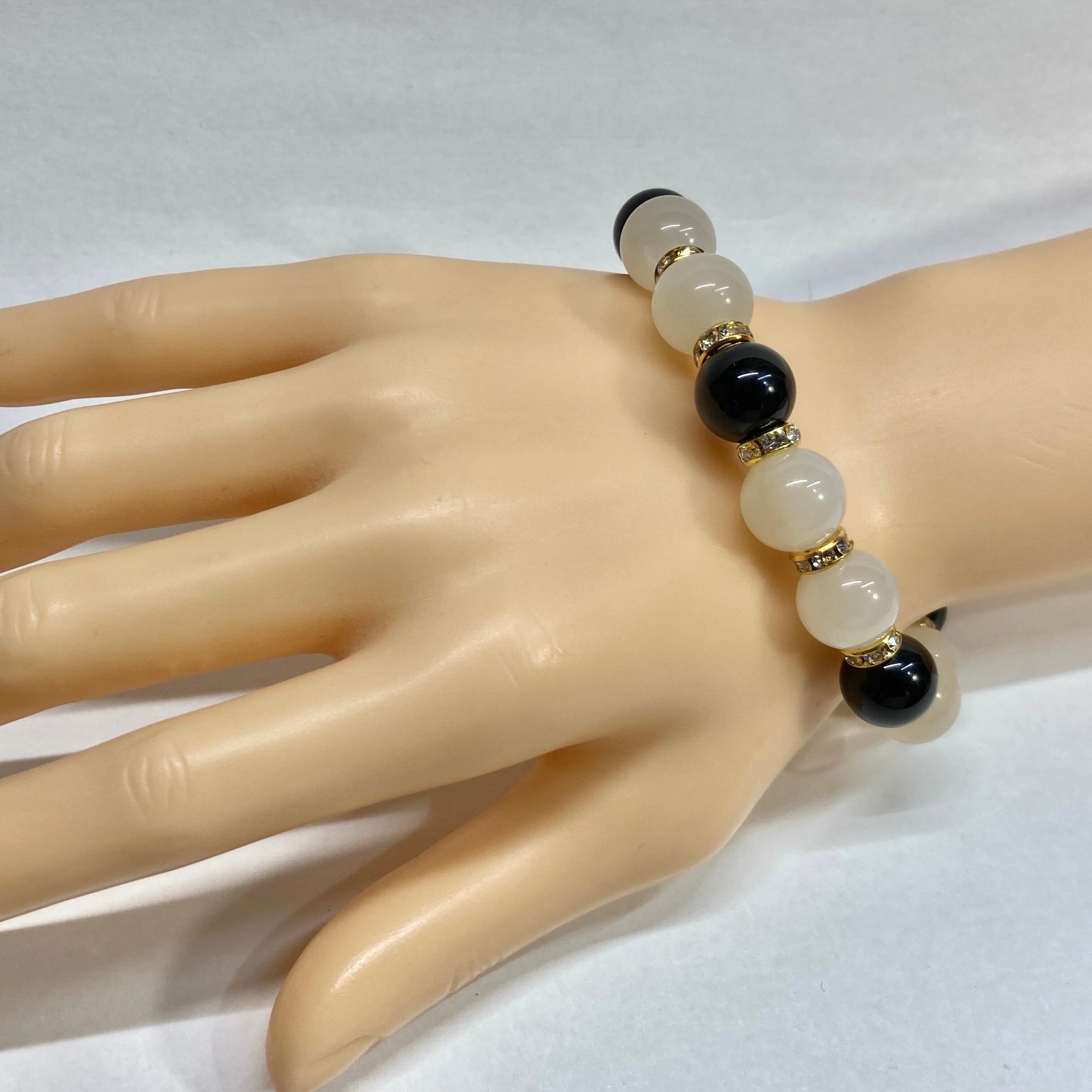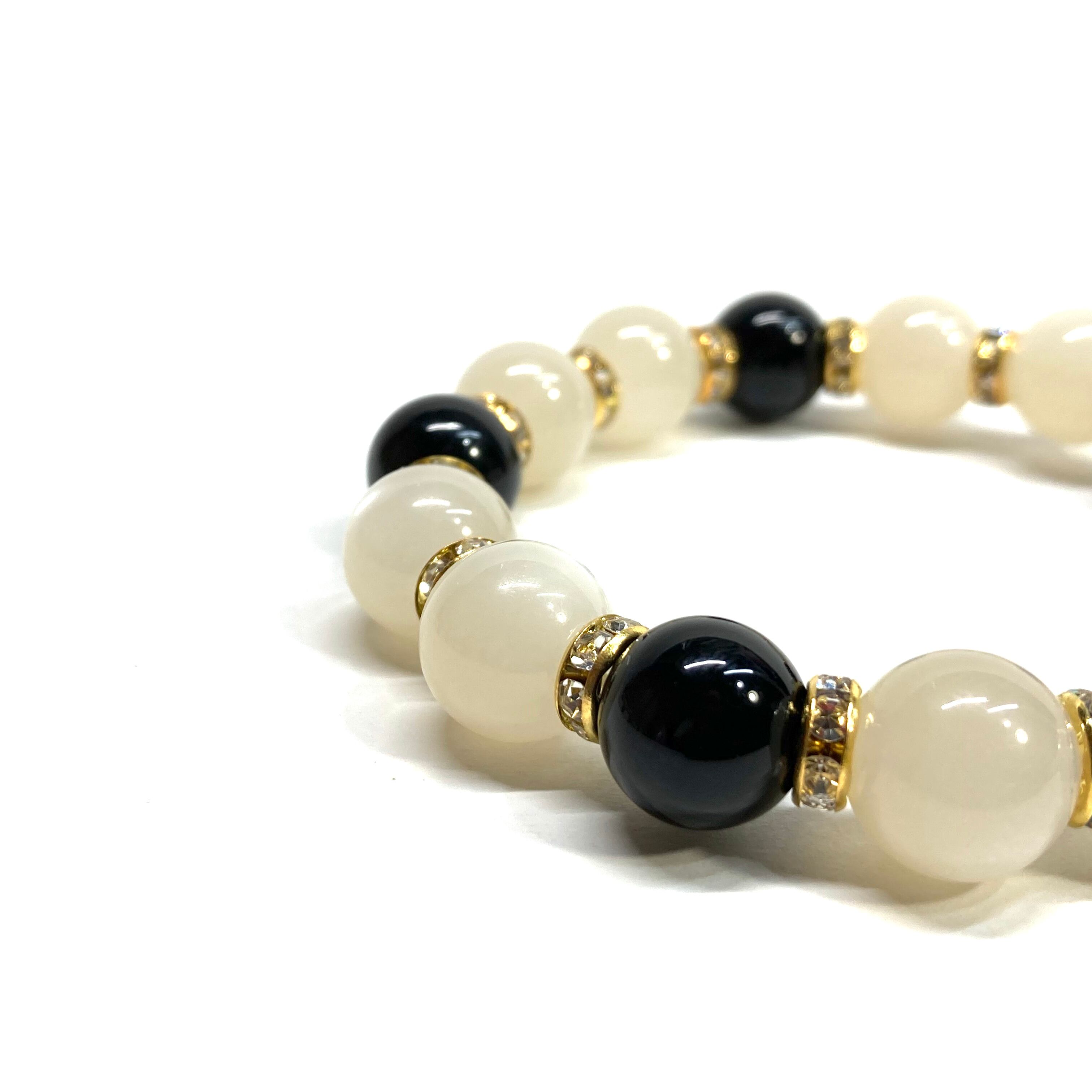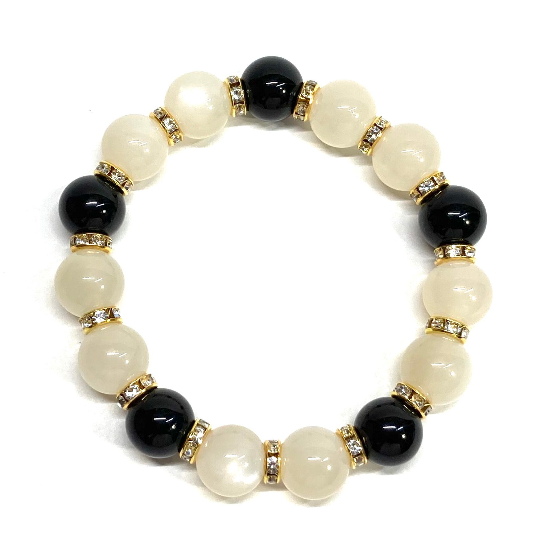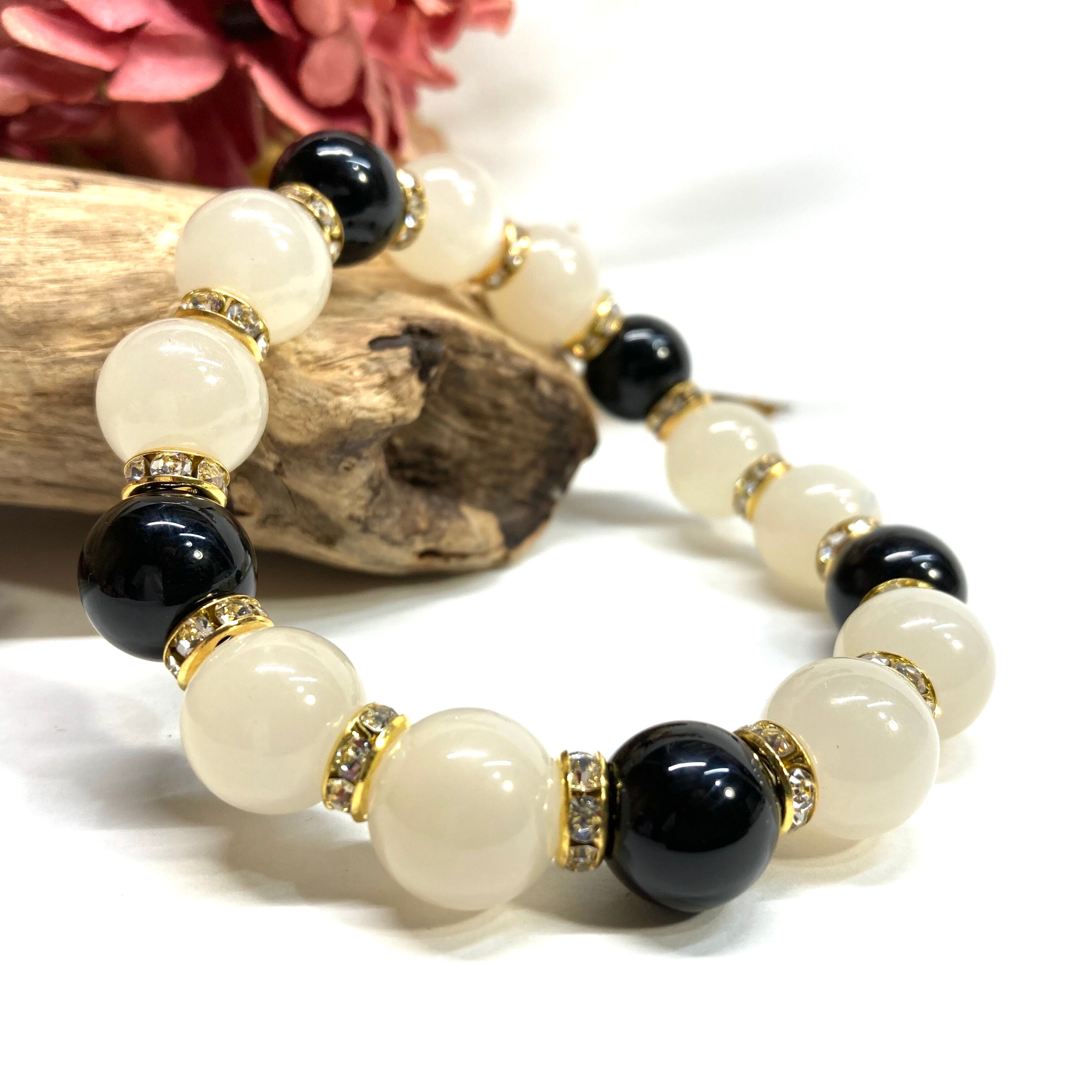 こちらは、12mm玉のムーンストーンとオニキスを組み合わせたパワーストーンブレスレットです。間にはロンデルを挟み高級感あるデザインに仕上げております。石大きさは12mm玉を使用して内周約18cmです。気になる方は是非この機会にどうぞ。