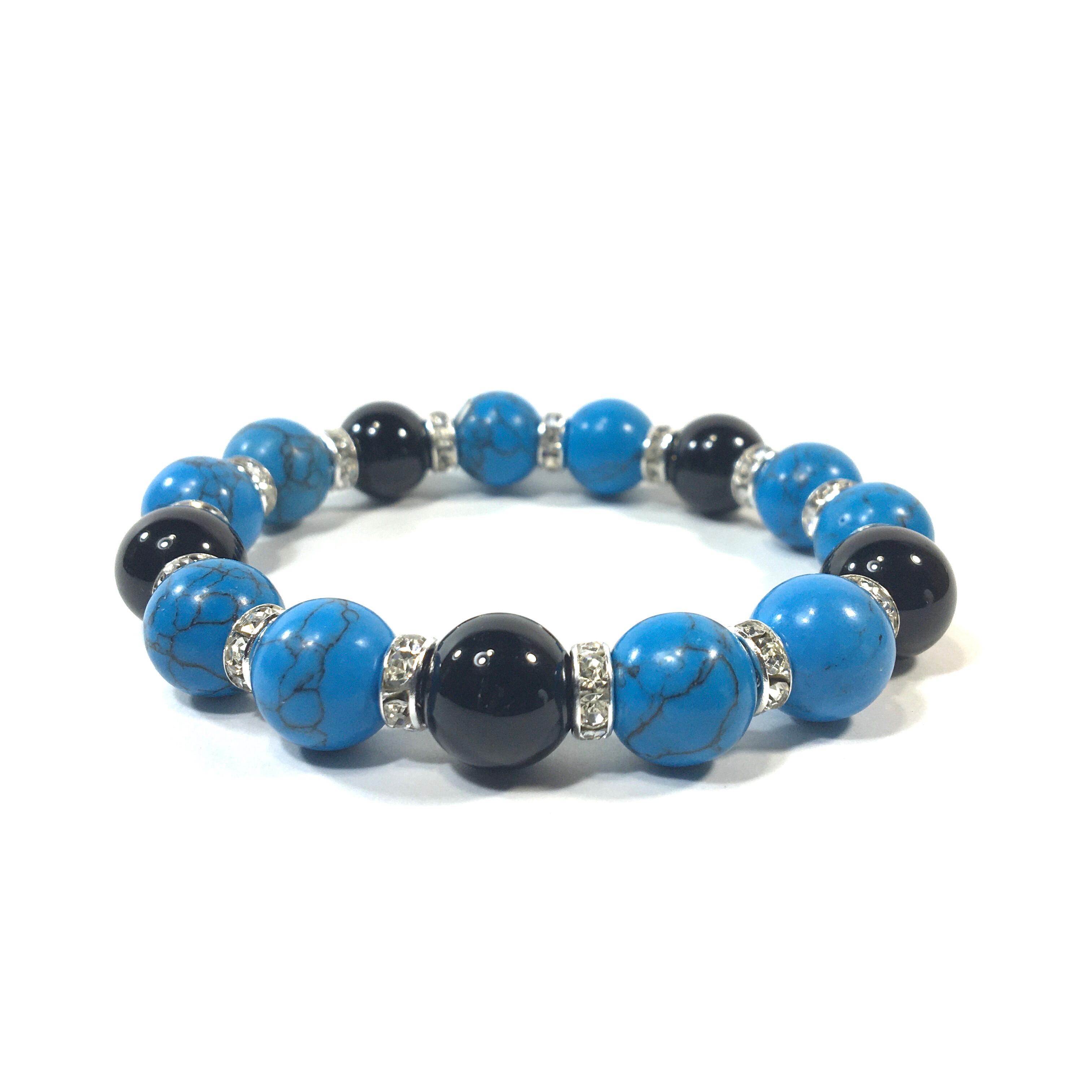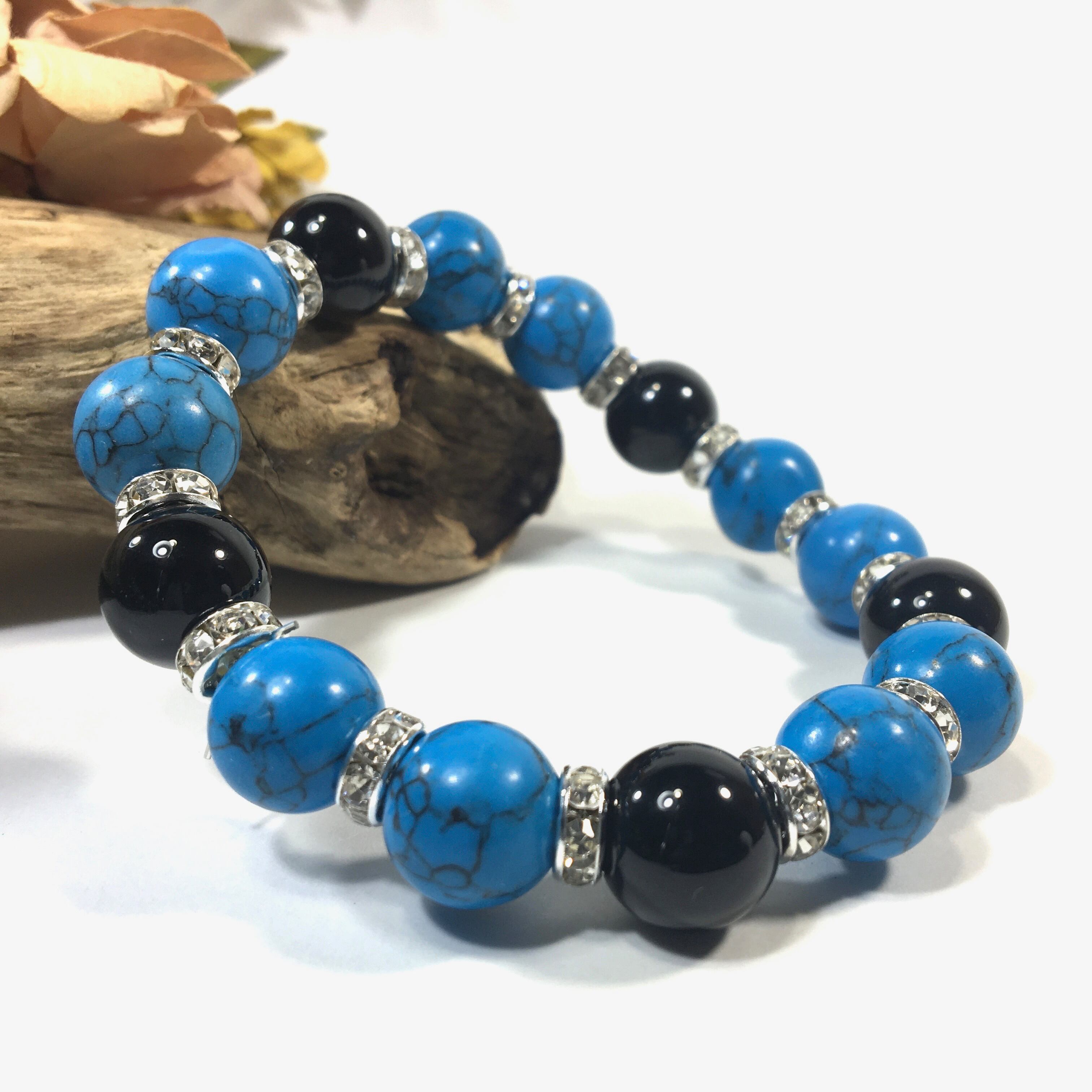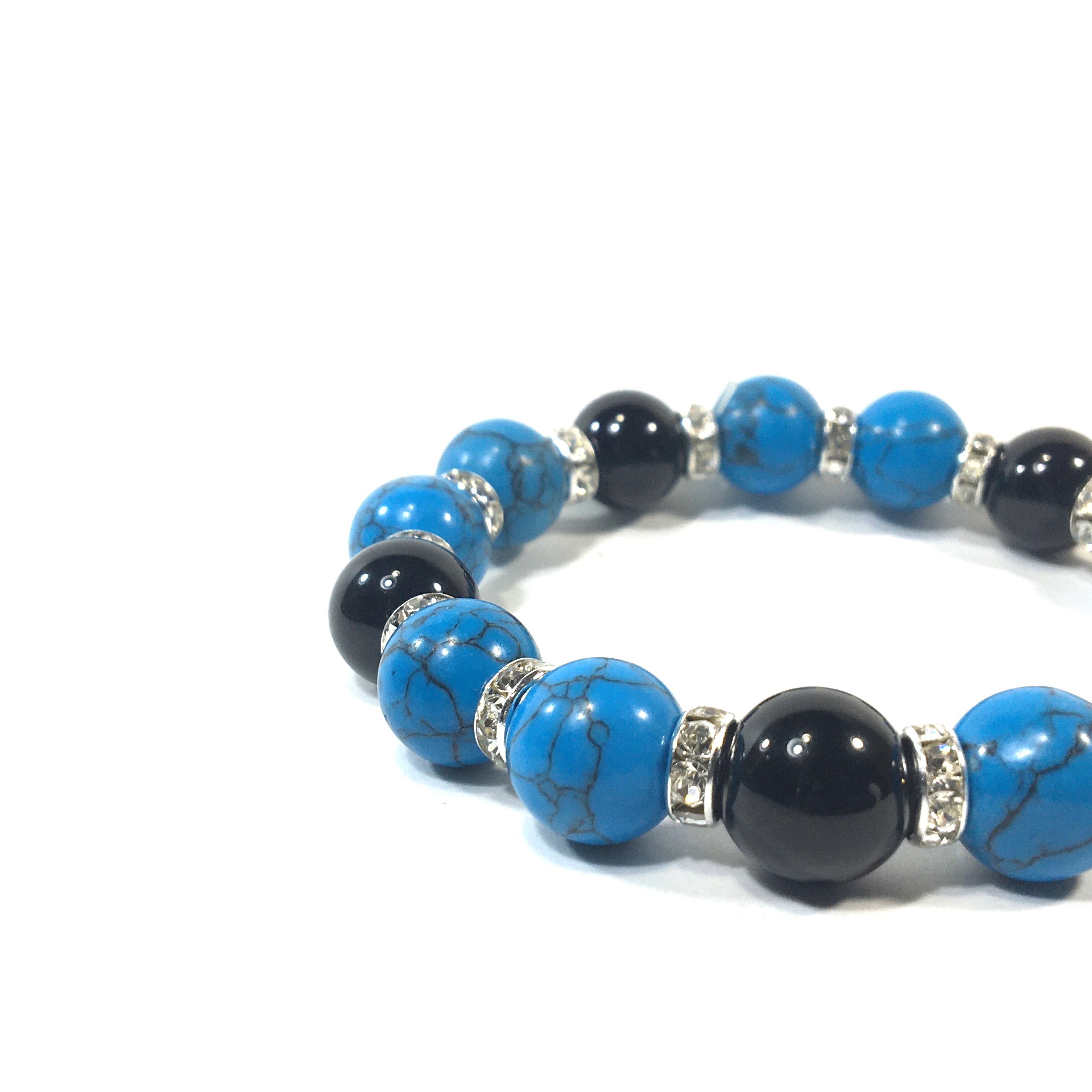 こちらは、ターコイズとオニキスを組み合わせたパワーストーンブレスレットです。間にはロンデルを挟み高級感あるデザインに仕上げております。石大きさは12mm玉を使用して内周約18cmです。気になる方は是非この機会にどうぞ。