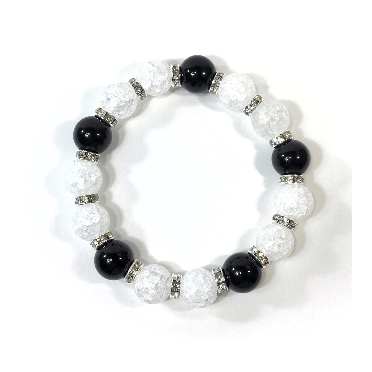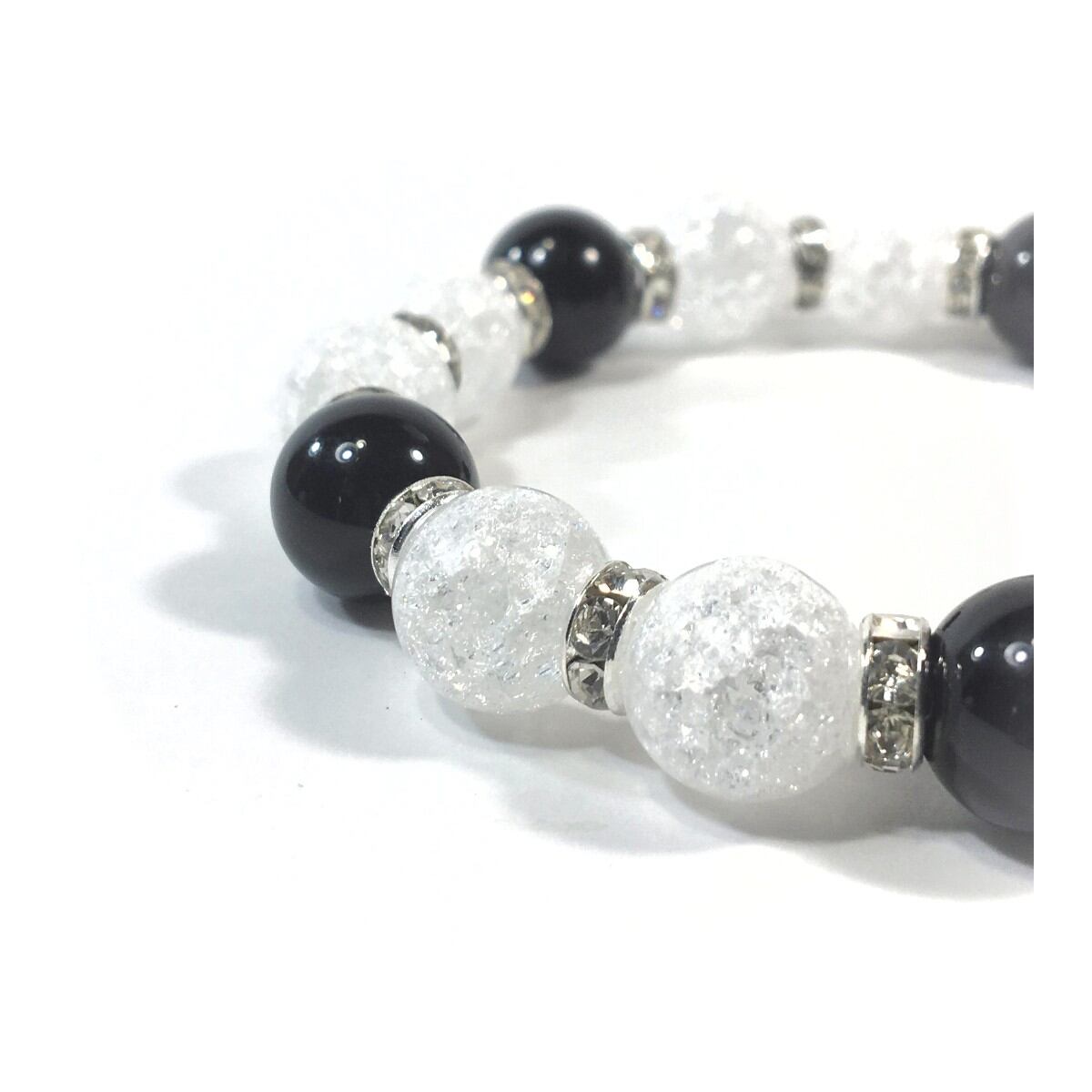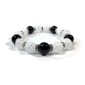 こちらは、クラック水晶とオニキスを組み合わせたパワーストーンブレスレットです。間にはロンデルを挟み高級感あるデザインに仕上げております。石大きさは12mm玉を使用して内周約18cmです。気になる方は是非この機会にどうぞ。