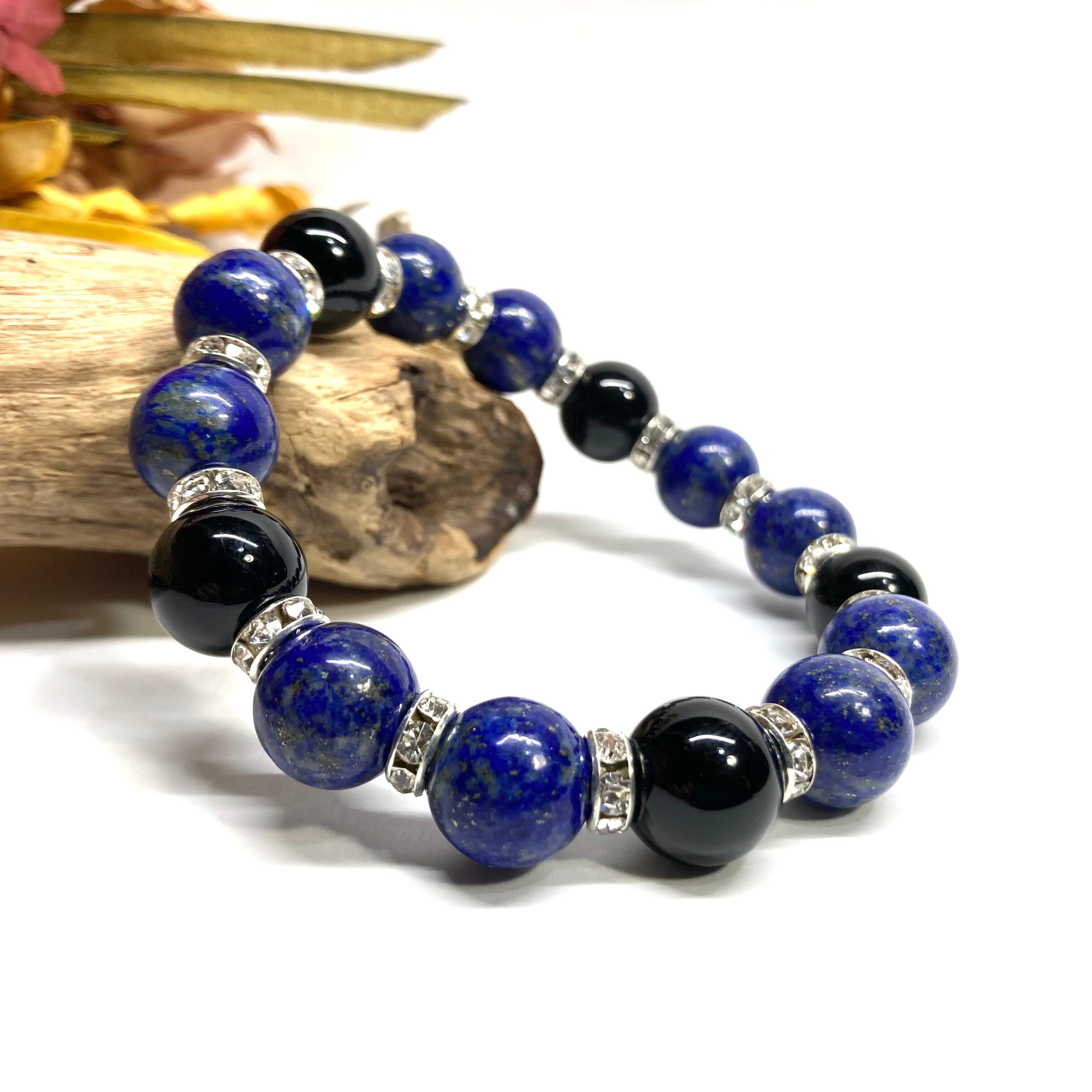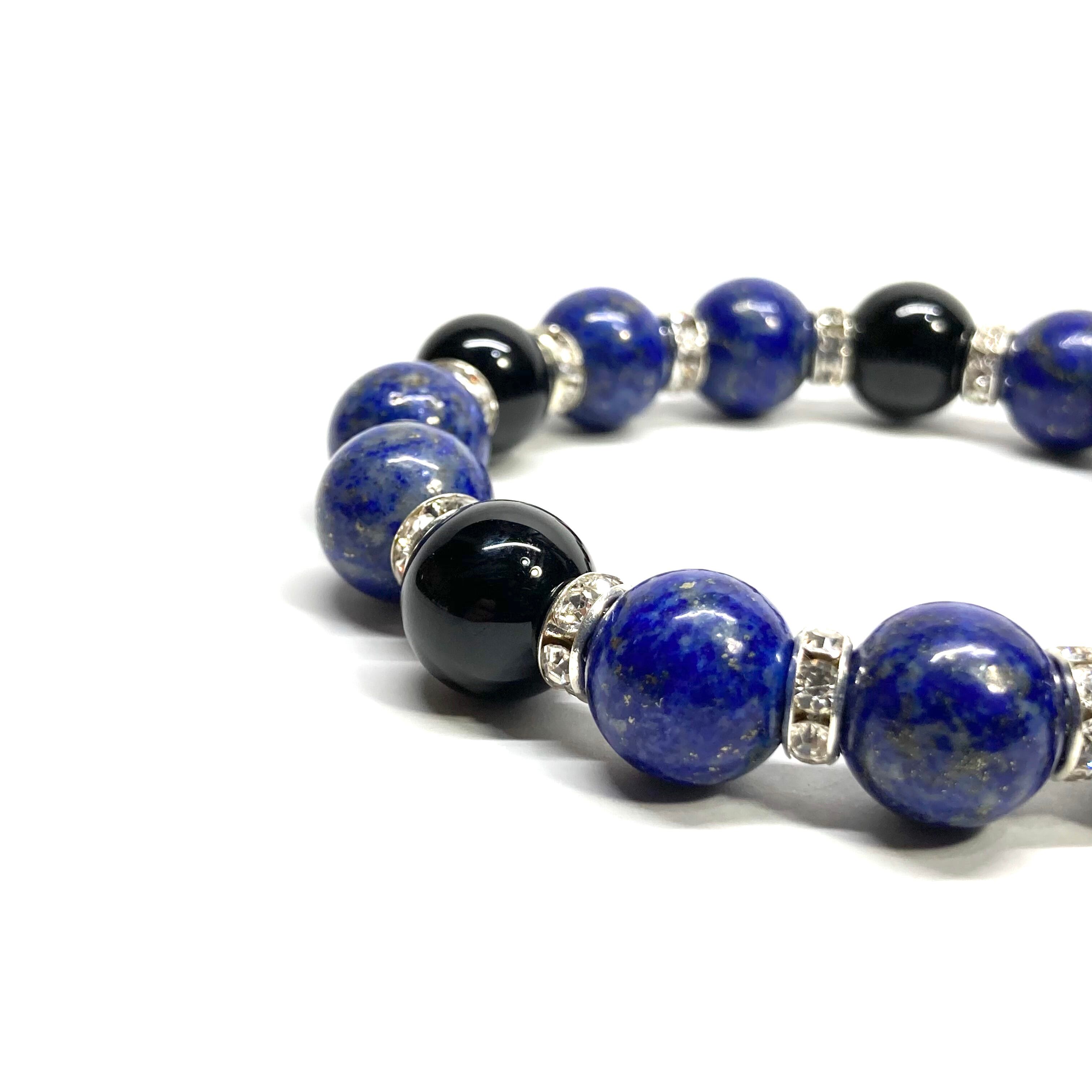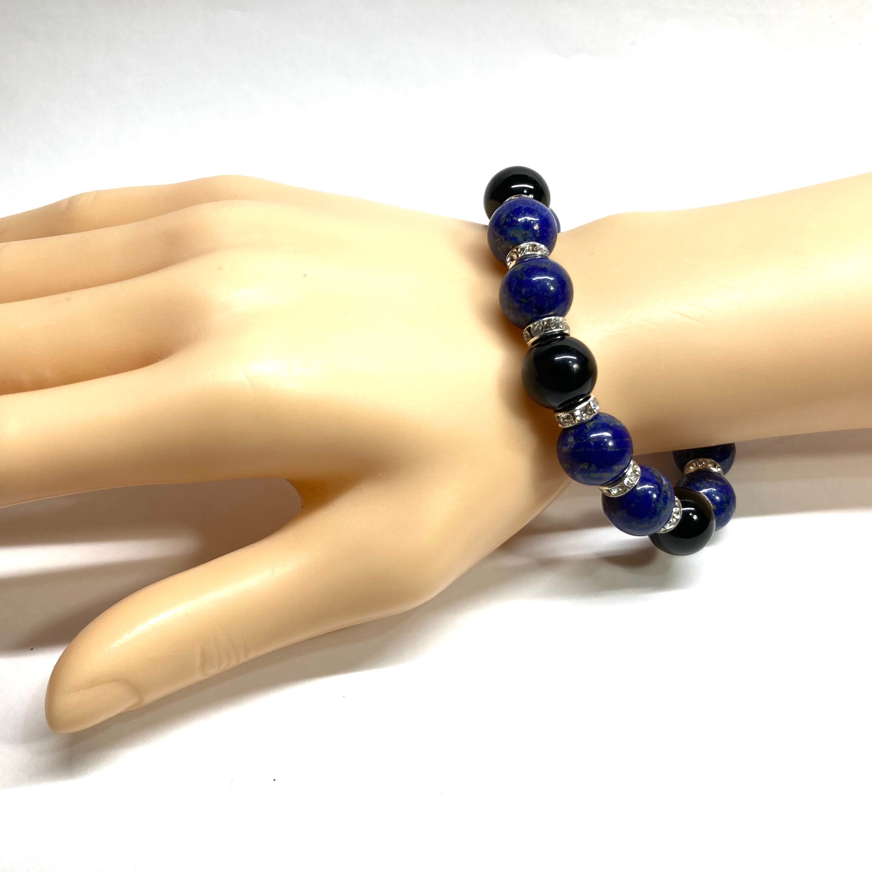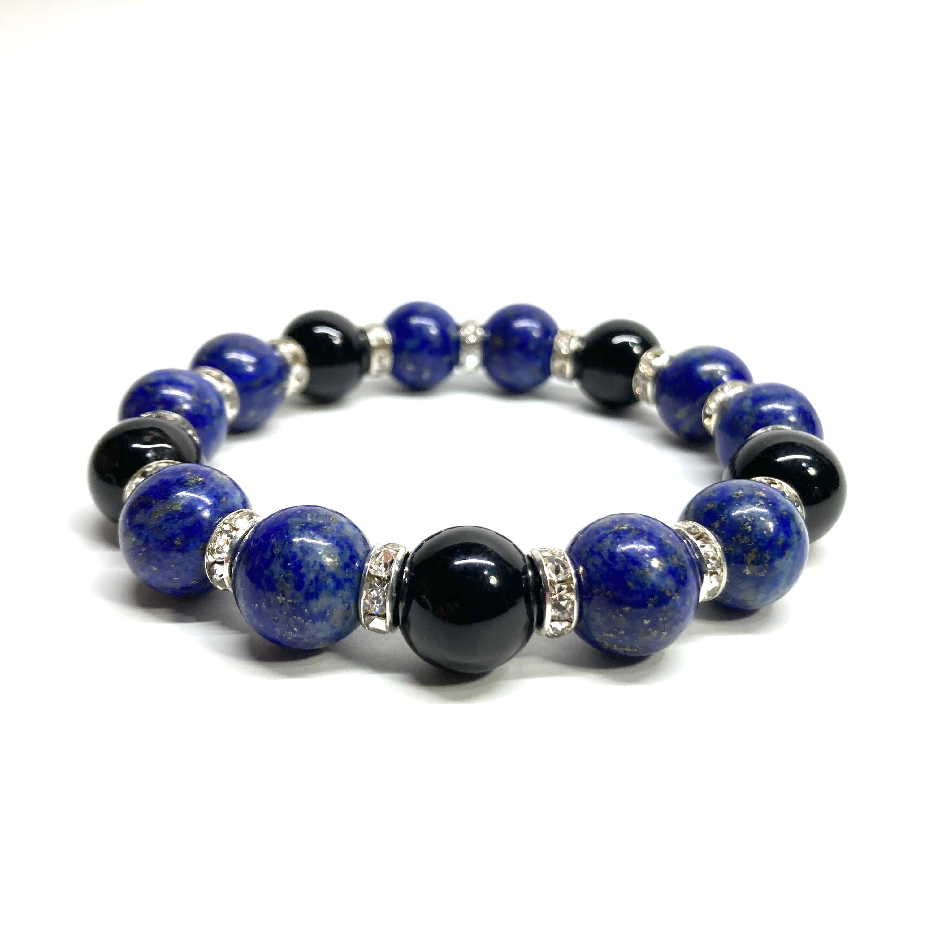 こちらは、ラピスラズリとオニキスを組み合わせたパワーストーンブレスレットです。間にはロンデルを挟み高級感あるデザインに仕上げております。程よくインパクトがある12mm玉を使用して内周約18cmです。(サイズ変更の場合は取引ナビにてご連絡をお願いします。) 数に限りがございますので気になる方はお早めにどうぞ。