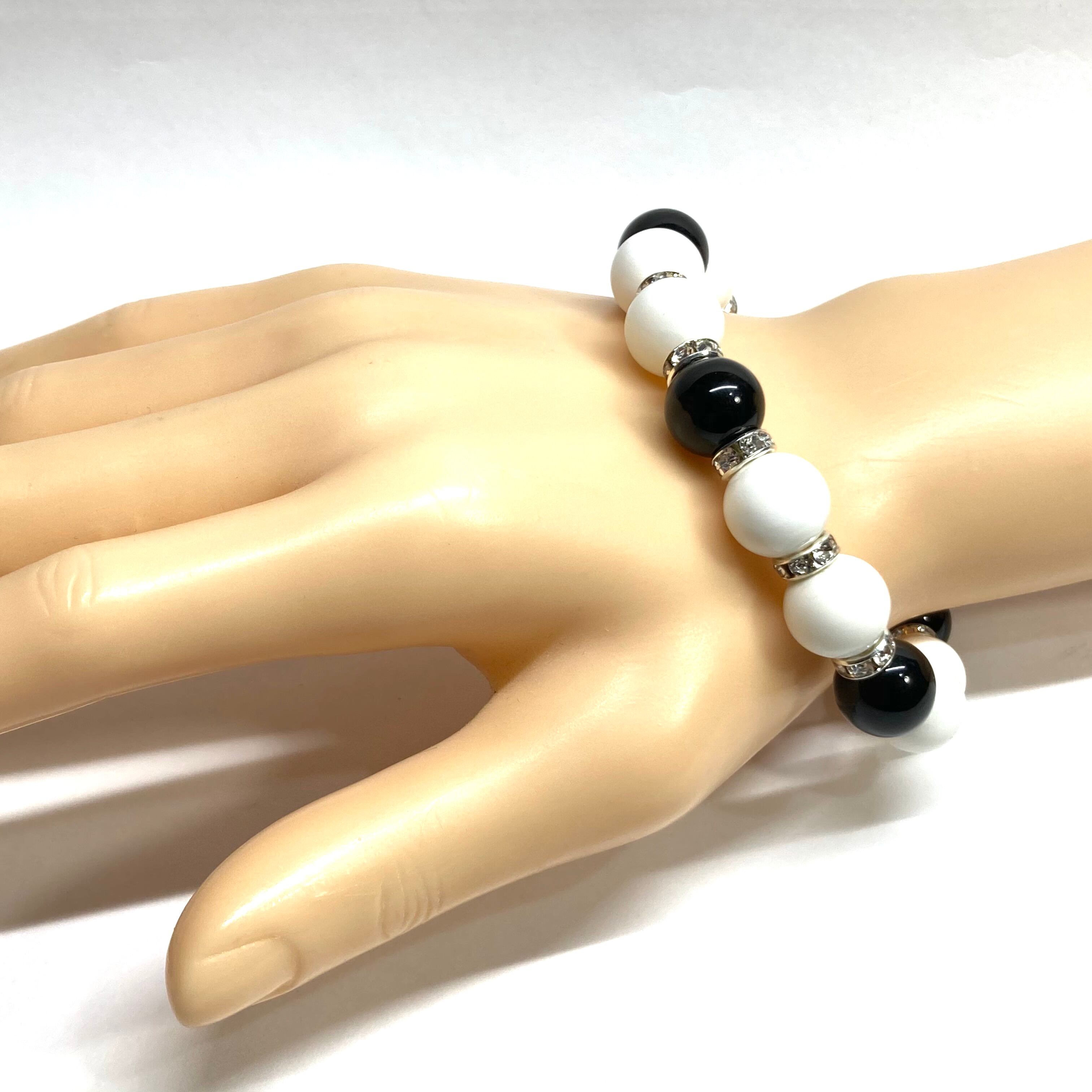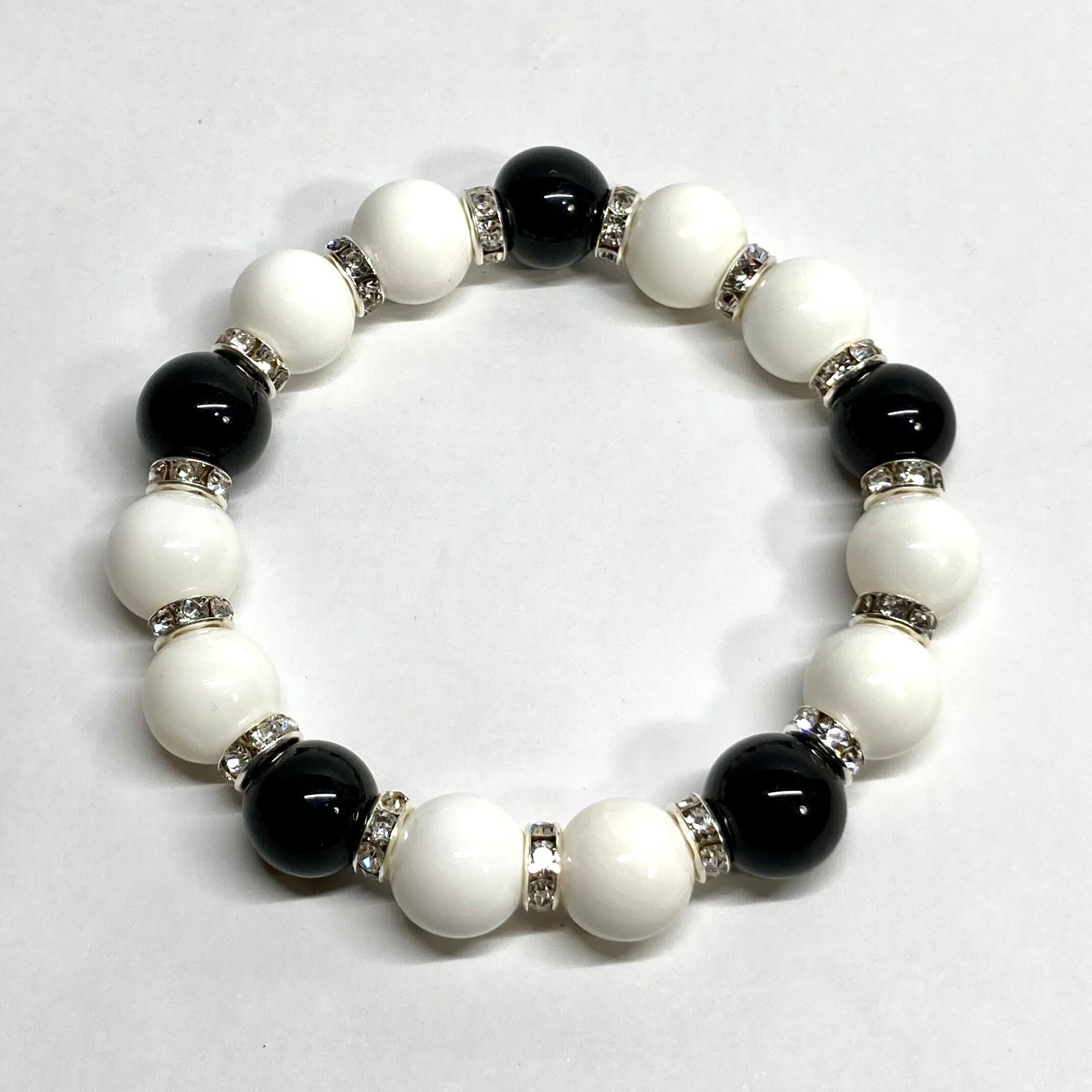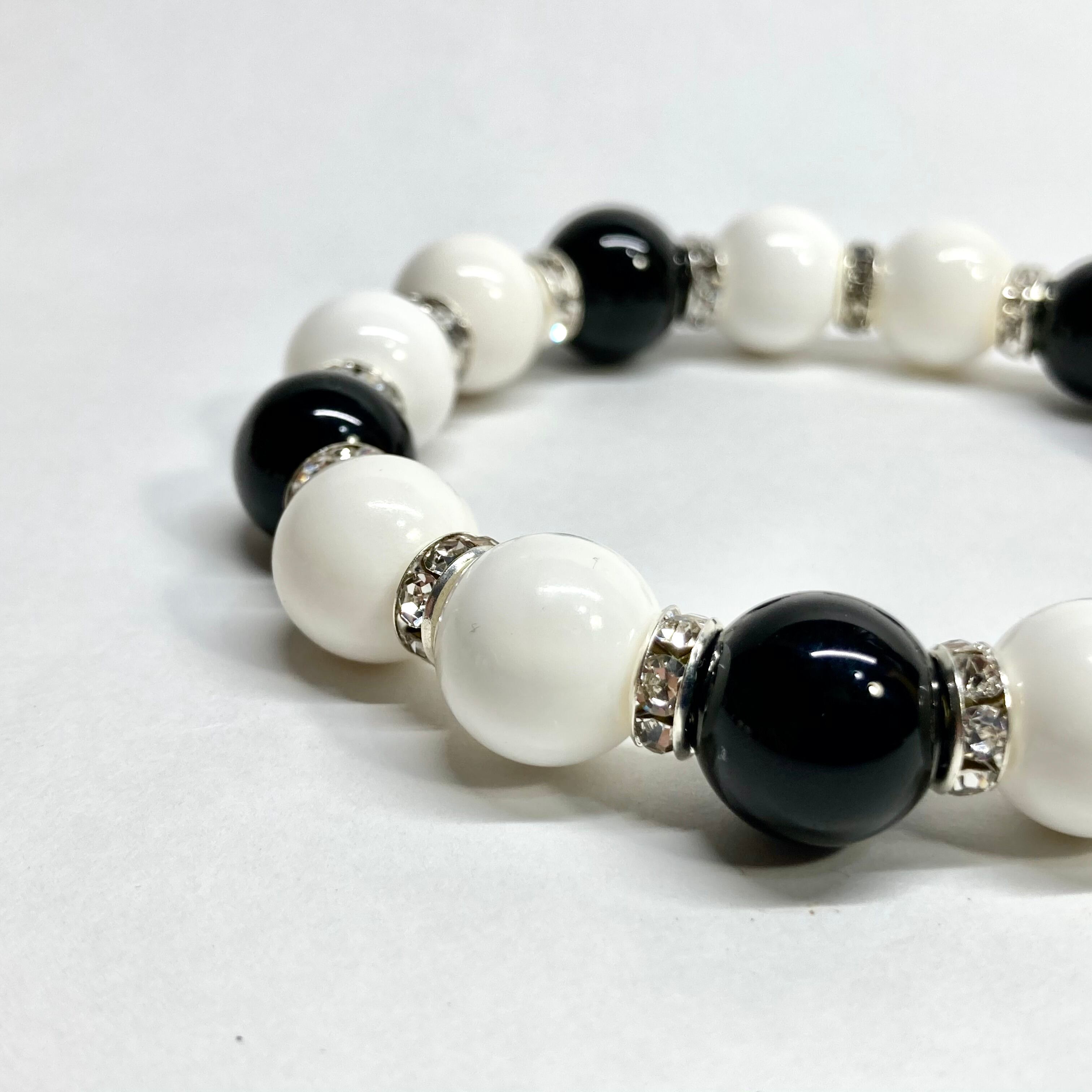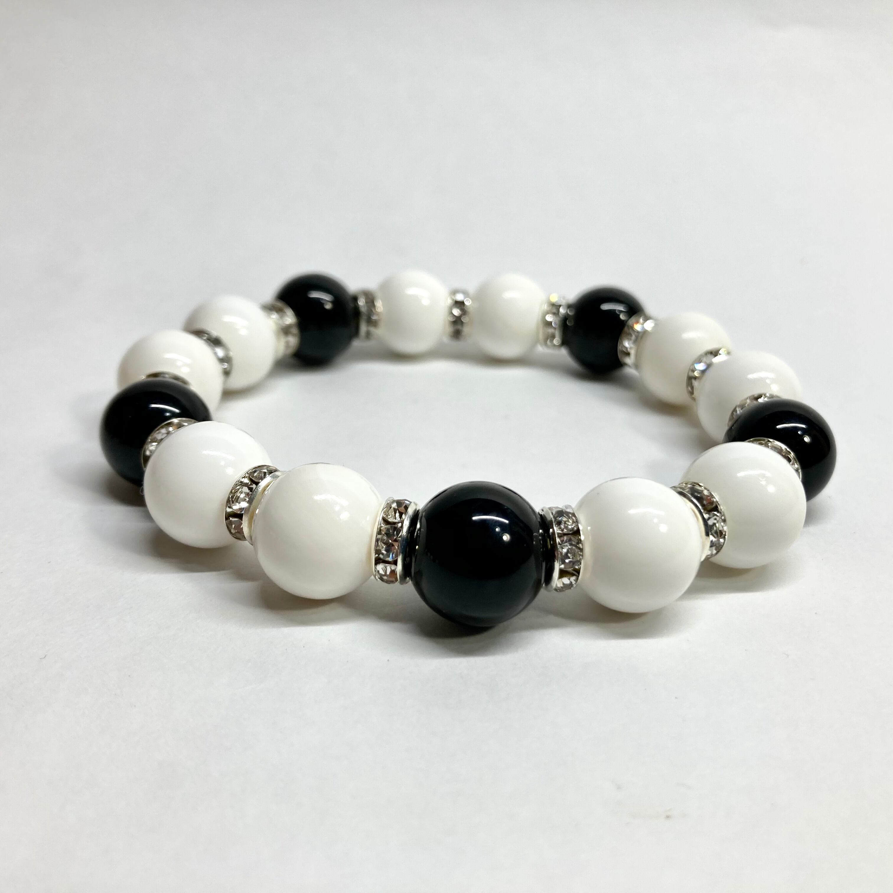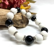 こちらは、ホワイトオニキスとオニキスを組み合わせたパワーストーンブレスレットです。間にはロンデルを挟み高級感あるデザインに仕上げております。程よくインパクトがある12mm玉を使用して内周約18cmです。数に限りがございますので気になる方はお早めにどうぞ。
