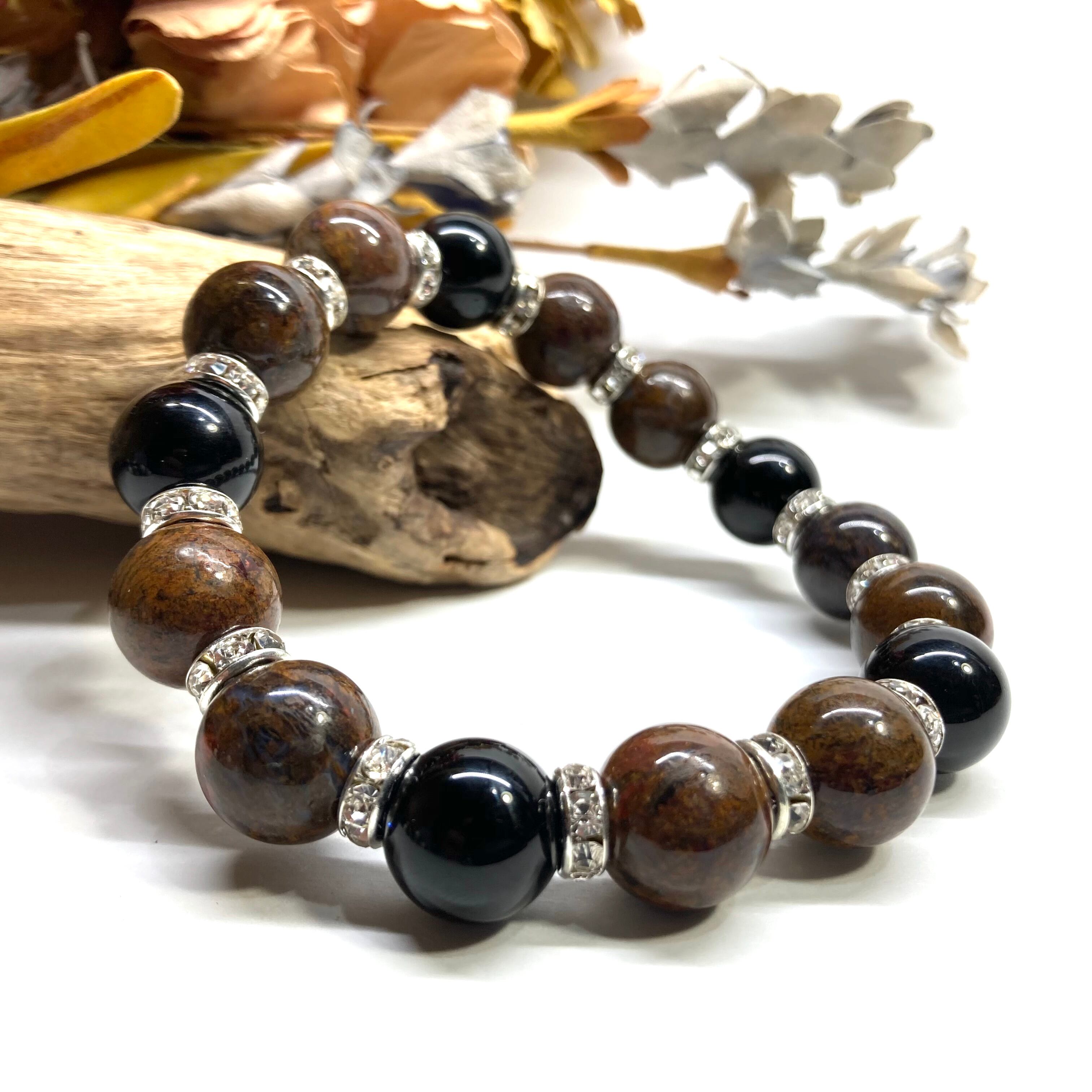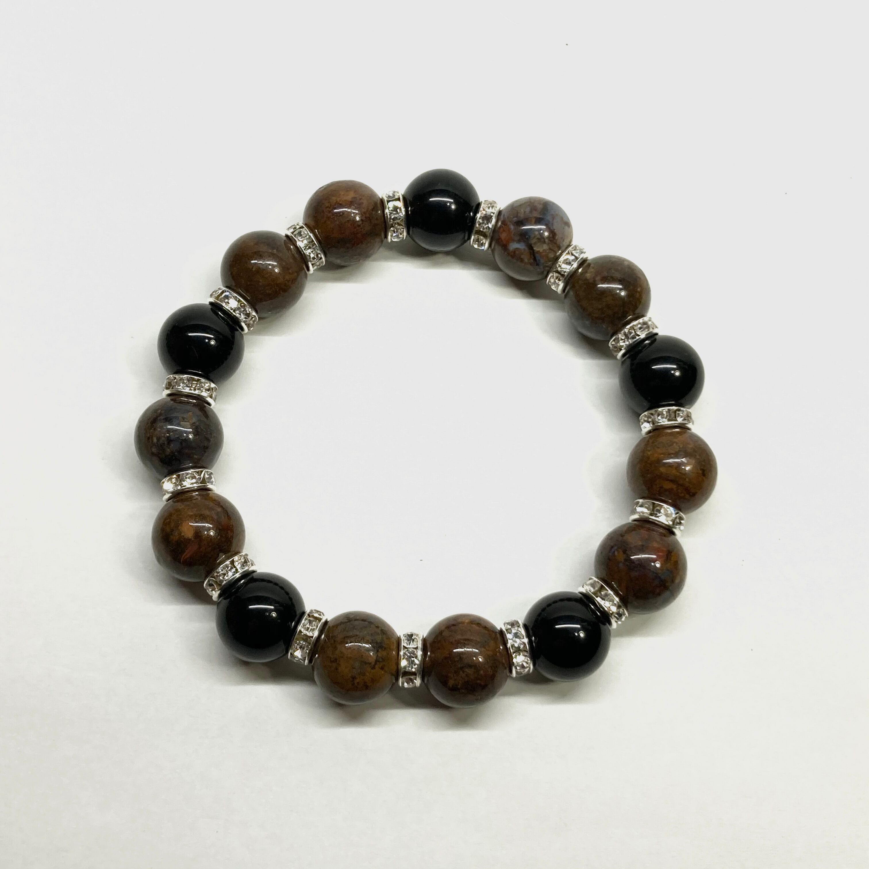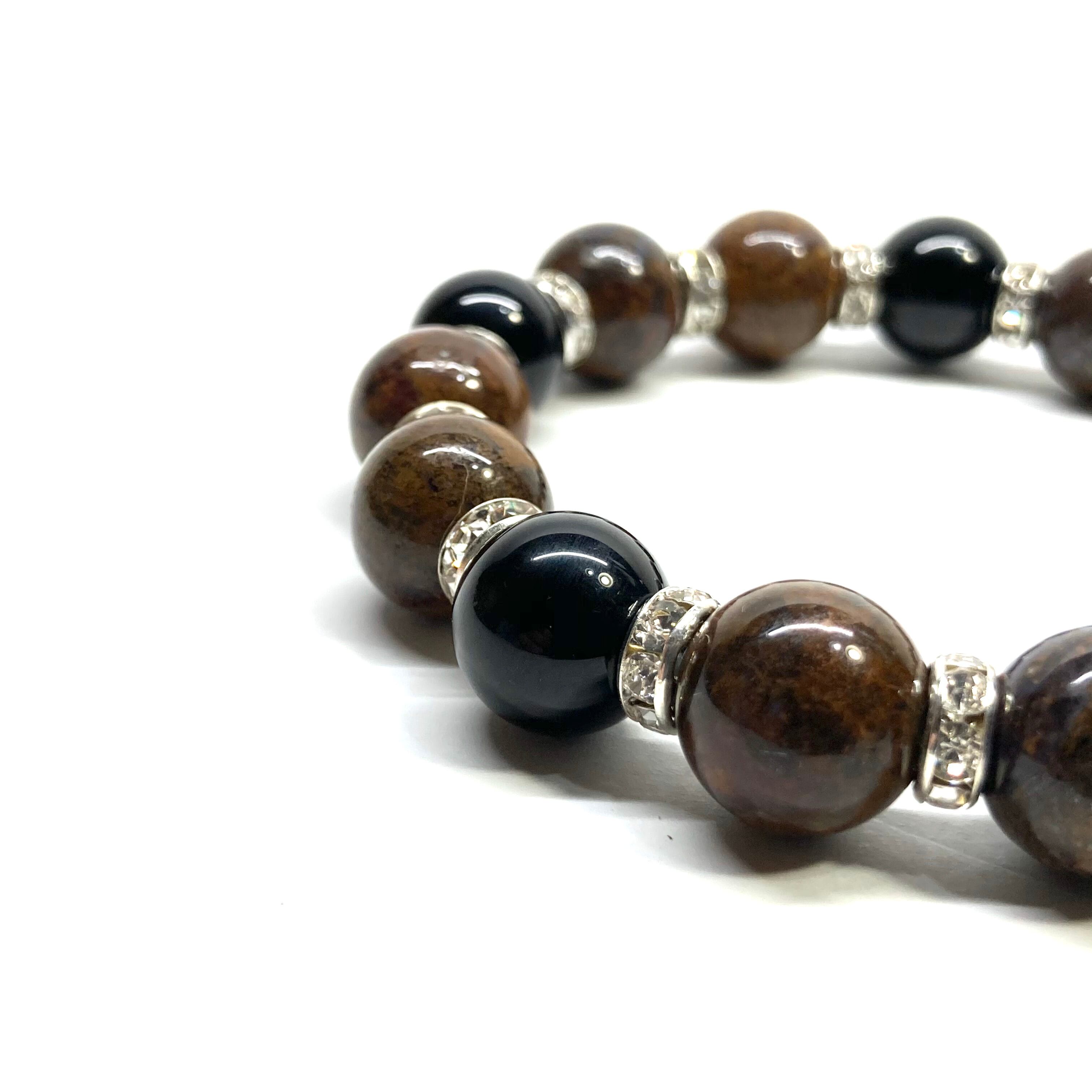 こちらは、10mm玉のピーターサイトとオニキスを組み合わせたパワーストーンブレスレットです。間にはロンデルを挟み高級感あるデザインに仕上げております。石大きさは12mm玉を使用して内径約18cmです。数に限りがございますので気になる方はお早めにどうぞ。