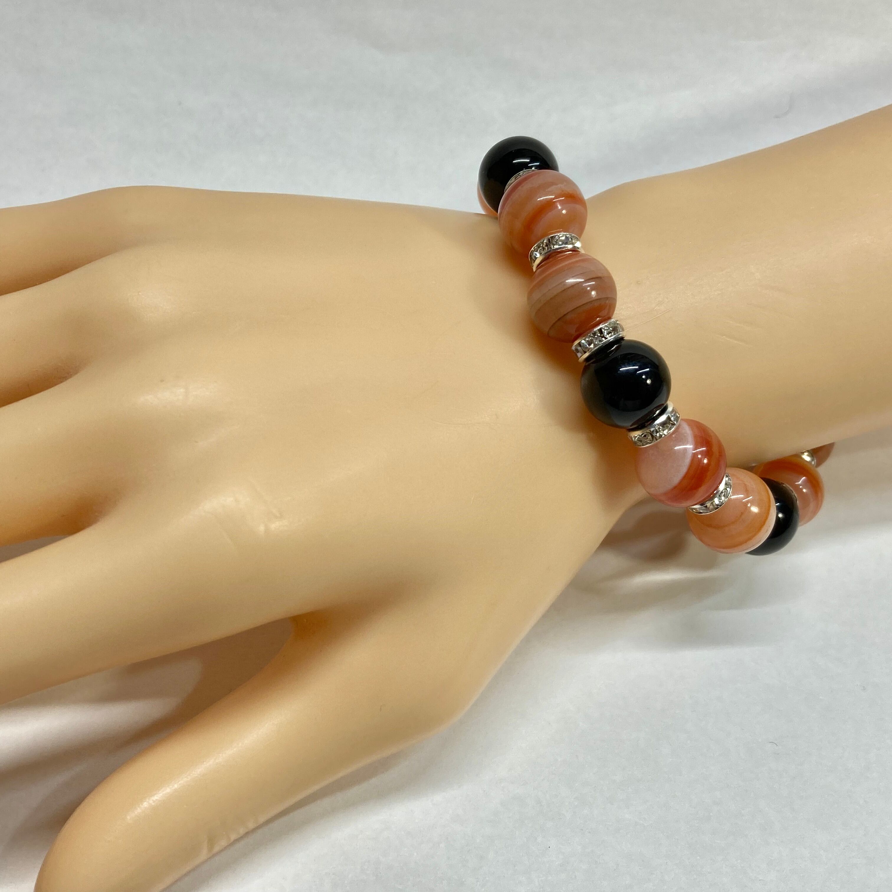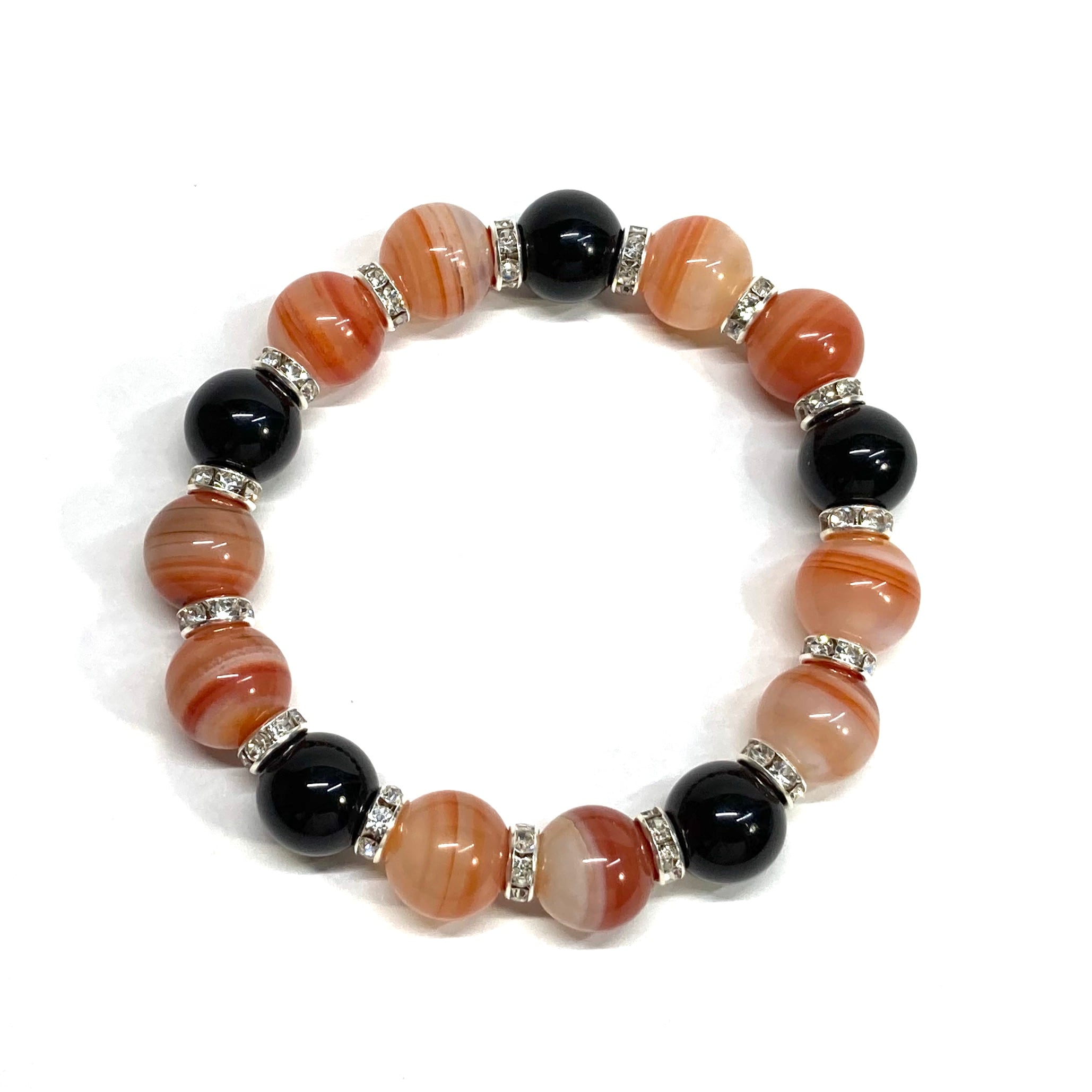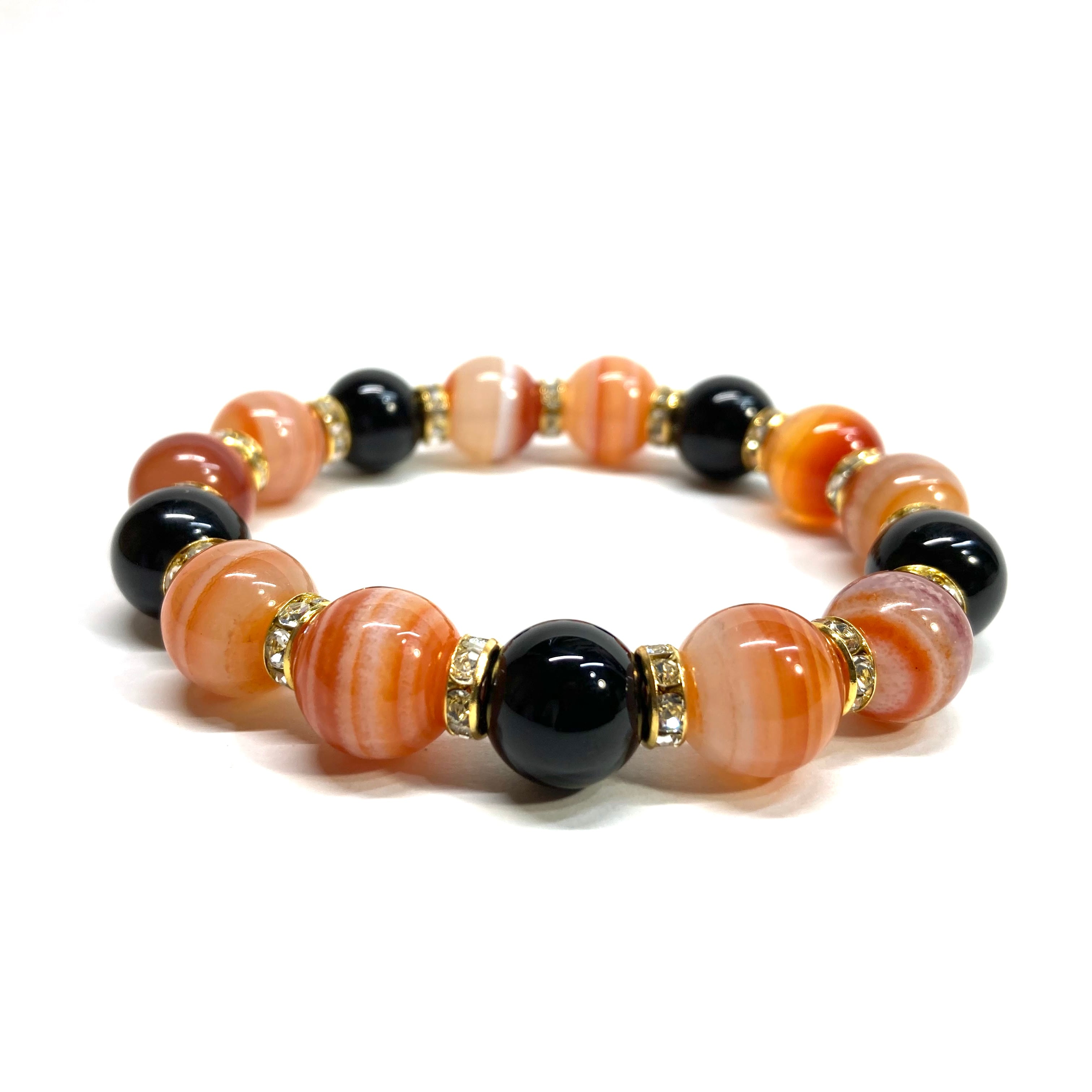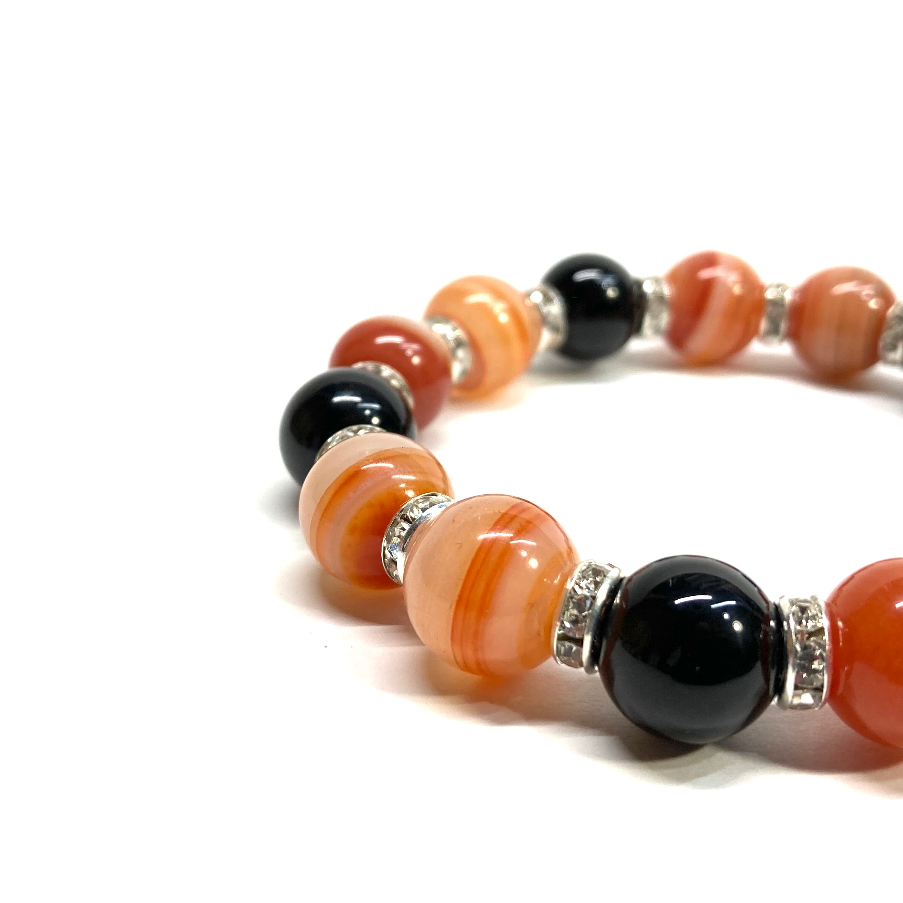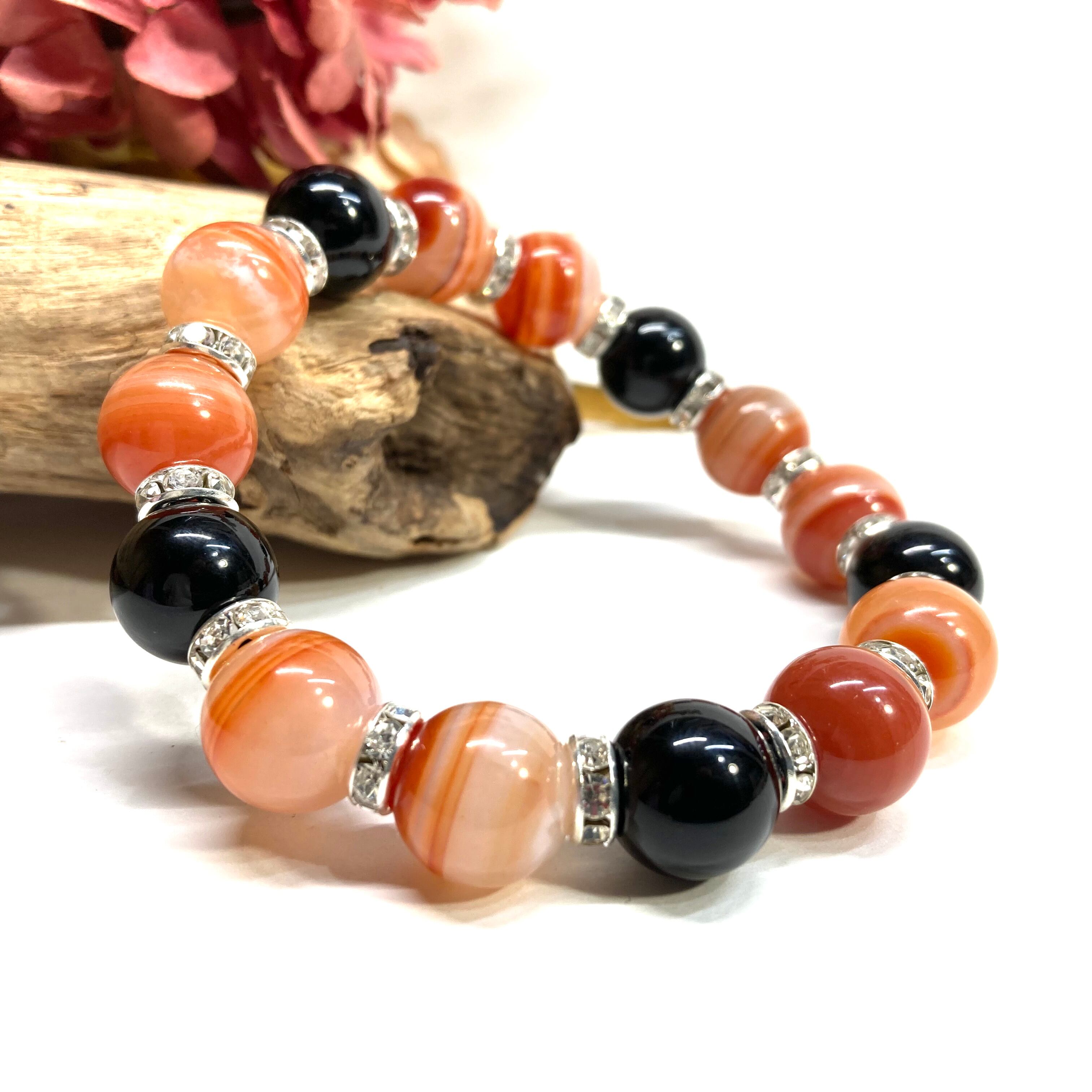 こちらは、12mm玉のカーネリアン・サードニクス(サードオニキス)とオニキスを組み合わせたパワーストーンブレスレットです。間にはロンデルを挟み高級感あるデザインに仕上げております。石大きさは12mm玉を使用して内周約18cmです。気になる方は是非この機会にどうぞ。