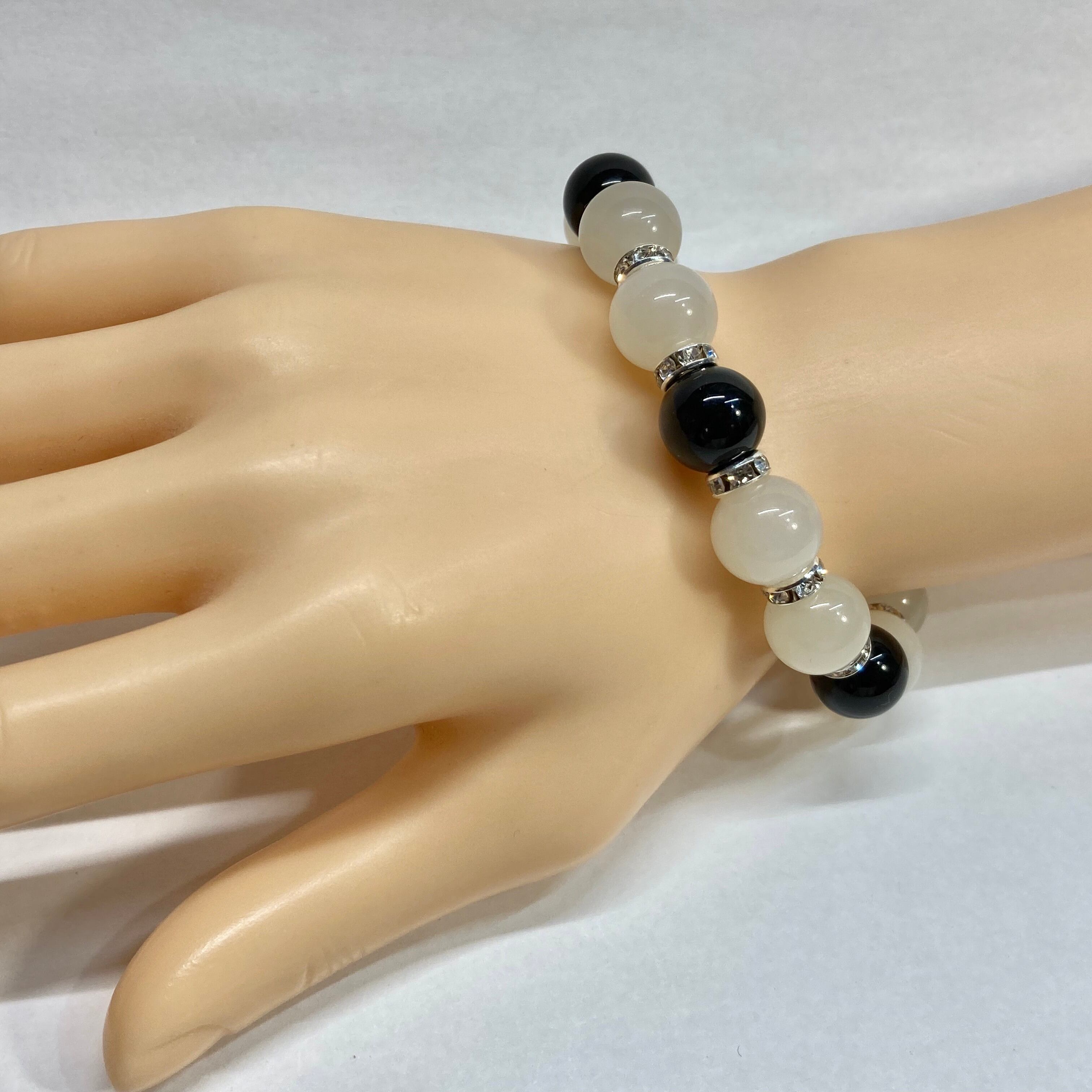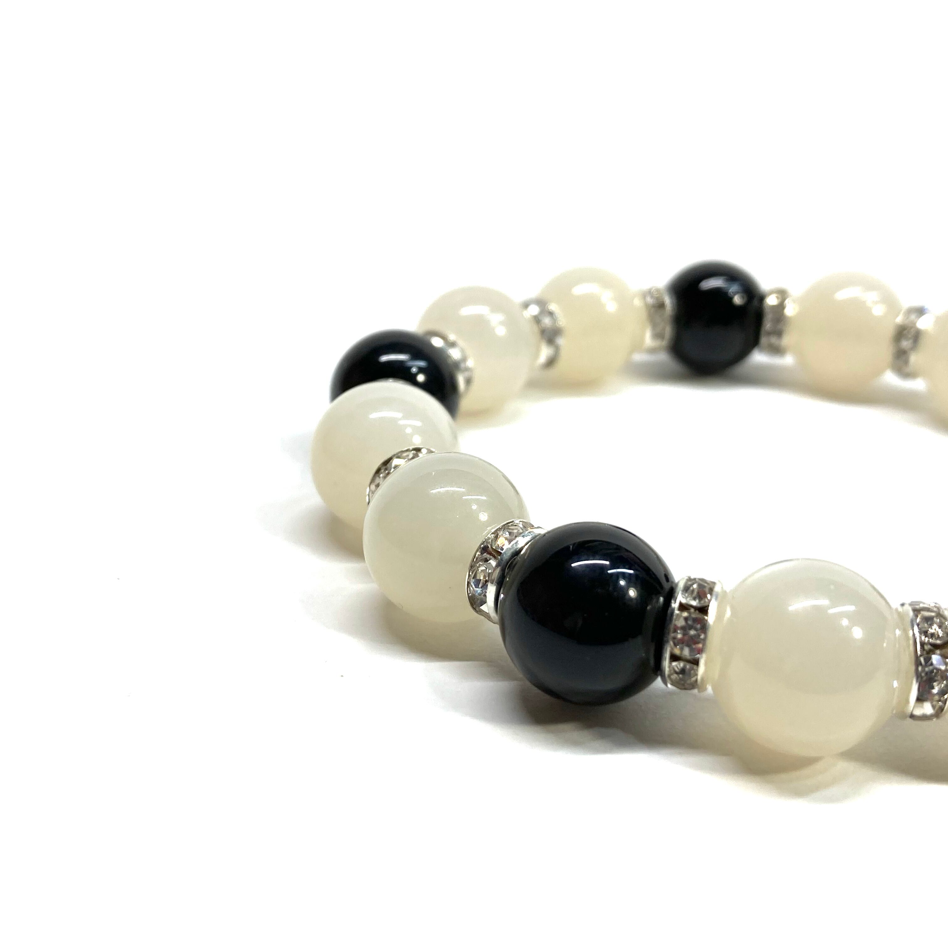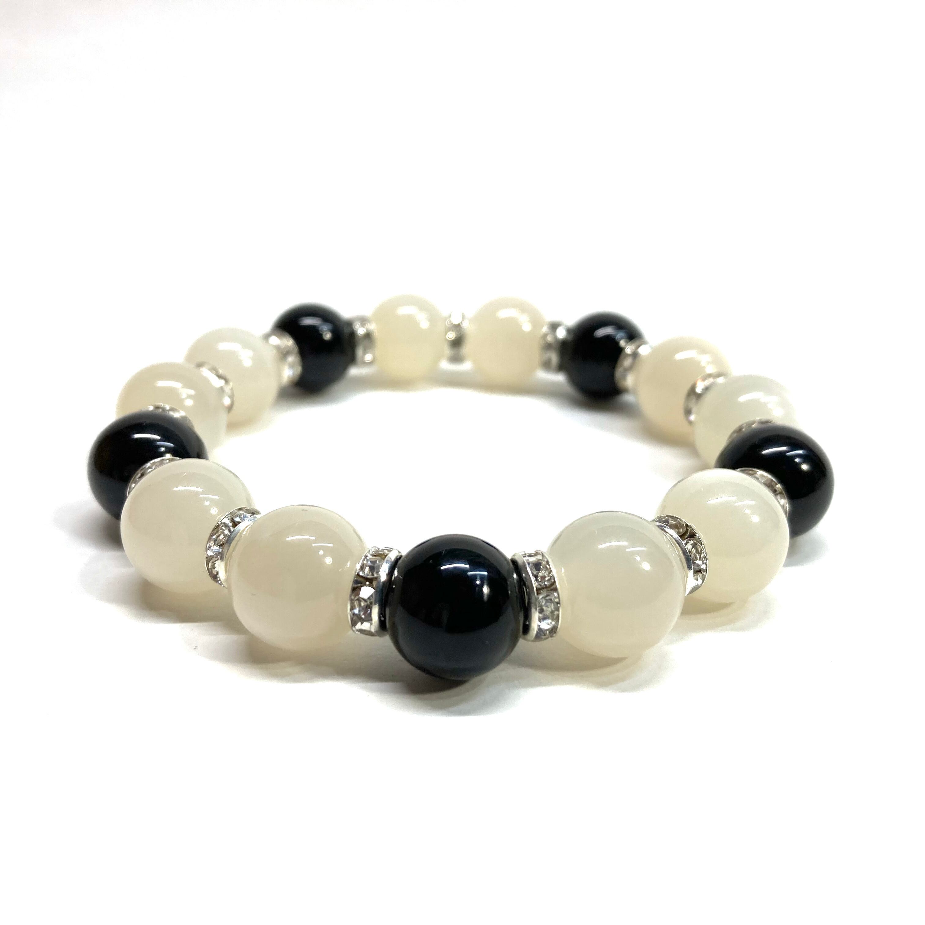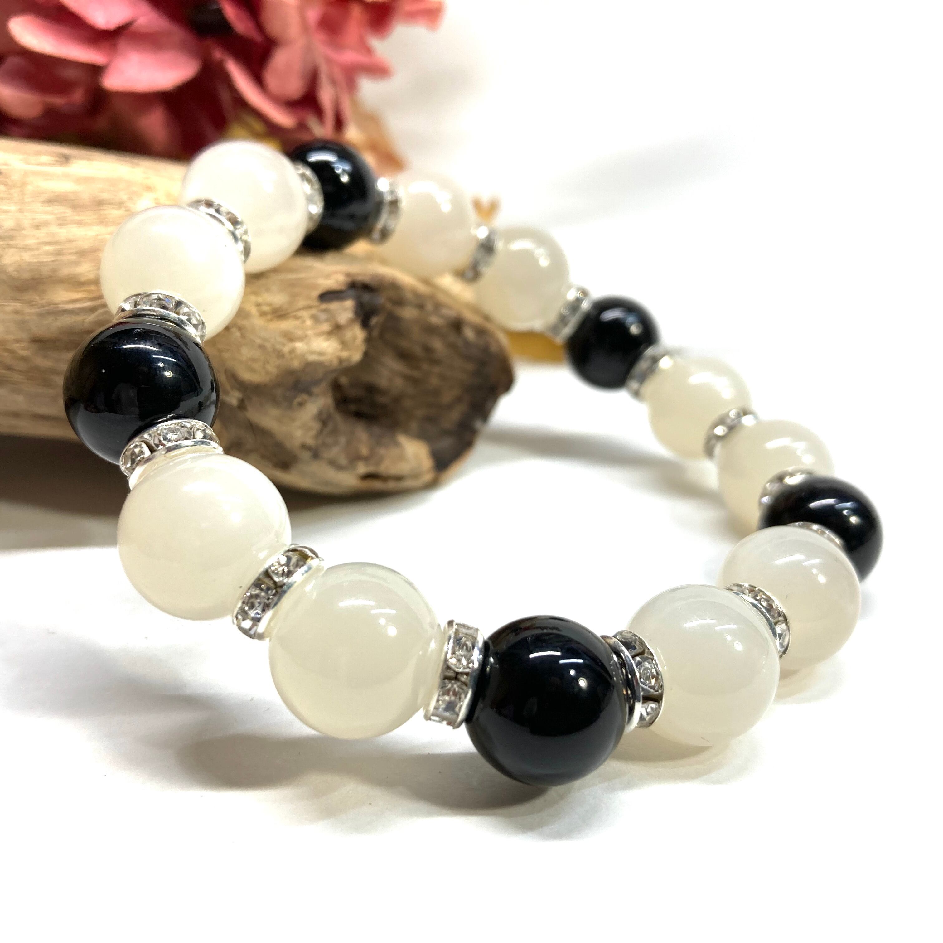 こちらは、12mm玉のムーンストーンとオニキスを組み合わせたパワーストーンブレスレットです。間にはロンデルを挟み高級感あるデザインに仕上げております。石大きさは12mm玉を使用して内周約18cmです。気になる方は是非この機会にどうぞ。