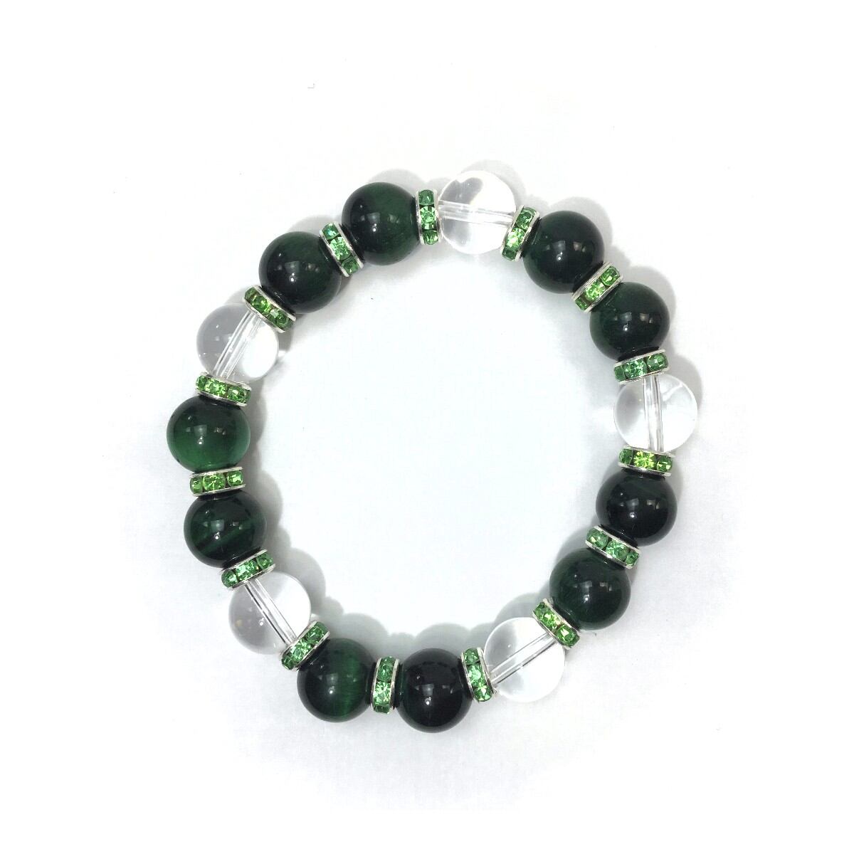 こちらは、グリーンタイガーアイと水晶を組み合わせたパワーストーンブレスレットです。間にはロンデルを挟み高級感あるデザインに仕上げております。石大きさは12mm玉を使用して内周約18cmです。気になる方は是非この機会にどうぞ。