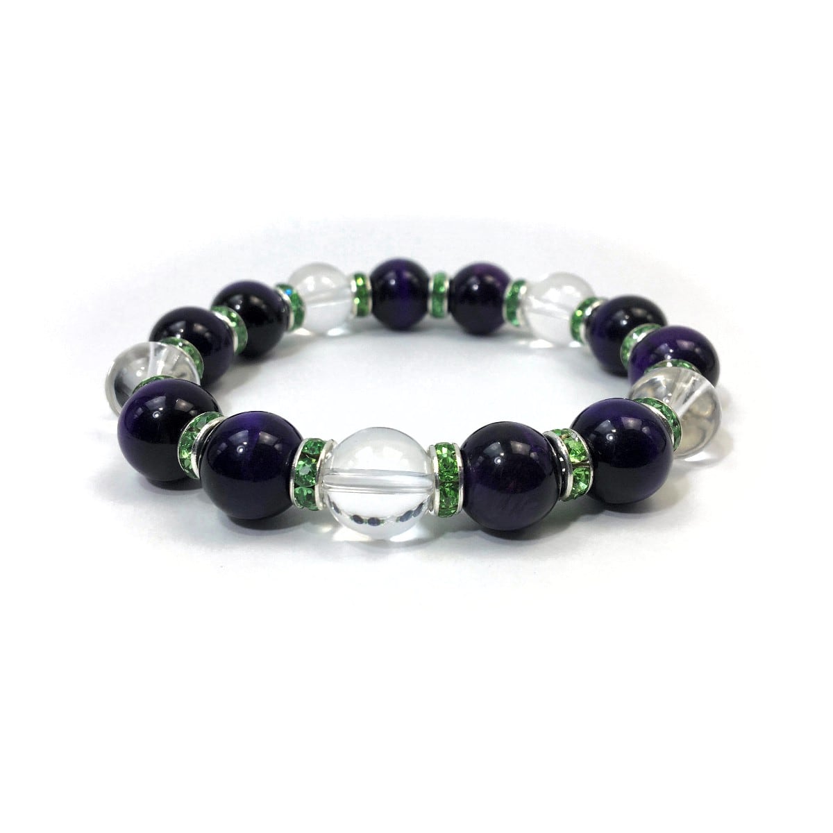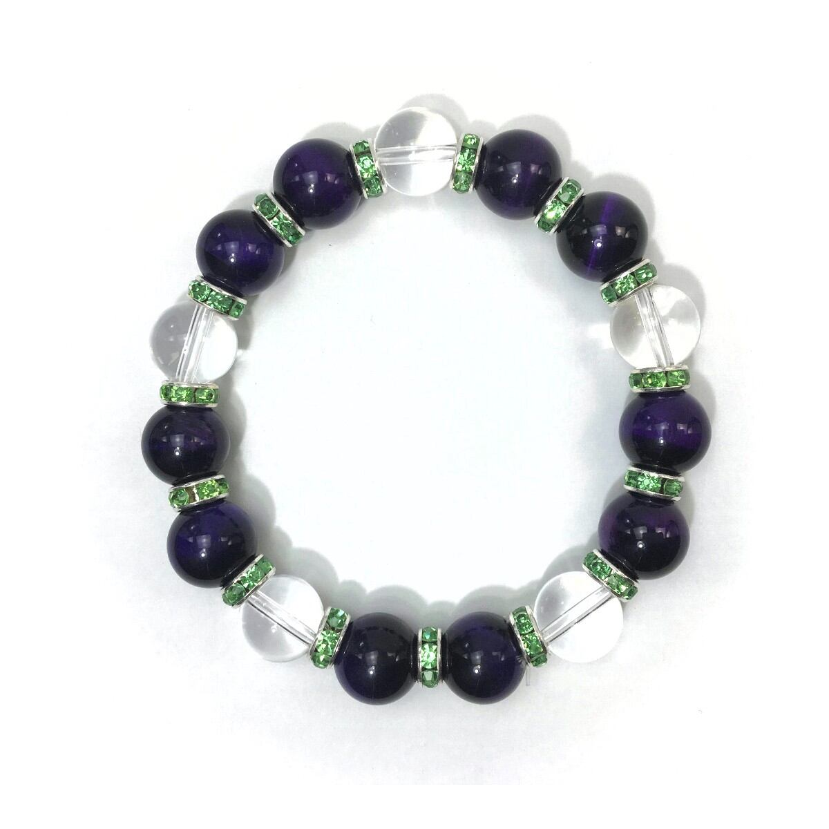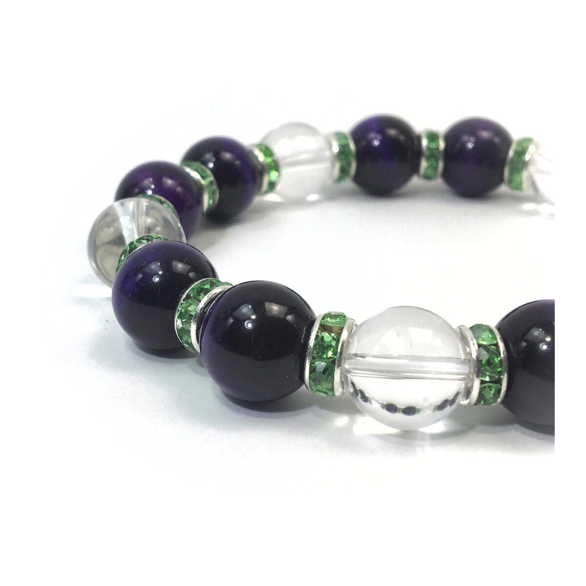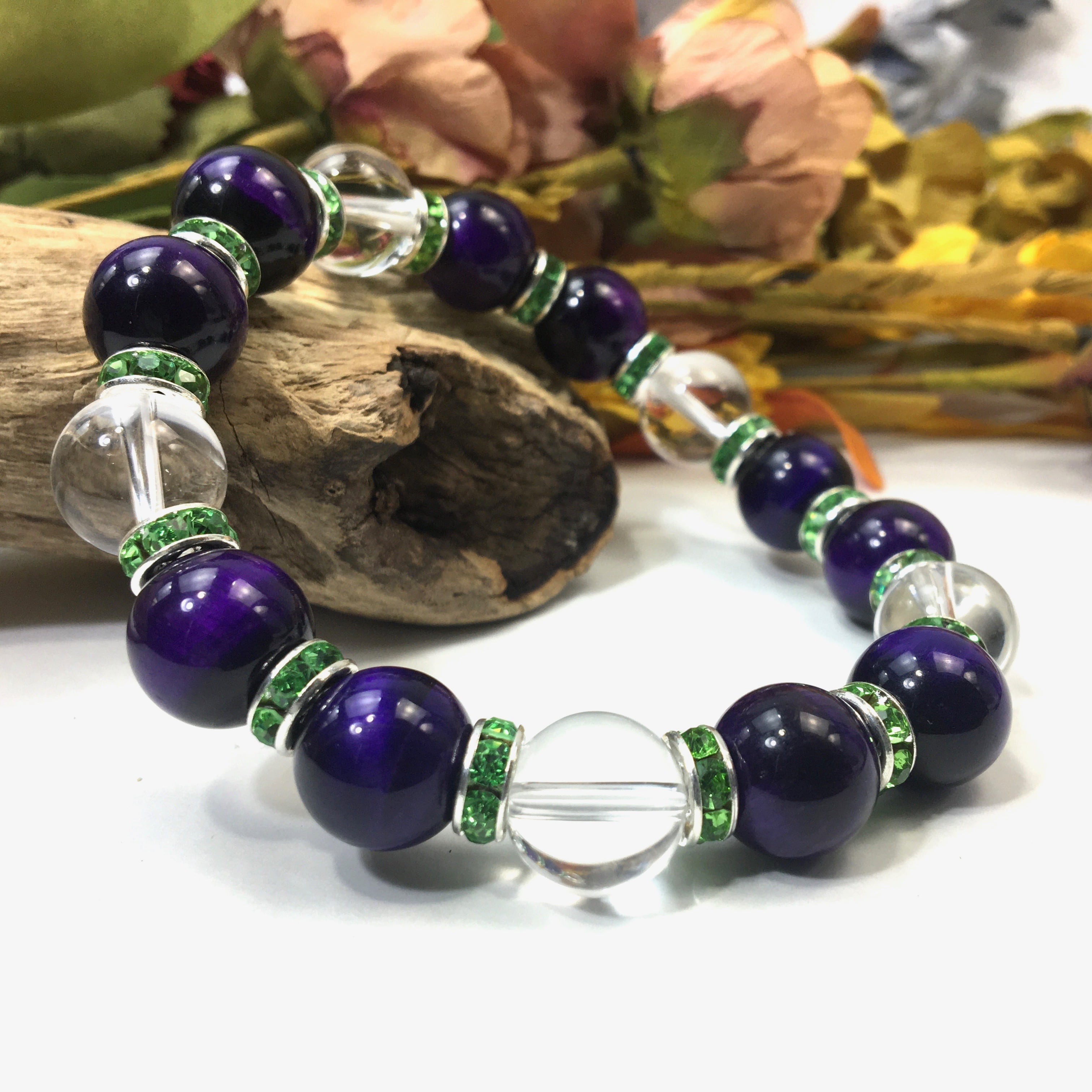 こちらは、パープルタイガーアイと水晶を組み合わせたパワーストーンブレスレットです。間にはロンデルを挟み高級感あるデザインに仕上げております。石大きさは12mm玉を使用して内周約18cmです。気になる方は是非この機会にどうぞ。