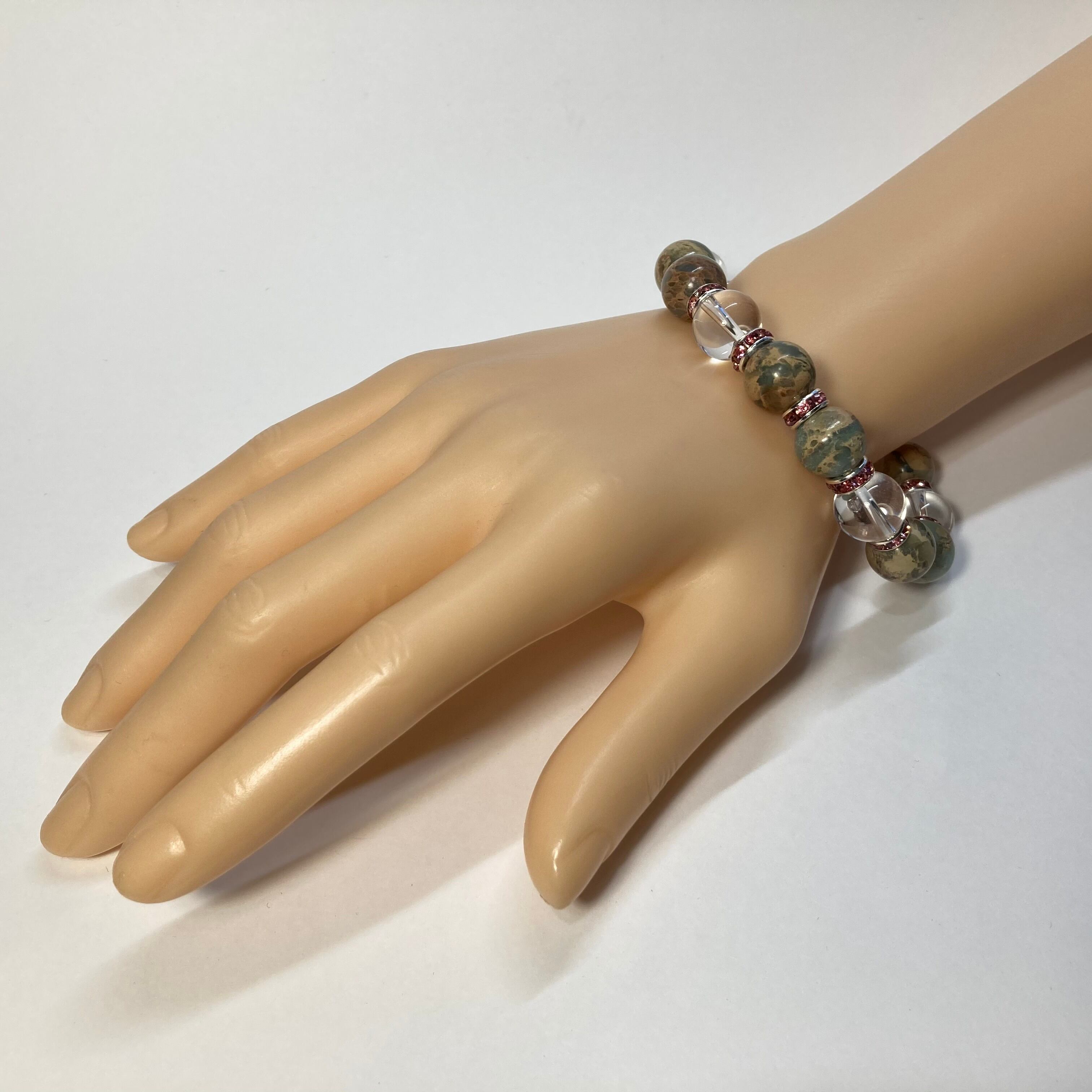 こちらは、インプレッションストーンと水晶を組み合わせたパワーストーンブレスレットです。間にはロンデルを挟み高級感あるデザインに仕上げております。石大きさは12mm玉を使用して内径約18cmです。気になる方は是非この機会にどうぞ。