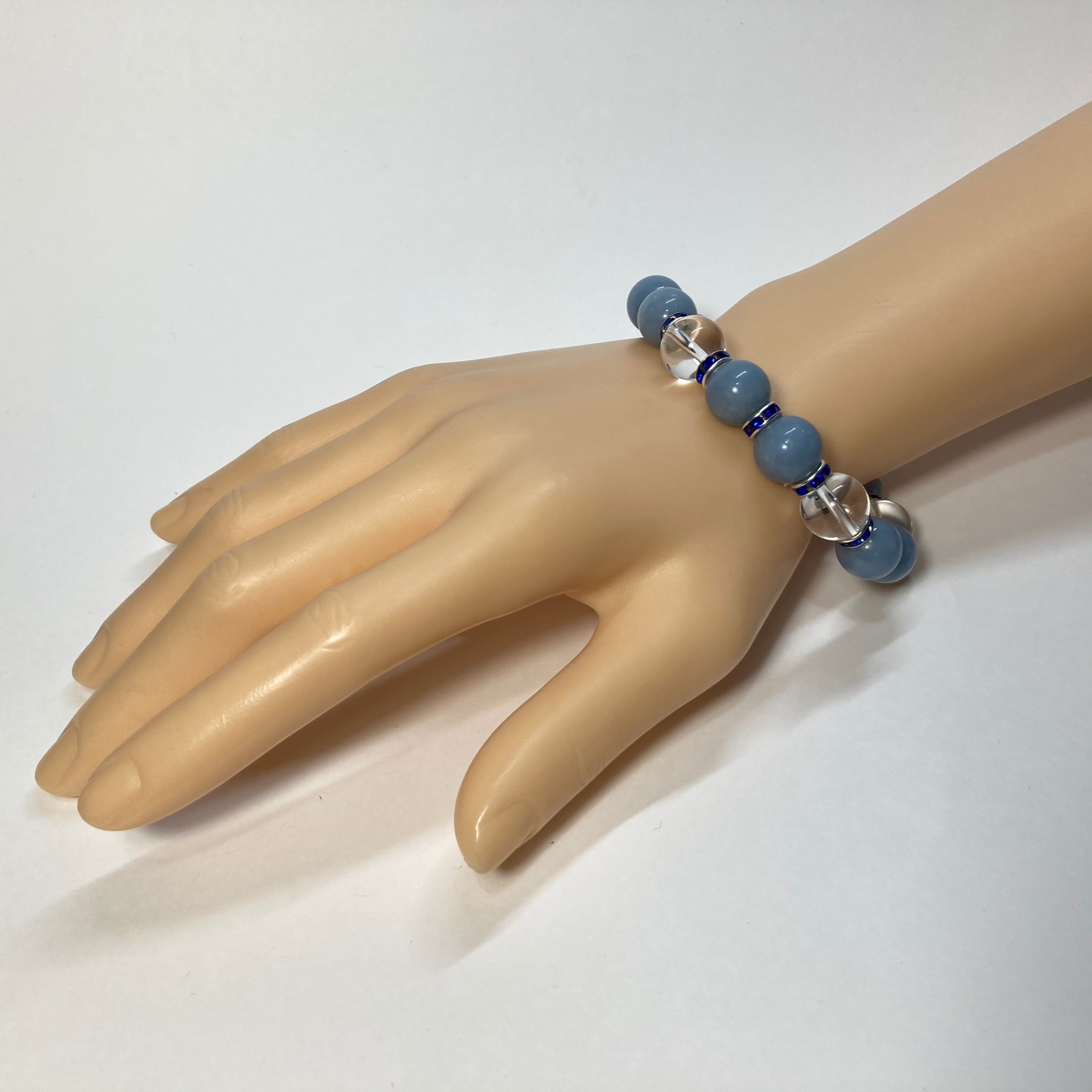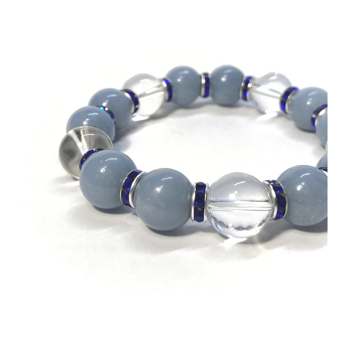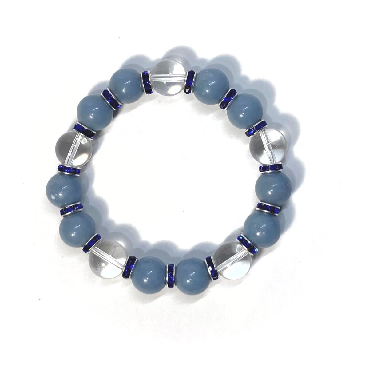 こちらは、エンジェライトと水晶を組み合わせたパワーストーンブレスレットです。間にはロンデルを挟み高級感あるデザインに仕上げております。石大きさは12mm玉を使用して内径約18cmです。気になる方は是非この機会にどうぞ。