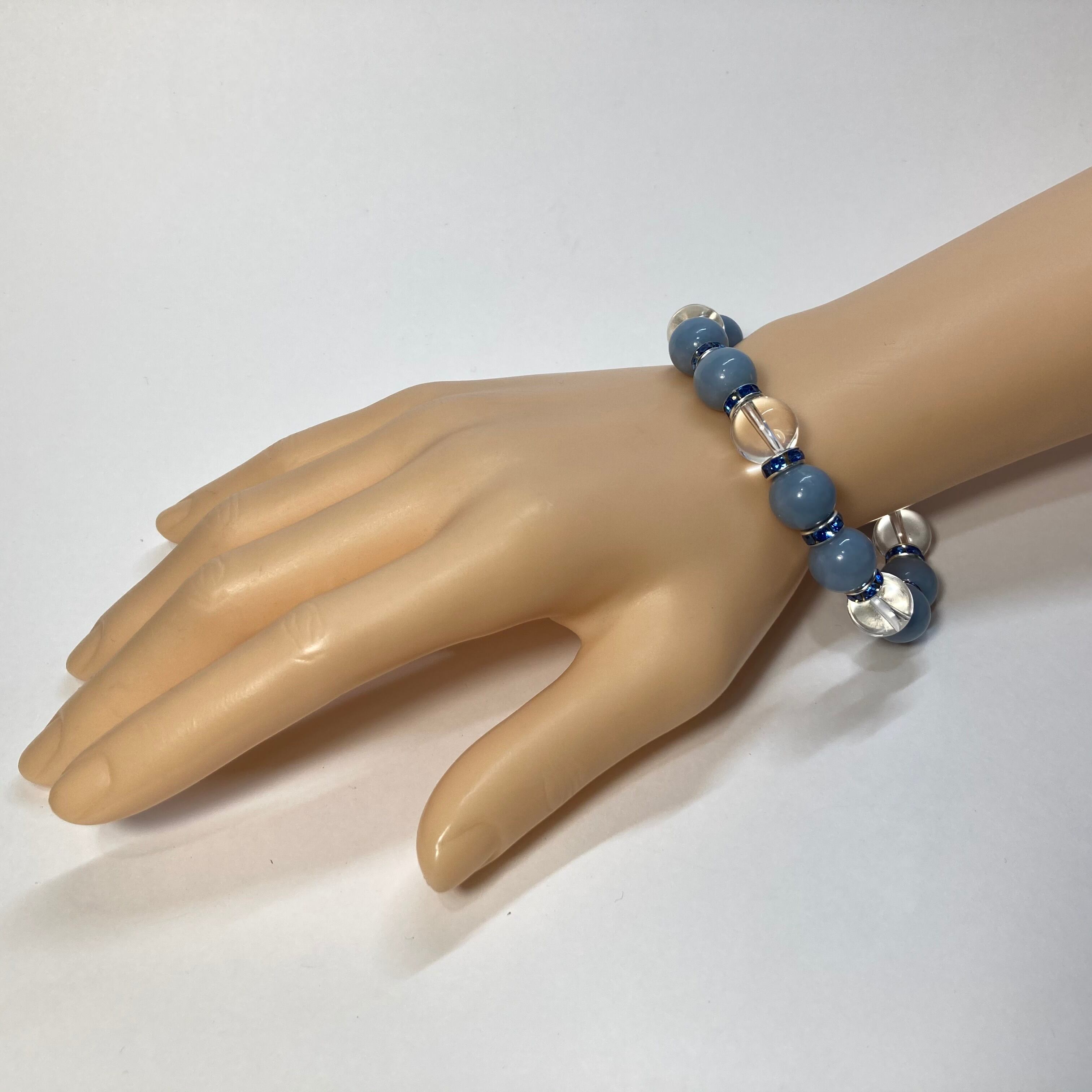 こちらは、エンジェライトと水晶を組み合わせたパワーストーンブレスレットです。間にはロンデルを挟み高級感あるデザインに仕上げております。石大きさは12mm玉を使用して内径約18cmです。気になる方は是非この機会にどうぞ。