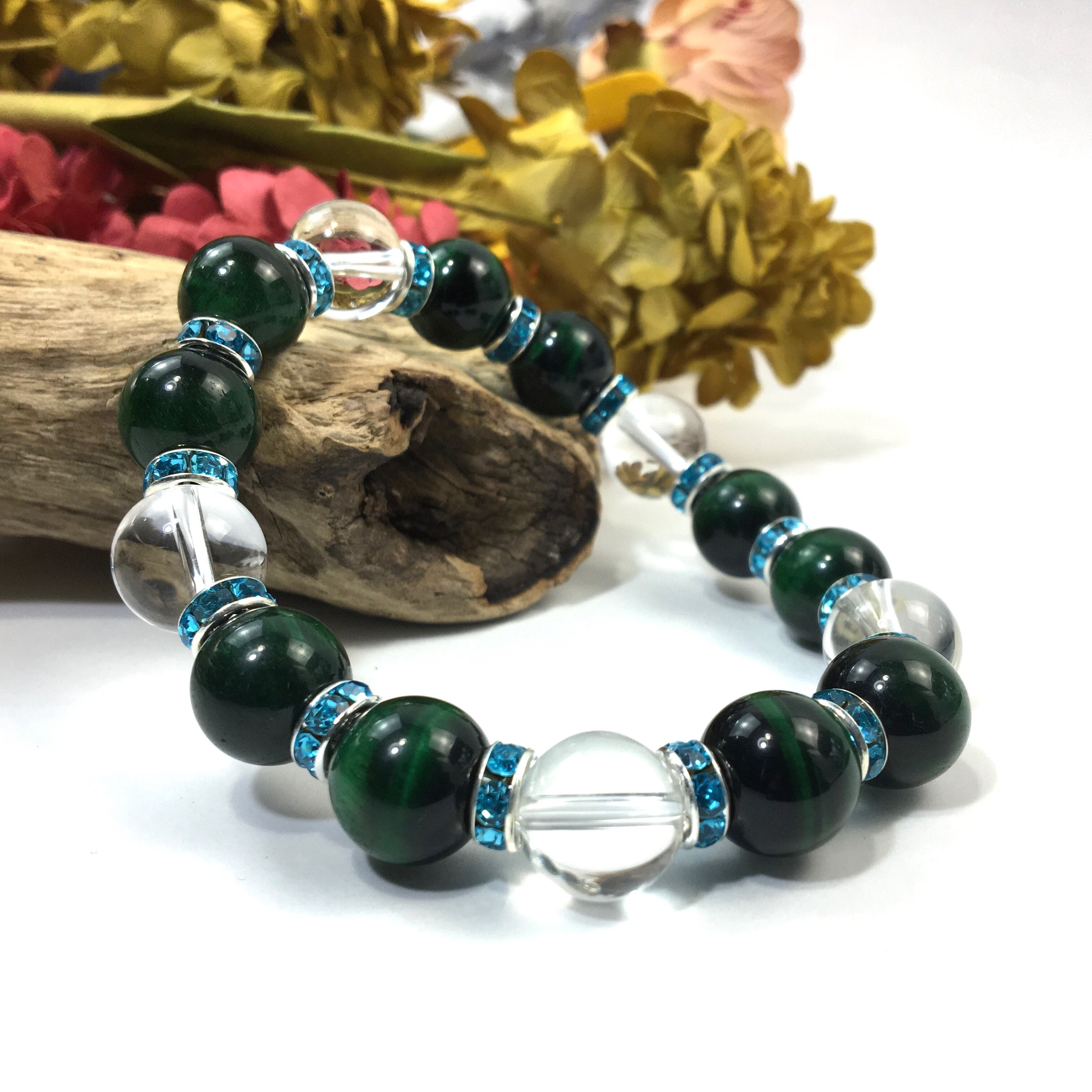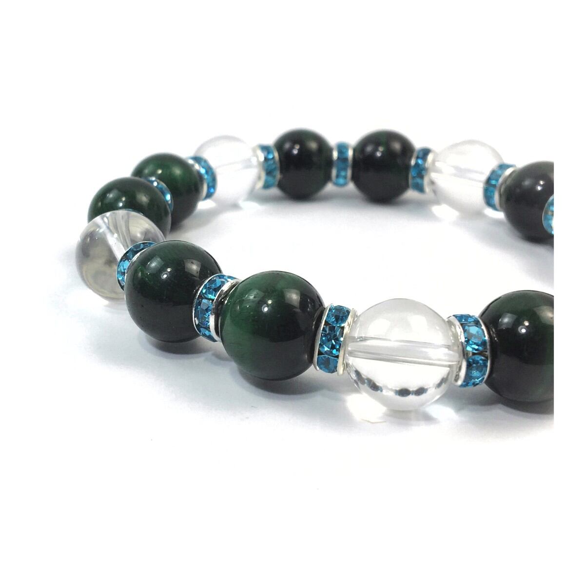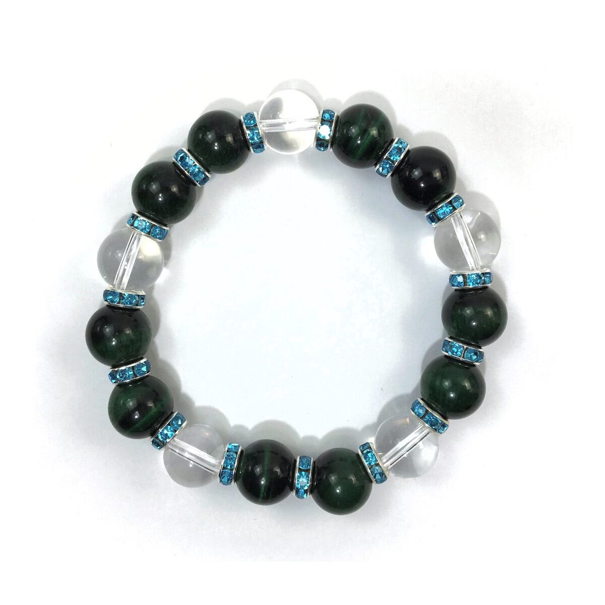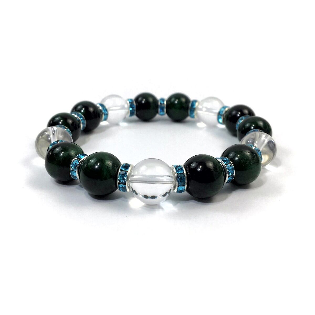 グリーンタイガーアイ&水晶 パワーストーン ブレスレット 12mm (ライトブルー)メンズ・レディース 男性・女性 数珠ブレス 開運 ☆