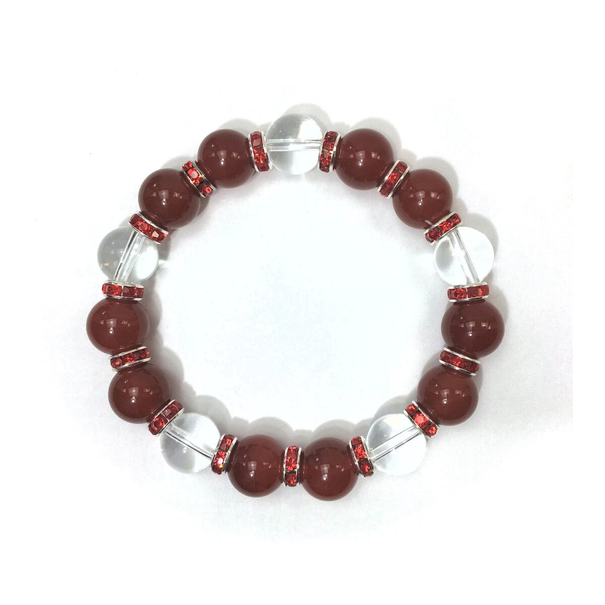 こちらは、赤瑪瑙と水晶を組み合わせたパワーストーンブレスレットです。間にはロンデルを挟み高級感あるデザインに仕上げております。石大きさは12mm玉を使用して内周約18cmです。気になる方は是非この機会にどうぞ。