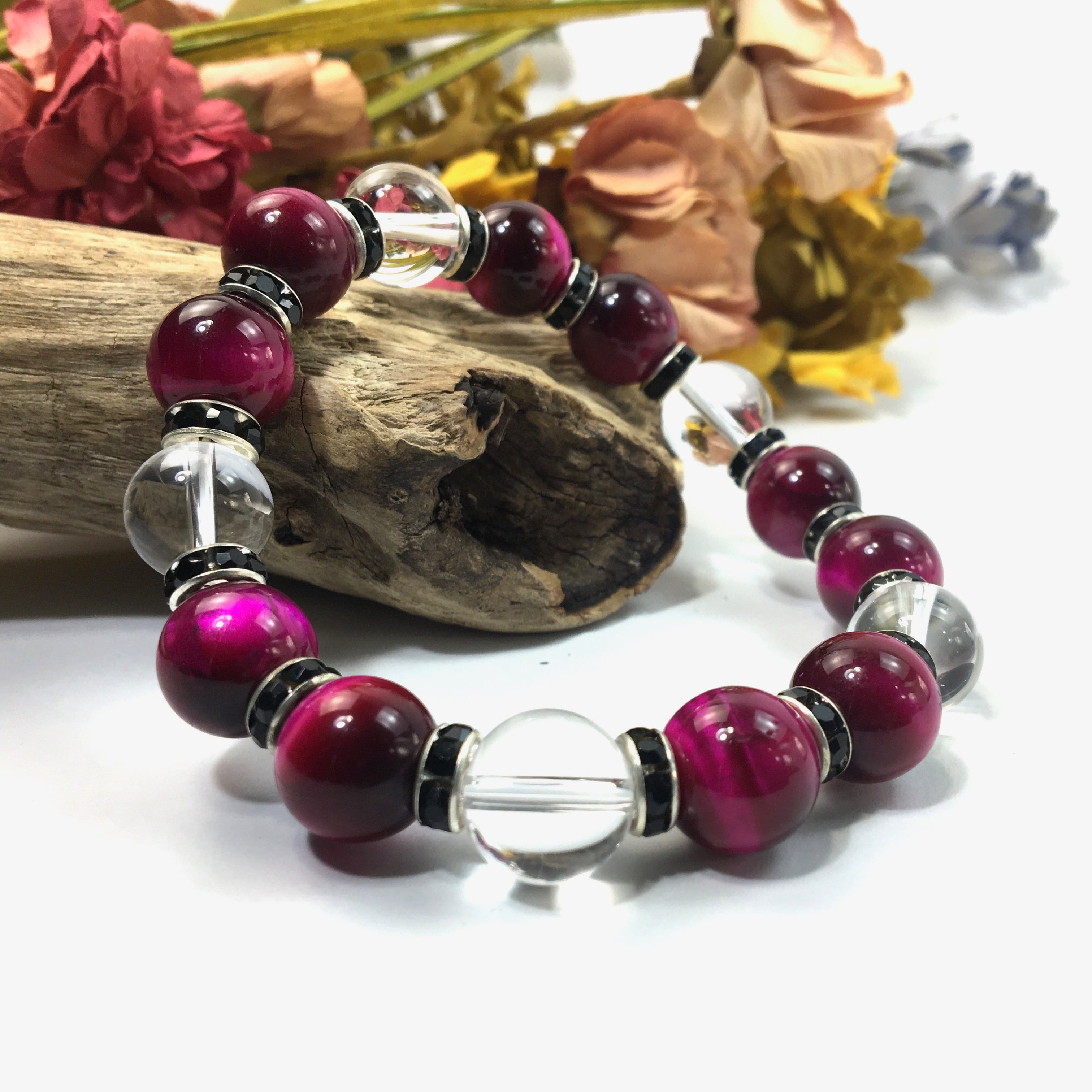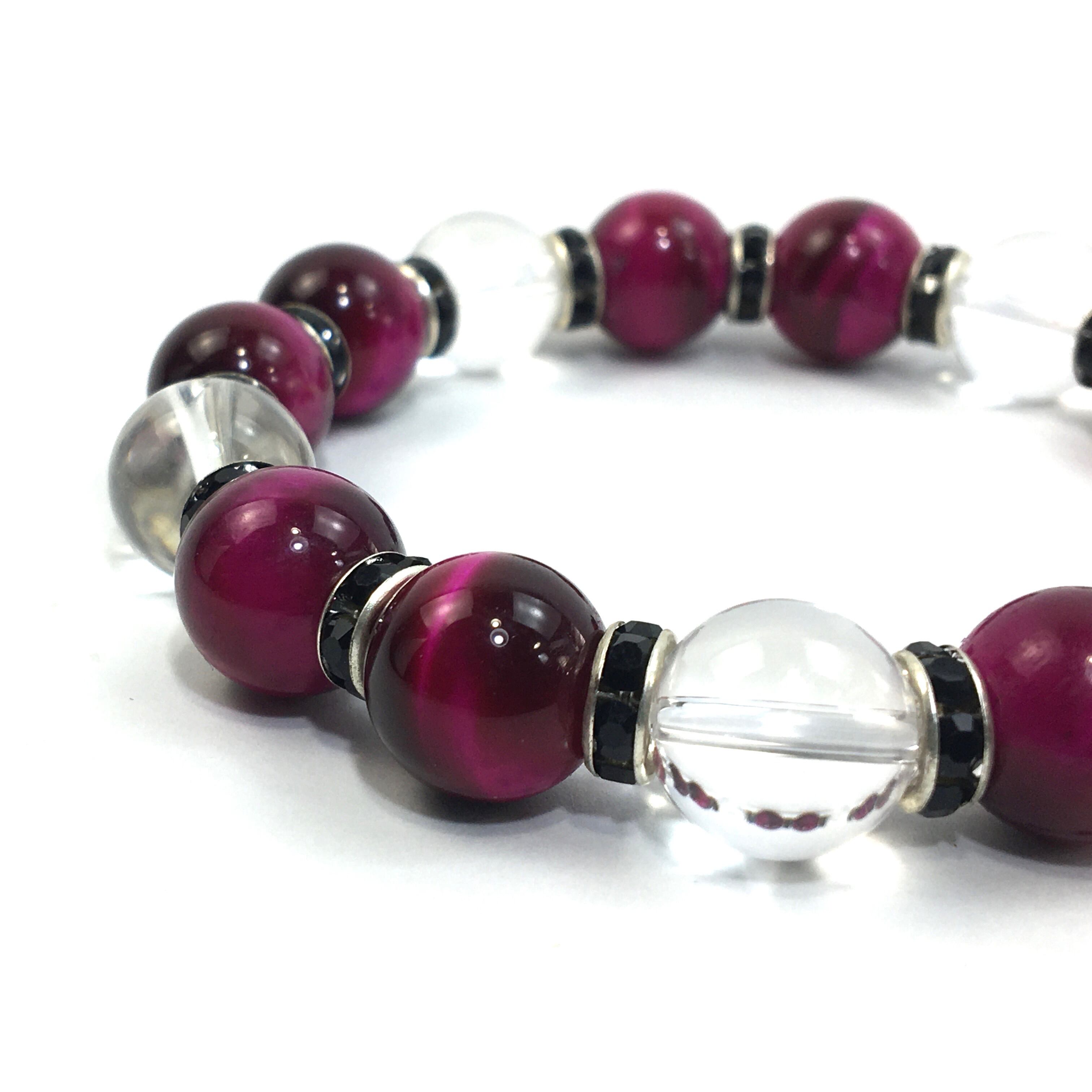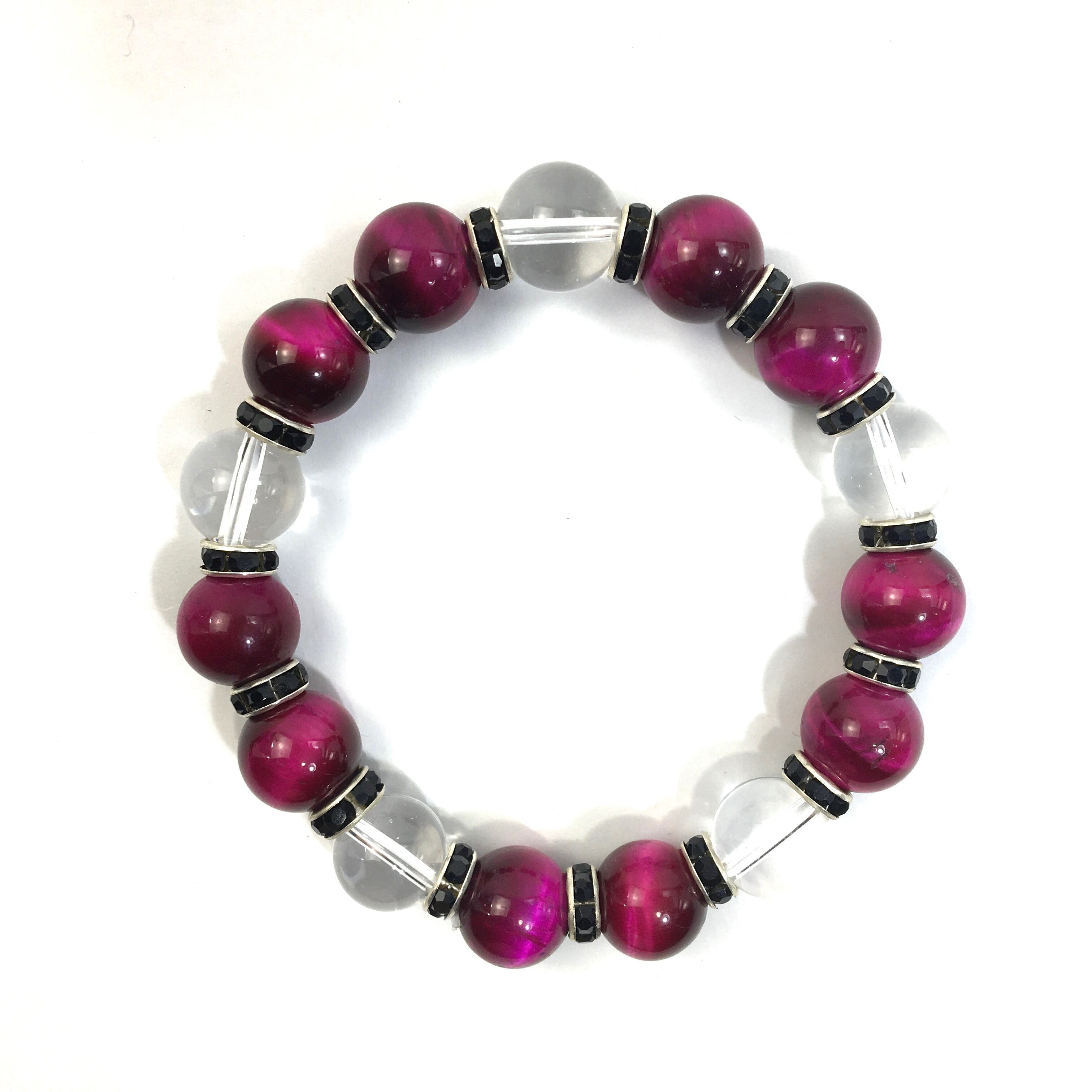 ピンクタイガーアイ&水晶 パワーストーン ブレスレット 12mm (ブラック)メンズ・レディース 男性・女性 数珠ブレス 開運 ☆