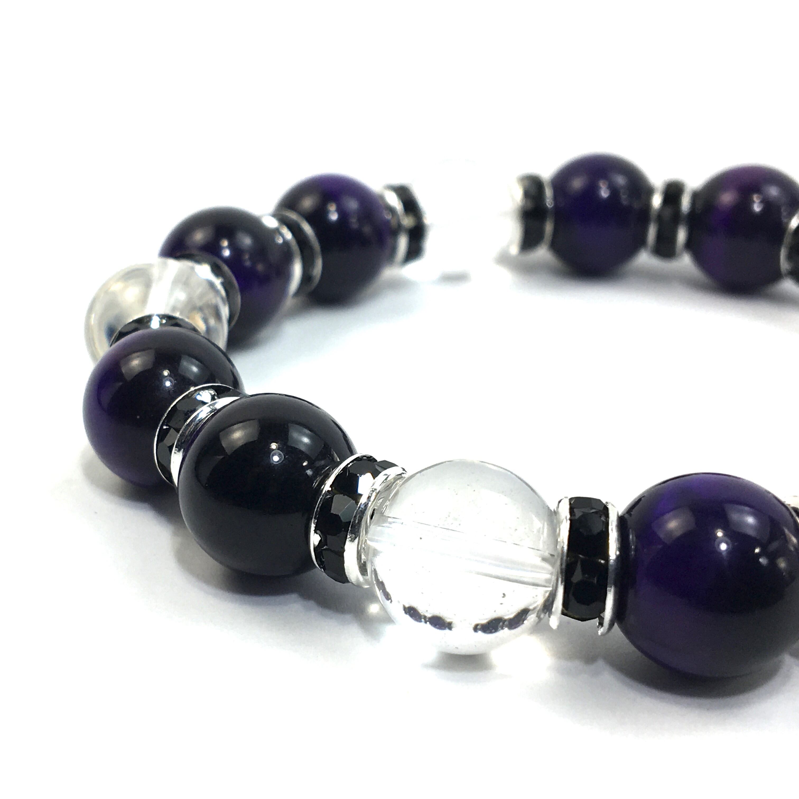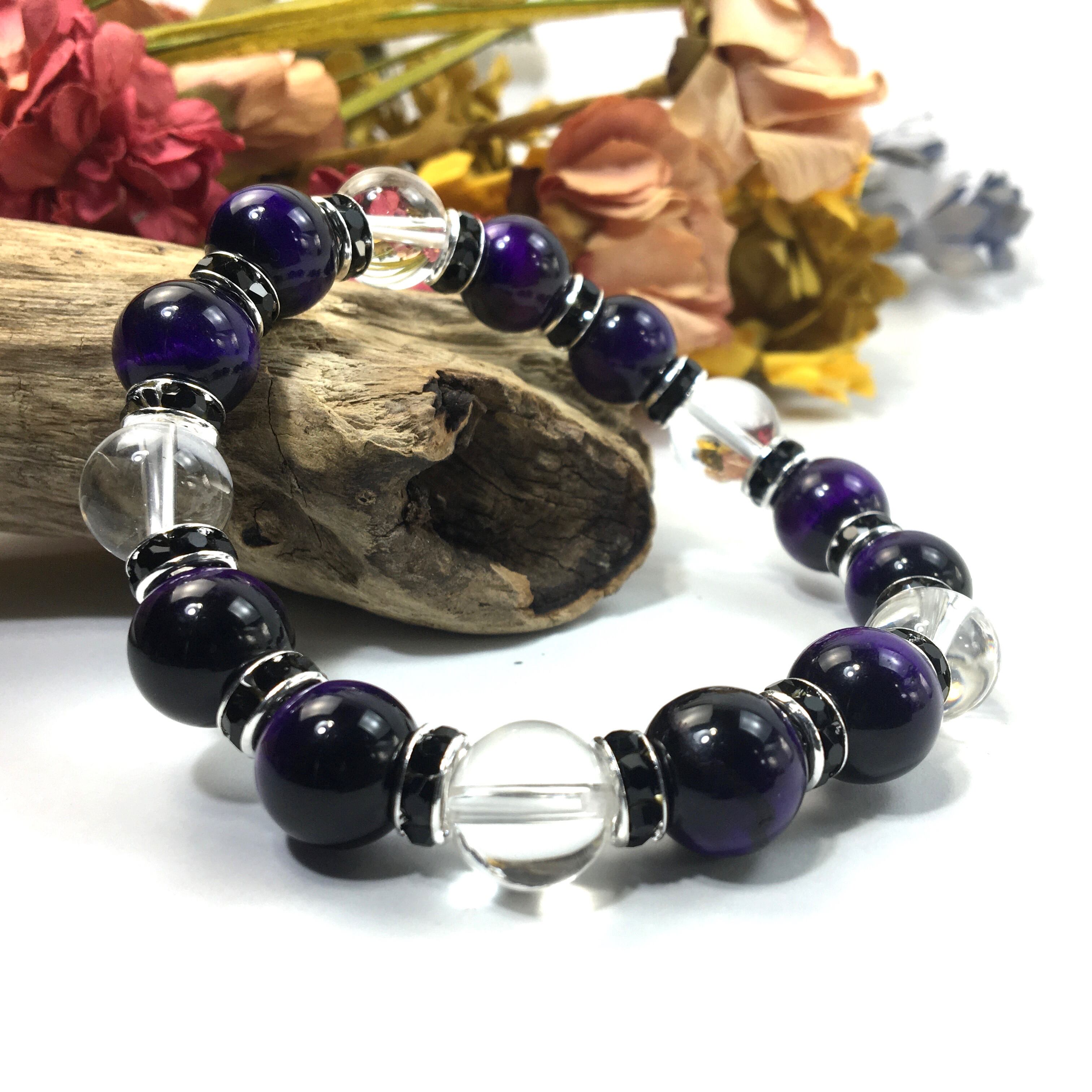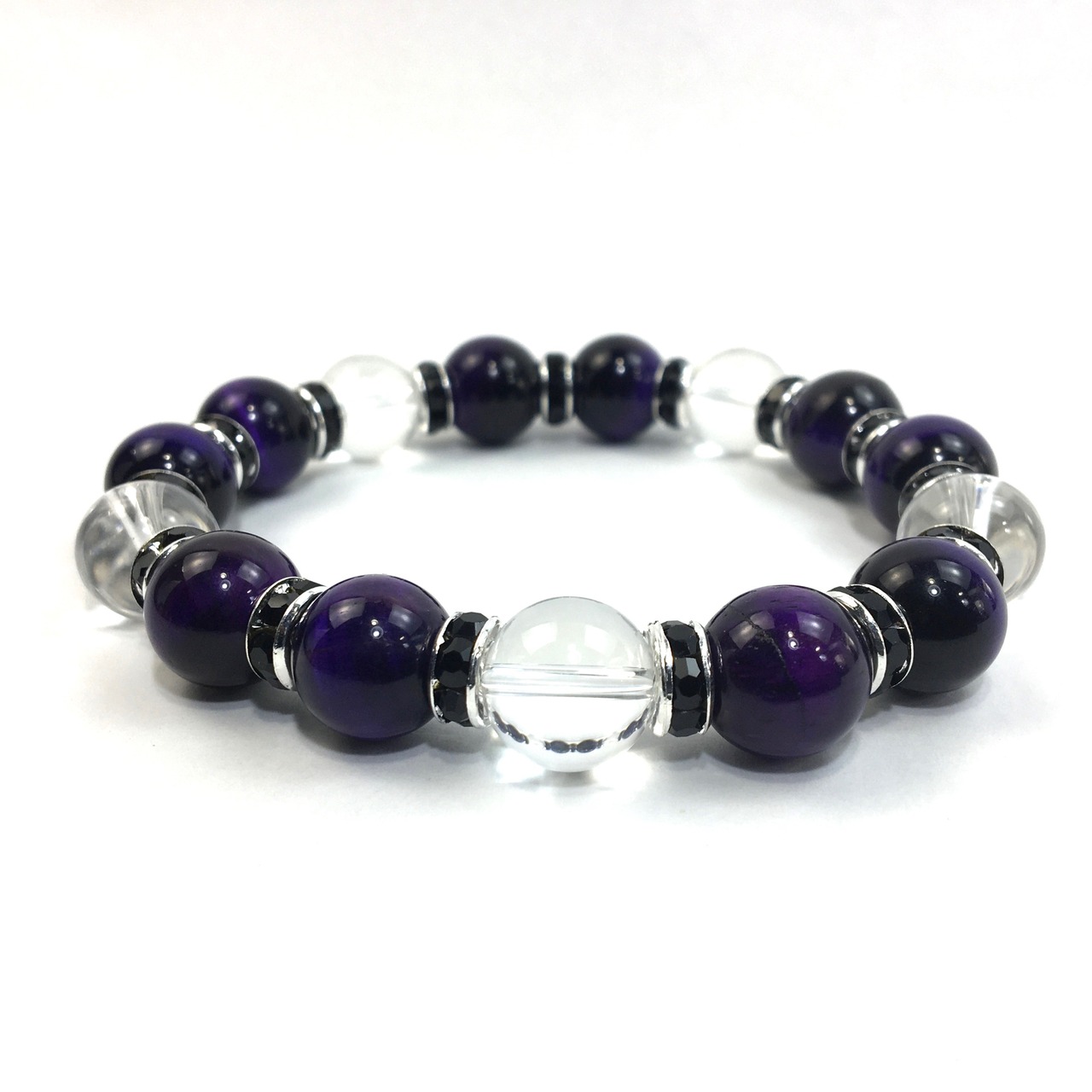 パープルタイガーアイ&水晶 パワーストーン ブレスレット 12mm (ブラック)メンズ・レディース 男性・女性 数珠ブレス 開運 ☆