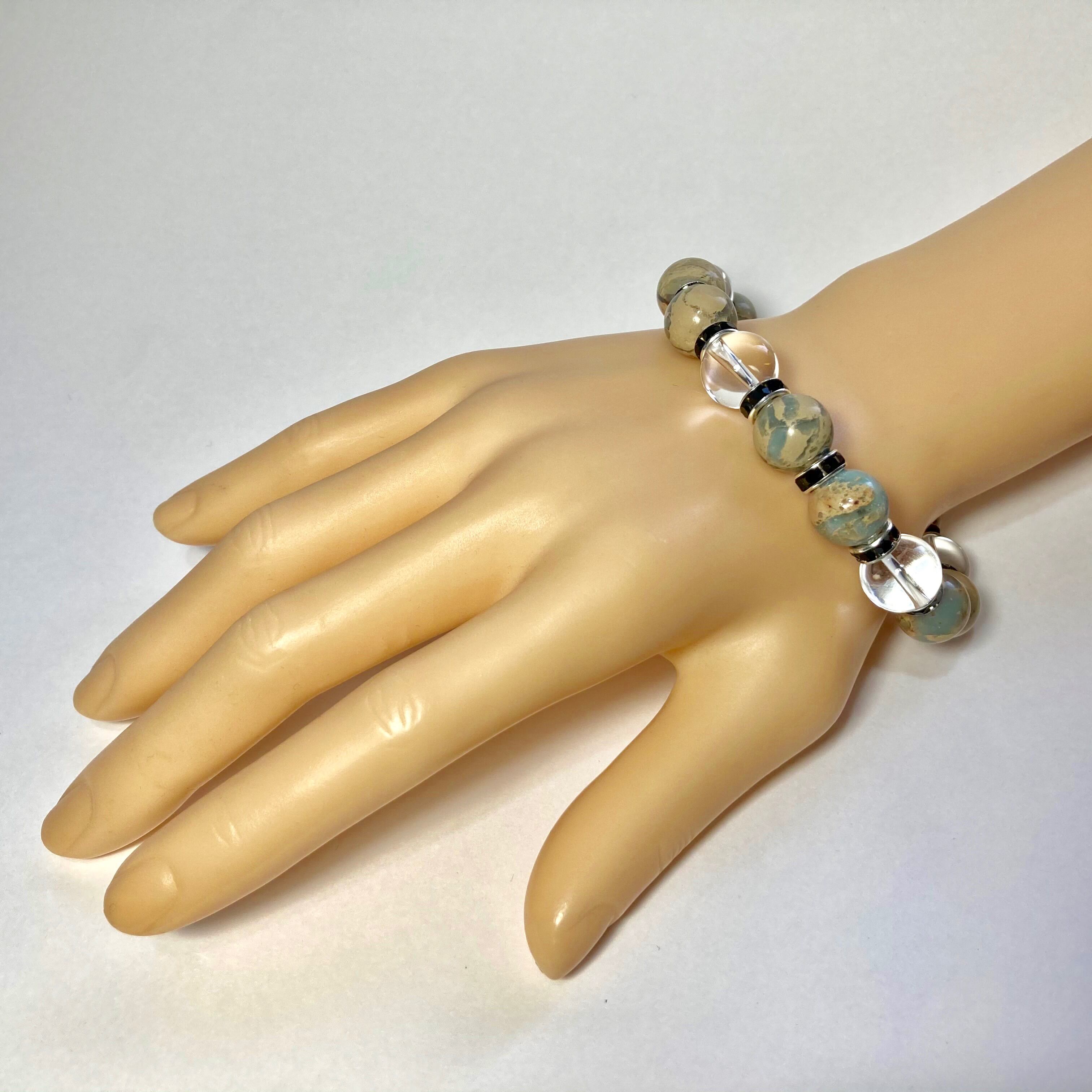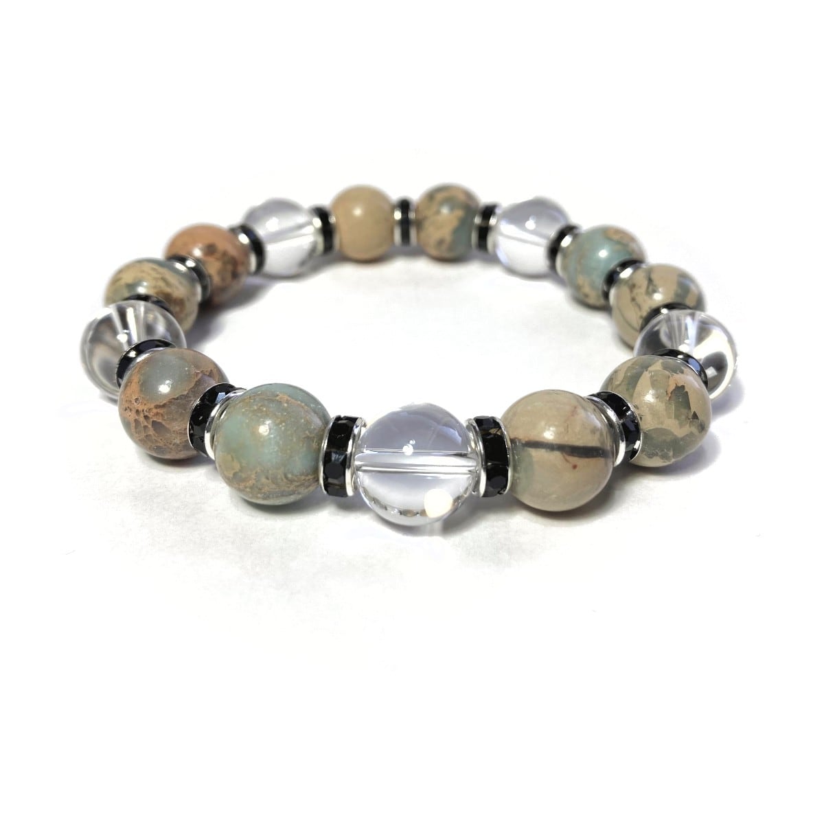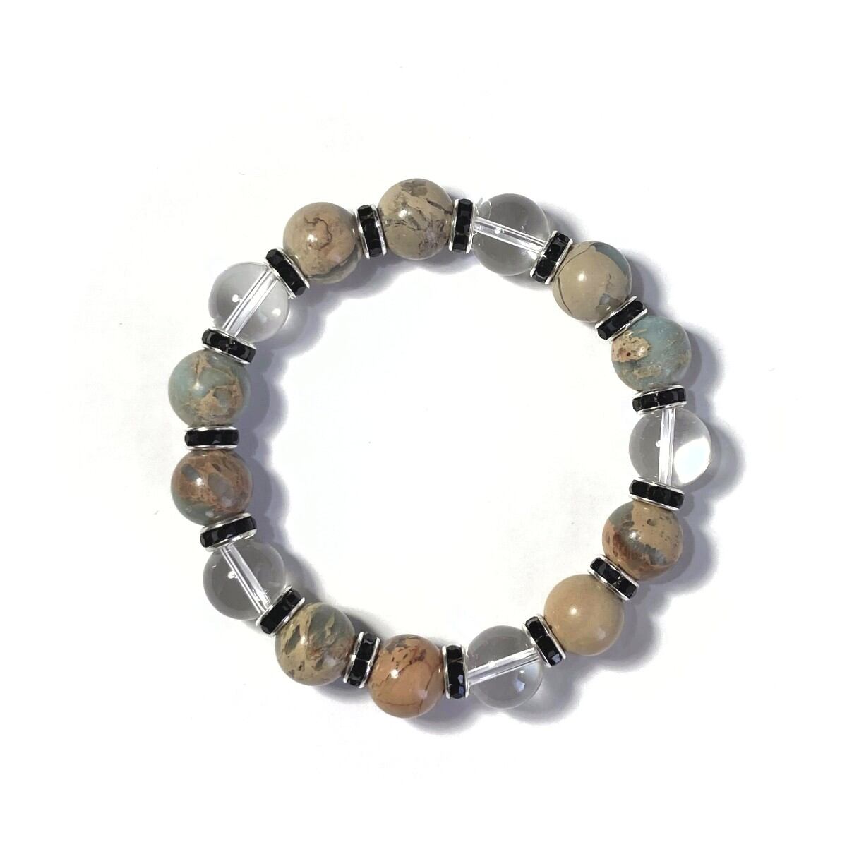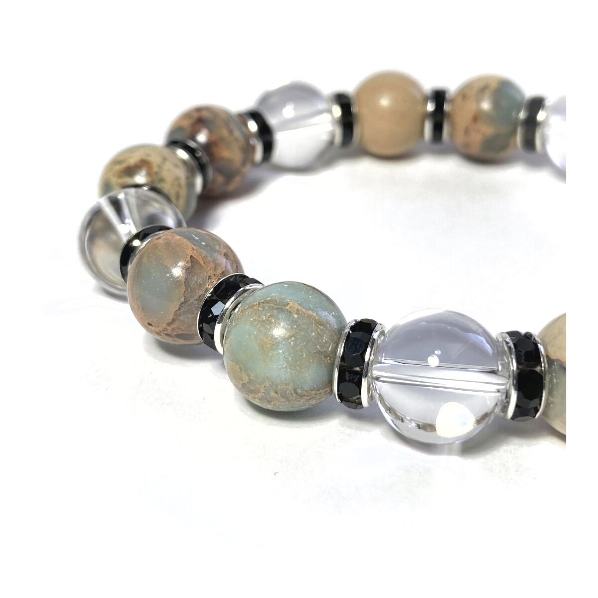 こちらは、インプレッションストーンと水晶を組み合わせたパワーストーンブレスレットです。間にはロンデルを挟み高級感あるデザインに仕上げております。石大きさは12mm玉を使用して内径約18cmです。気になる方は是非この機会にどうぞ。
