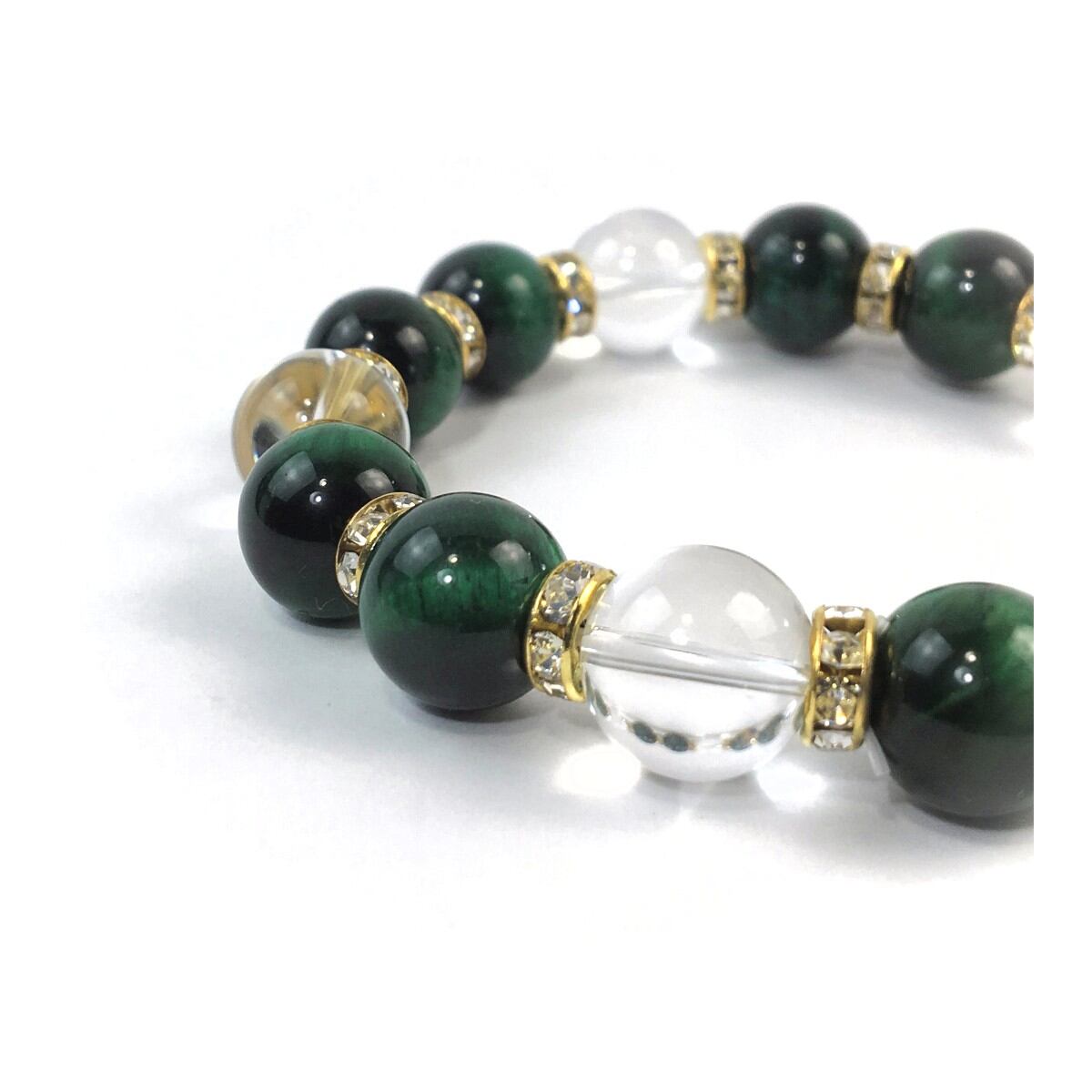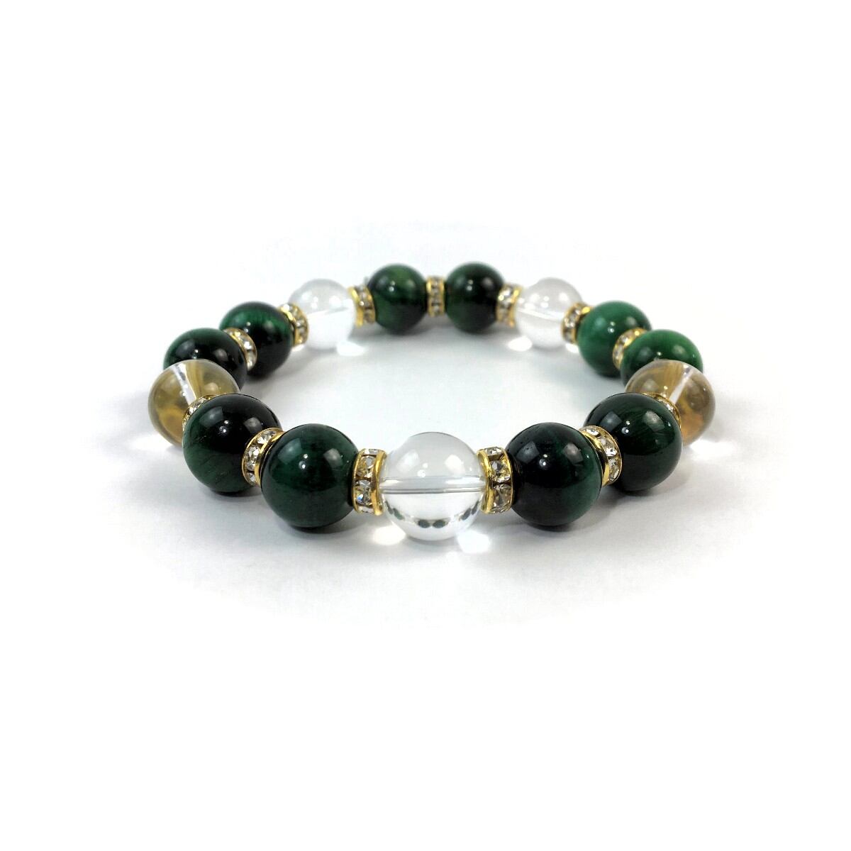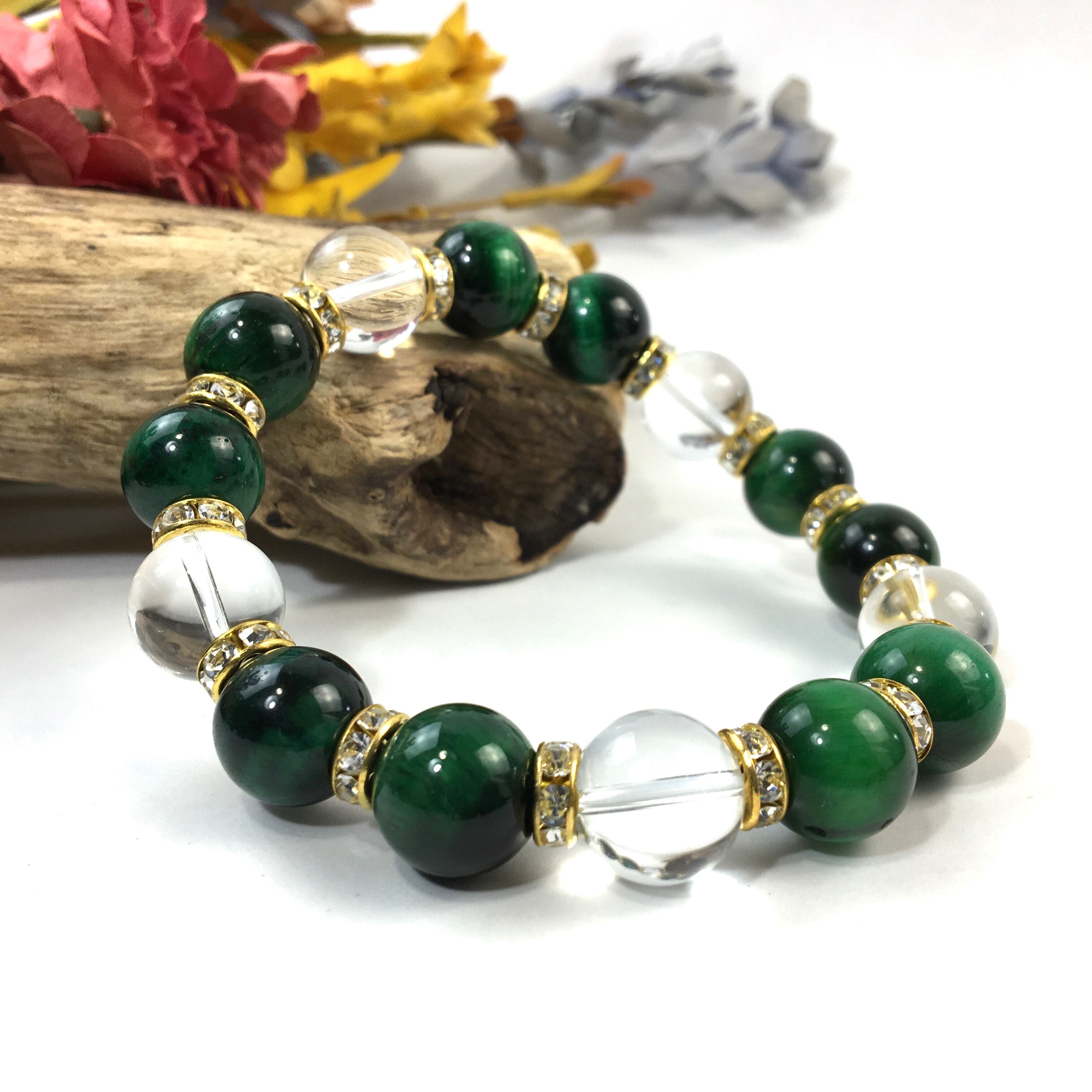 グリーンタイガーアイ&水晶 パワーストーン ブレスレット 12mm (ゴールド)メンズ・レディース 男性・女性 数珠ブレス 開運 ☆