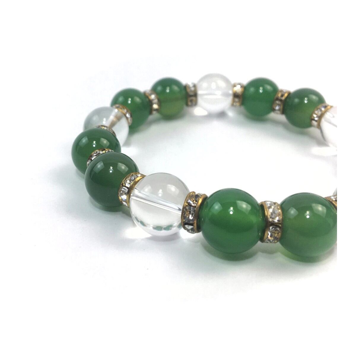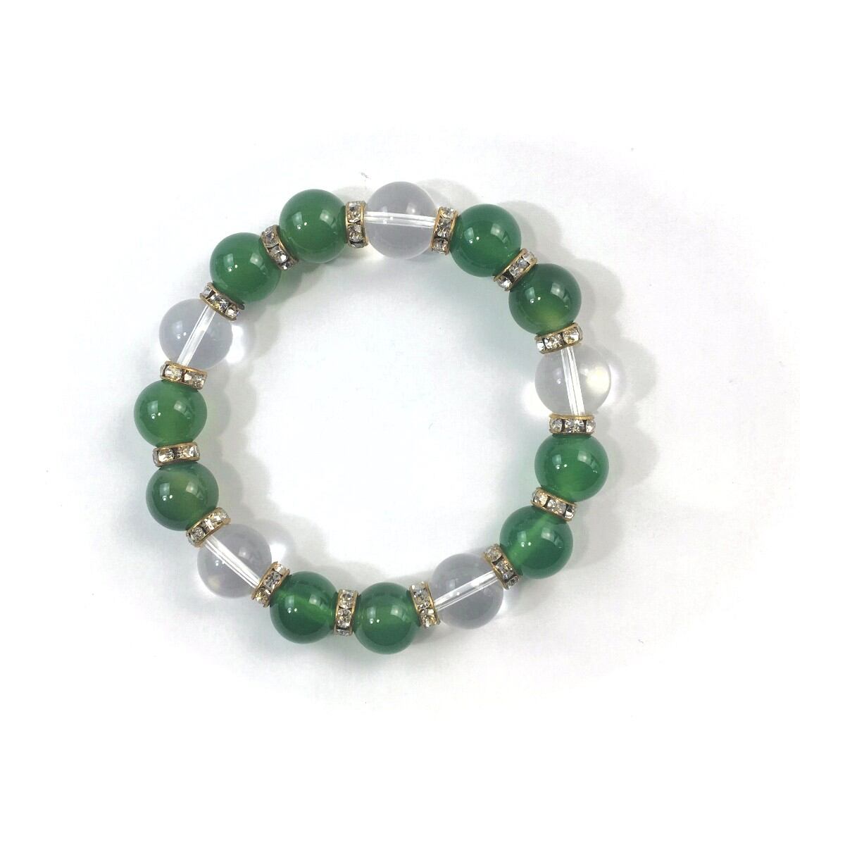 こちらは、緑瑪瑙と水晶を組み合わせたパワーストーンブレスレットです。間にはロンデルを挟み高級感あるデザインに仕上げております。石大きさは12mm玉を使用して内周約18cmです。気になる方は是非この機会にどうぞ。