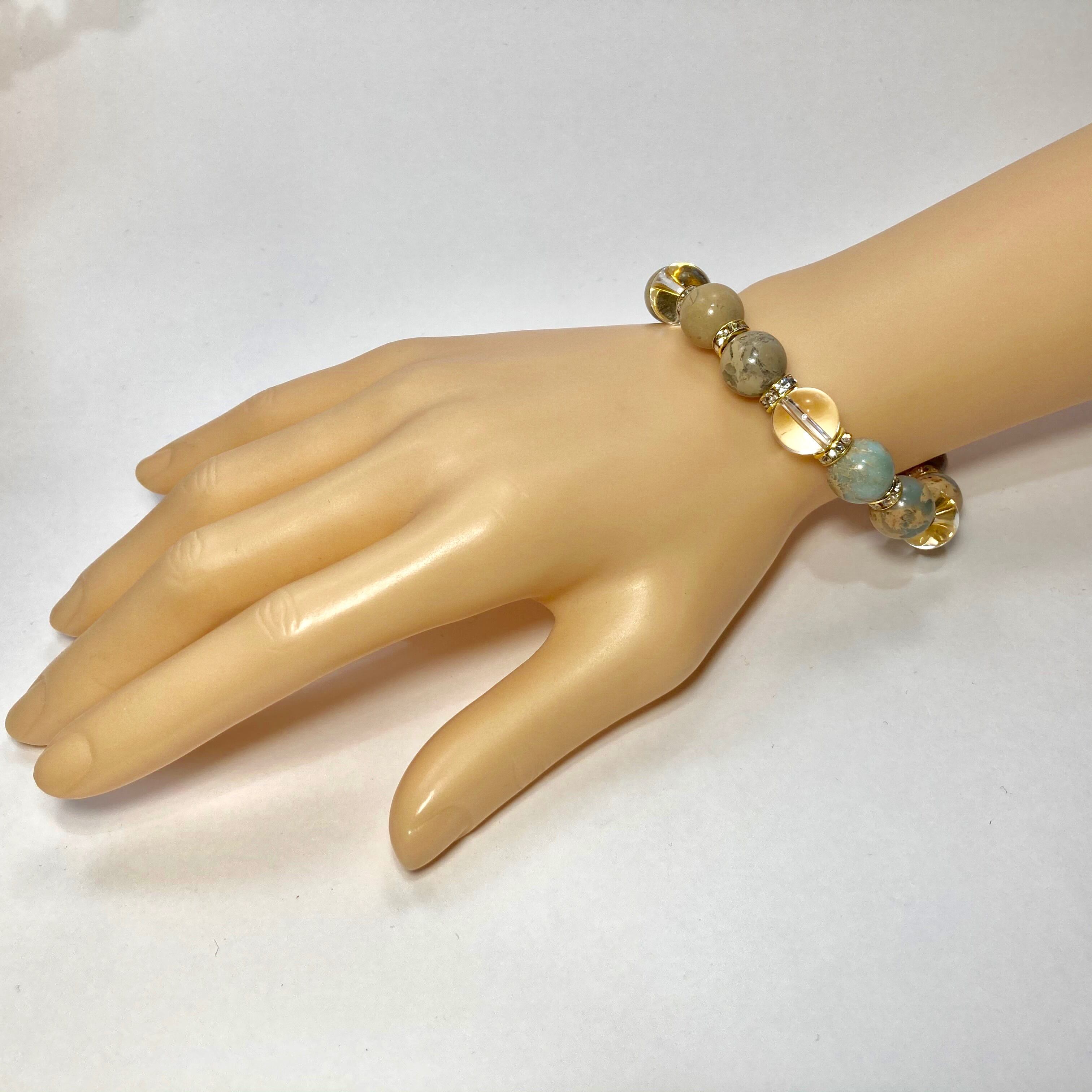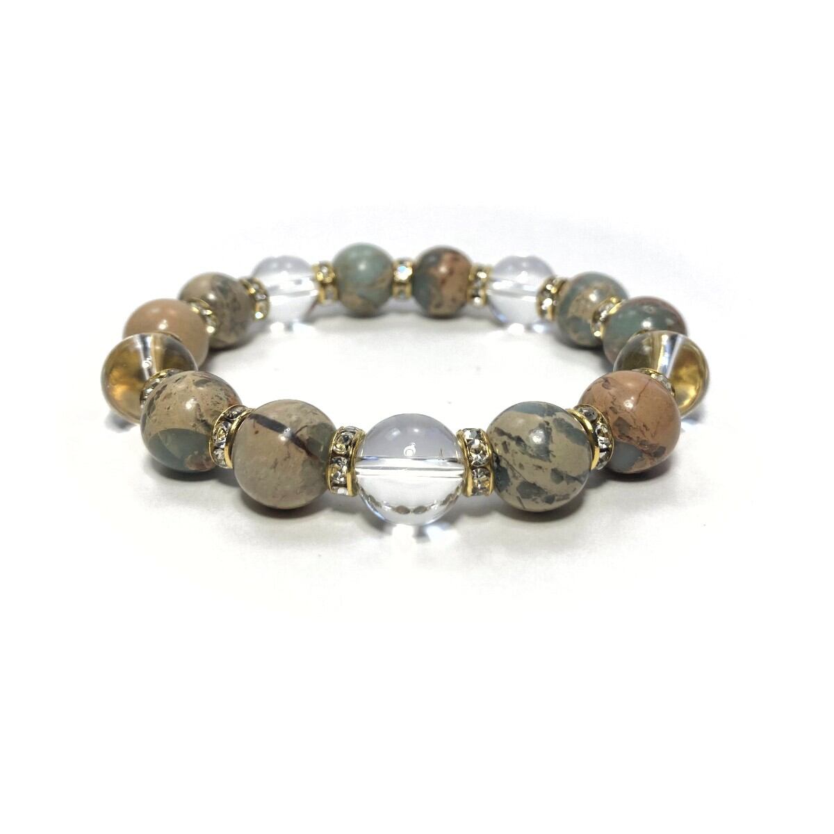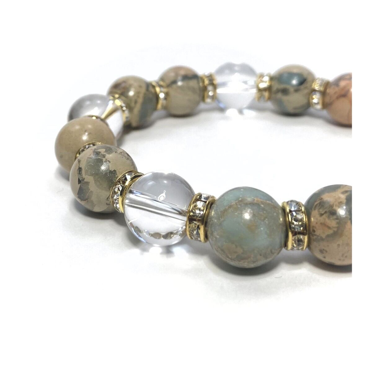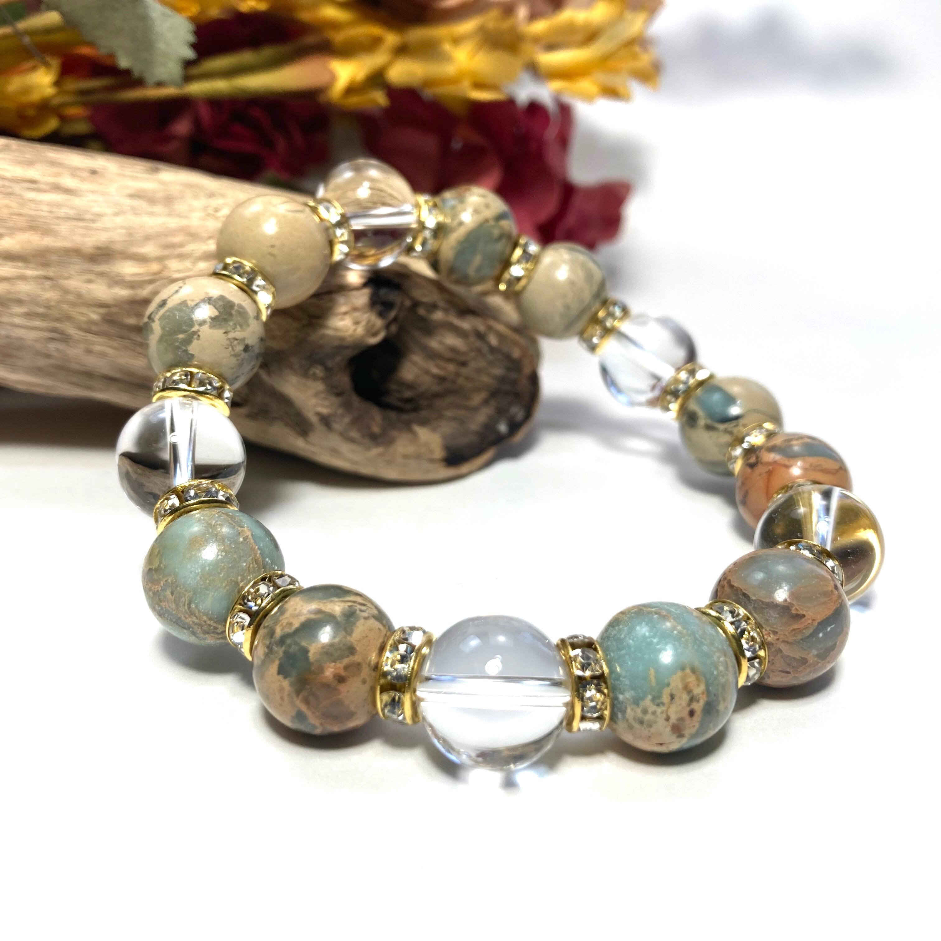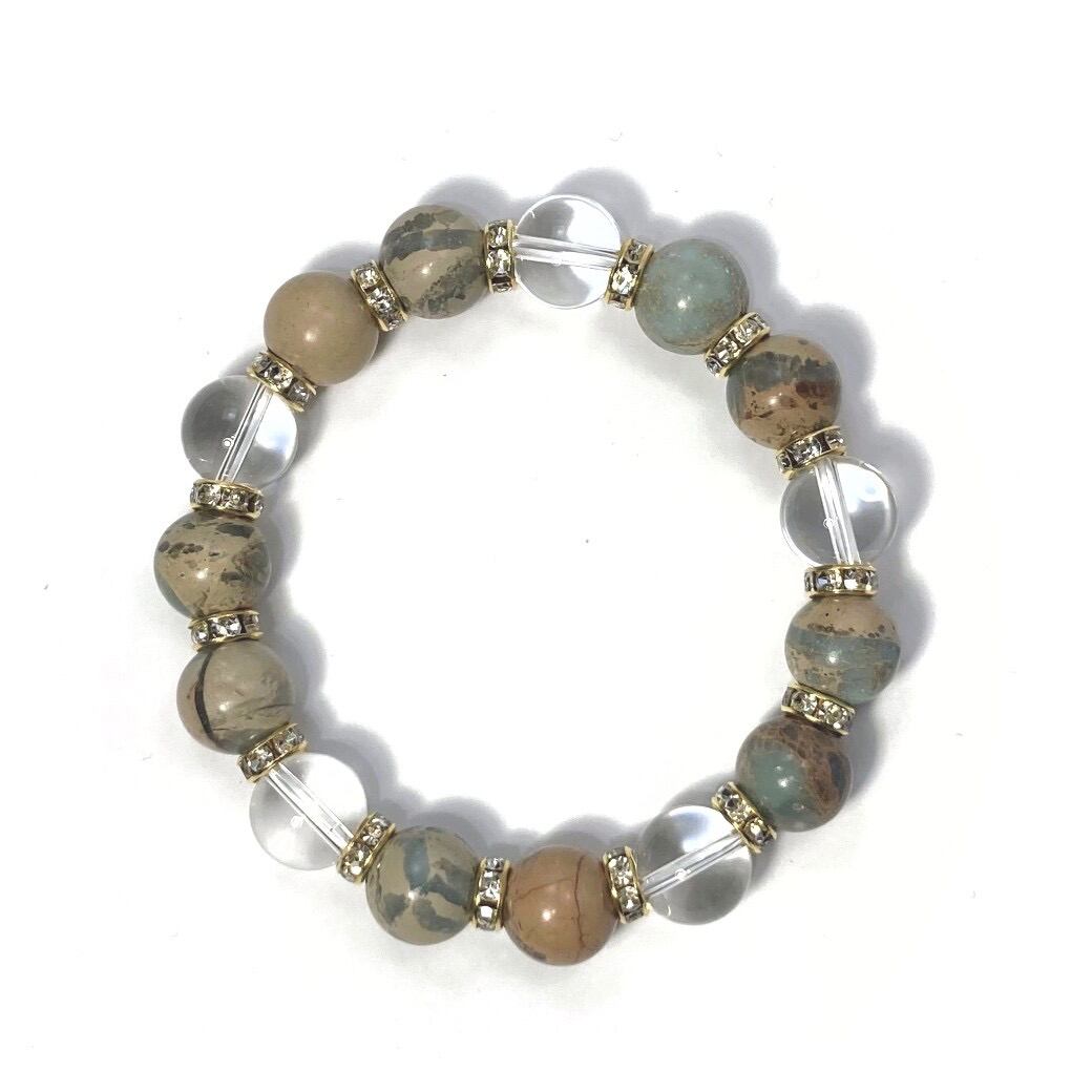こちらは、インプレッションストーンと水晶を組み合わせたパワーストーンブレスレットです。間にはロンデルを挟み高級感あるデザインに仕上げております。石大きさは12mm玉を使用して内周約18cmです。気になる方は是非この機会にどうぞ。