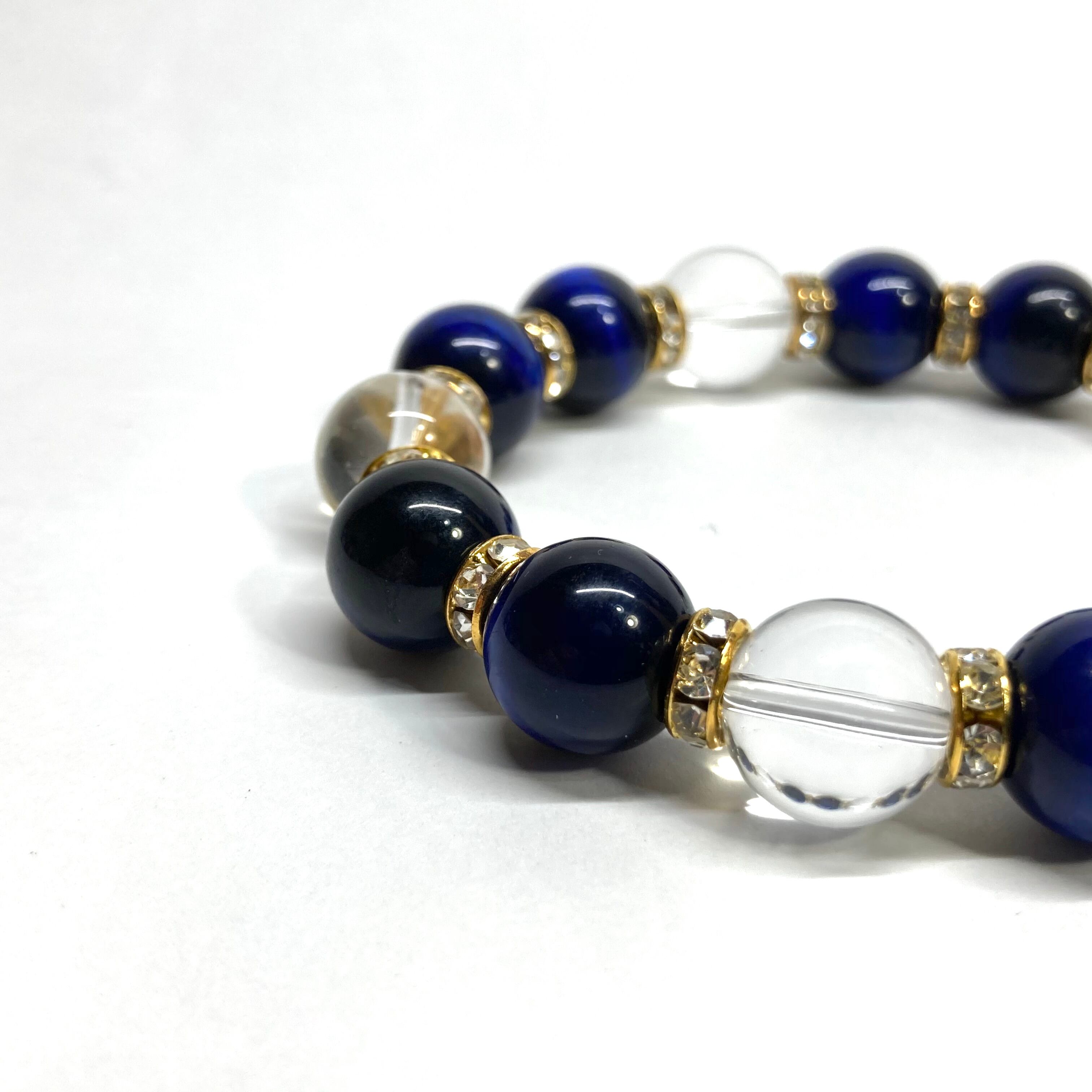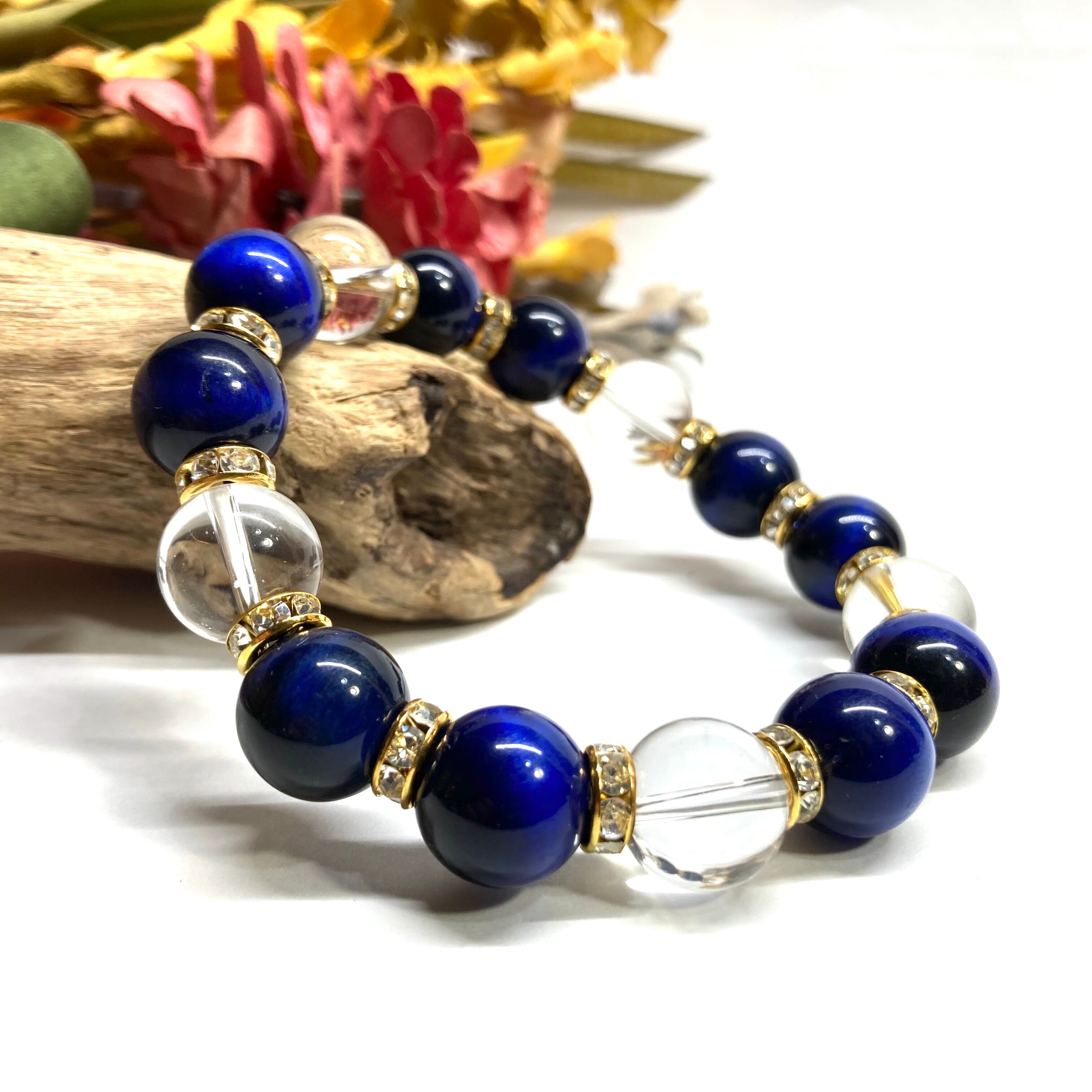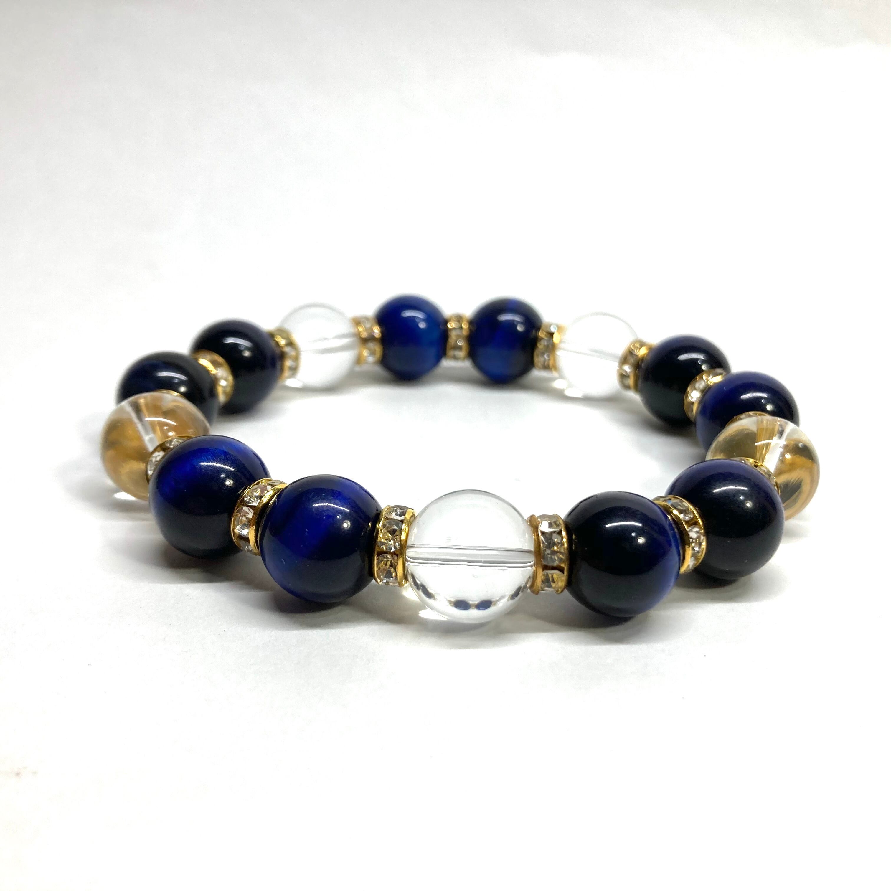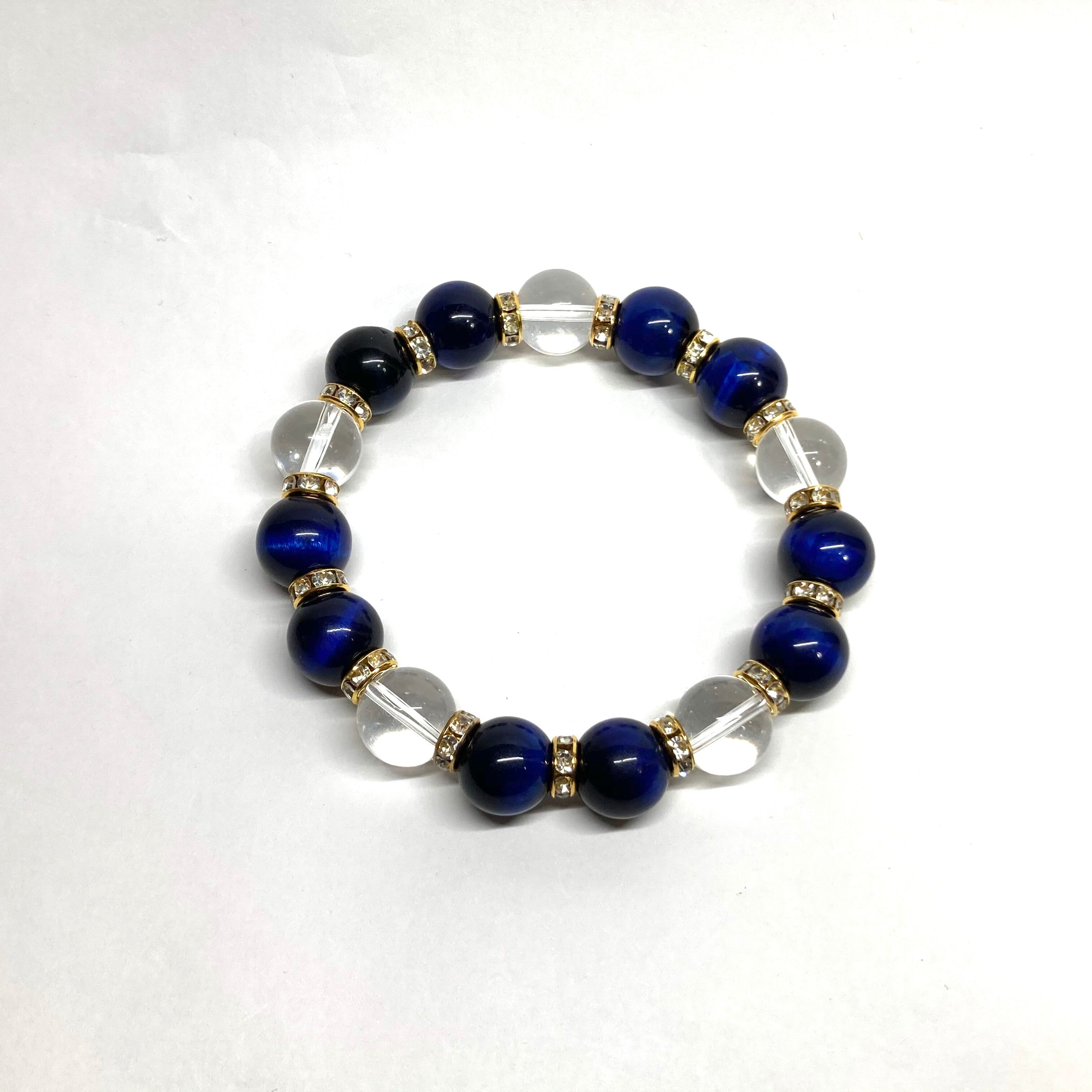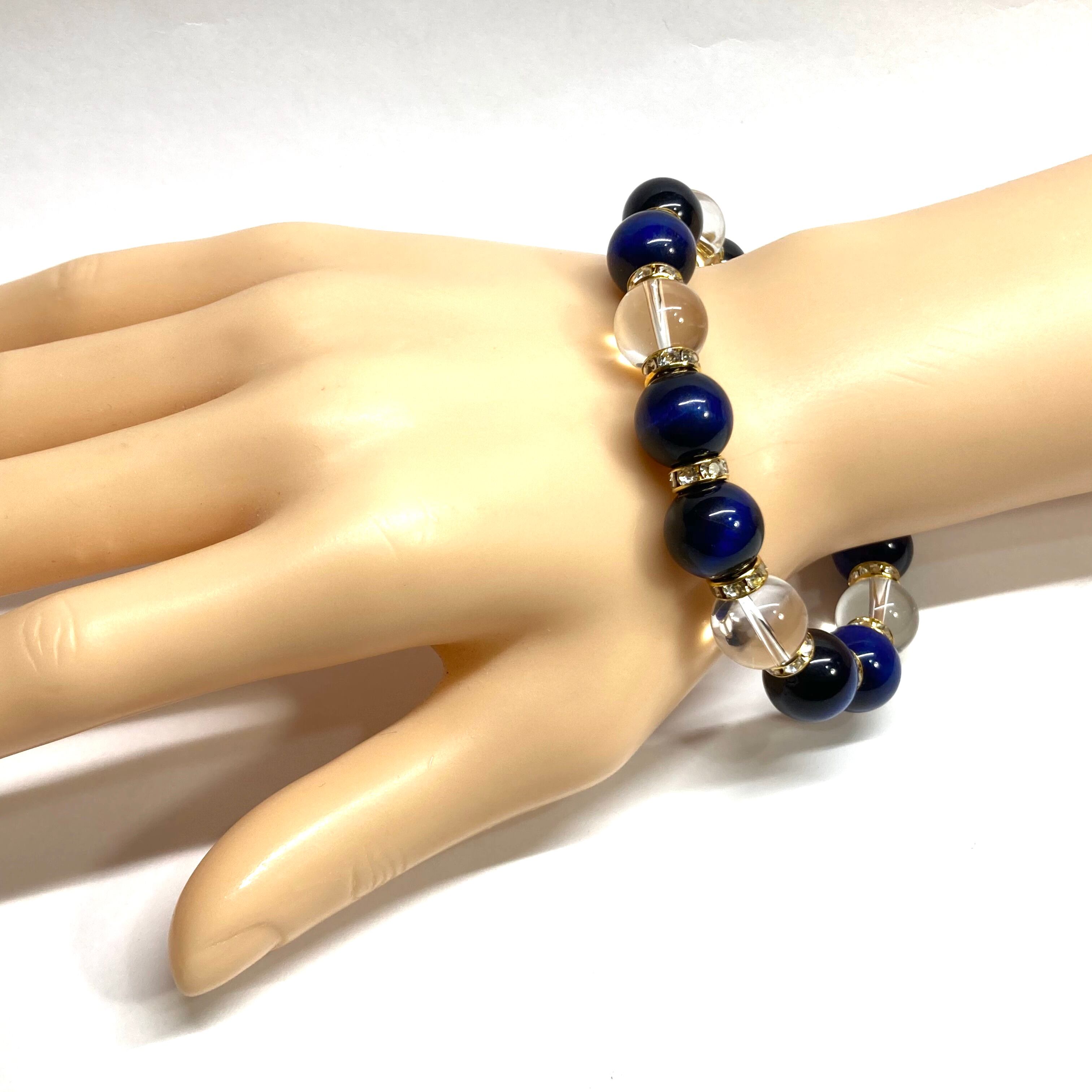 こちらは、ブルータイガーアイと水晶を組み合わせたパワーストーンブレスレットです。間にはロンデルを挟み高級感あるデザインに仕上げております。程よくインパクトがある12mm玉を使用して内周約18cmです。数に限りがございますので気になる方はお早めにどうぞ。