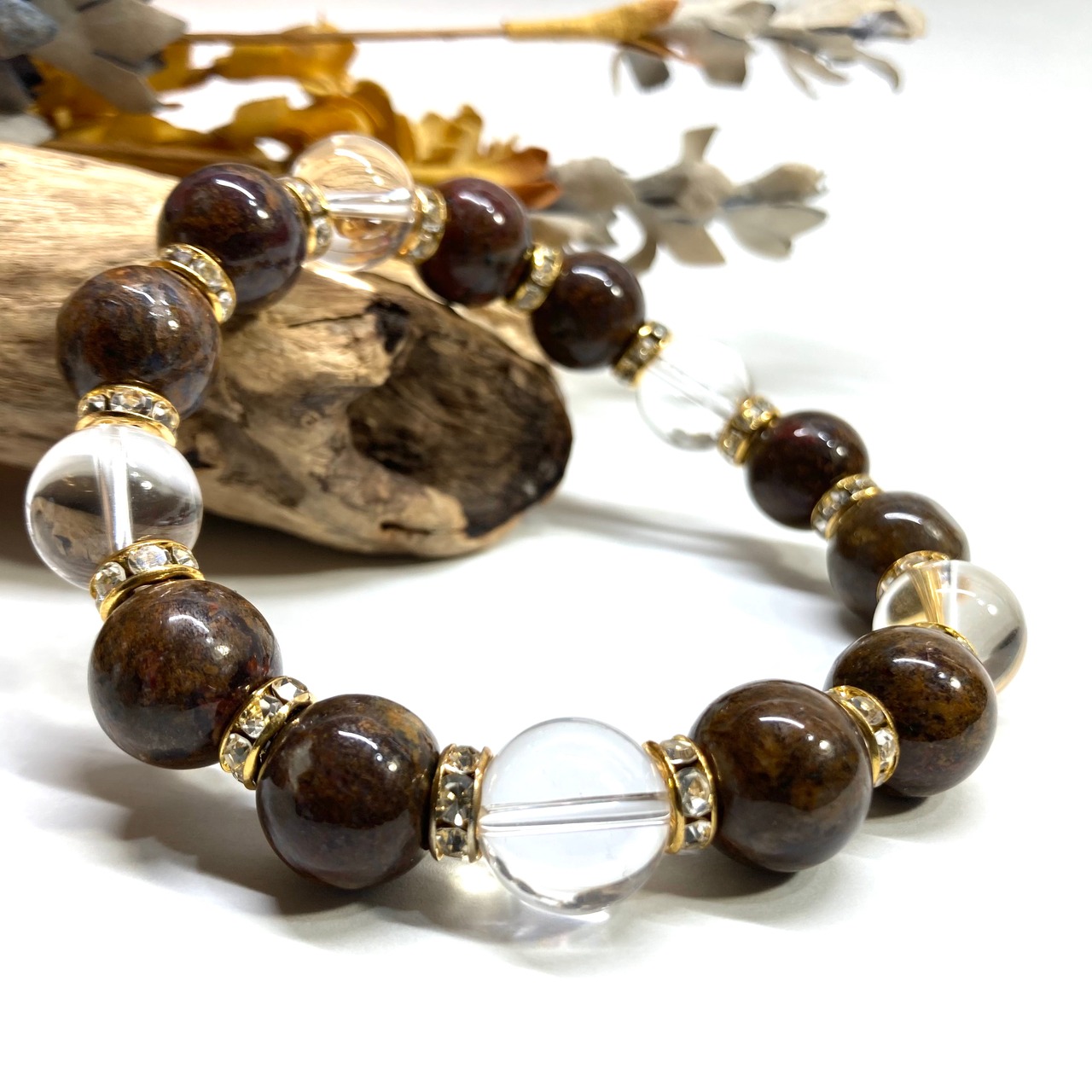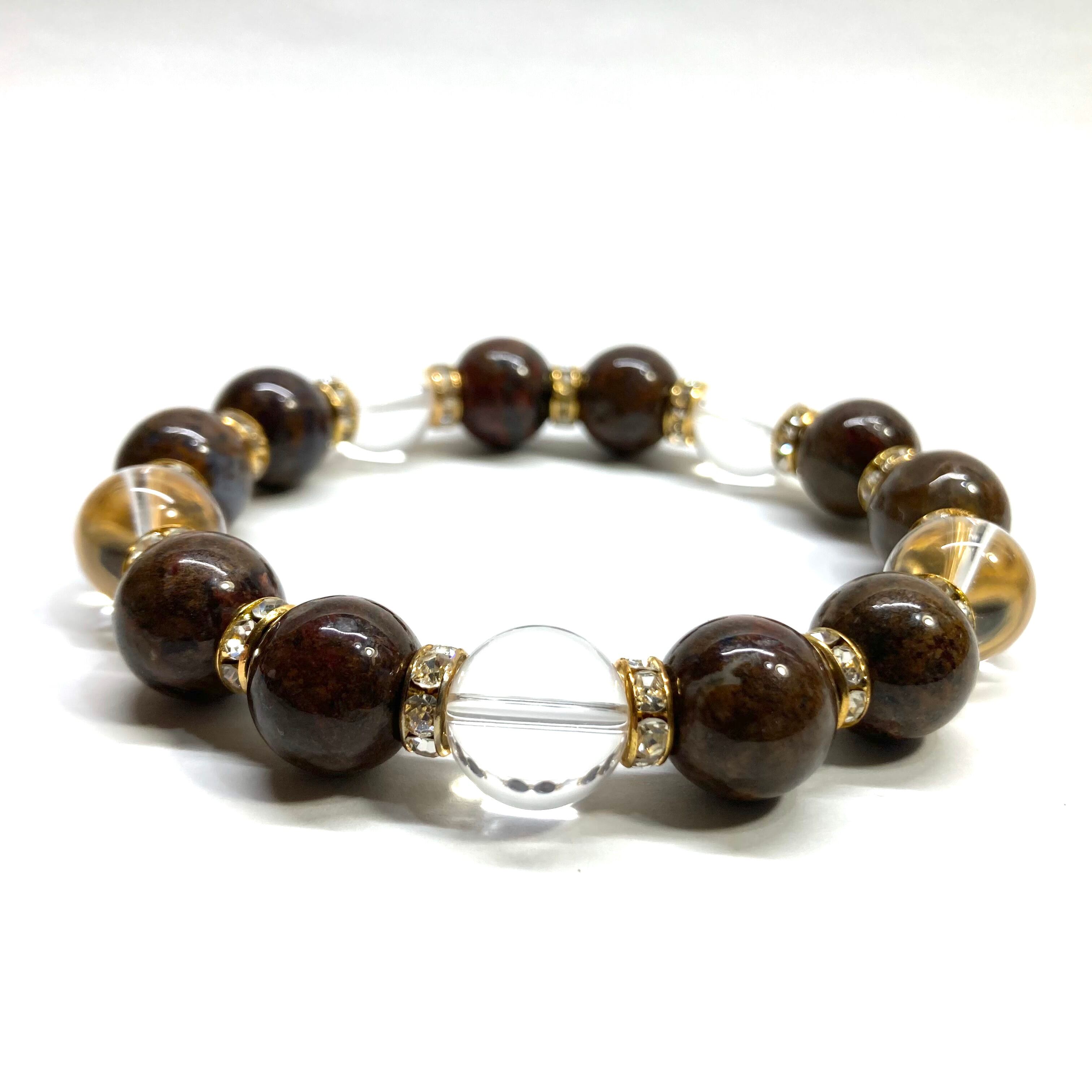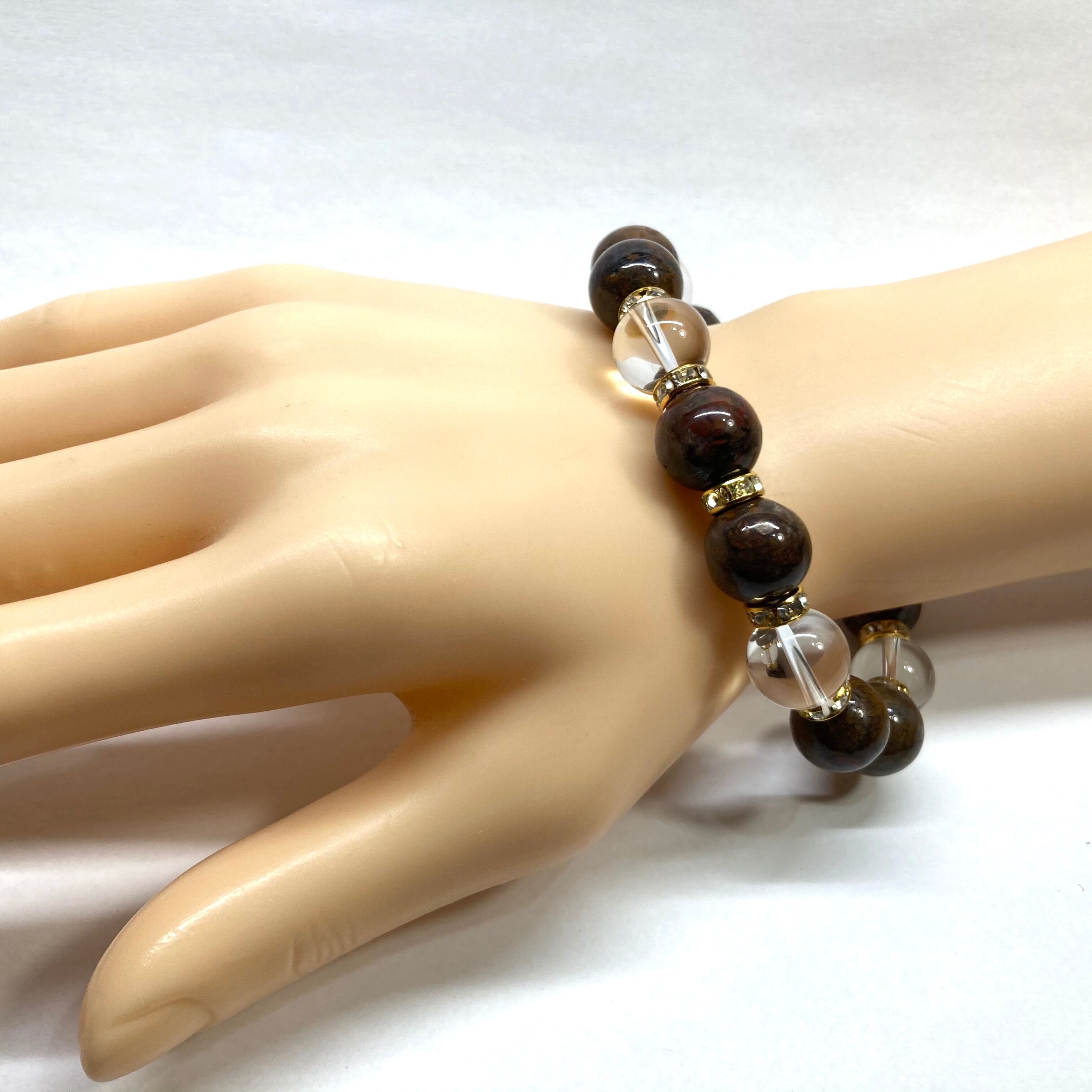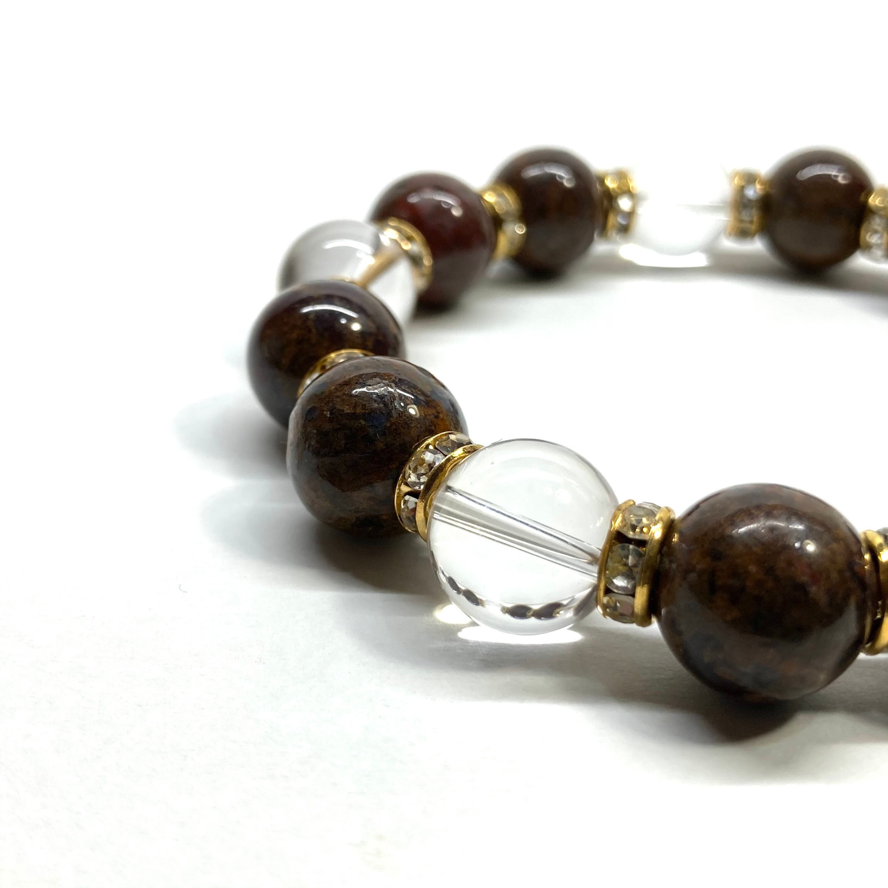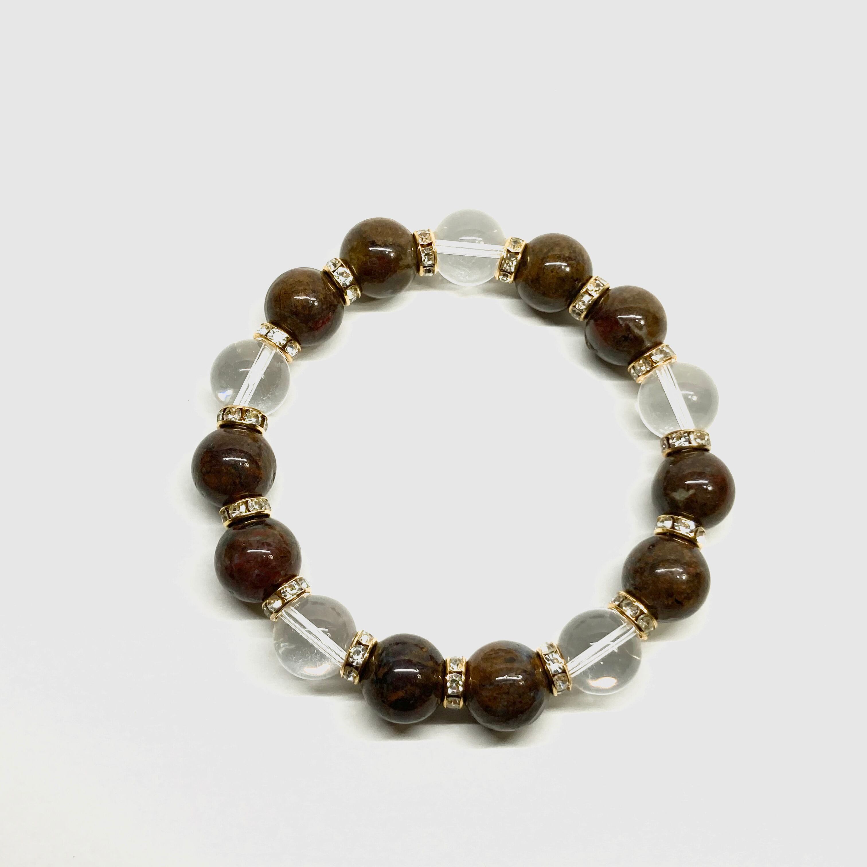 こちらは、10mm玉のピーターサイトと水晶を組み合わせたパワーストーンブレスレットです。間にはロンデルを挟み高級感あるデザインに仕上げております。石大きさは12mm玉を使用して内周約18cmです。数に限りがございますので気になる方はお早めにどうぞ。