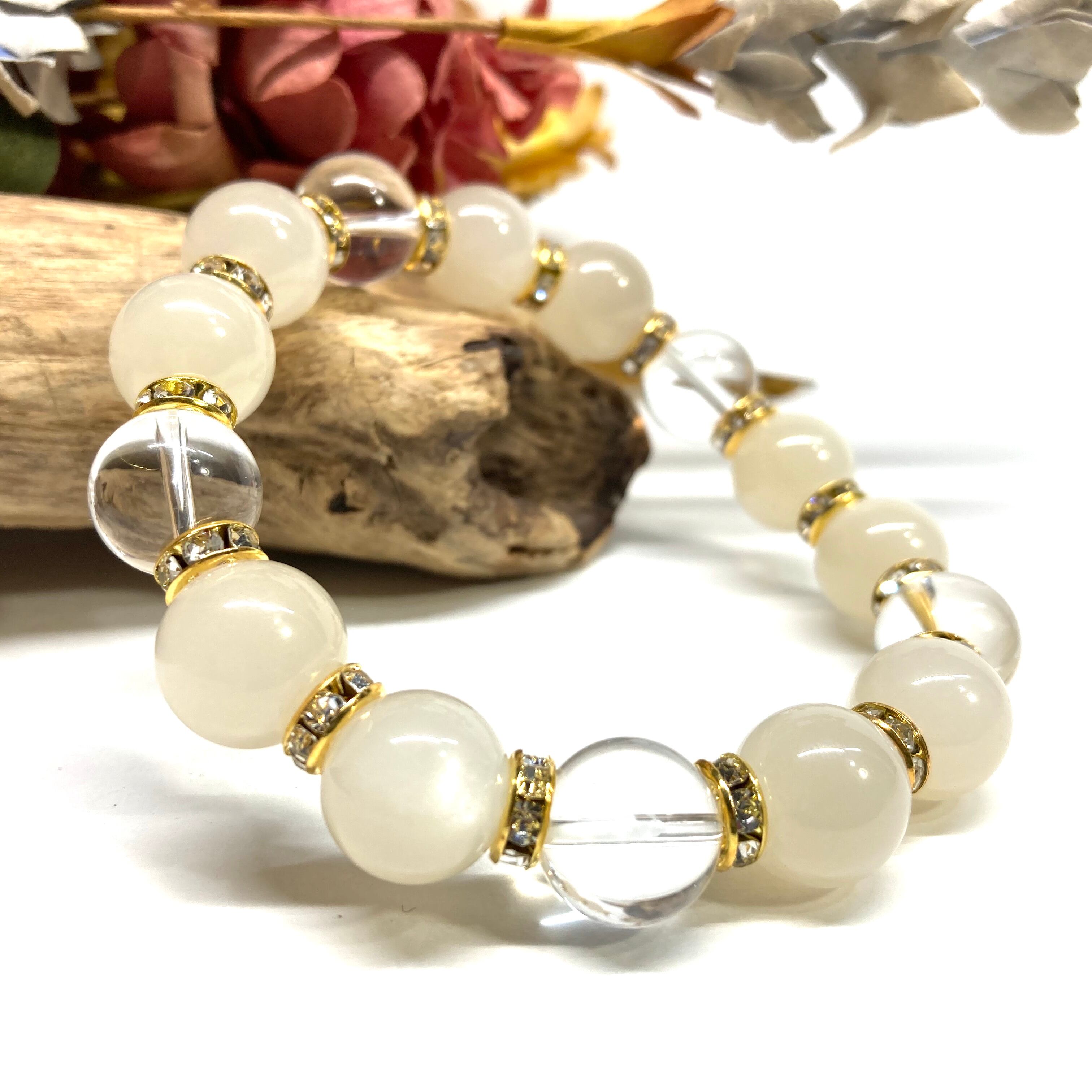 こちらは、12mm玉のムーンストーンと水晶を組み合わせたパワーストーンブレスレットです。間にはロンデルを挟み高級感あるデザインに仕上げております。石大きさは12mm玉を使用して内周約18cmです。気になる方は是非この機会にどうぞ。