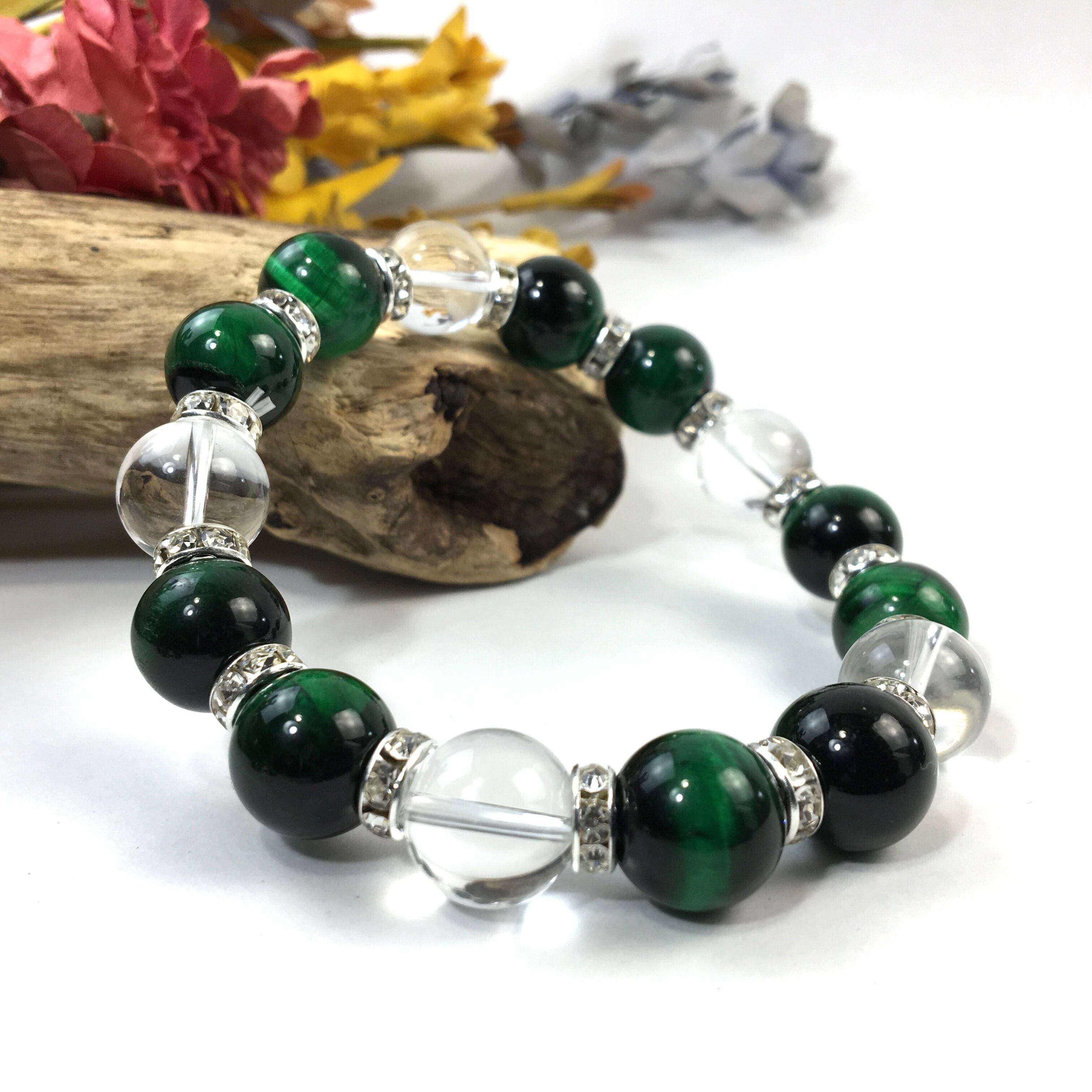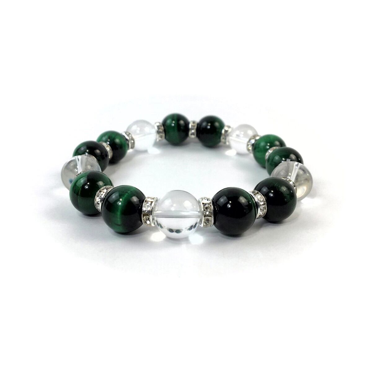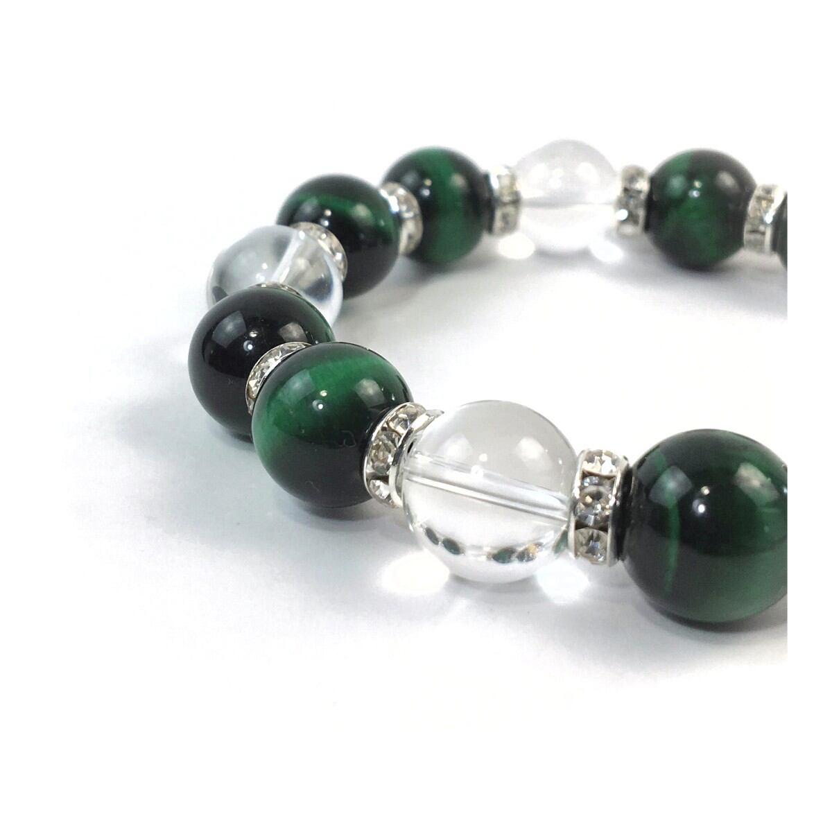 グリーンタイガーアイ&水晶 パワーストーン ブレスレット 12mm (シルバー)メンズ・レディース 男性・女性 数珠ブレス 開運 ☆