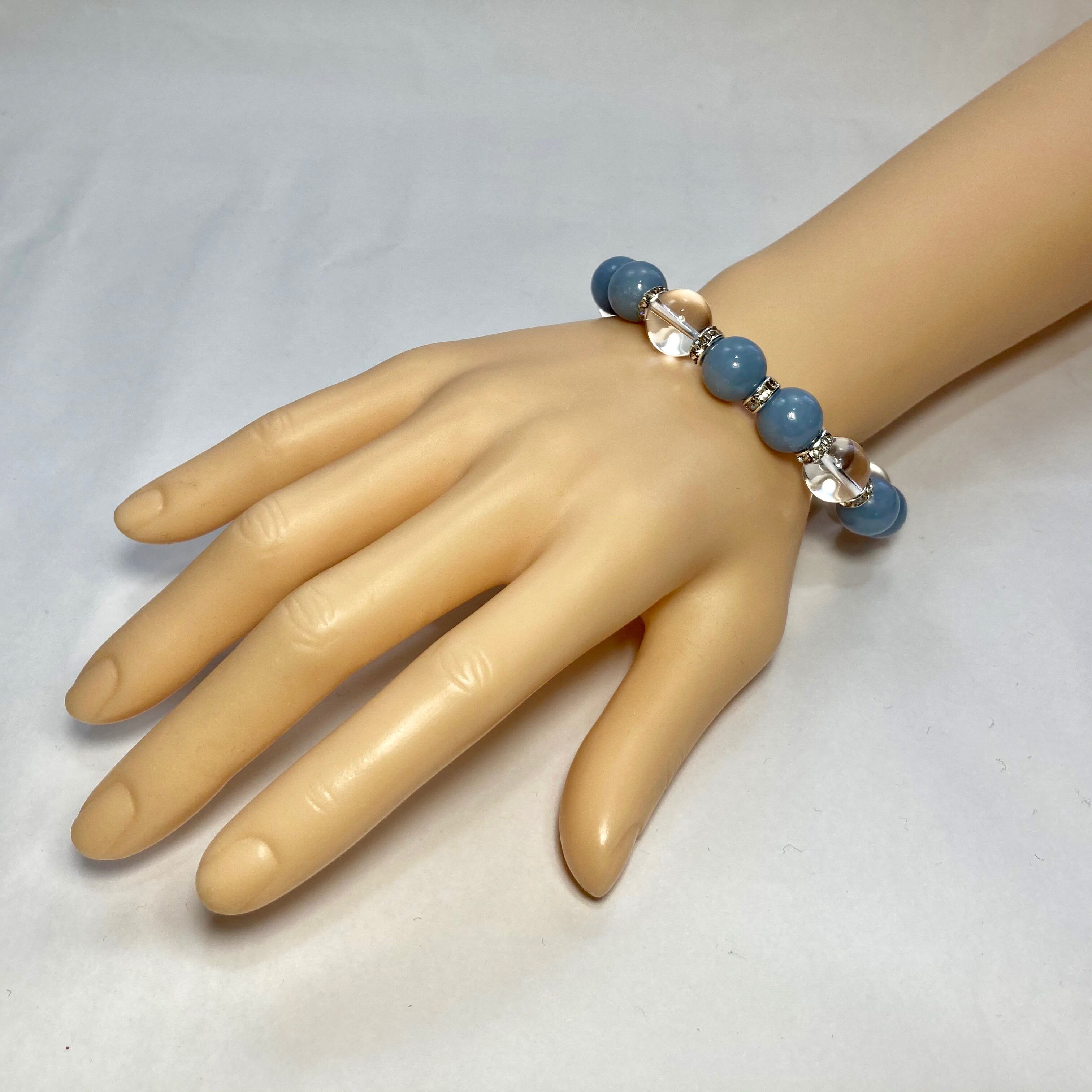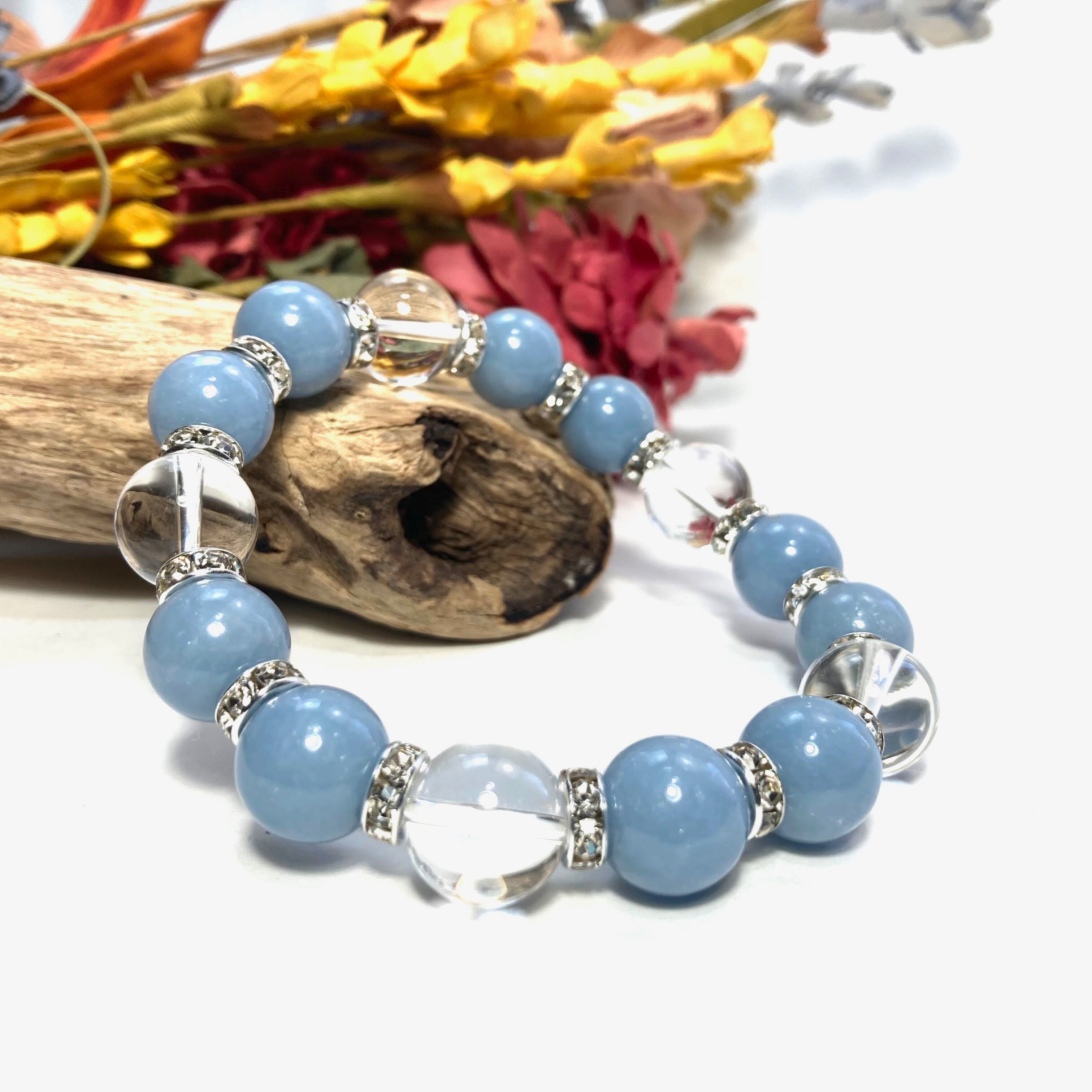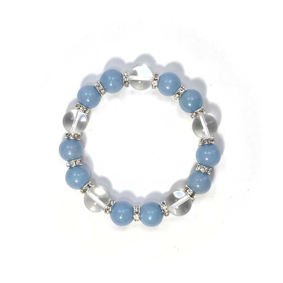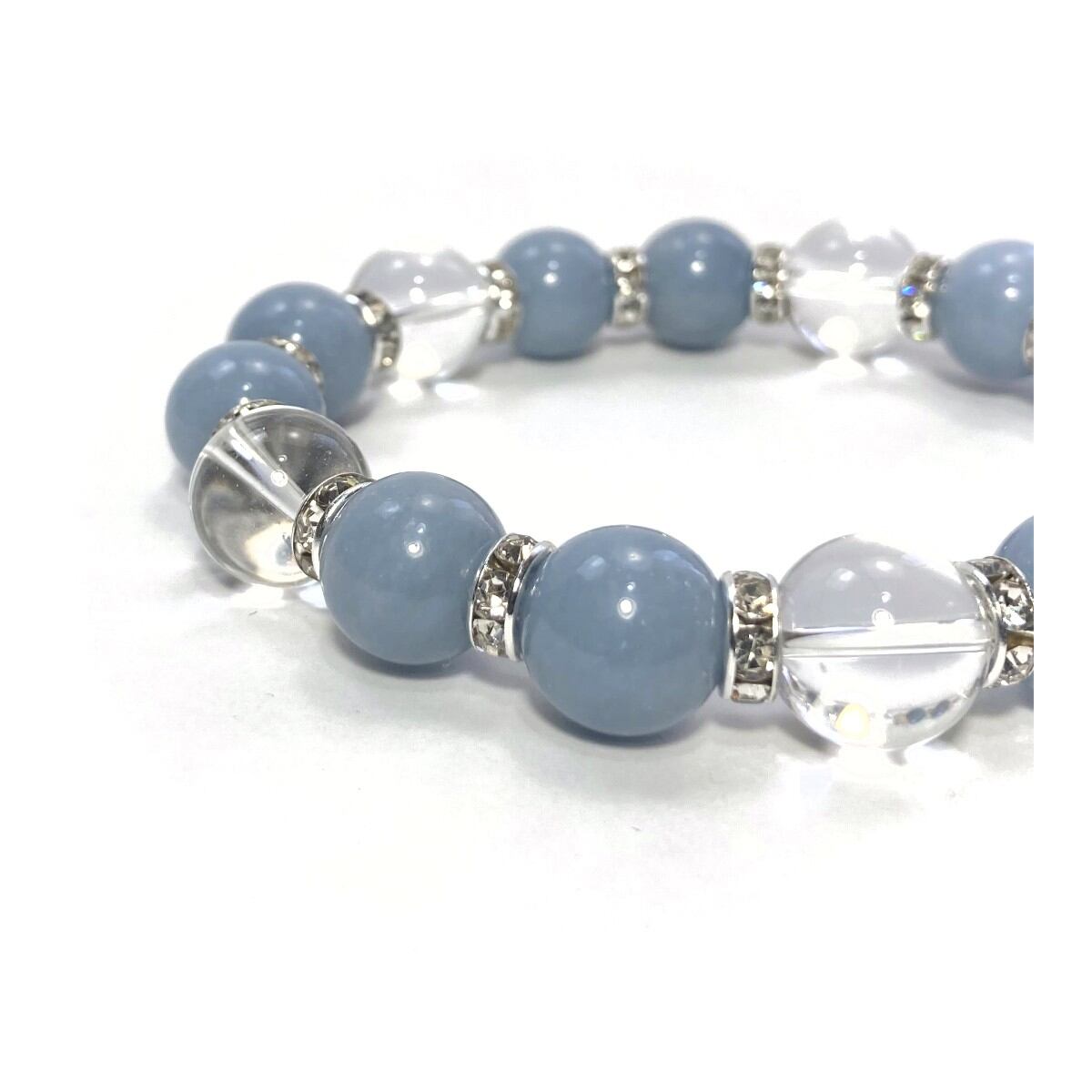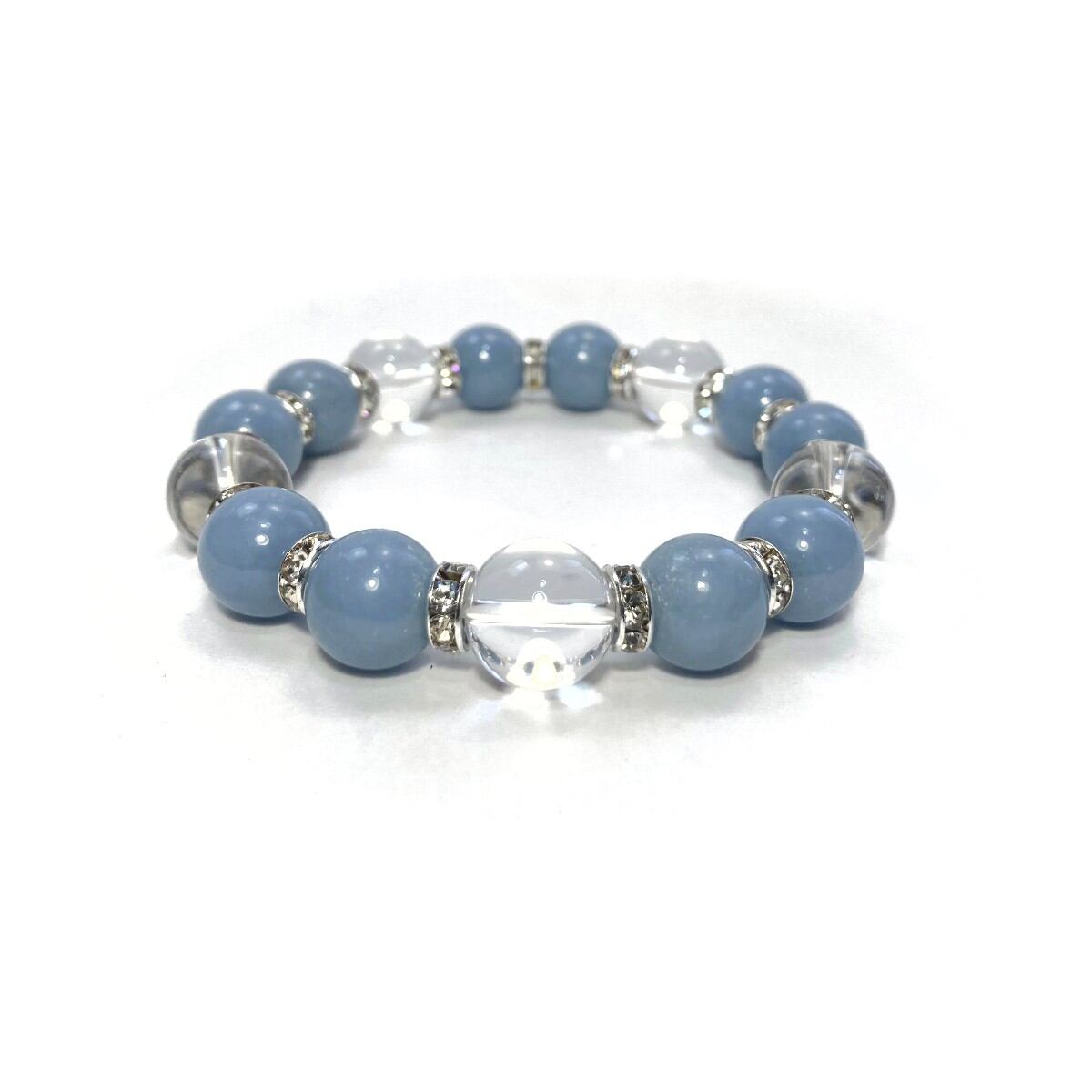 こちらは、エンジェライトと水晶を組み合わせたパワーストーンブレスレットです。間にはロンデルを挟み高級感あるデザインに仕上げております。石大きさは12mm玉を使用して内径約18cmです。気になる方は是非この機会にどうぞ。